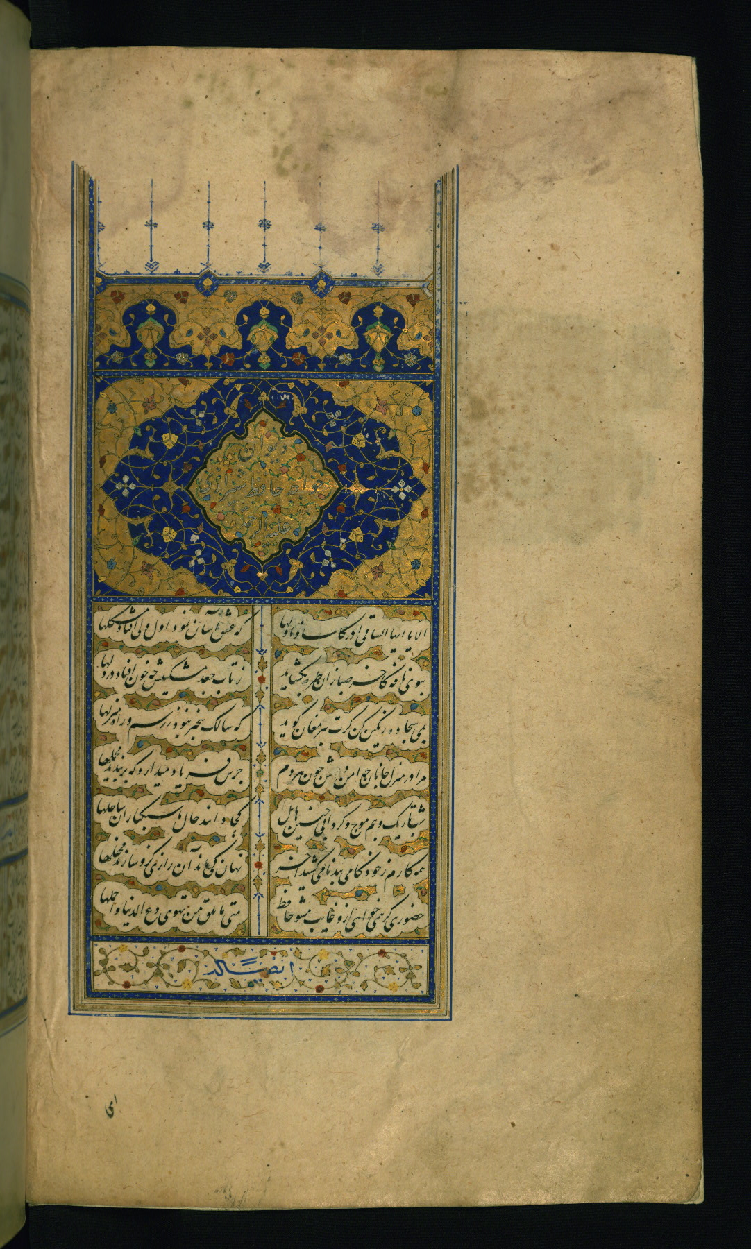 - Label: This incipit page is inscribed with the title of the work and the author's name: Dīvān-i Khvājah Ḥāfiẓ Shīrāzī ʿalayhi al-raḥmah. The gilt medallion with inscription and blue and gilt ground is decorated with polychrome vine and floral motifs. The text area has interlinear gilt decoration, also with polychrome floral motifs. The framing lines are in blue, gold, and black.