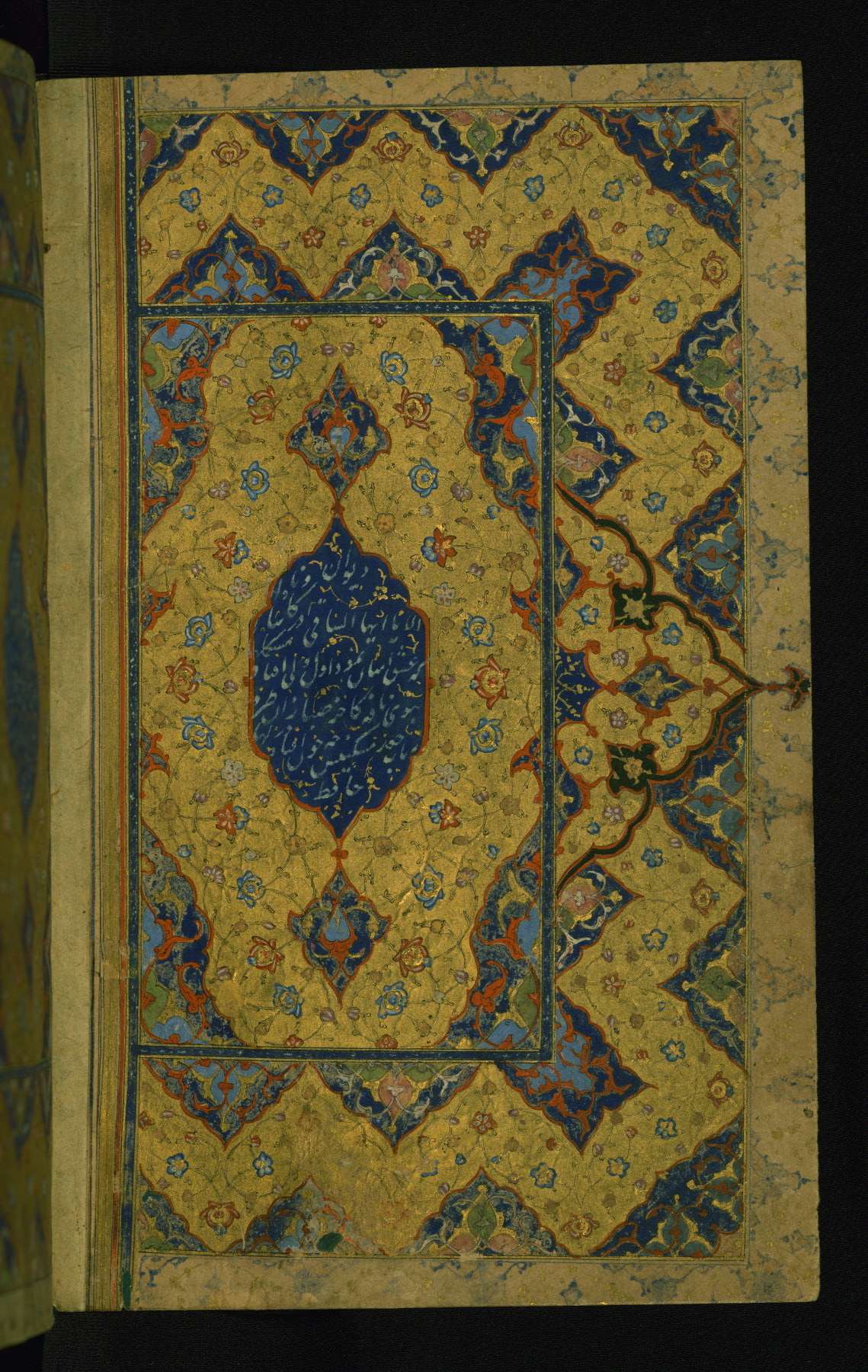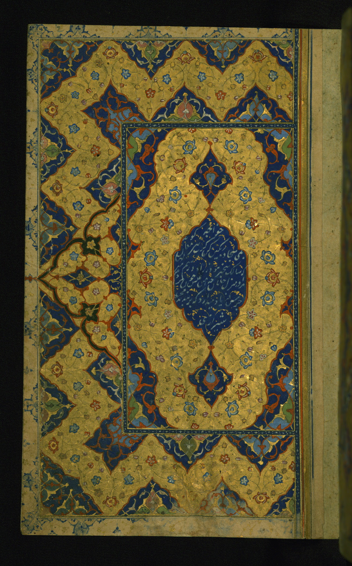 - Label: This is the right side of a double-page illuminated frontispiece. It has the title of the work and the first four couplets inscribed in white nastaʿlīq script in the central oval medallion.