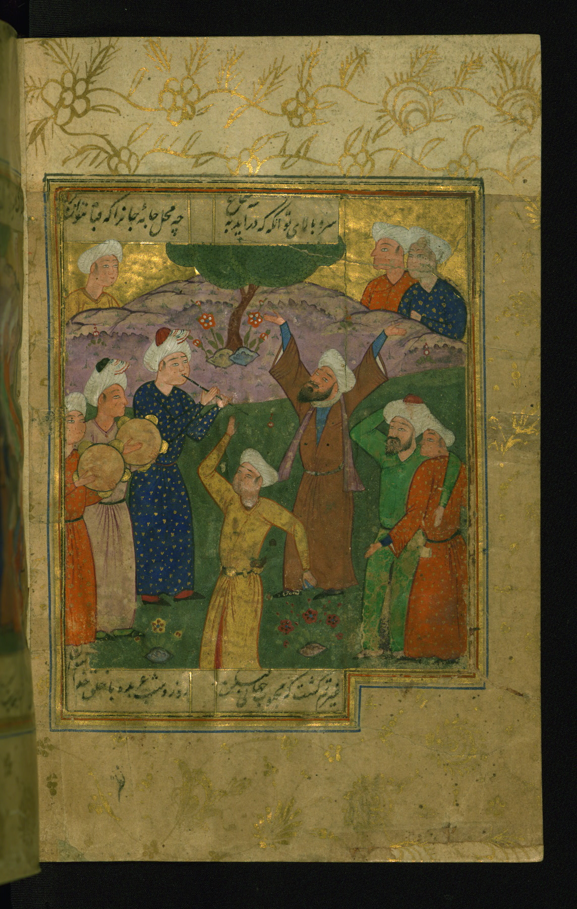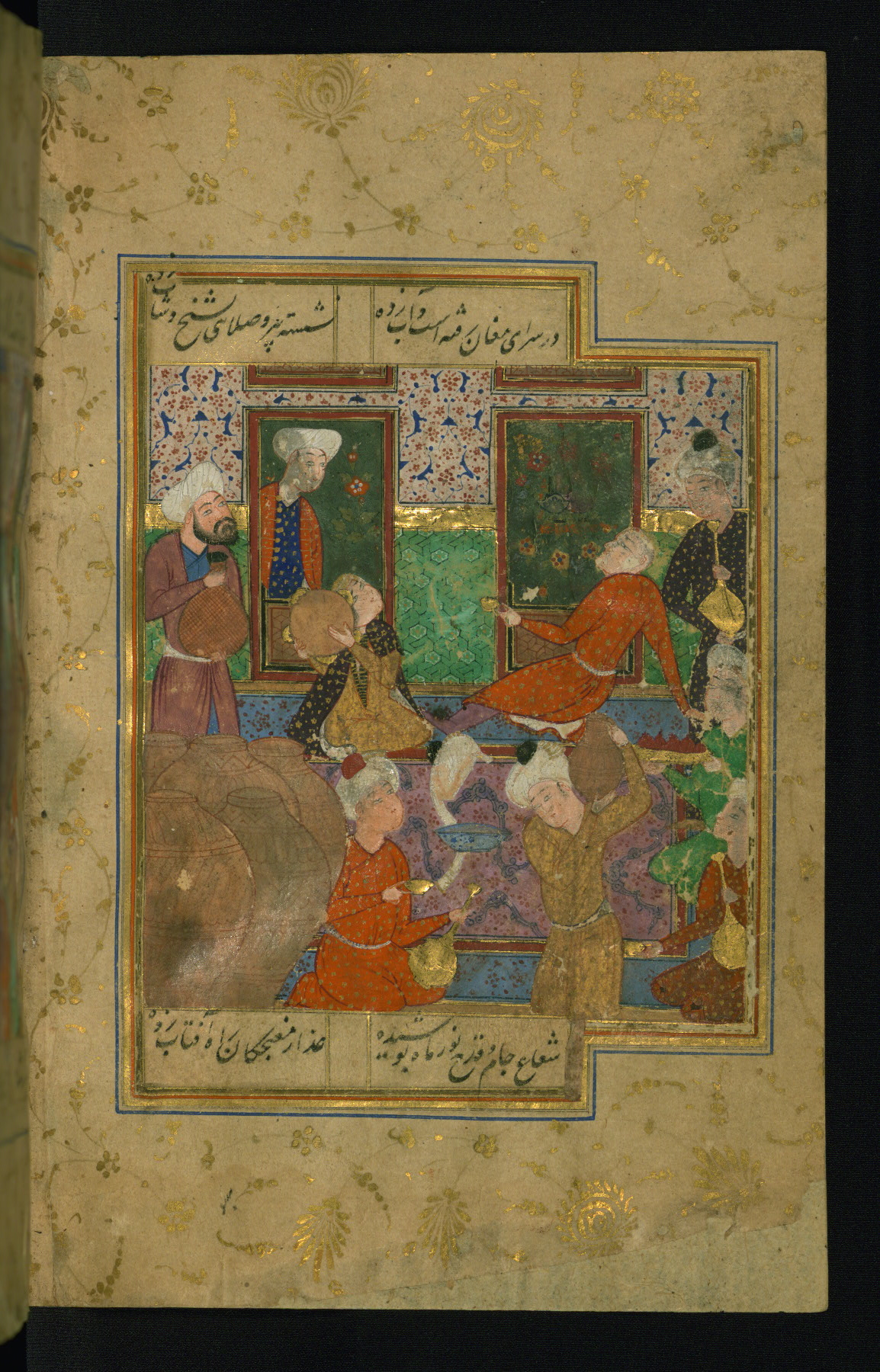 This manuscript is an anonymous illuminated and illustrated tenth-century AH / sixteenth CE copy of the Collection of poems (dīvān) by Ḥāfiẓ (fl. eighth century AH / fourteenth CE). Written in nastaʿlīq script, this codex opens with a double-page illuminated frontispiece and has three additional double-page illustrations.