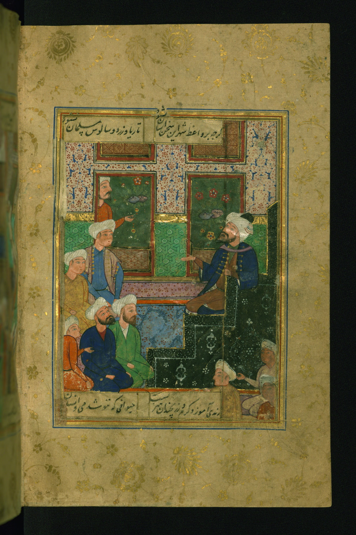 - Decoration note: Three double-page illustrations (fols. 39b-40a, 88b-89a, and 171b-172a; double-page illuminated frontispiece with oval medallions enclosing the title of the work and the first four couplets (fols. 1b-2a); small rectangular or triangular pieces with floral designs on the sides of selected verses; frame