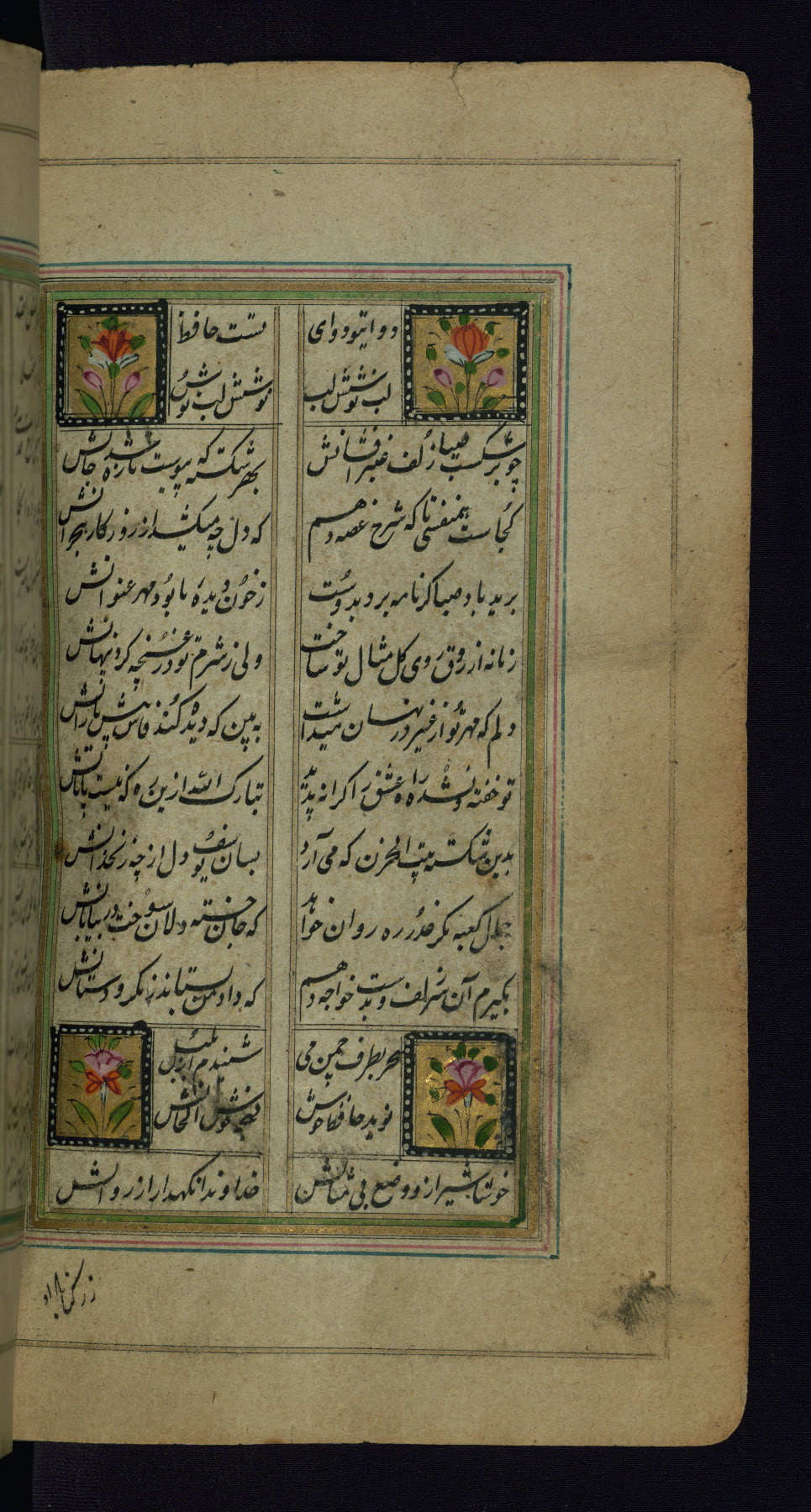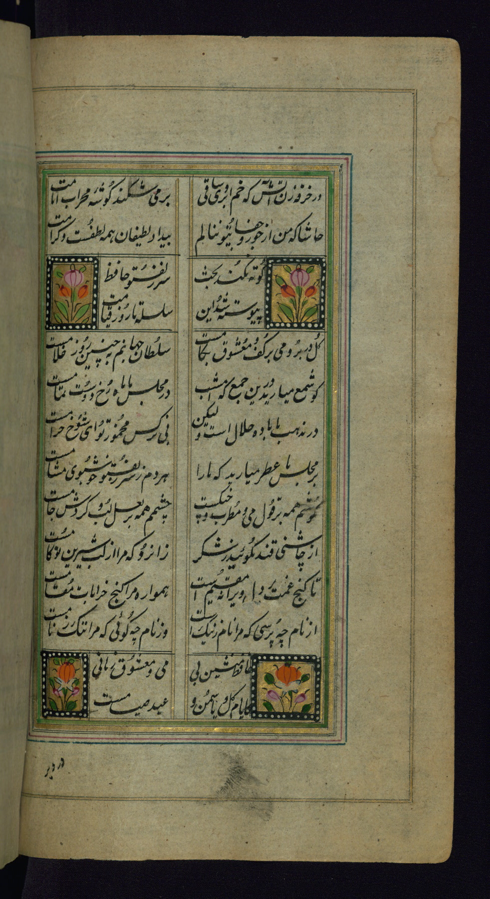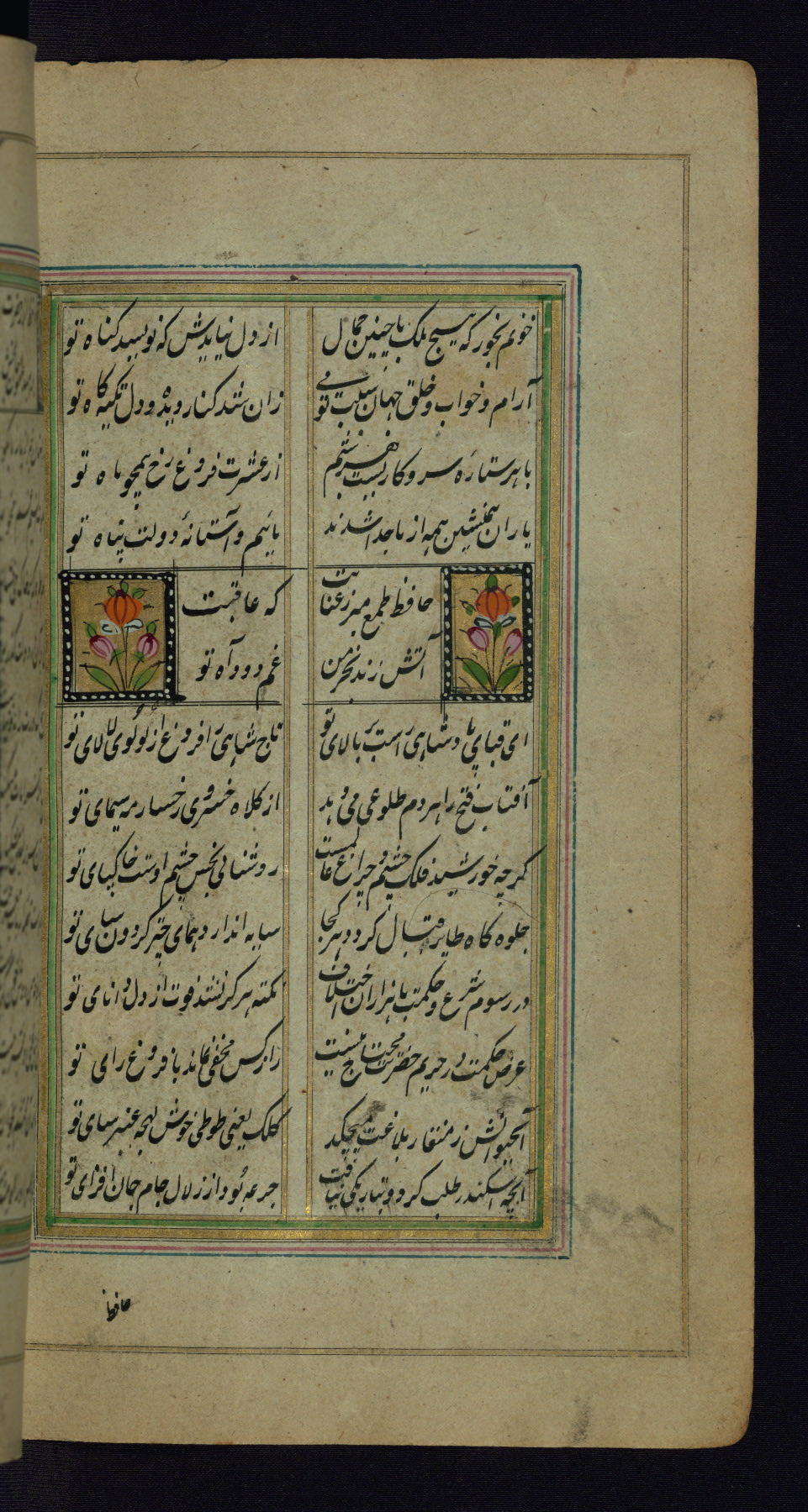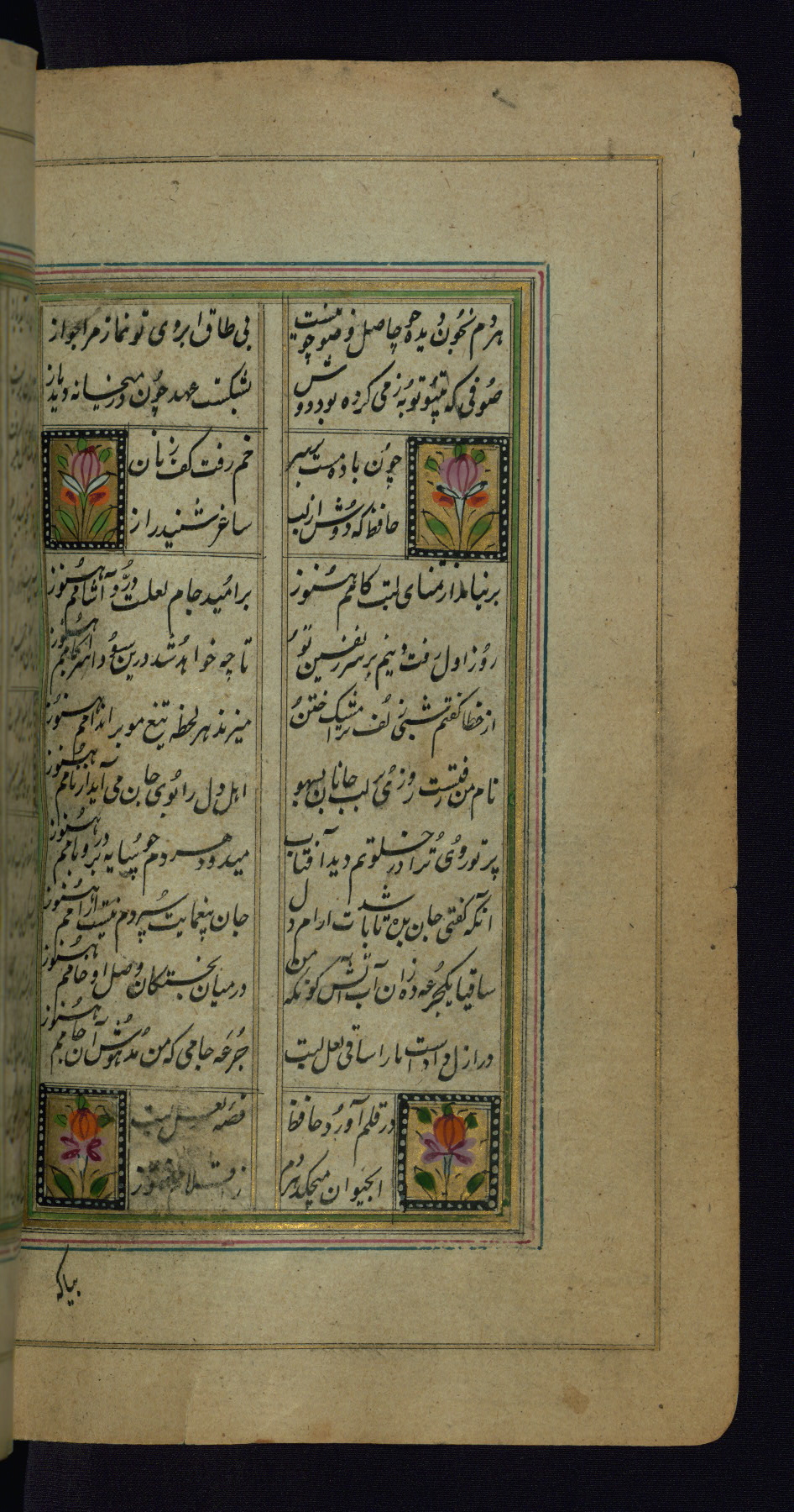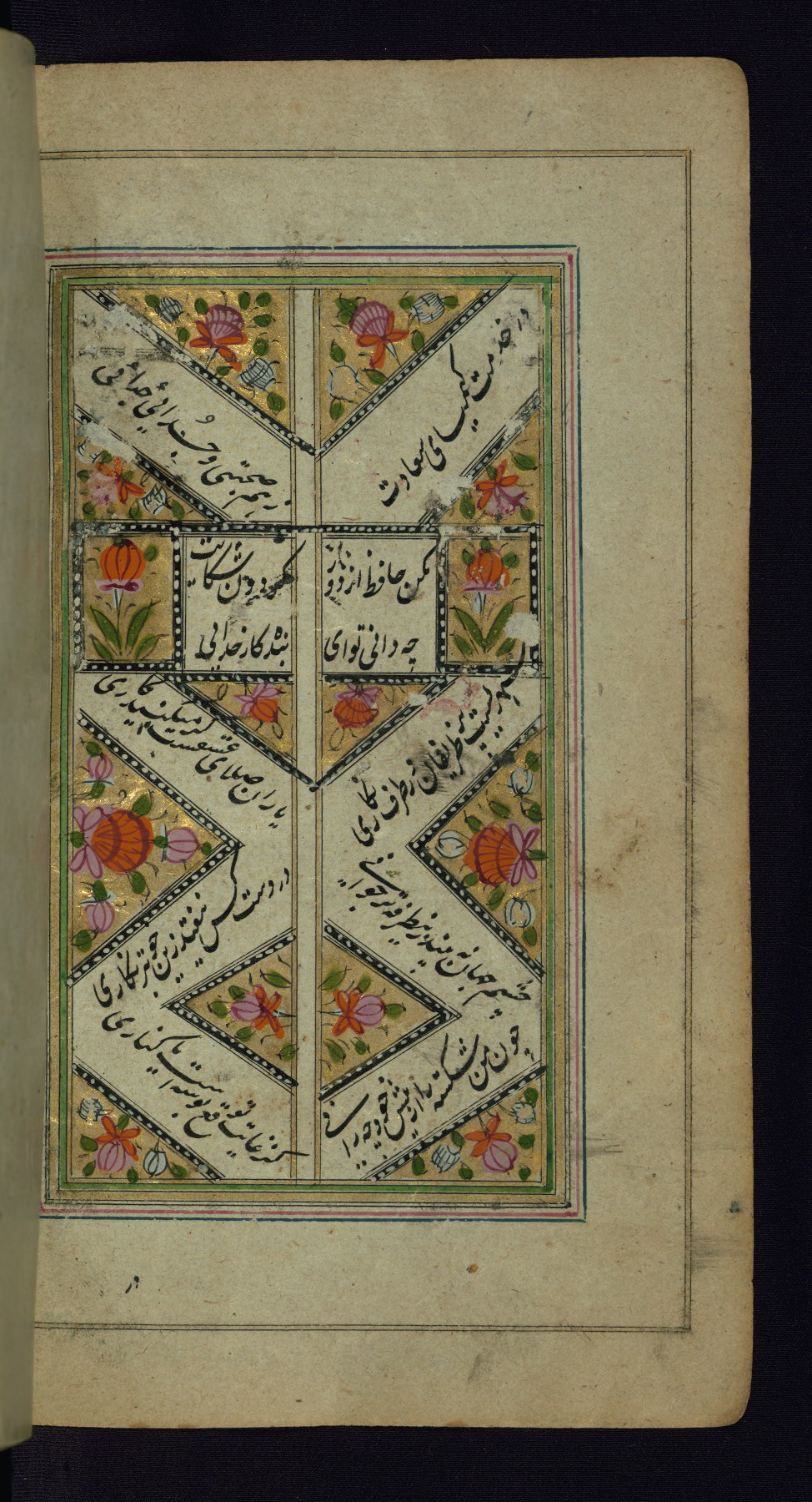 This is an illuminated and illustrated Collection of poems (dīvān) by Shams al-Dīn Muḥammad Ḥāfiz al-Shīrāzī (fl. eighth century AH / fourteenth CE), which was produced in India. According to the colophon, the manuscript was completed on the 19th Rajab 1202[?] AH / 1788[?] CE. It opens with a double-page illuminated incipit (fols. 1b-2a) with headpiece that introduces the preface (dībāchah) (fols. 1b-4b), followed by another double-page illuminated incipit with headpiece opening the main text of the Dīvān (fols. 5b-6a). The codex is decorated throughout with square and rectangular panels, as well as horizontal bands with floral decoration marking the end of odes, quatrains, or series of verses. There are forty-nine illustrations. The brown leather binding with medallion and pendants is contemporary with the manuscript.