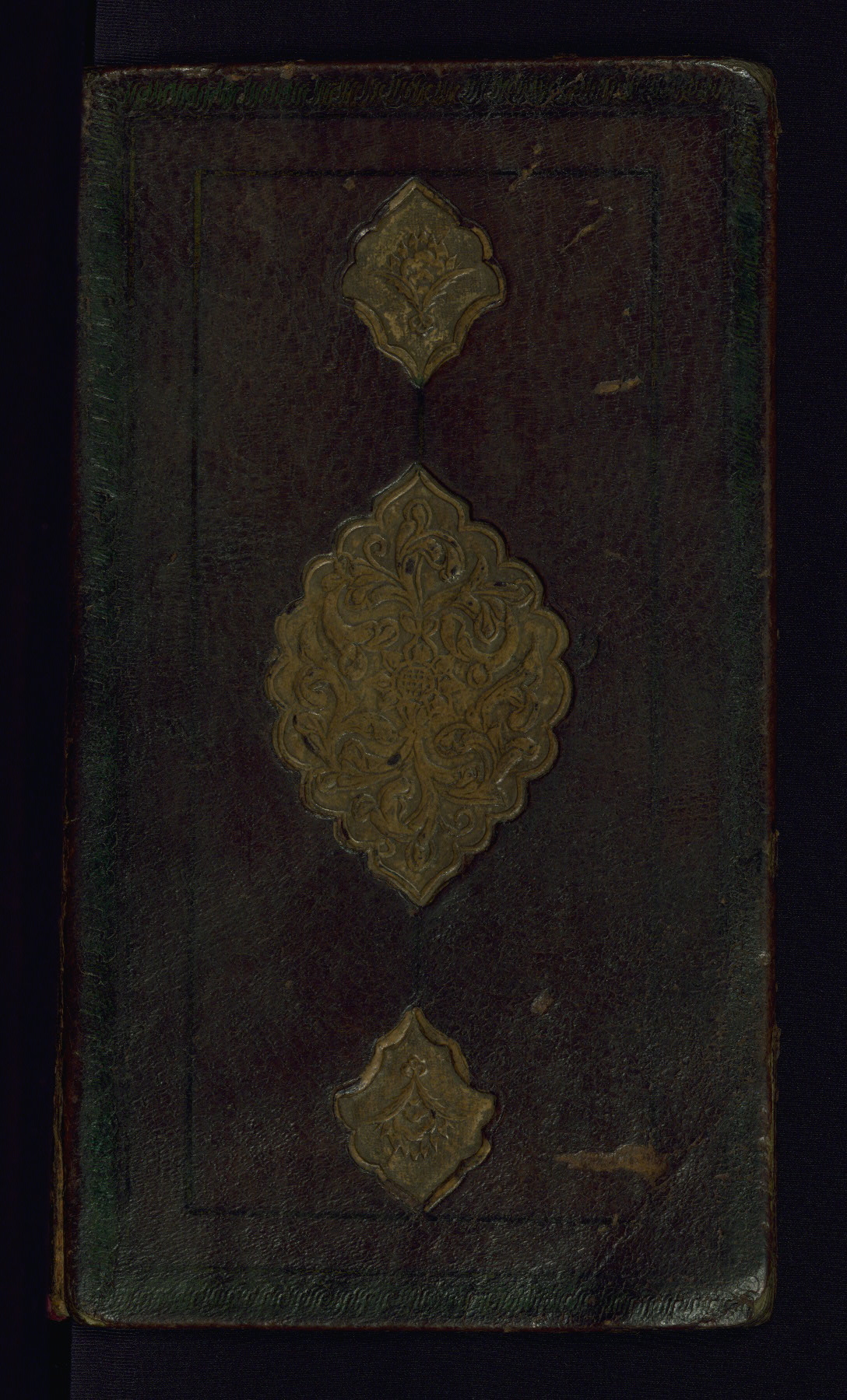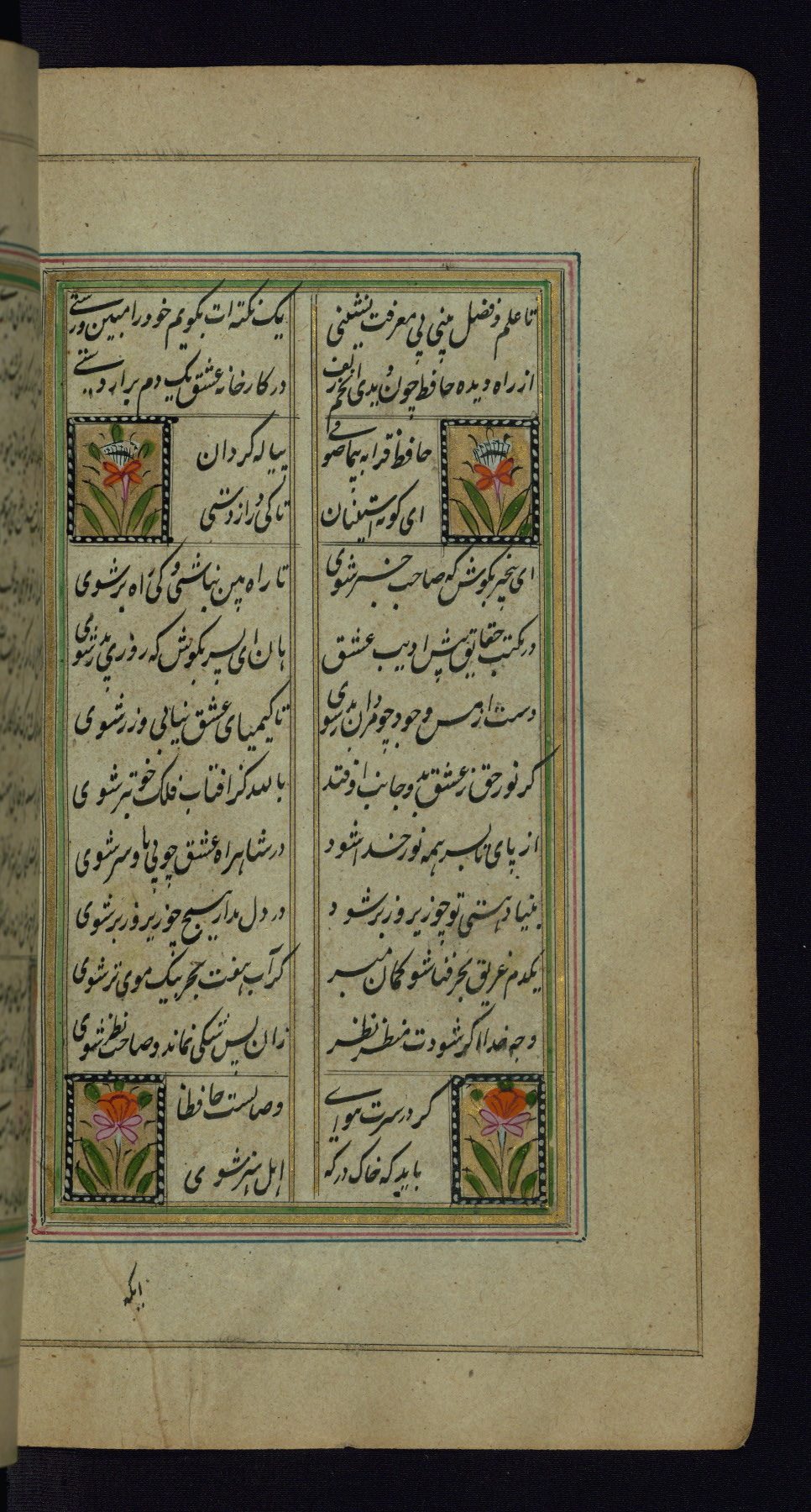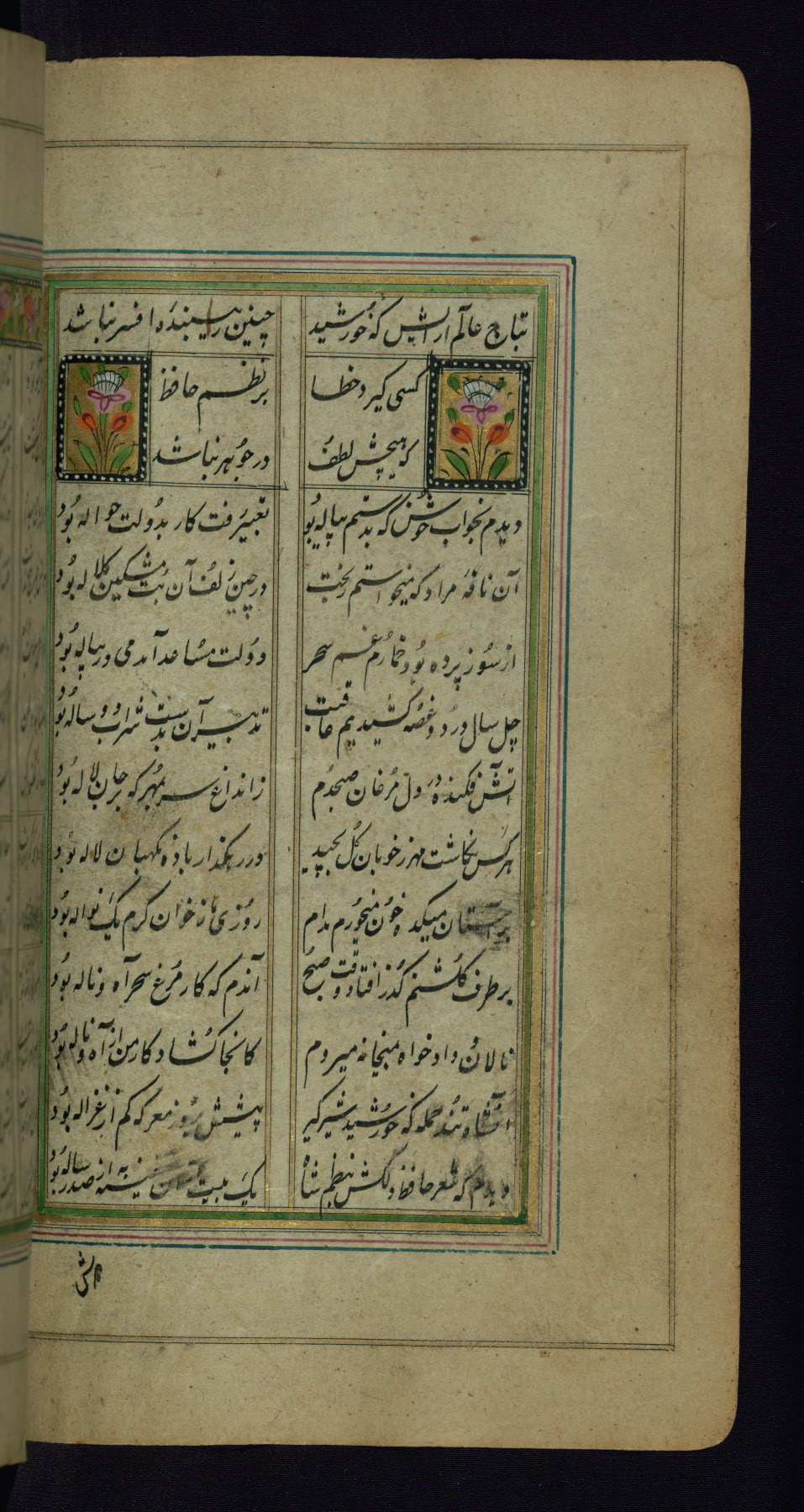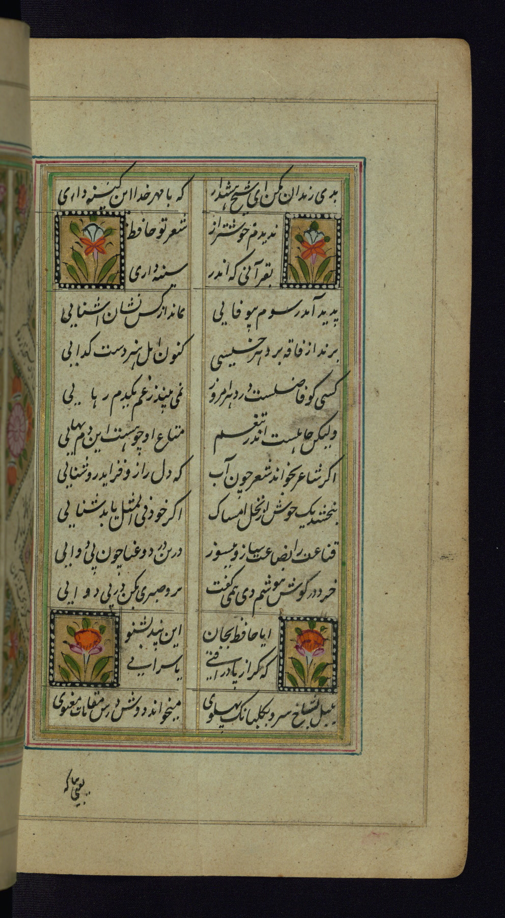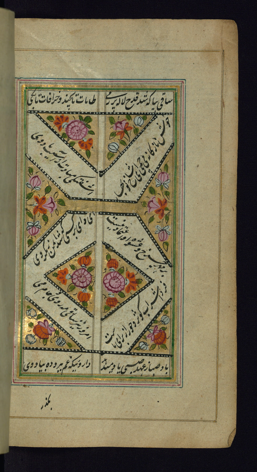 This is an illuminated and illustrated Collection of poems (dīvān) by Shams al-Dīn Muḥammad Ḥāfiz al-Shīrāzī (fl. eighth century AH / fourteenth CE), which was produced in India. According to the colophon, the manuscript was completed on the 19th Rajab 1202[?] AH / 1788[?] CE. It opens with a double-page illuminated incipit (fols. 1b-2a) with headpiece that introduces the preface (dībāchah) (fols. 1b-4b), followed by another double-page illuminated incipit with headpiece opening the main text of the Dīvān (fols. 5b-6a). The codex is decorated throughout with square and rectangular panels, as well as horizontal bands with floral decoration marking the end of odes, quatrains, or series of verses. There are forty-nine illustrations. The brown leather binding with medallion and pendants is contemporary with the manuscript.