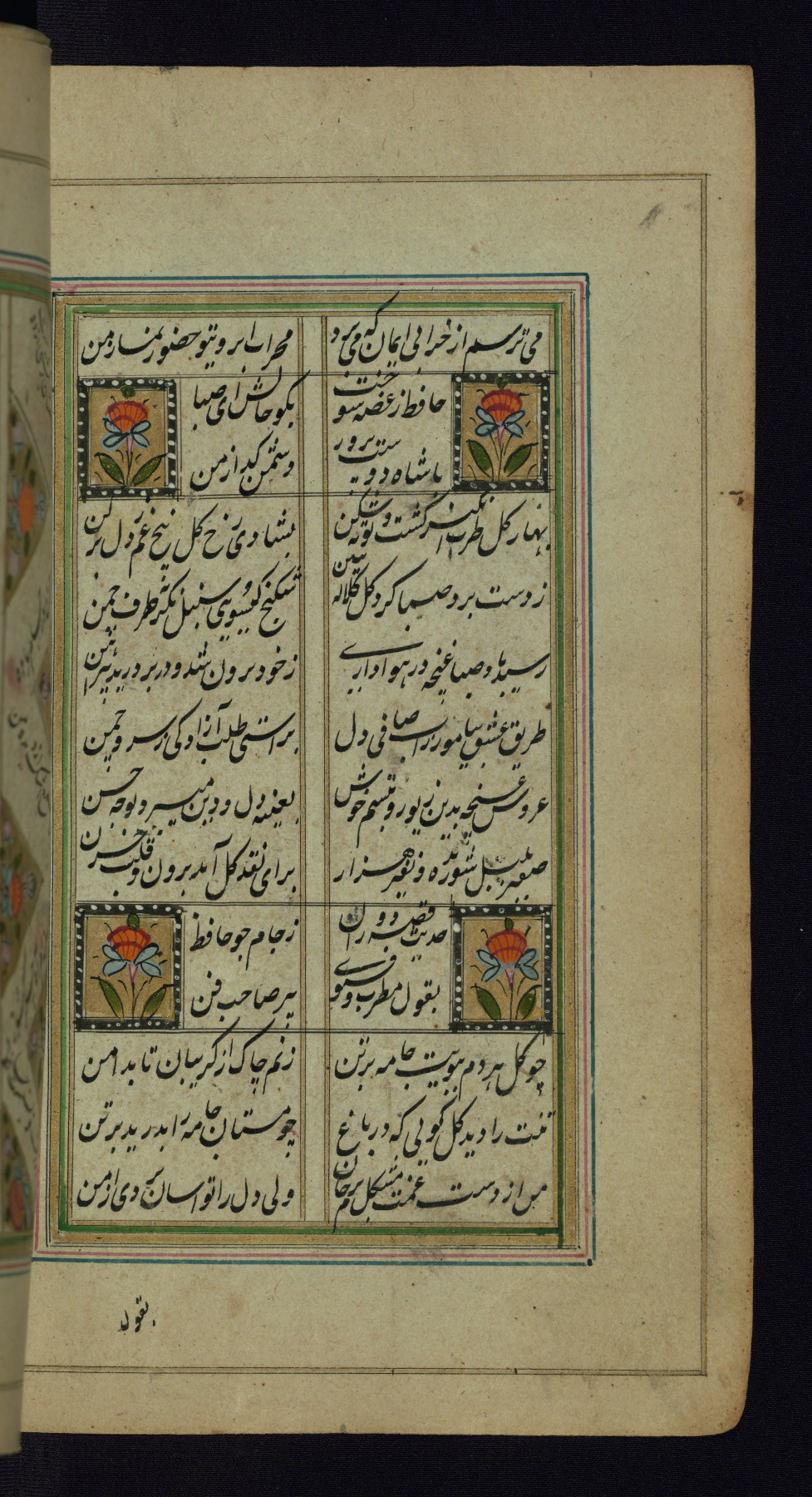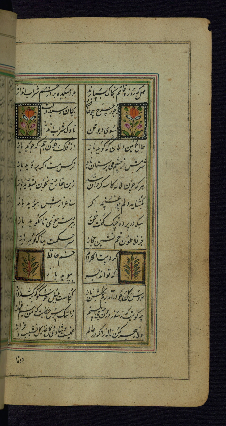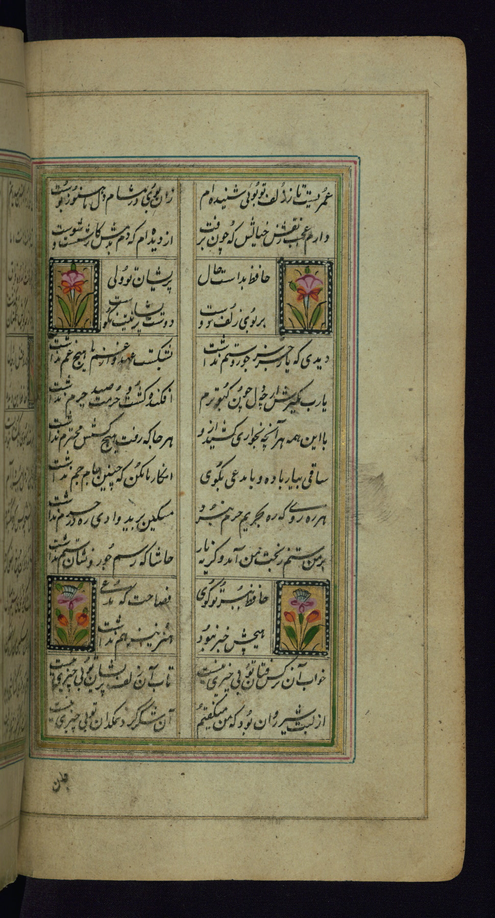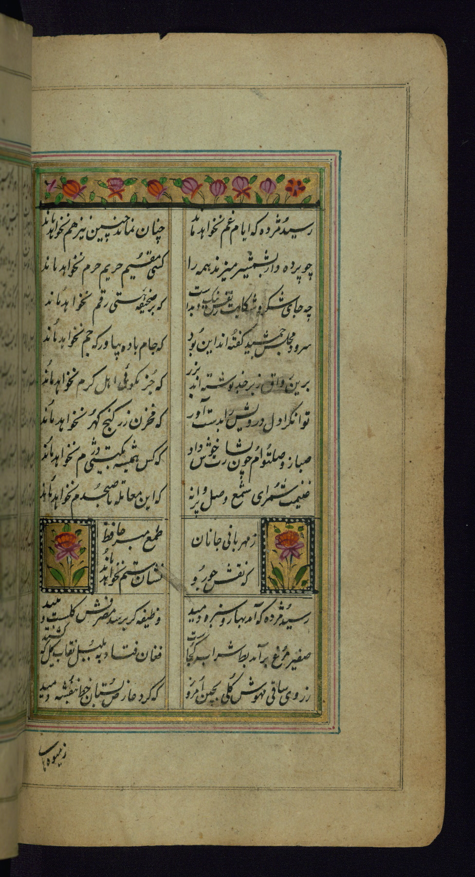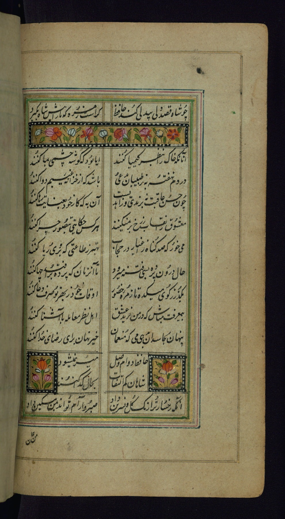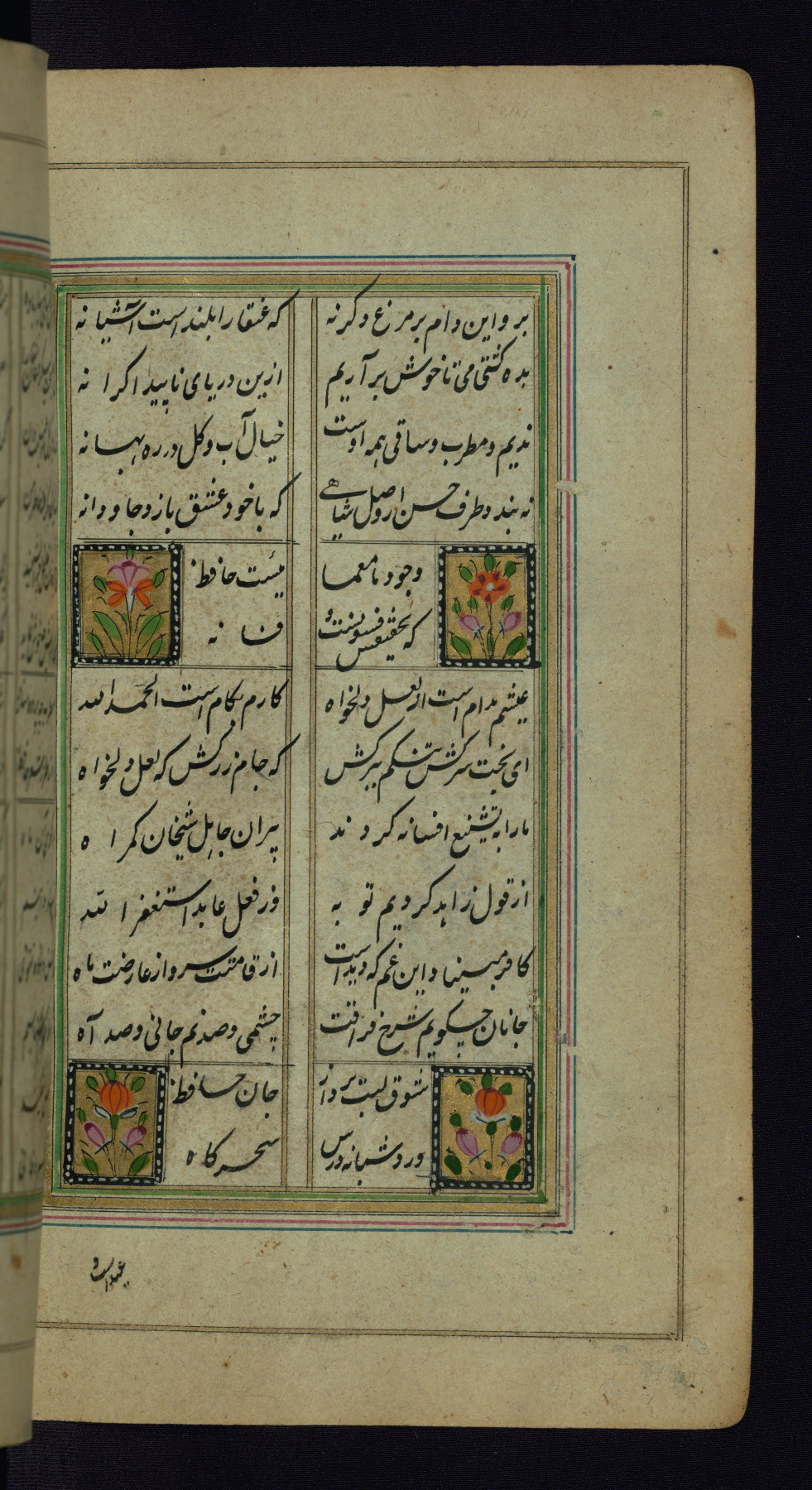 This is an illuminated and illustrated Collection of poems (dīvān) by Shams al-Dīn Muḥammad Ḥāfiz al-Shīrāzī (fl. eighth century AH / fourteenth CE), which was produced in India. According to the colophon, the manuscript was completed on the 19th Rajab 1202[?] AH / 1788[?] CE. It opens with a double-page illuminated incipit (fols. 1b-2a) with headpiece that introduces the preface (dībāchah) (fols. 1b-4b), followed by another double-page illuminated incipit with headpiece opening the main text of the Dīvān (fols. 5b-6a). The codex is decorated throughout with square and rectangular panels, as well as horizontal bands with floral decoration marking the end of odes, quatrains, or series of verses. There are forty-nine illustrations. The brown leather binding with medallion and pendants is contemporary with the manuscript.