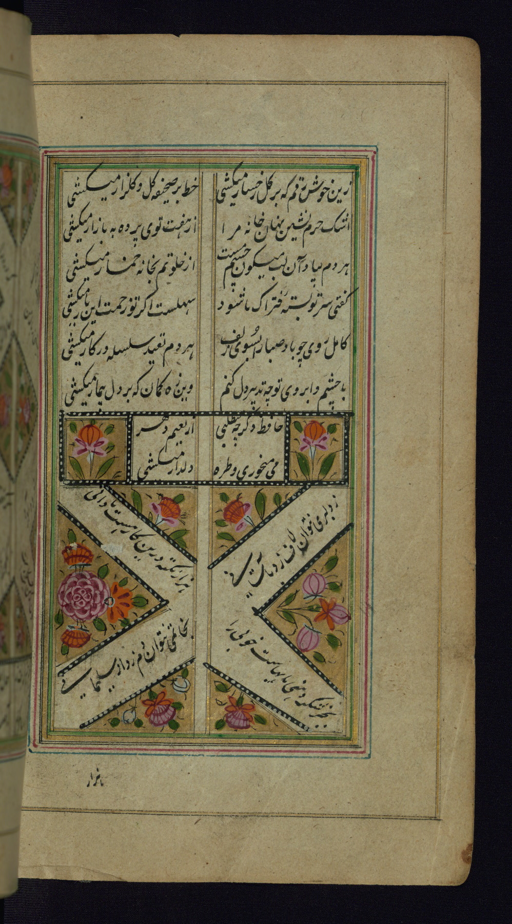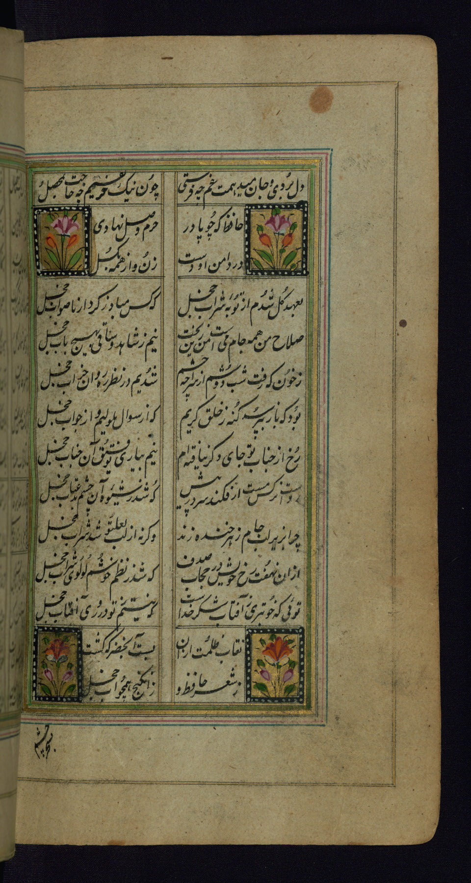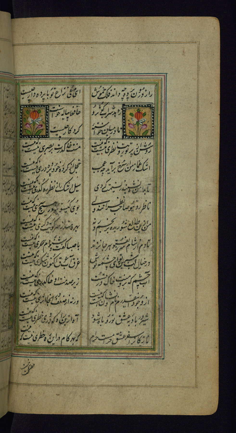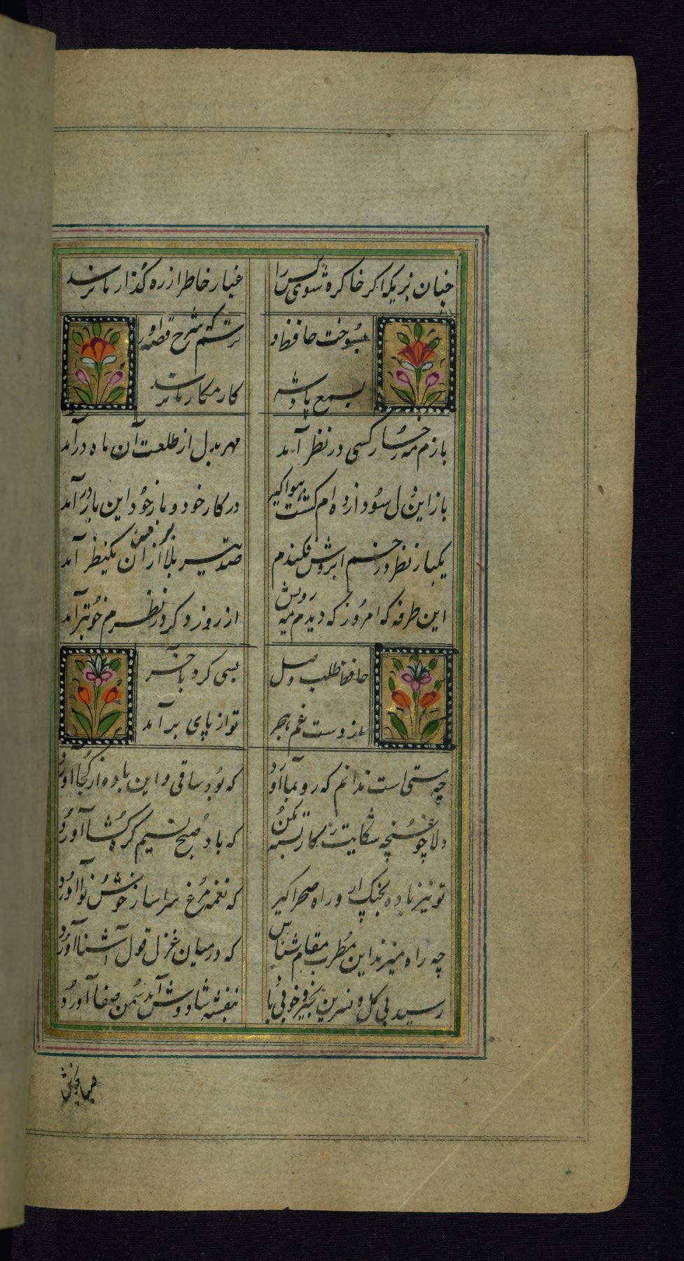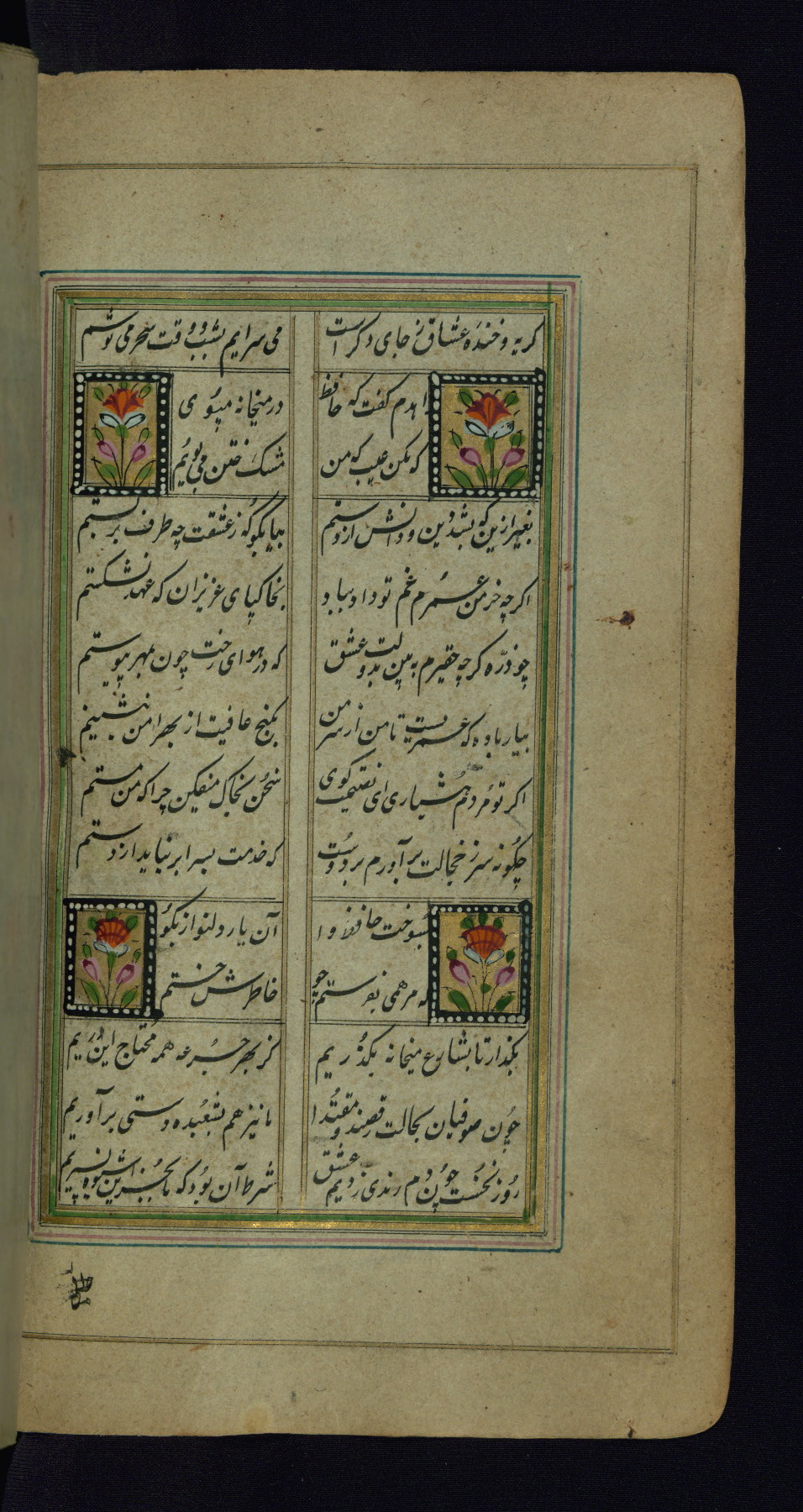 This is an illuminated and illustrated Collection of poems (dīvān) by Shams al-Dīn Muḥammad Ḥāfiz al-Shīrāzī (fl. eighth century AH / fourteenth CE), which was produced in India. According to the colophon, the manuscript was completed on the 19th Rajab 1202[?] AH / 1788[?] CE. It opens with a double-page illuminated incipit (fols. 1b-2a) with headpiece that introduces the preface (dībāchah) (fols. 1b-4b), followed by another double-page illuminated incipit with headpiece opening the main text of the Dīvān (fols. 5b-6a). The codex is decorated throughout with square and rectangular panels, as well as horizontal bands with floral decoration marking the end of odes, quatrains, or series of verses. There are forty-nine illustrations. The brown leather binding with medallion and pendants is contemporary with the manuscript.