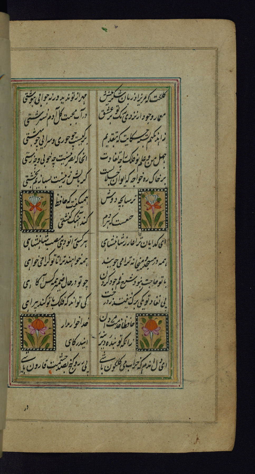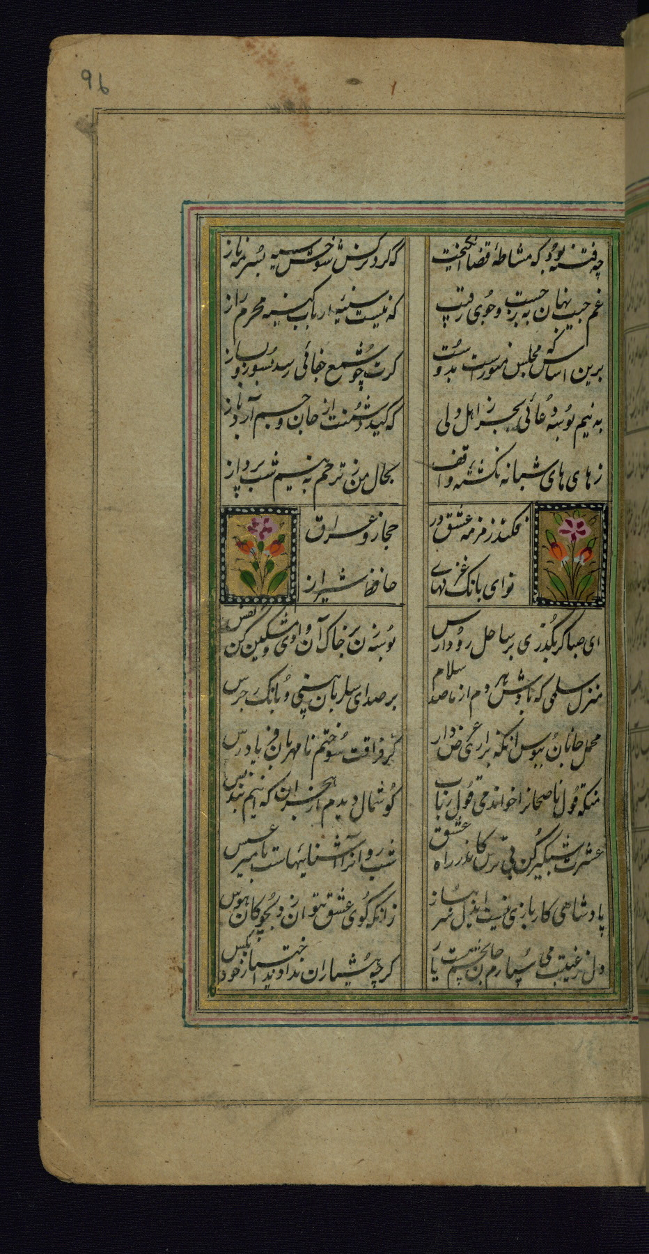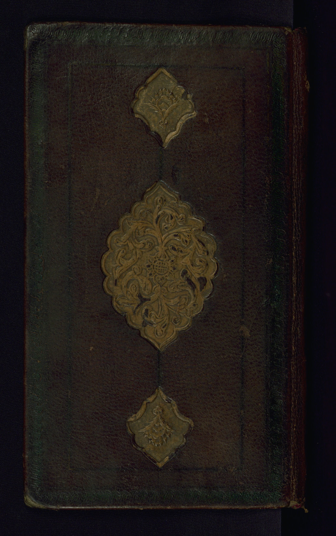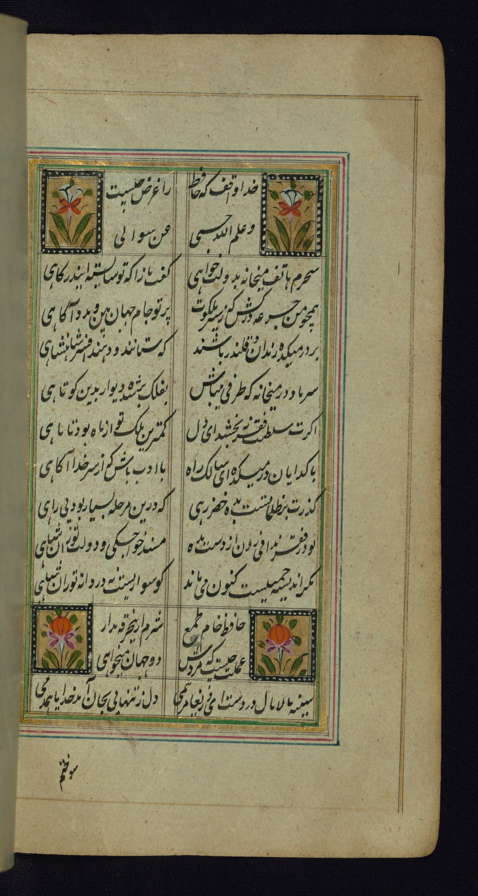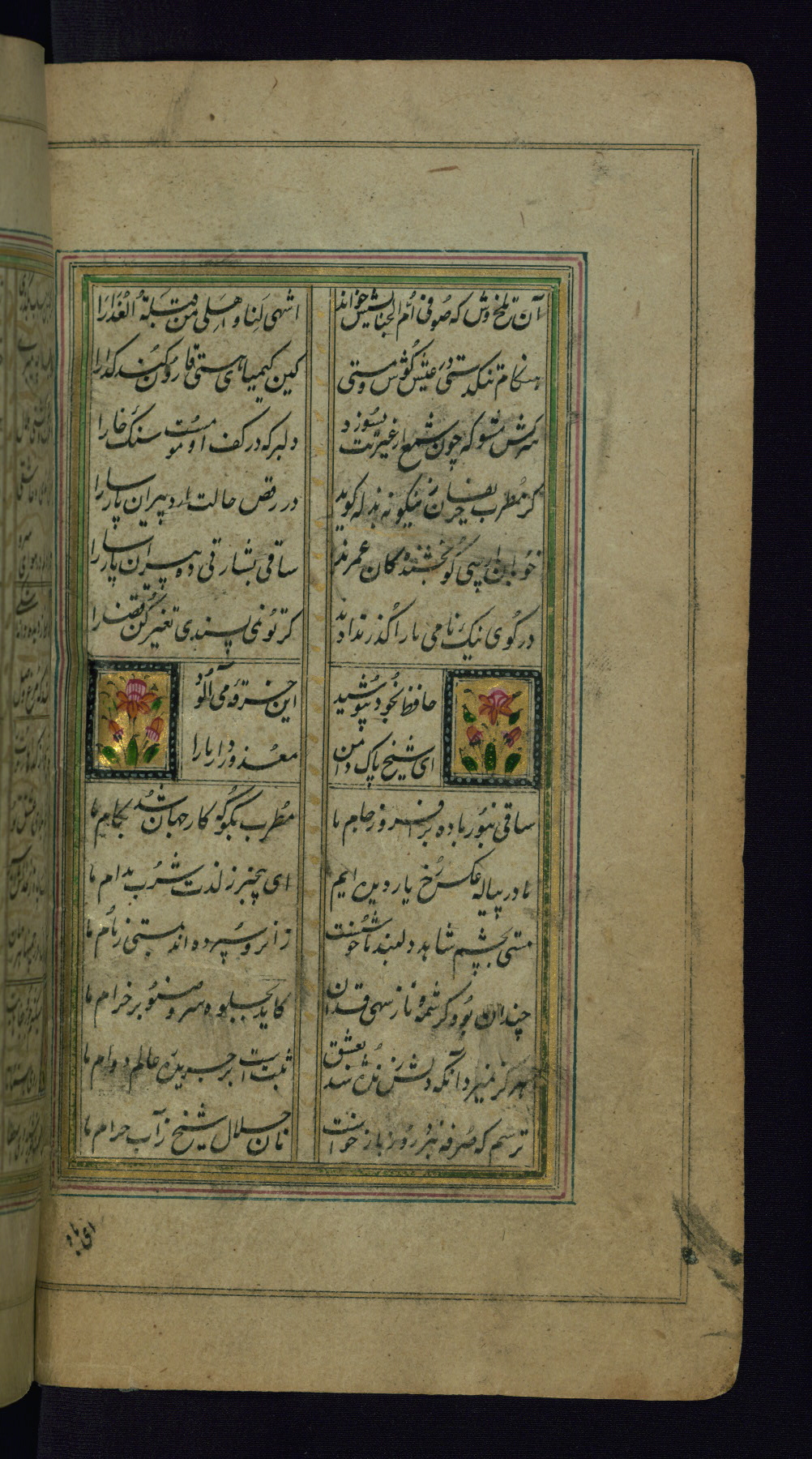 This is an illuminated and illustrated Collection of poems (dīvān) by Shams al-Dīn Muḥammad Ḥāfiz al-Shīrāzī (fl. eighth century AH / fourteenth CE), which was produced in India. According to the colophon, the manuscript was completed on the 19th Rajab 1202[?] AH / 1788[?] CE. It opens with a double-page illuminated incipit (fols. 1b-2a) with headpiece that introduces the preface (dībāchah) (fols. 1b-4b), followed by another double-page illuminated incipit with headpiece opening the main text of the Dīvān (fols. 5b-6a). The codex is decorated throughout with square and rectangular panels, as well as horizontal bands with floral decoration marking the end of odes, quatrains, or series of verses. There are forty-nine illustrations. The brown leather binding with medallion and pendants is contemporary with the manuscript.