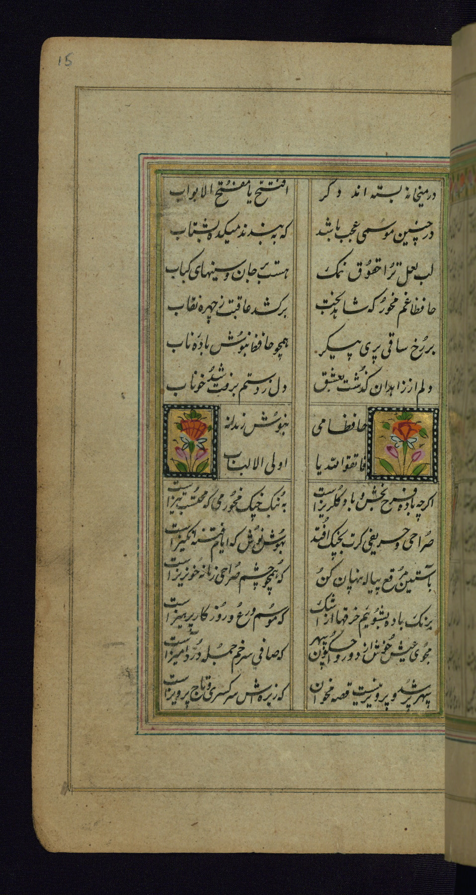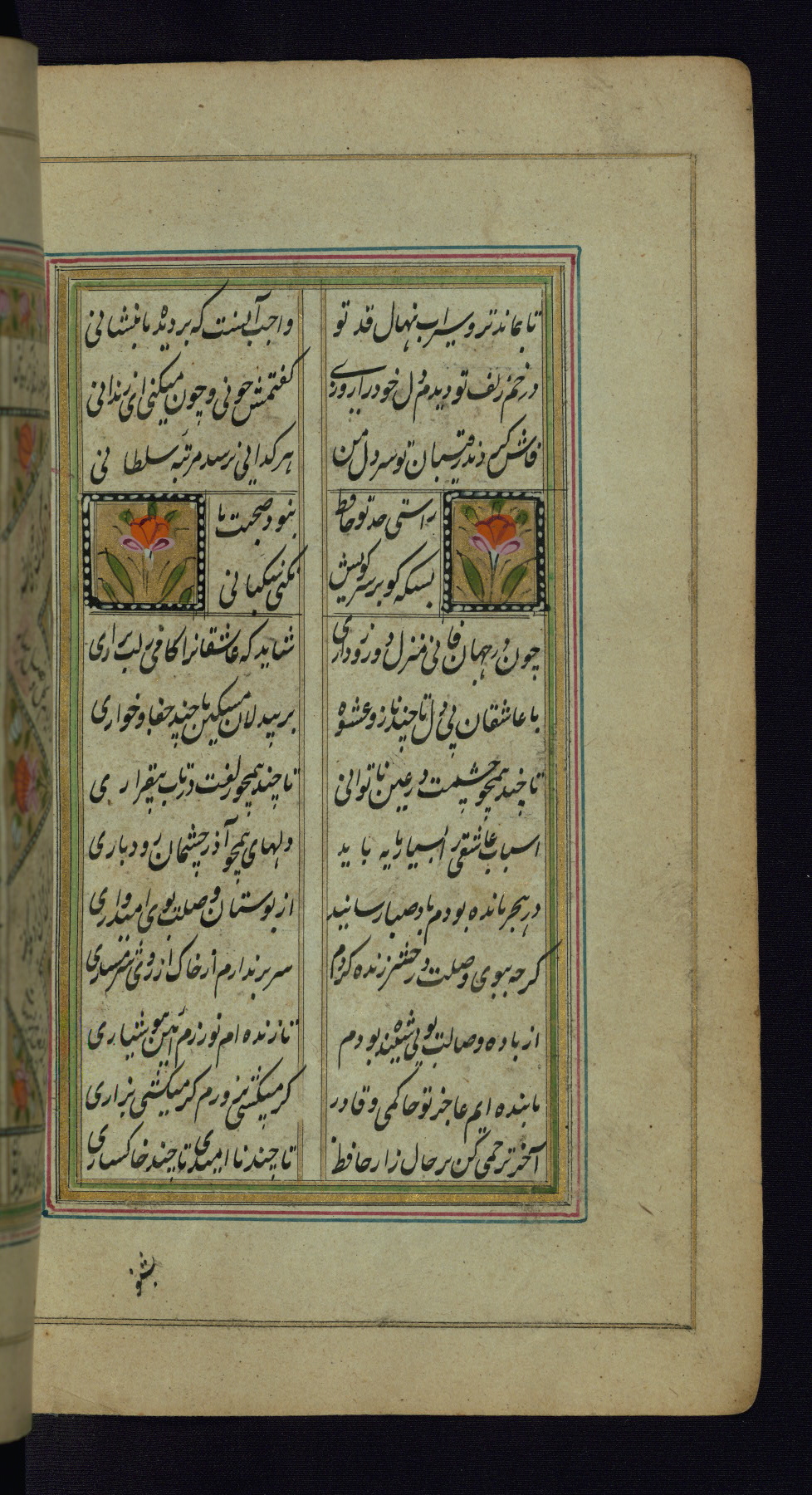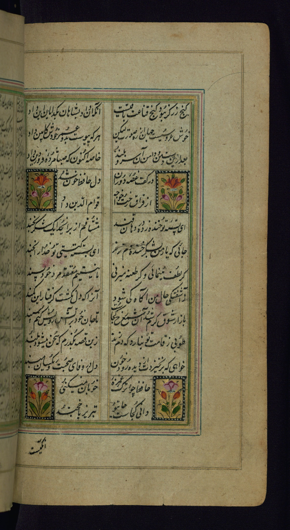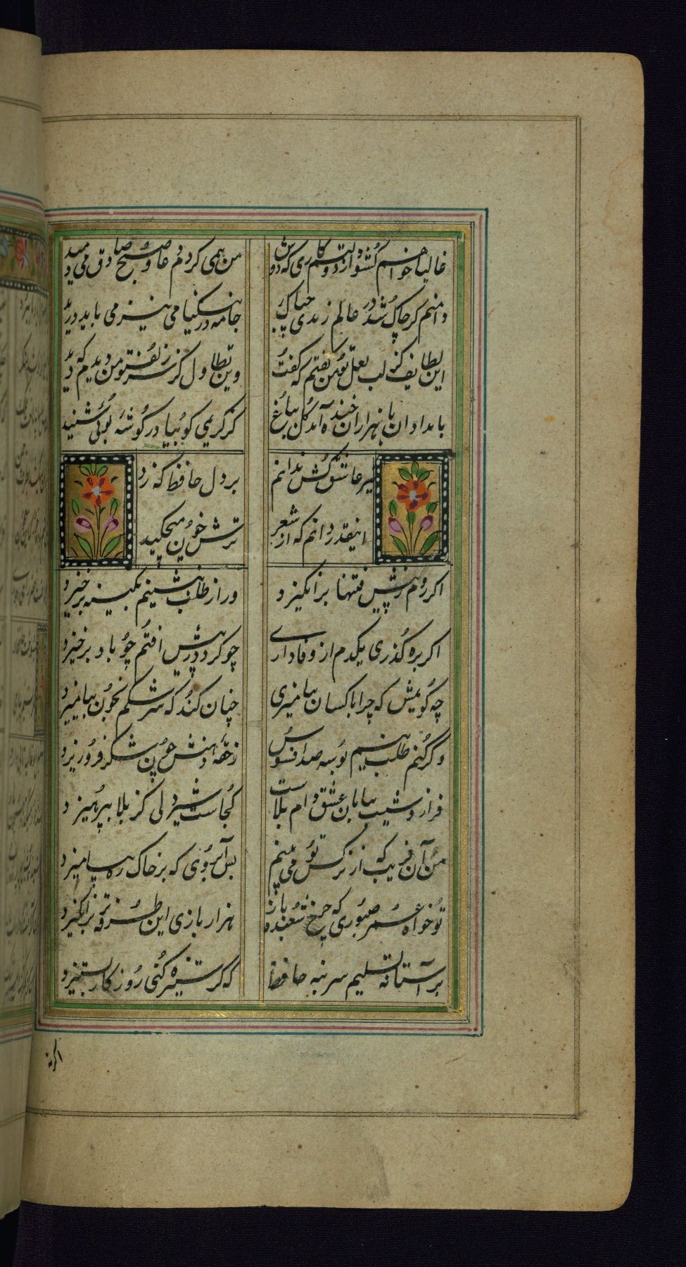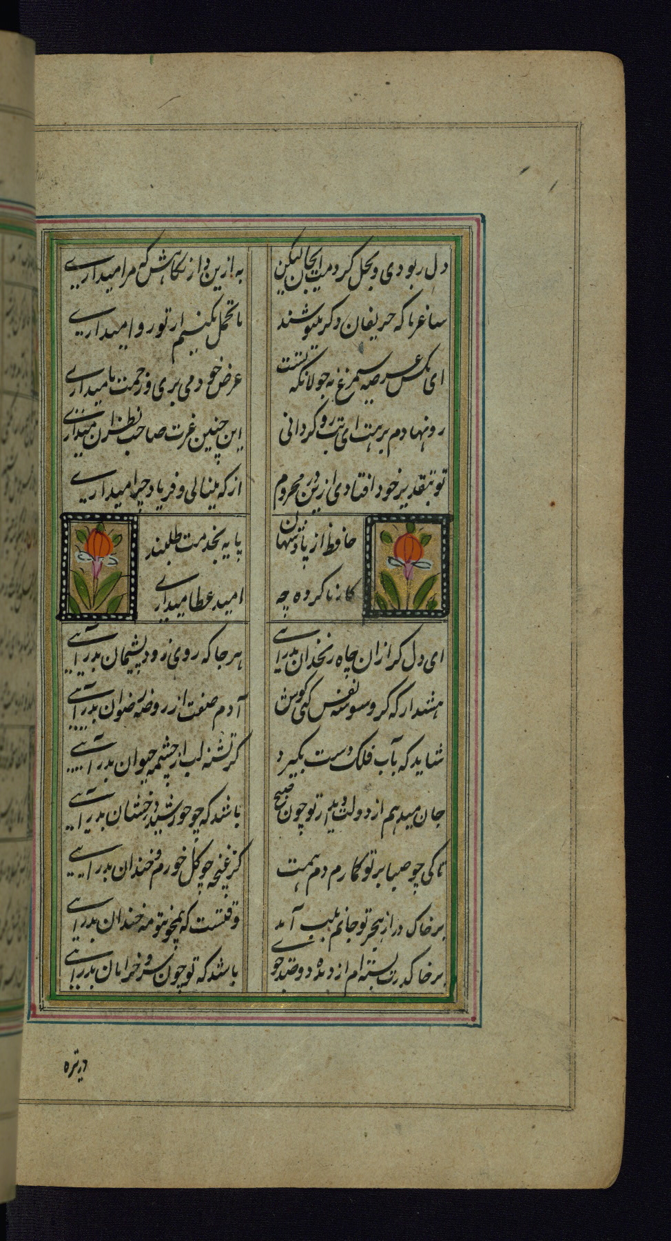 This is an illuminated and illustrated Collection of poems (dīvān) by Shams al-Dīn Muḥammad Ḥāfiz al-Shīrāzī (fl. eighth century AH / fourteenth CE), which was produced in India. According to the colophon, the manuscript was completed on the 19th Rajab 1202[?] AH / 1788[?] CE. It opens with a double-page illuminated incipit (fols. 1b-2a) with headpiece that introduces the preface (dībāchah) (fols. 1b-4b), followed by another double-page illuminated incipit with headpiece opening the main text of the Dīvān (fols. 5b-6a). The codex is decorated throughout with square and rectangular panels, as well as horizontal bands with floral decoration marking the end of odes, quatrains, or series of verses. There are forty-nine illustrations. The brown leather binding with medallion and pendants is contemporary with the manuscript.