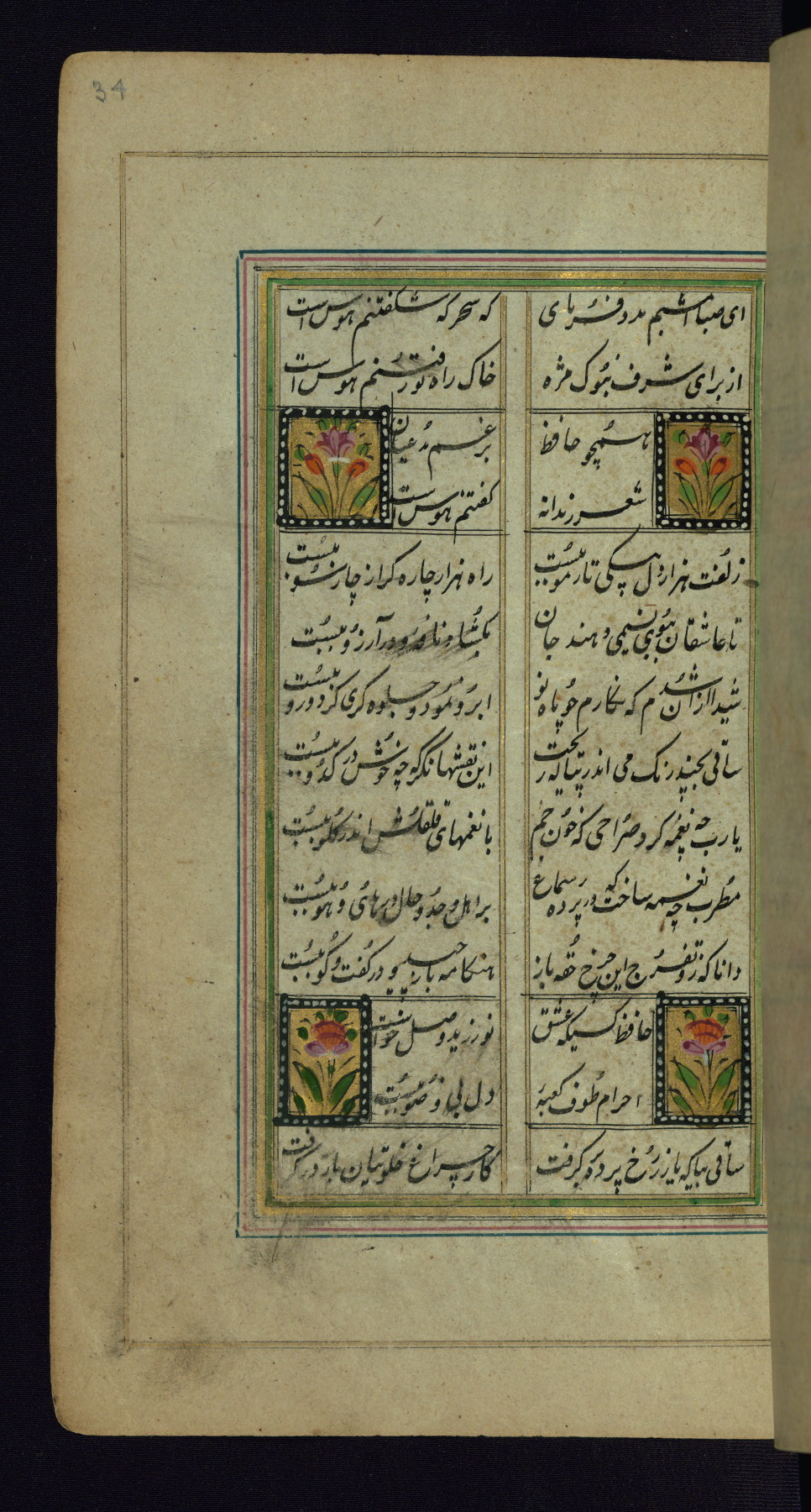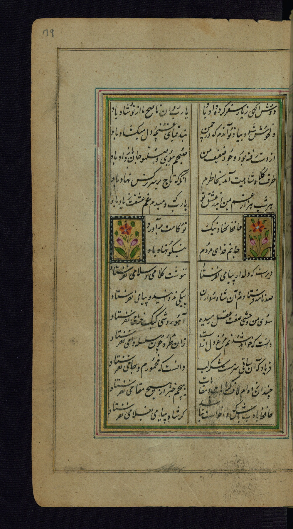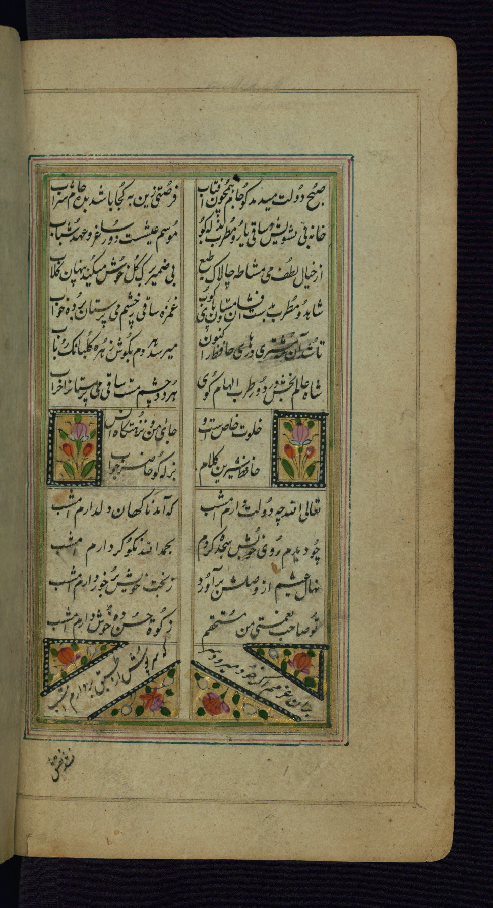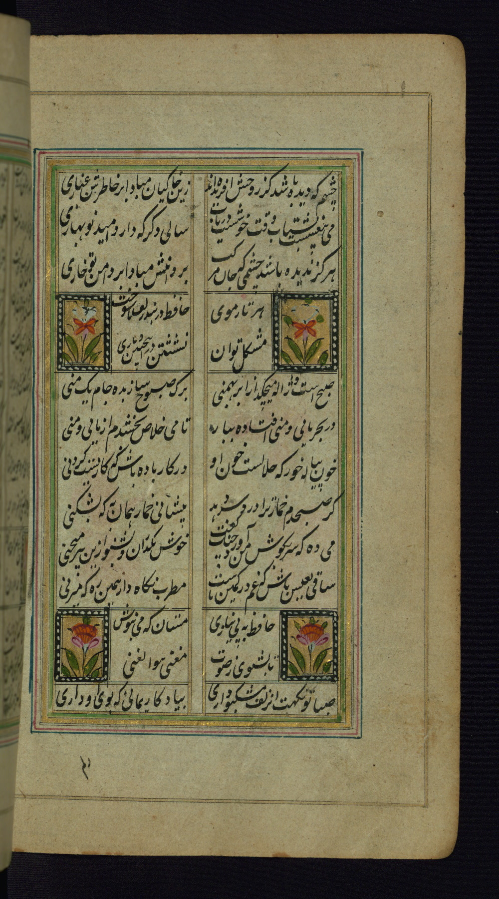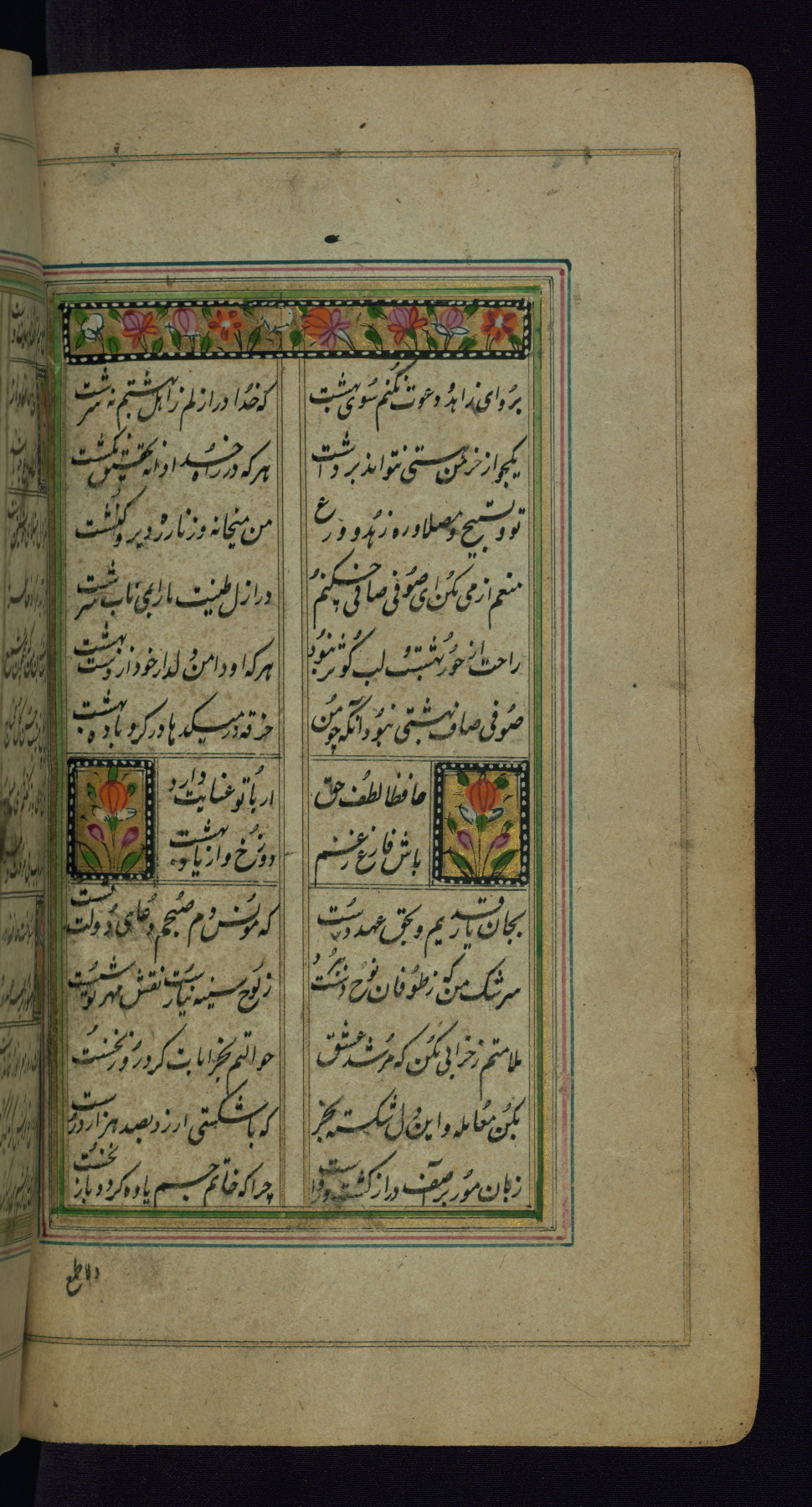 This is an illuminated and illustrated Collection of poems (dīvān) by Shams al-Dīn Muḥammad Ḥāfiz al-Shīrāzī (fl. eighth century AH / fourteenth CE), which was produced in India. According to the colophon, the manuscript was completed on the 19th Rajab 1202[?] AH / 1788[?] CE. It opens with a double-page illuminated incipit (fols. 1b-2a) with headpiece that introduces the preface (dībāchah) (fols. 1b-4b), followed by another double-page illuminated incipit with headpiece opening the main text of the Dīvān (fols. 5b-6a). The codex is decorated throughout with square and rectangular panels, as well as horizontal bands with floral decoration marking the end of odes, quatrains, or series of verses. There are forty-nine illustrations. The brown leather binding with medallion and pendants is contemporary with the manuscript.
