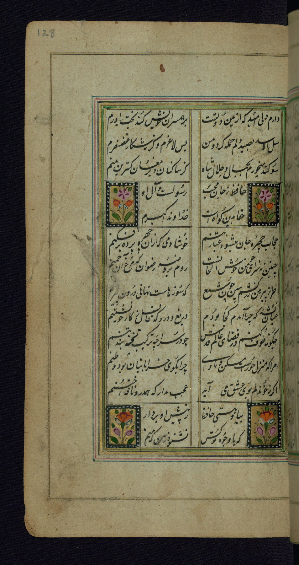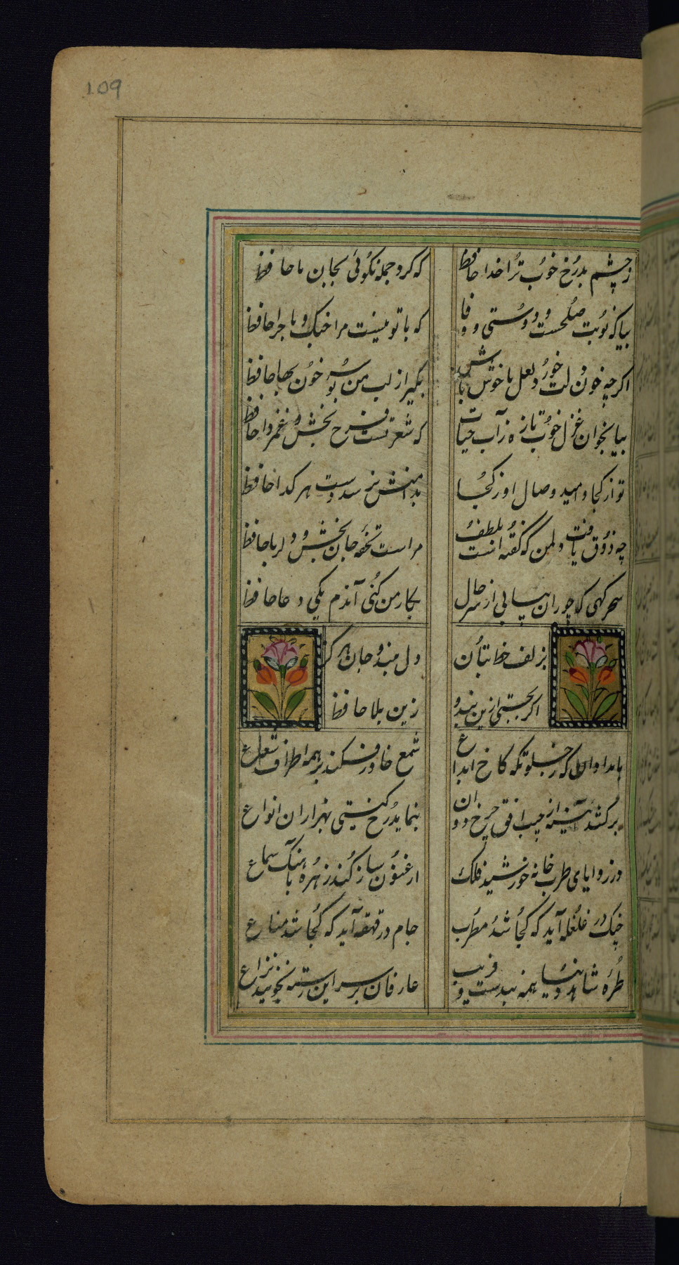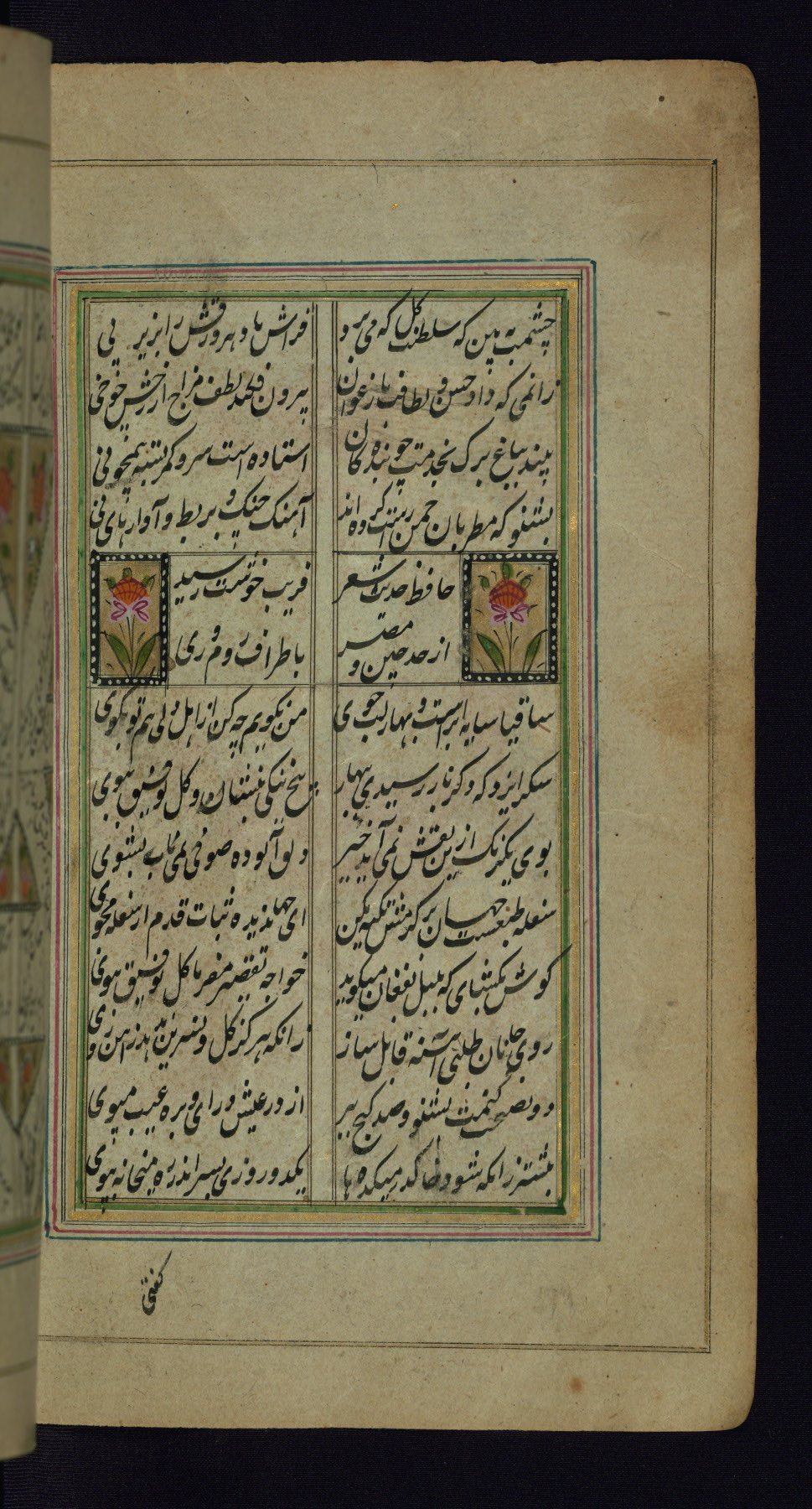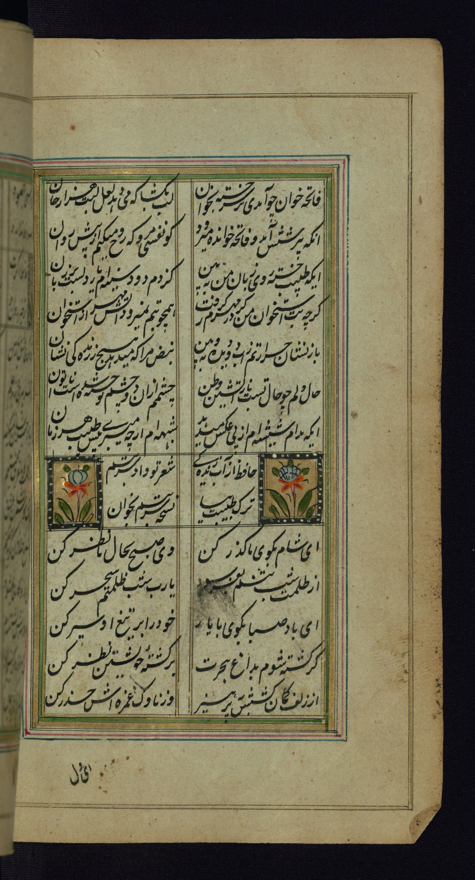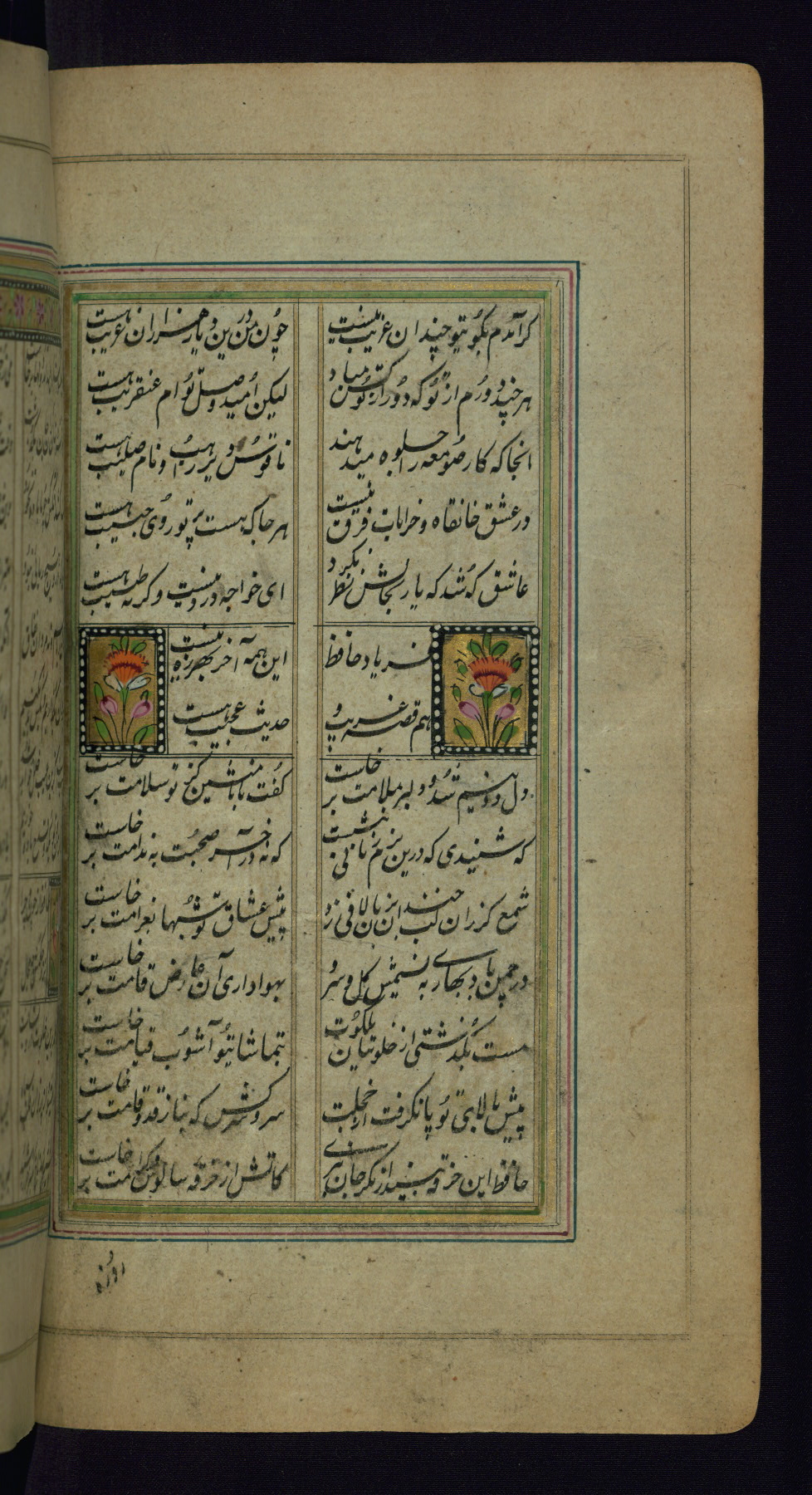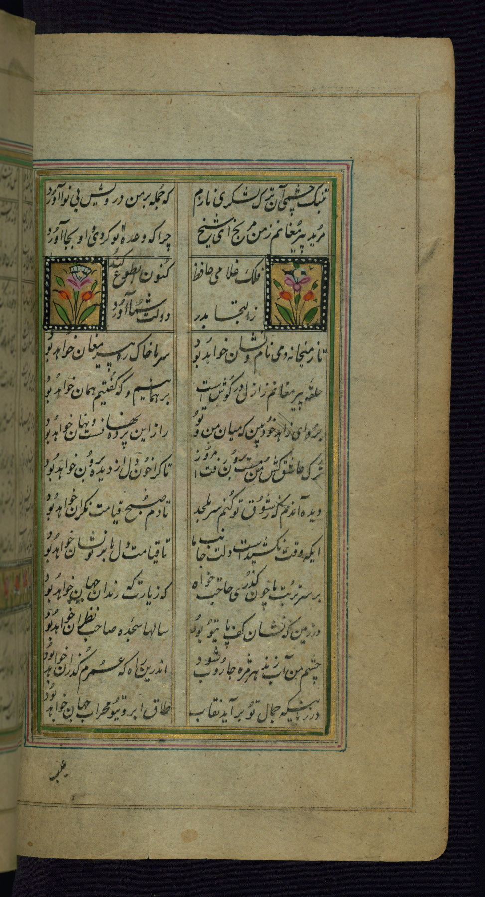 This is an illuminated and illustrated Collection of poems (dīvān) by Shams al-Dīn Muḥammad Ḥāfiz al-Shīrāzī (fl. eighth century AH / fourteenth CE), which was produced in India. According to the colophon, the manuscript was completed on the 19th Rajab 1202[?] AH / 1788[?] CE. It opens with a double-page illuminated incipit (fols. 1b-2a) with headpiece that introduces the preface (dībāchah) (fols. 1b-4b), followed by another double-page illuminated incipit with headpiece opening the main text of the Dīvān (fols. 5b-6a). The codex is decorated throughout with square and rectangular panels, as well as horizontal bands with floral decoration marking the end of odes, quatrains, or series of verses. There are forty-nine illustrations. The brown leather binding with medallion and pendants is contemporary with the manuscript.