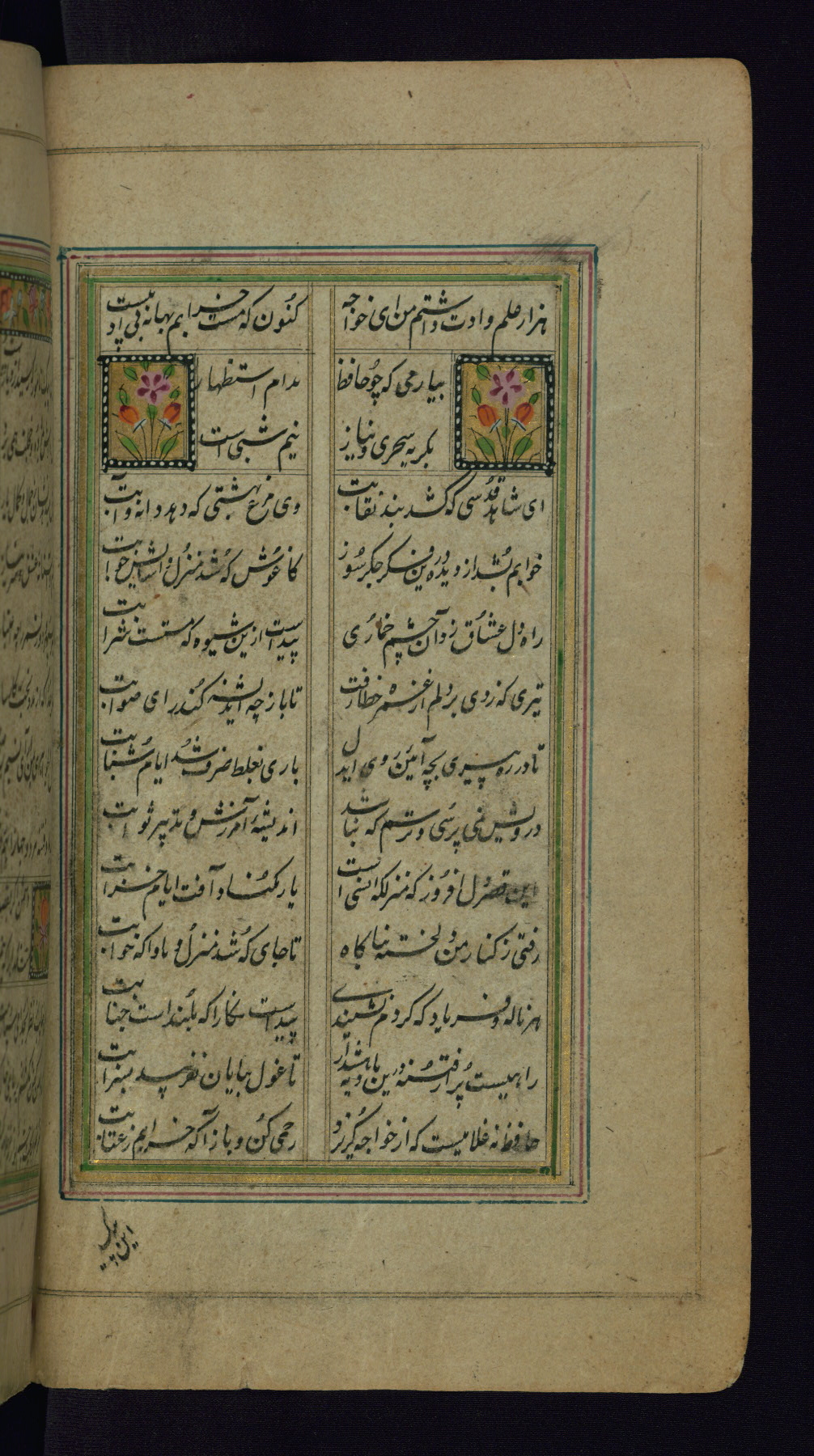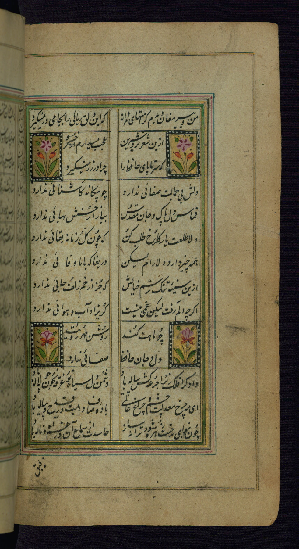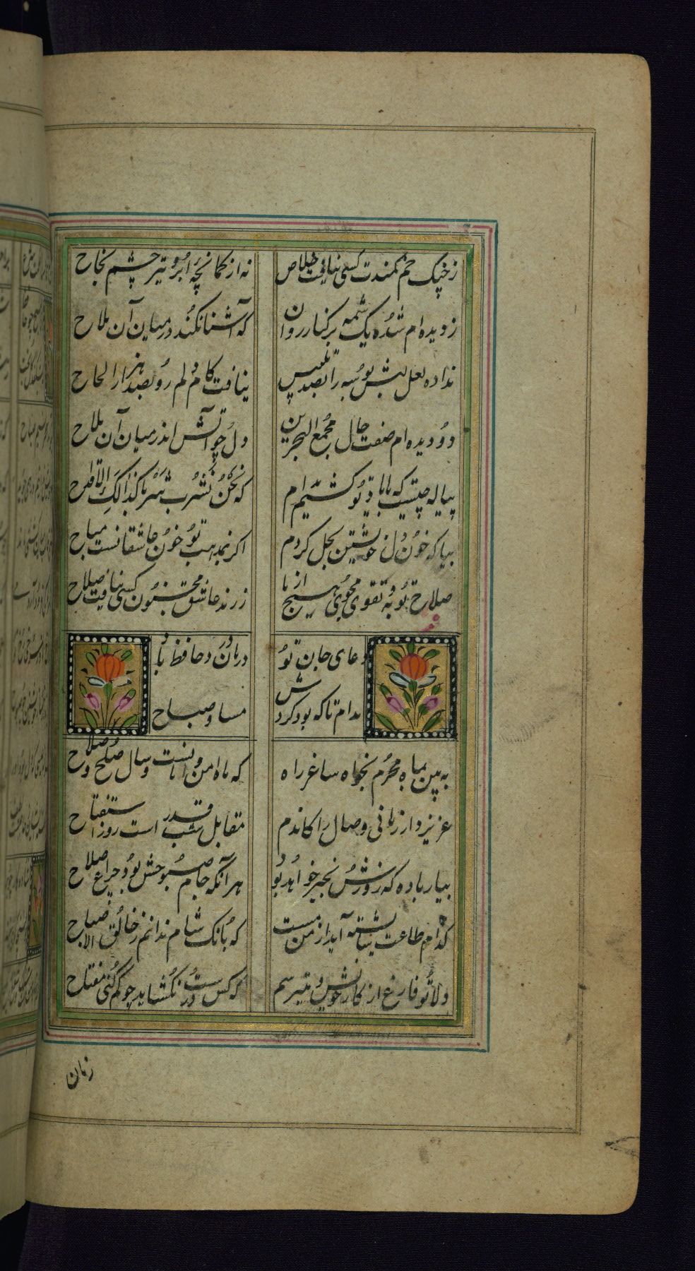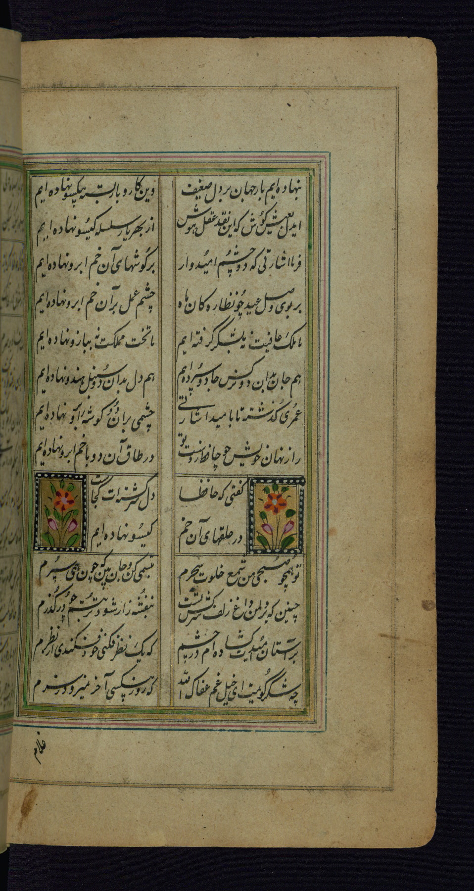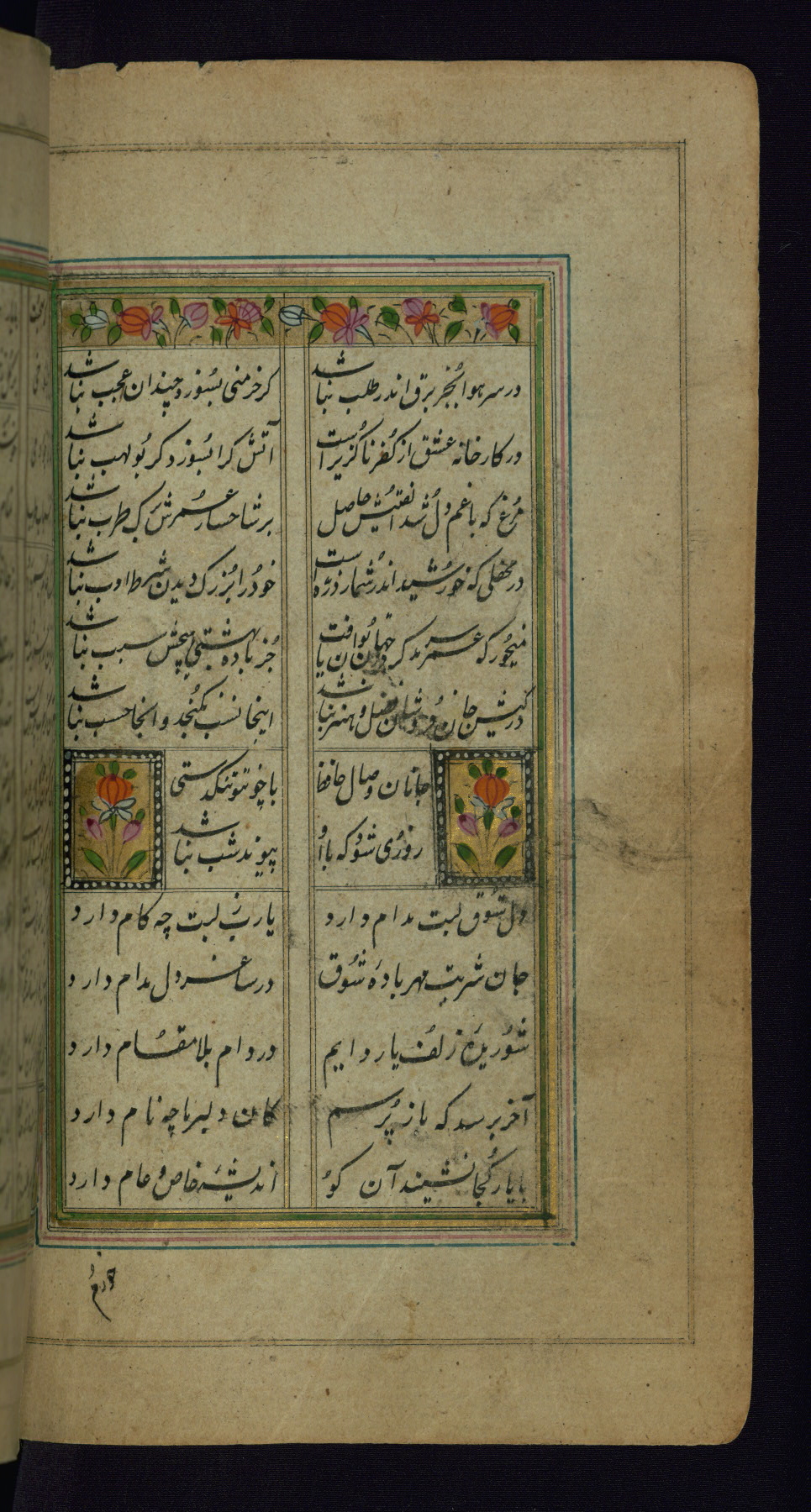 This is an illuminated and illustrated Collection of poems (dīvān) by Shams al-Dīn Muḥammad Ḥāfiz al-Shīrāzī (fl. eighth century AH / fourteenth CE), which was produced in India. According to the colophon, the manuscript was completed on the 19th Rajab 1202[?] AH / 1788[?] CE. It opens with a double-page illuminated incipit (fols. 1b-2a) with headpiece that introduces the preface (dībāchah) (fols. 1b-4b), followed by another double-page illuminated incipit with headpiece opening the main text of the Dīvān (fols. 5b-6a). The codex is decorated throughout with square and rectangular panels, as well as horizontal bands with floral decoration marking the end of odes, quatrains, or series of verses. There are forty-nine illustrations. The brown leather binding with medallion and pendants is contemporary with the manuscript.