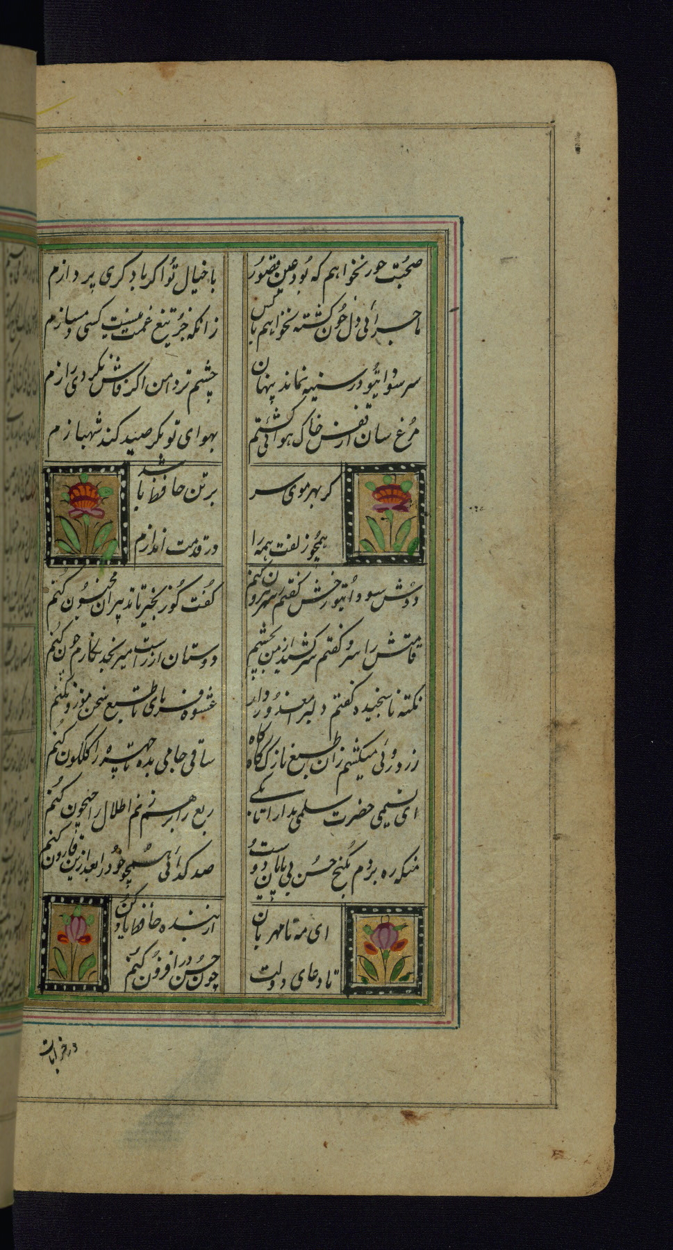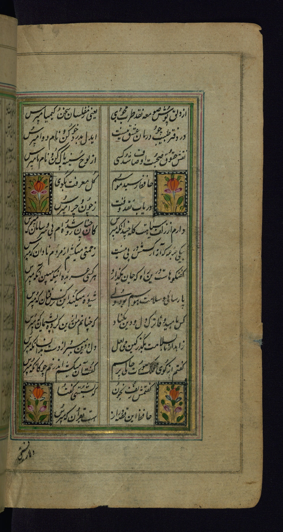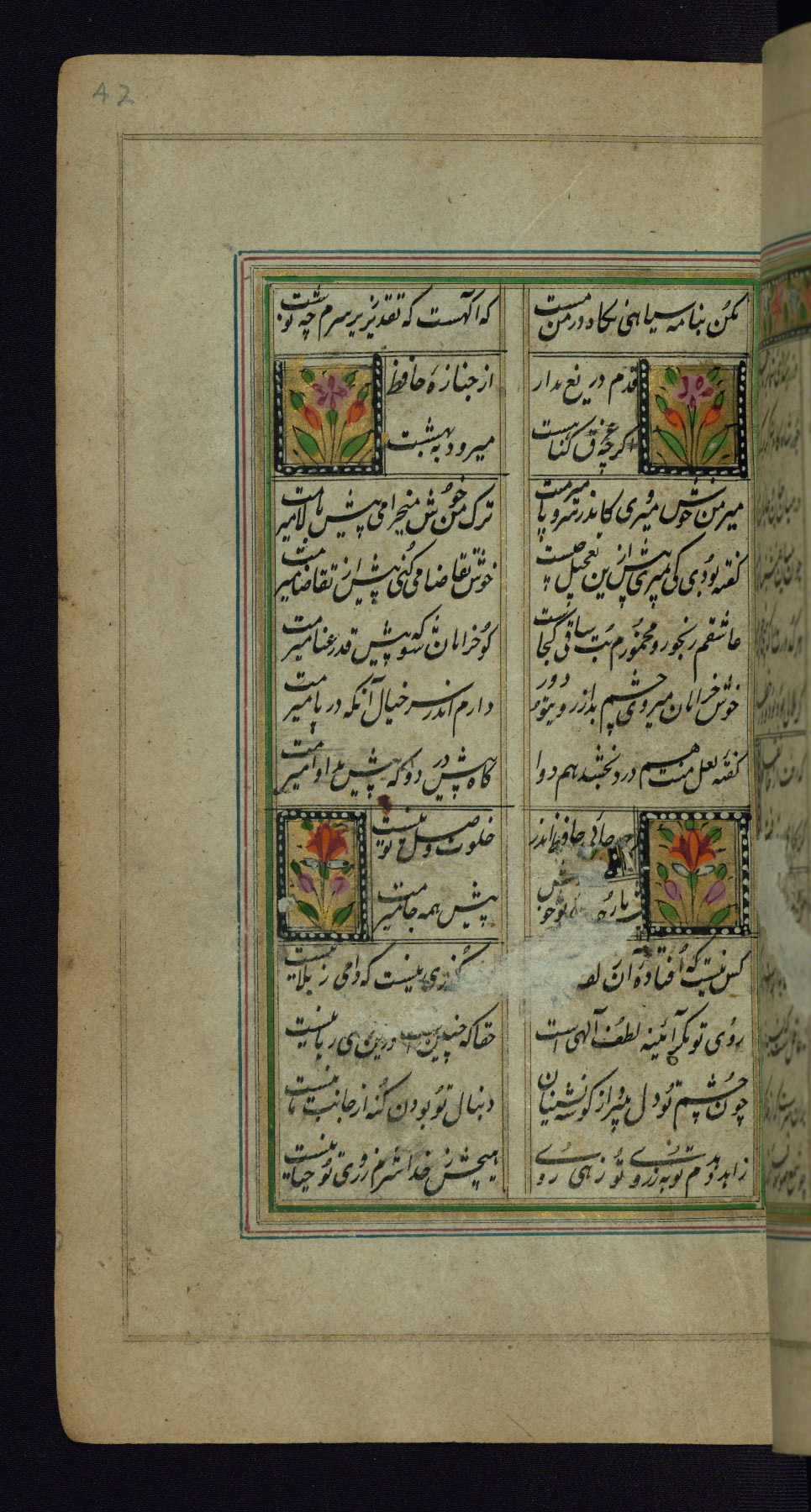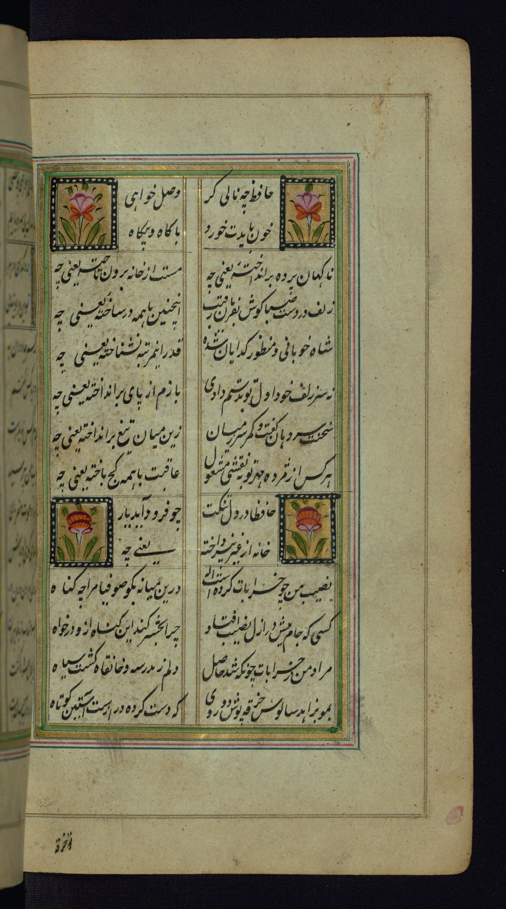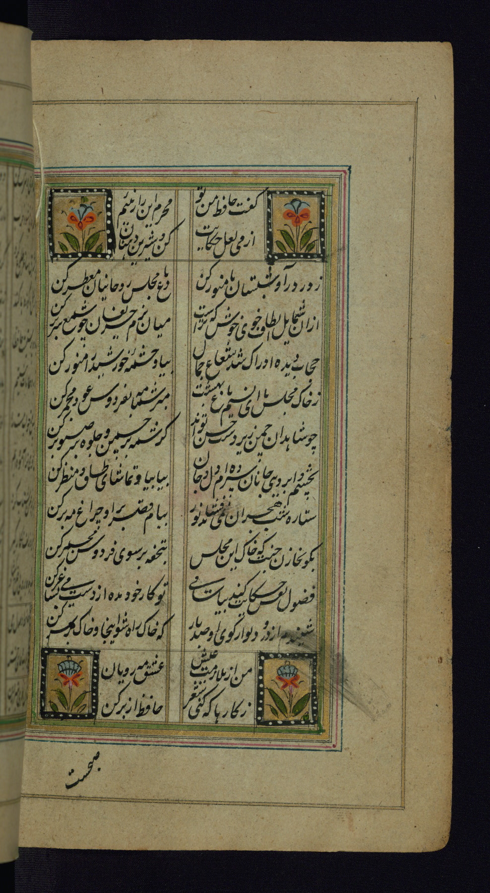 This is an illuminated and illustrated Collection of poems (dīvān) by Shams al-Dīn Muḥammad Ḥāfiz al-Shīrāzī (fl. eighth century AH / fourteenth CE), which was produced in India. According to the colophon, the manuscript was completed on the 19th Rajab 1202[?] AH / 1788[?] CE. It opens with a double-page illuminated incipit (fols. 1b-2a) with headpiece that introduces the preface (dībāchah) (fols. 1b-4b), followed by another double-page illuminated incipit with headpiece opening the main text of the Dīvān (fols. 5b-6a). The codex is decorated throughout with square and rectangular panels, as well as horizontal bands with floral decoration marking the end of odes, quatrains, or series of verses. There are forty-nine illustrations. The brown leather binding with medallion and pendants is contemporary with the manuscript.