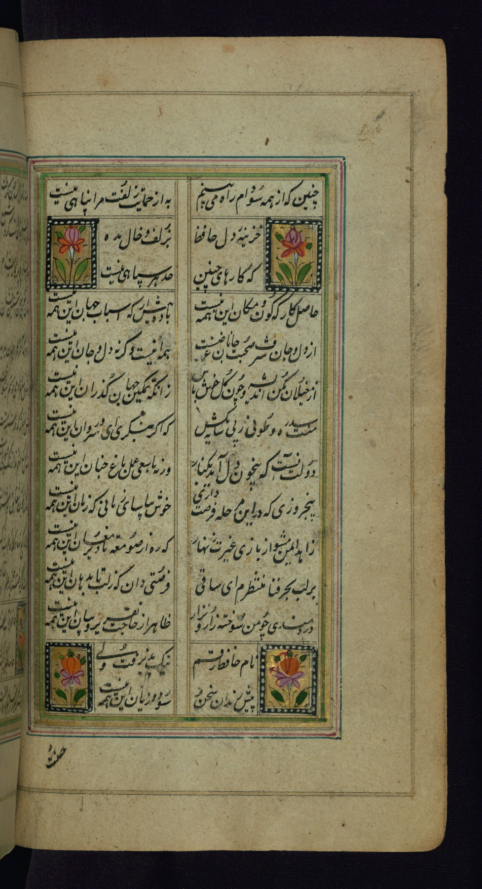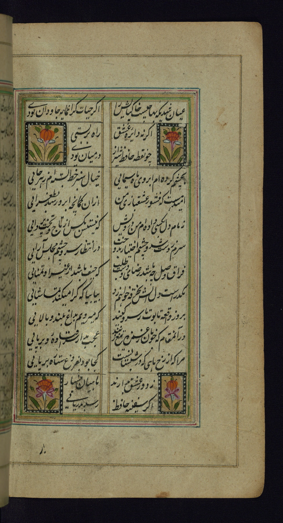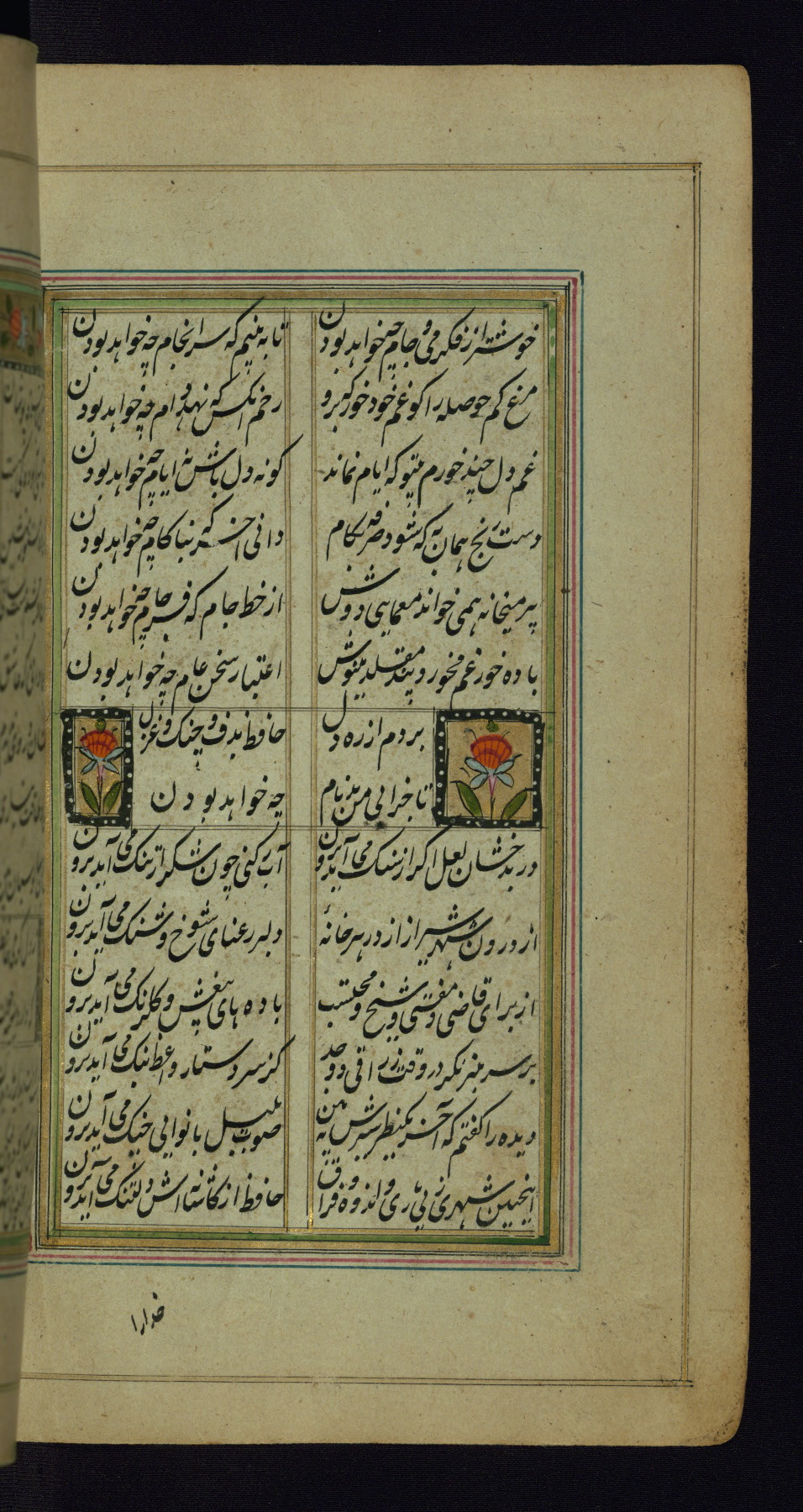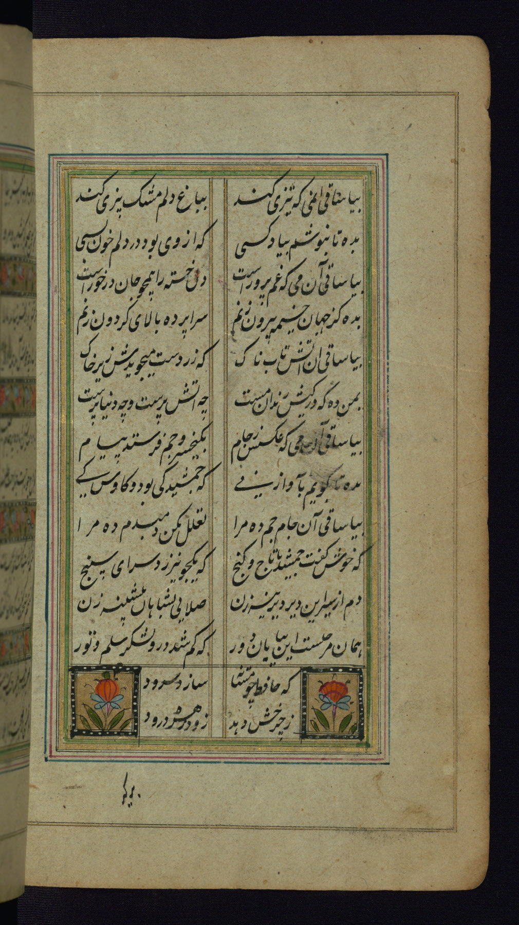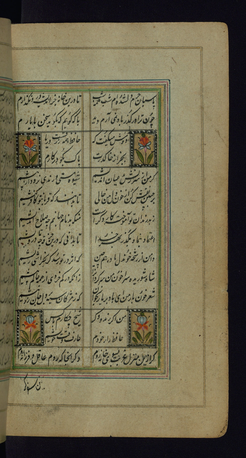 This is an illuminated and illustrated Collection of poems (dīvān) by Shams al-Dīn Muḥammad Ḥāfiz al-Shīrāzī (fl. eighth century AH / fourteenth CE), which was produced in India. According to the colophon, the manuscript was completed on the 19th Rajab 1202[?] AH / 1788[?] CE. It opens with a double-page illuminated incipit (fols. 1b-2a) with headpiece that introduces the preface (dībāchah) (fols. 1b-4b), followed by another double-page illuminated incipit with headpiece opening the main text of the Dīvān (fols. 5b-6a). The codex is decorated throughout with square and rectangular panels, as well as horizontal bands with floral decoration marking the end of odes, quatrains, or series of verses. There are forty-nine illustrations. The brown leather binding with medallion and pendants is contemporary with the manuscript.