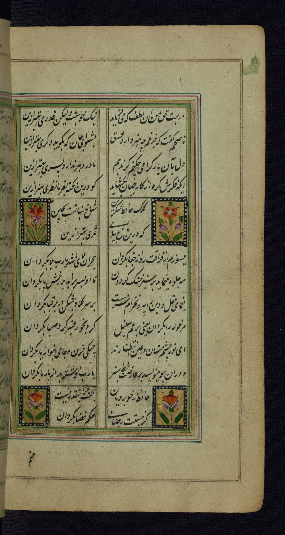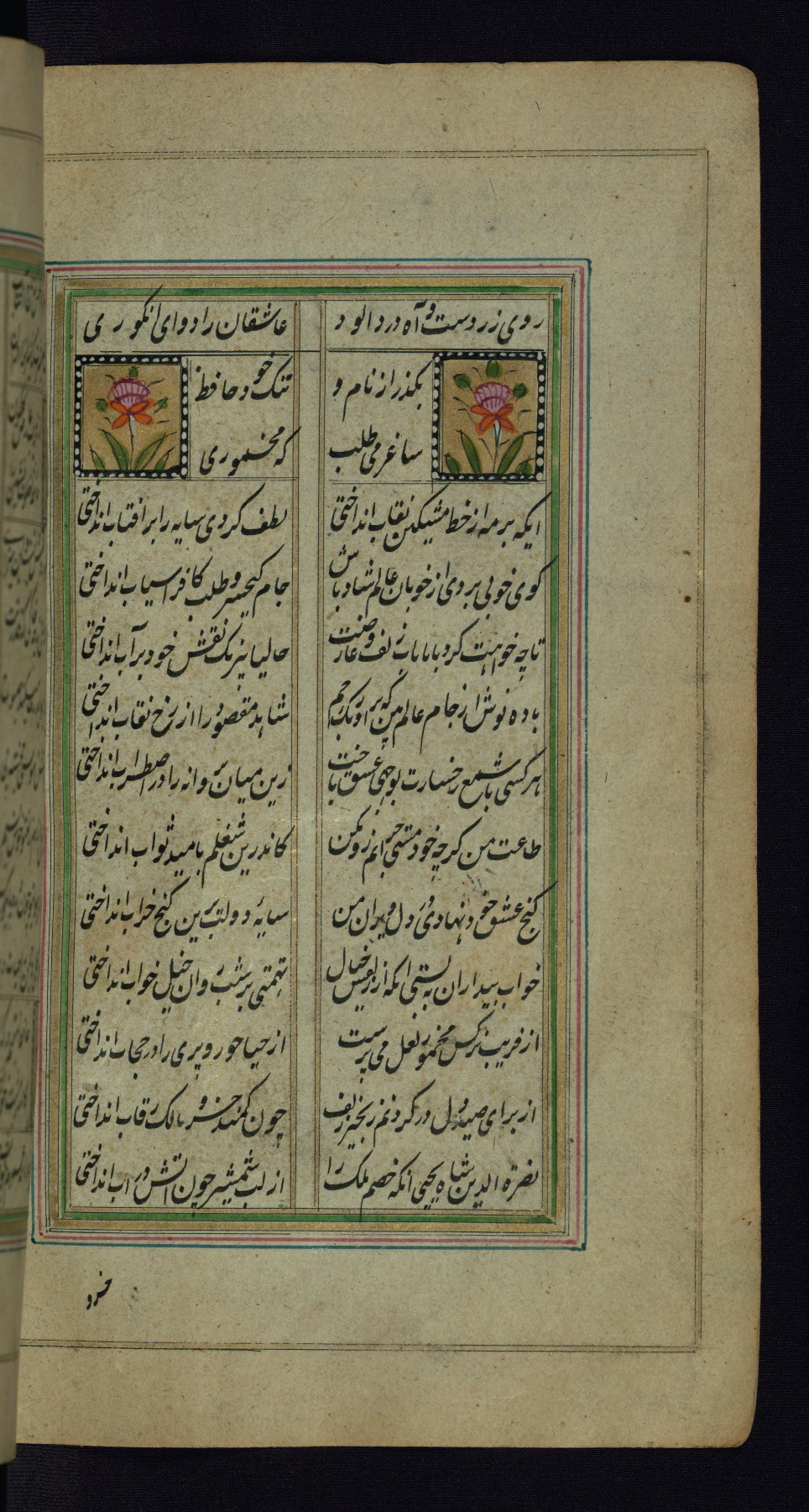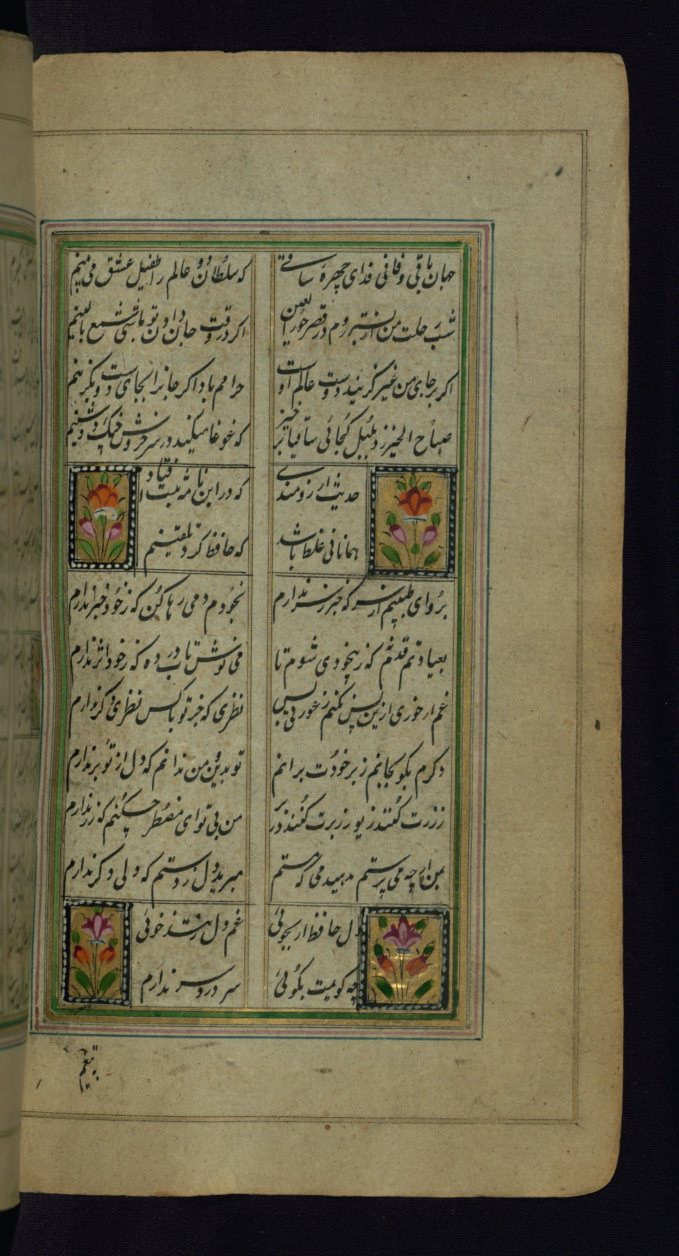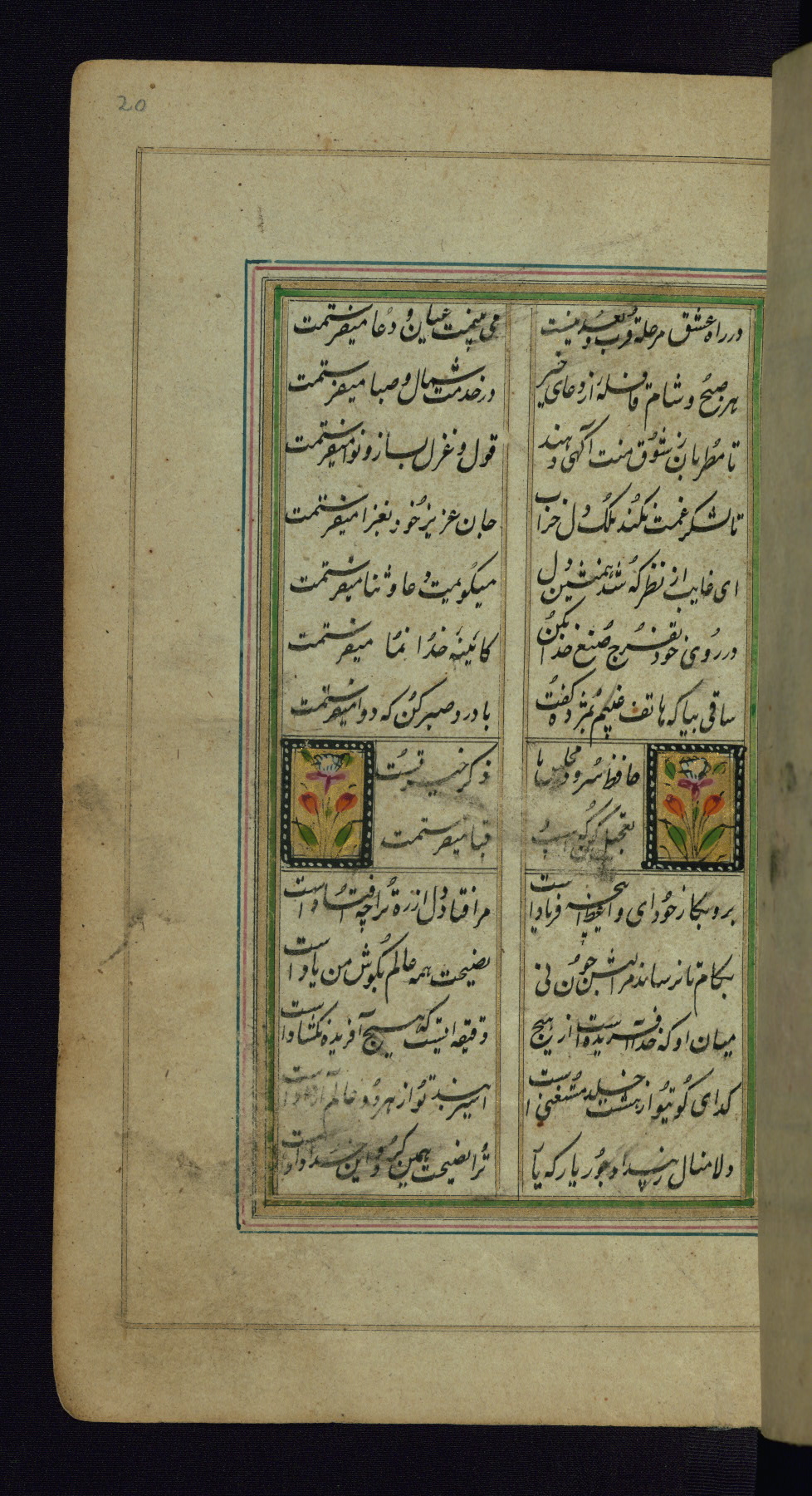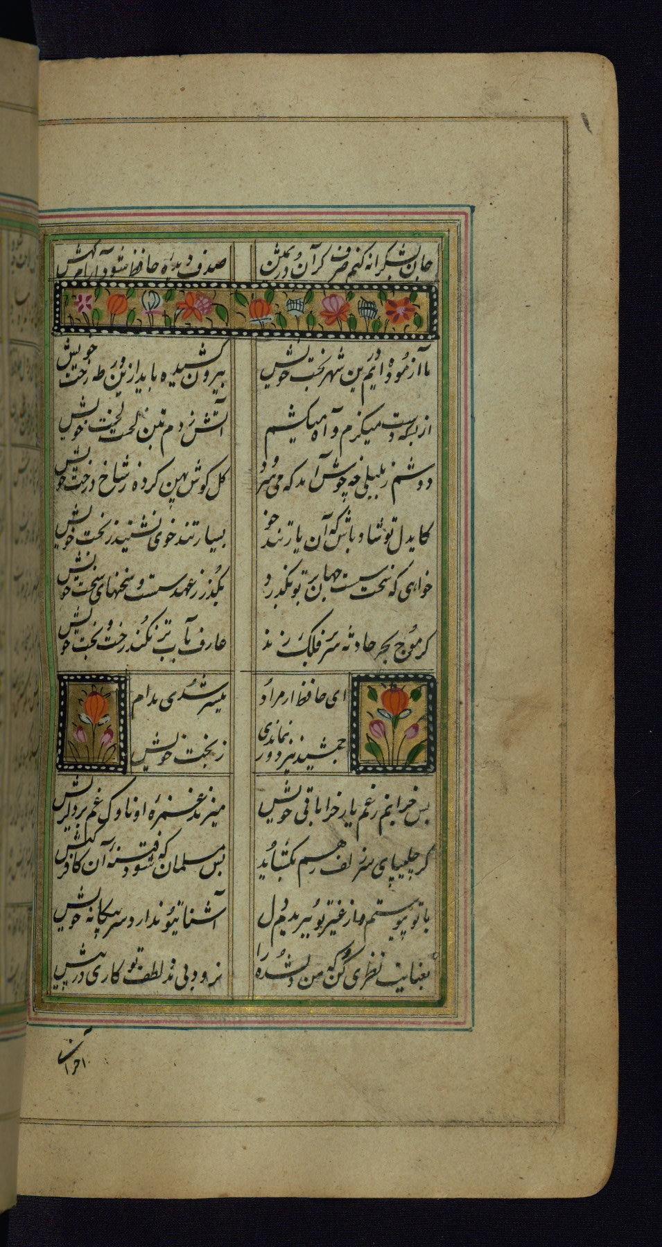 This is an illuminated and illustrated Collection of poems (dīvān) by Shams al-Dīn Muḥammad Ḥāfiz al-Shīrāzī (fl. eighth century AH / fourteenth CE), which was produced in India. According to the colophon, the manuscript was completed on the 19th Rajab 1202[?] AH / 1788[?] CE. It opens with a double-page illuminated incipit (fols. 1b-2a) with headpiece that introduces the preface (dībāchah) (fols. 1b-4b), followed by another double-page illuminated incipit with headpiece opening the main text of the Dīvān (fols. 5b-6a). The codex is decorated throughout with square and rectangular panels, as well as horizontal bands with floral decoration marking the end of odes, quatrains, or series of verses. There are forty-nine illustrations. The brown leather binding with medallion and pendants is contemporary with the manuscript.