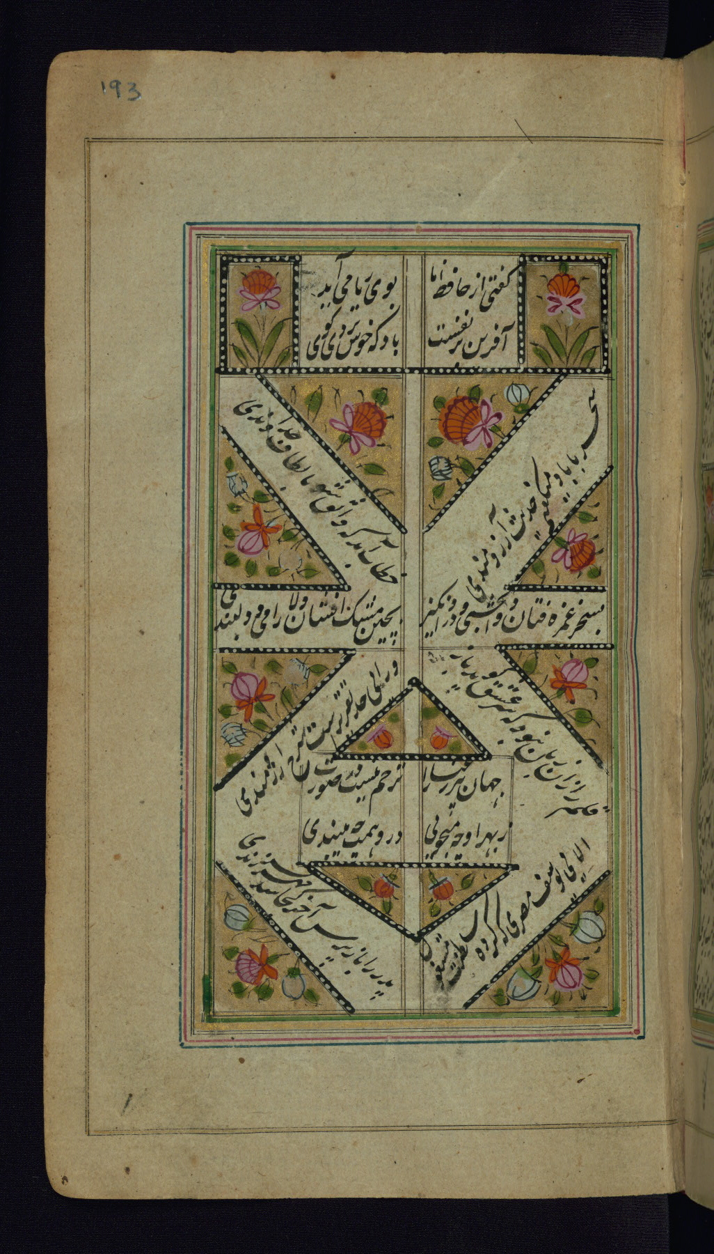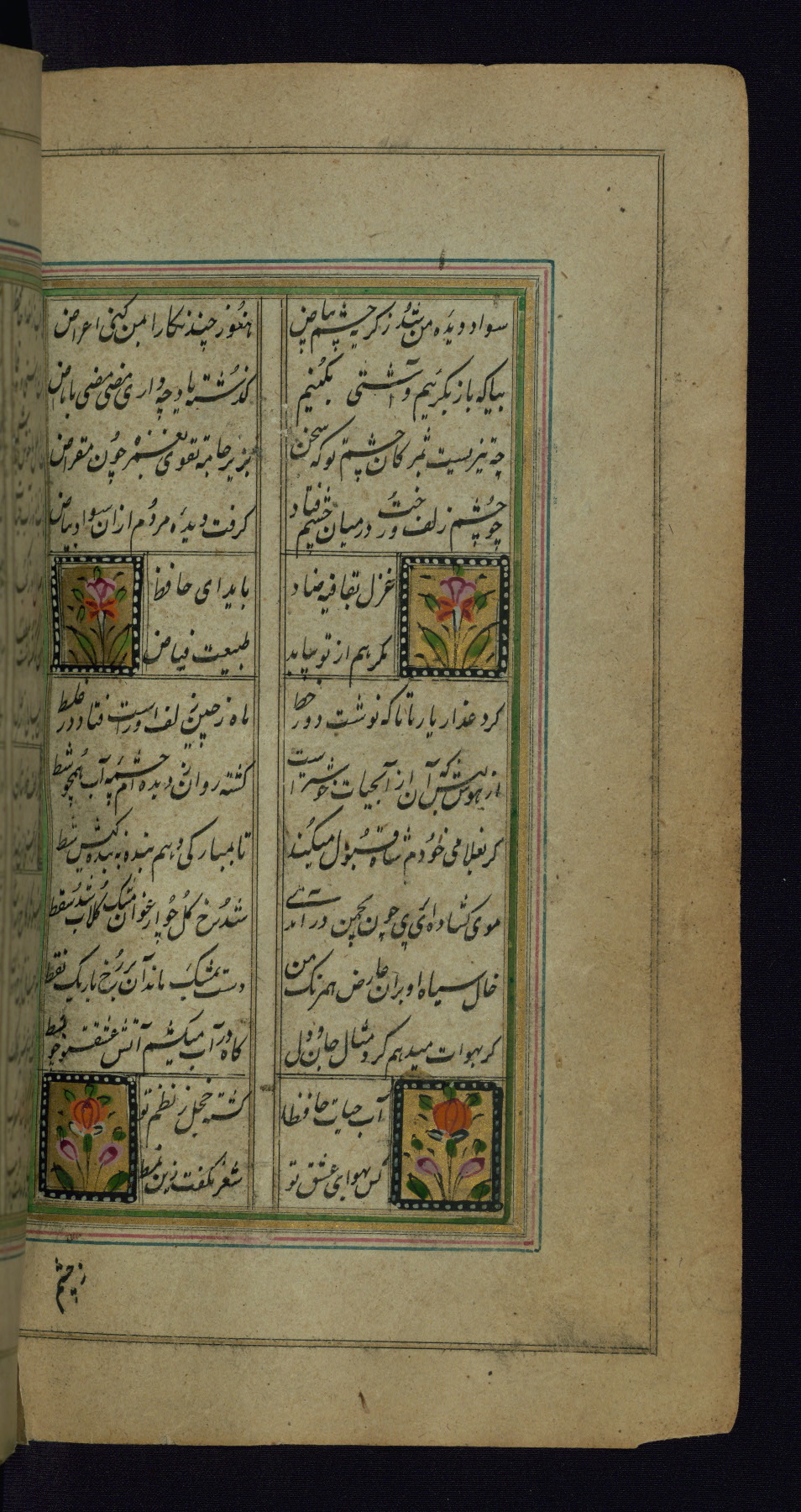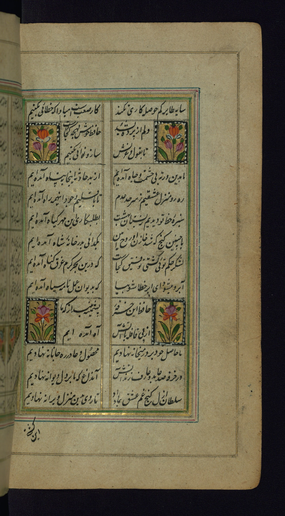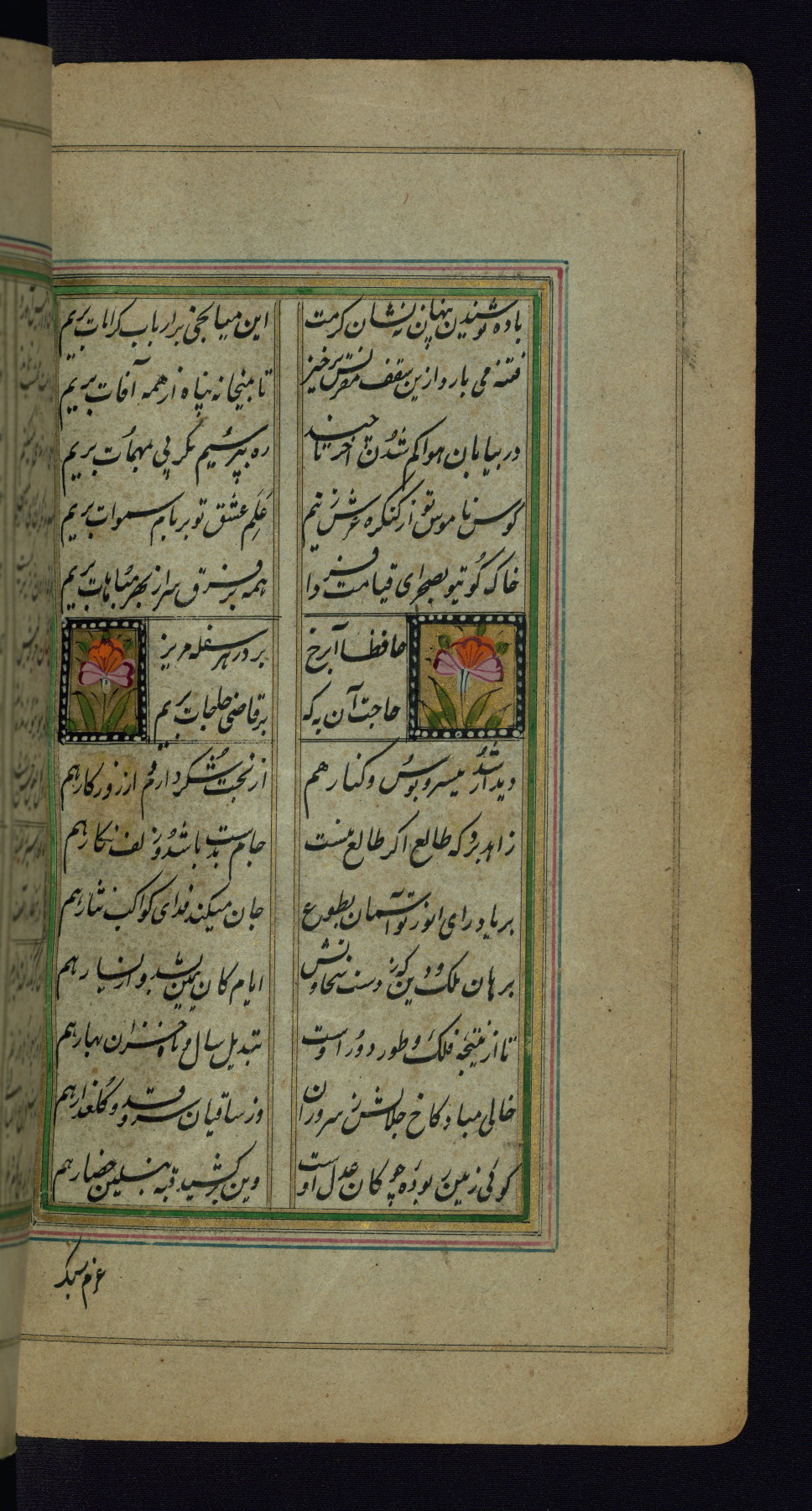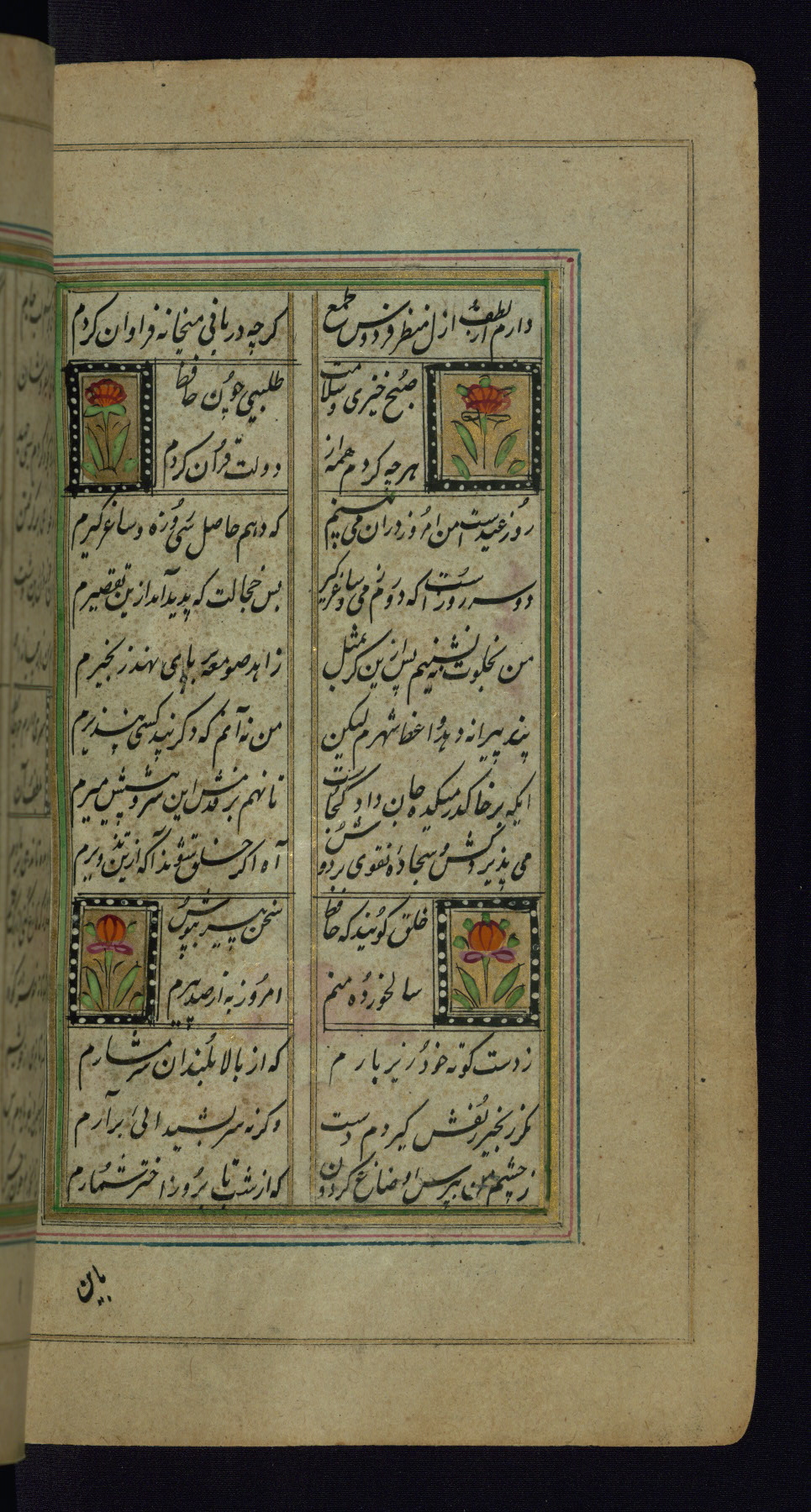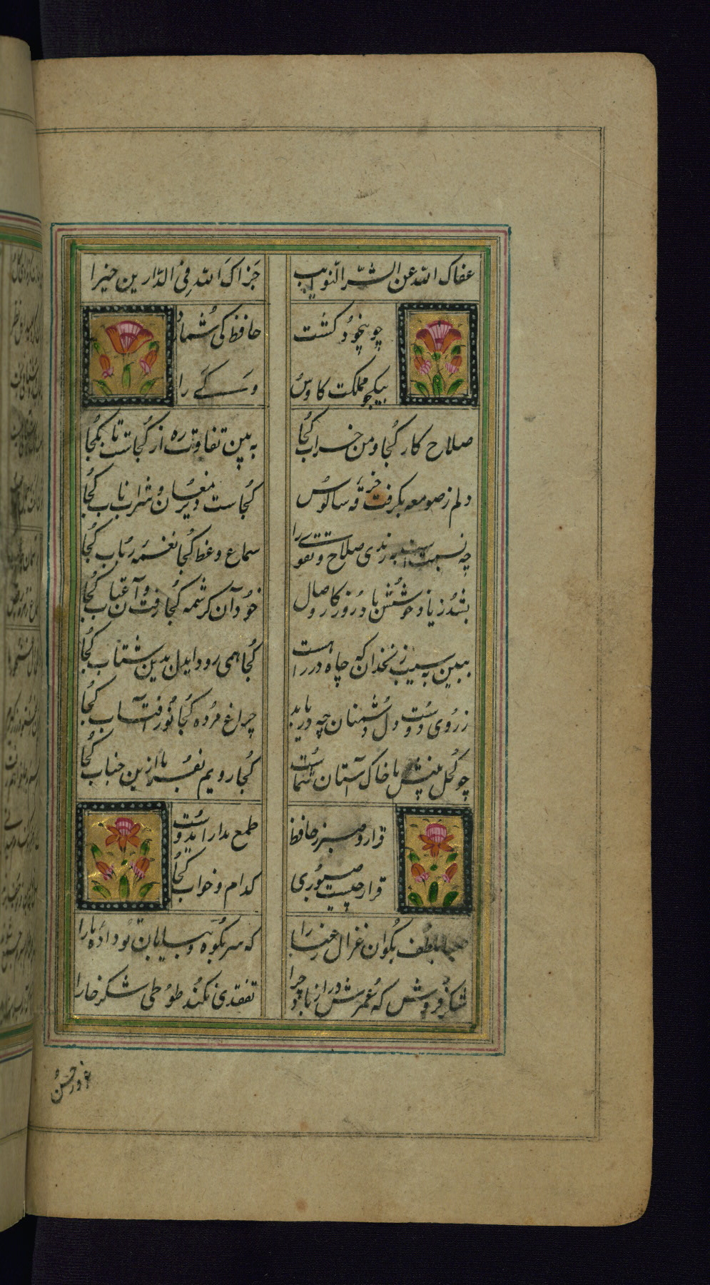 This is an illuminated and illustrated Collection of poems (dīvān) by Shams al-Dīn Muḥammad Ḥāfiz al-Shīrāzī (fl. eighth century AH / fourteenth CE), which was produced in India. According to the colophon, the manuscript was completed on the 19th Rajab 1202[?] AH / 1788[?] CE. It opens with a double-page illuminated incipit (fols. 1b-2a) with headpiece that introduces the preface (dībāchah) (fols. 1b-4b), followed by another double-page illuminated incipit with headpiece opening the main text of the Dīvān (fols. 5b-6a). The codex is decorated throughout with square and rectangular panels, as well as horizontal bands with floral decoration marking the end of odes, quatrains, or series of verses. There are forty-nine illustrations. The brown leather binding with medallion and pendants is contemporary with the manuscript.