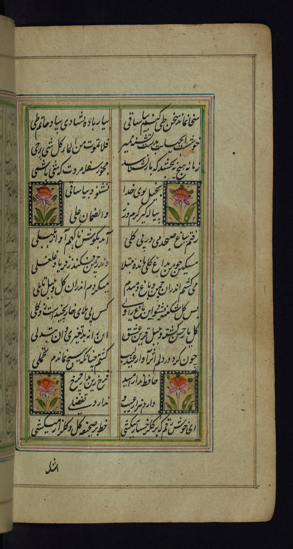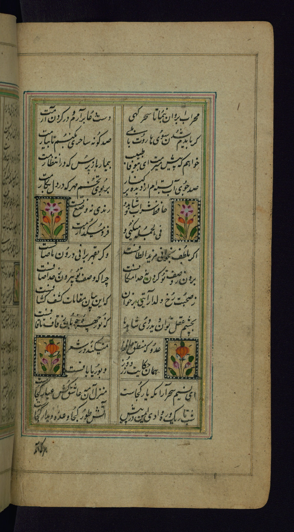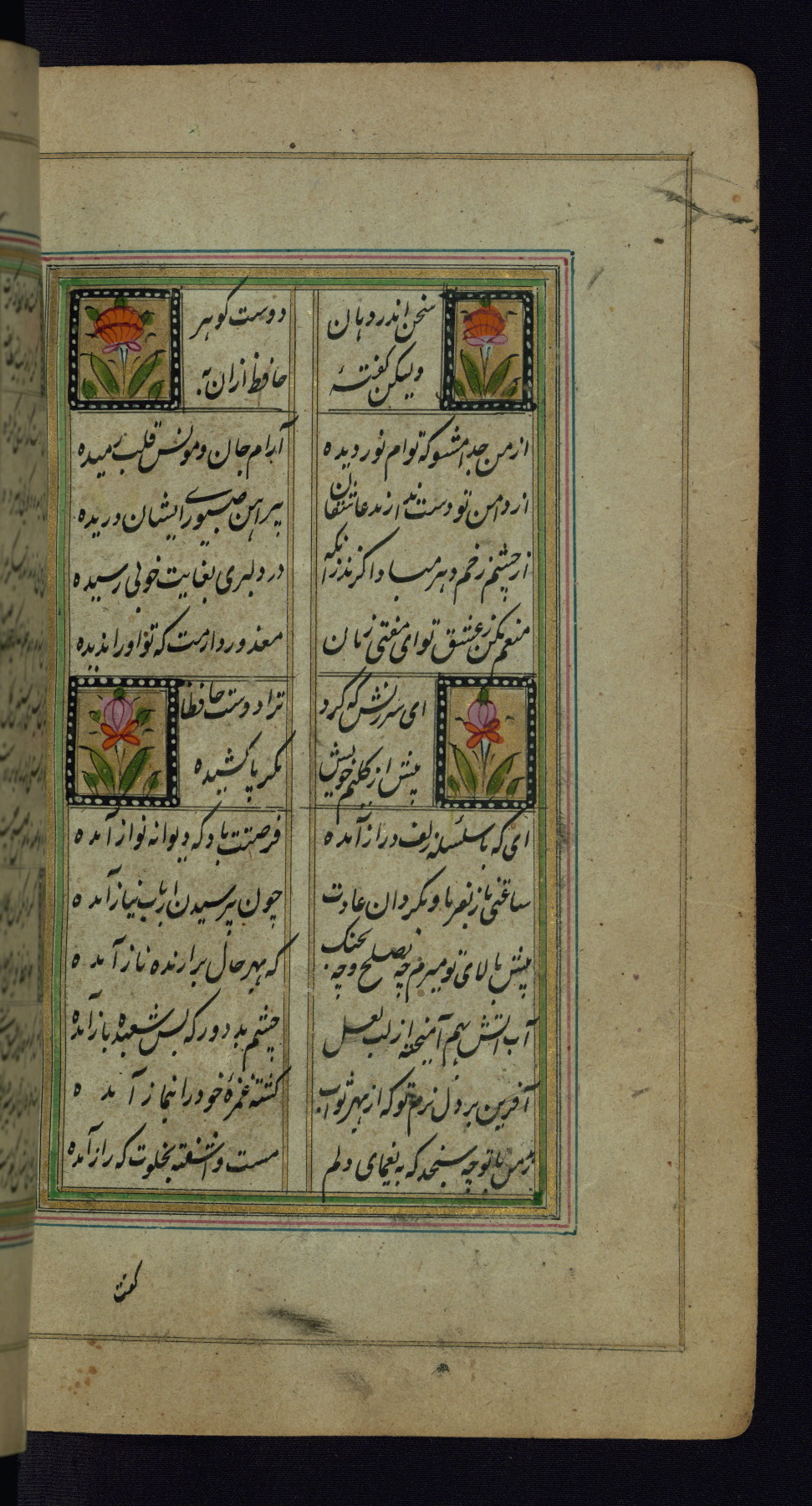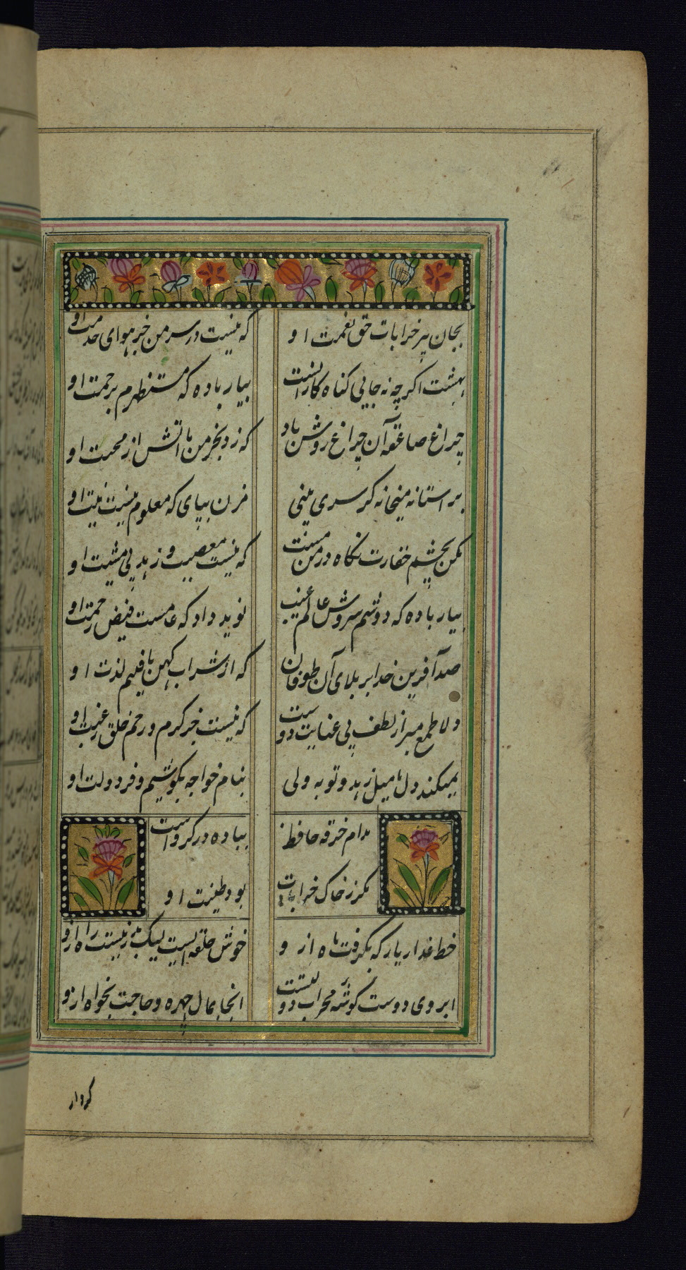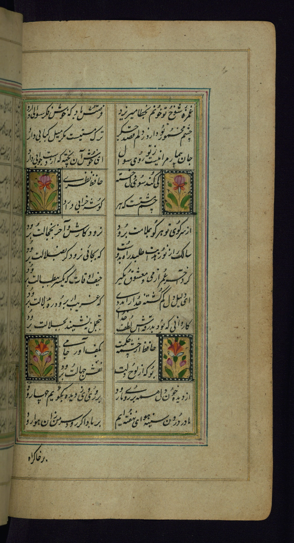 This is an illuminated and illustrated Collection of poems (dīvān) by Shams al-Dīn Muḥammad Ḥāfiz al-Shīrāzī (fl. eighth century AH / fourteenth CE), which was produced in India. According to the colophon, the manuscript was completed on the 19th Rajab 1202[?] AH / 1788[?] CE. It opens with a double-page illuminated incipit (fols. 1b-2a) with headpiece that introduces the preface (dībāchah) (fols. 1b-4b), followed by another double-page illuminated incipit with headpiece opening the main text of the Dīvān (fols. 5b-6a). The codex is decorated throughout with square and rectangular panels, as well as horizontal bands with floral decoration marking the end of odes, quatrains, or series of verses. There are forty-nine illustrations. The brown leather binding with medallion and pendants is contemporary with the manuscript.
