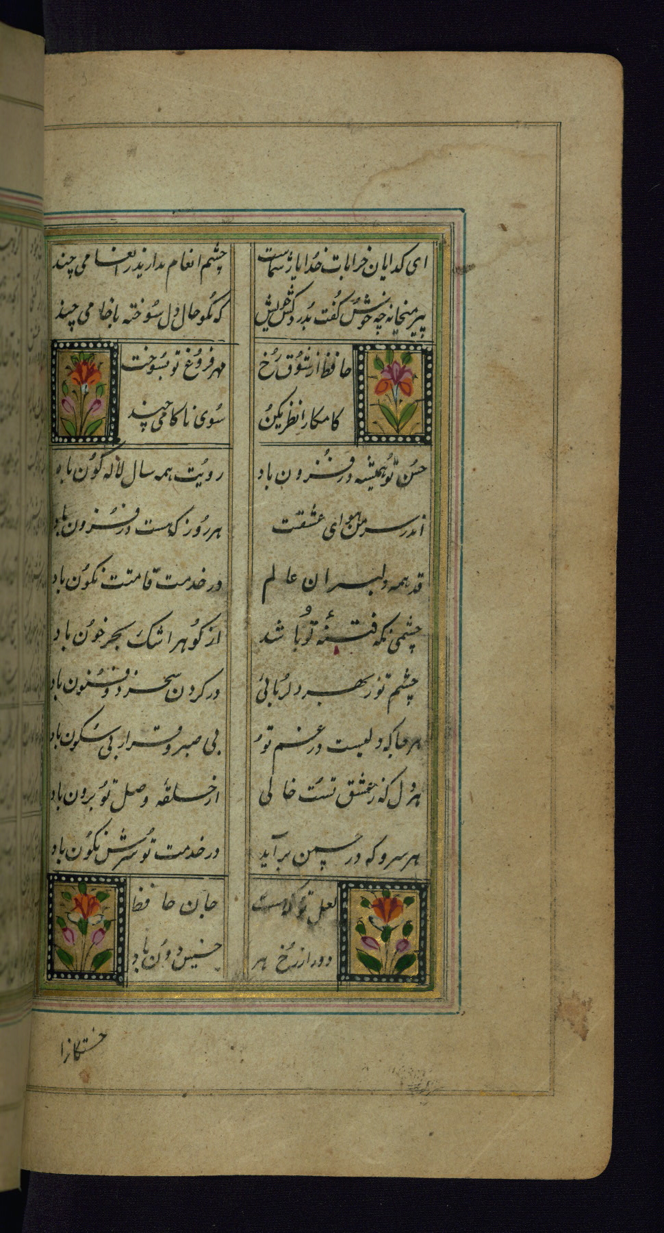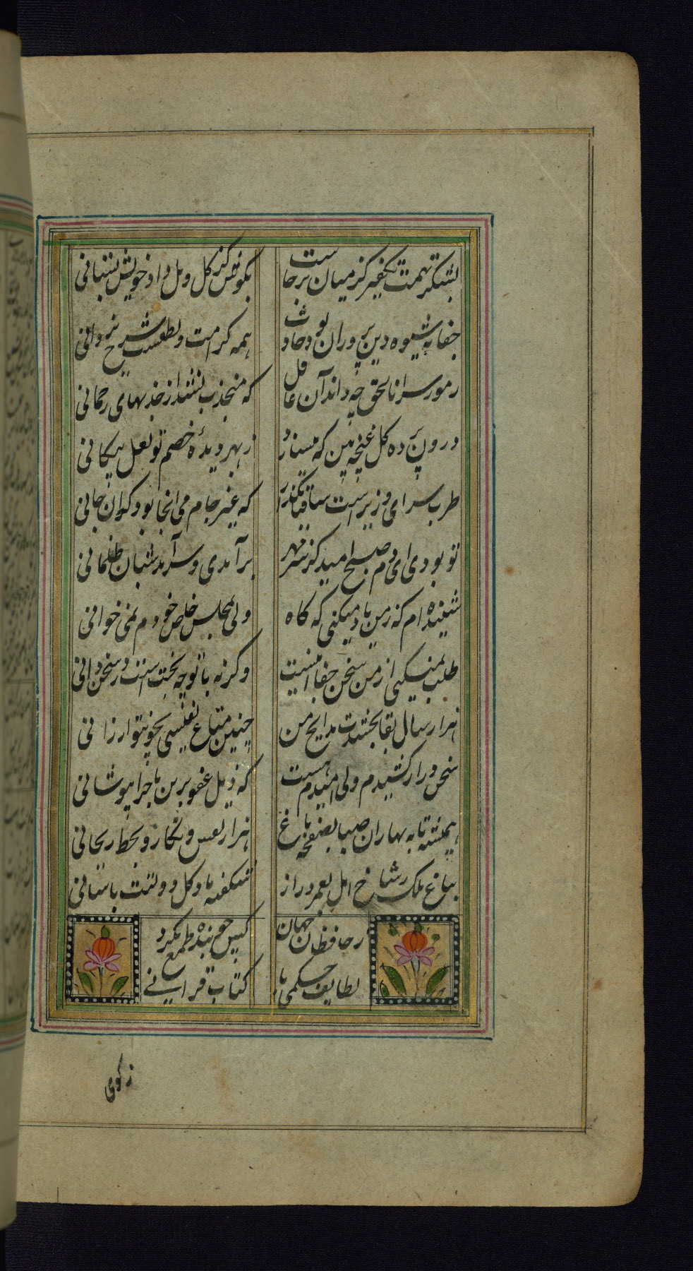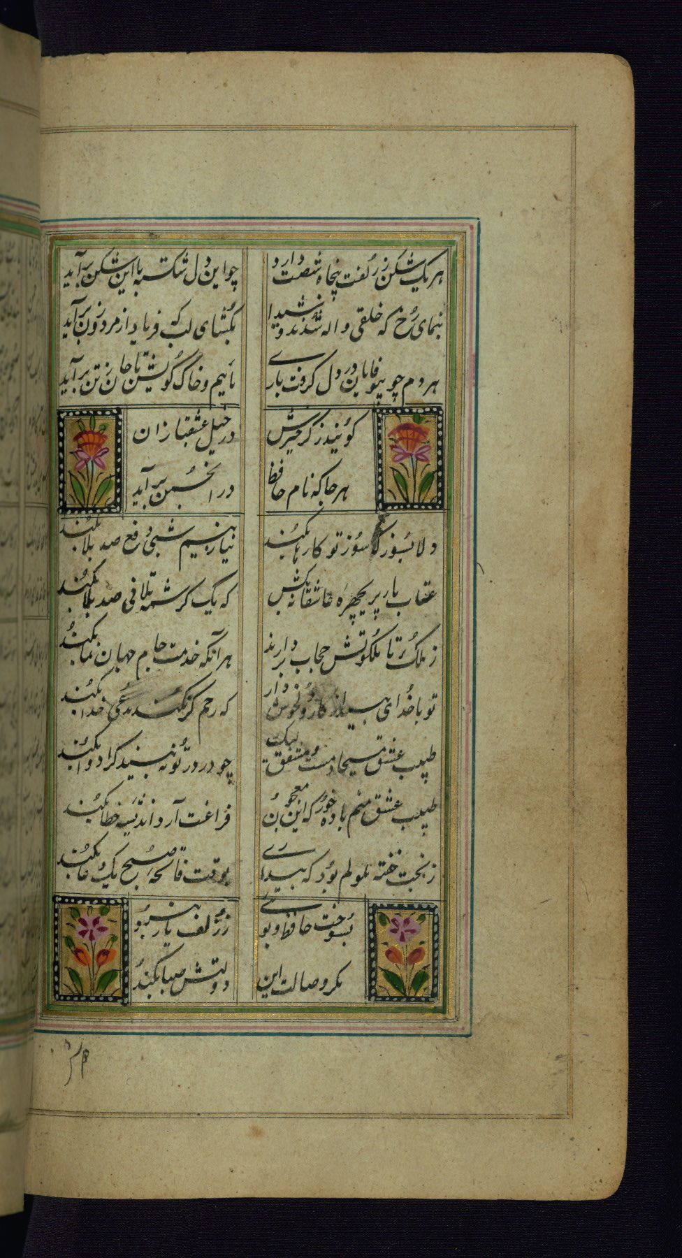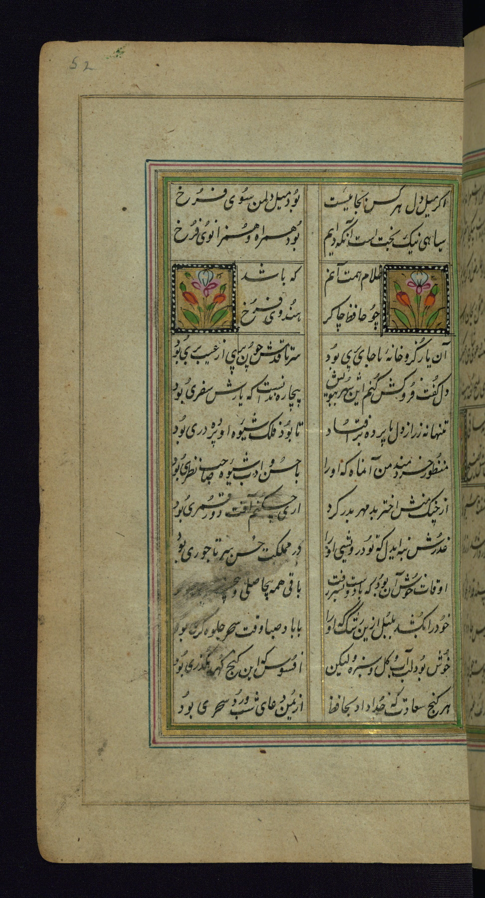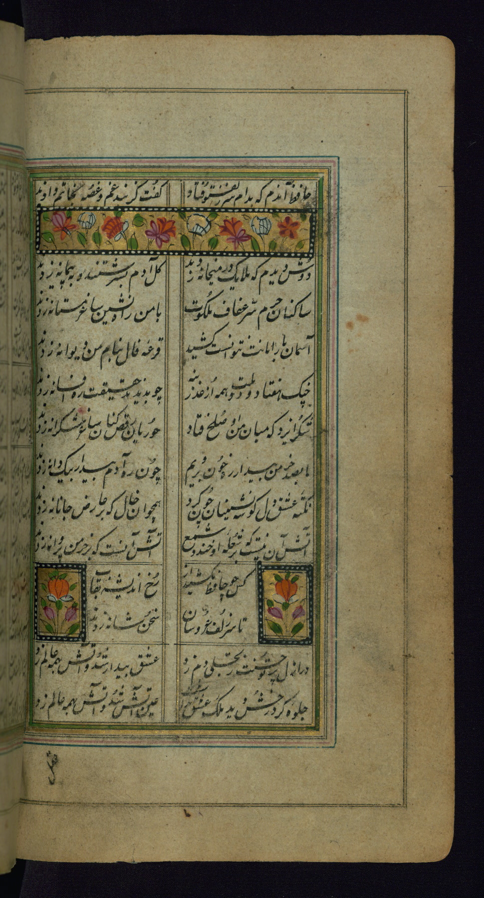 This is an illuminated and illustrated Collection of poems (dīvān) by Shams al-Dīn Muḥammad Ḥāfiz al-Shīrāzī (fl. eighth century AH / fourteenth CE), which was produced in India. According to the colophon, the manuscript was completed on the 19th Rajab 1202[?] AH / 1788[?] CE. It opens with a double-page illuminated incipit (fols. 1b-2a) with headpiece that introduces the preface (dībāchah) (fols. 1b-4b), followed by another double-page illuminated incipit with headpiece opening the main text of the Dīvān (fols. 5b-6a). The codex is decorated throughout with square and rectangular panels, as well as horizontal bands with floral decoration marking the end of odes, quatrains, or series of verses. There are forty-nine illustrations. The brown leather binding with medallion and pendants is contemporary with the manuscript.