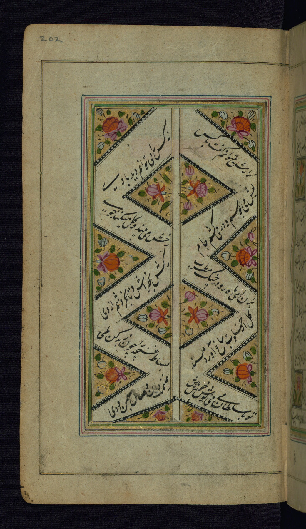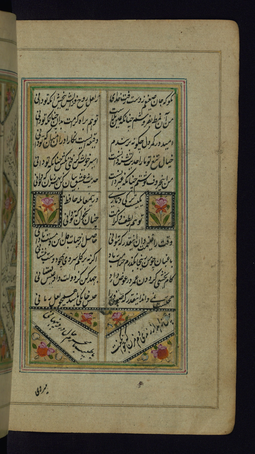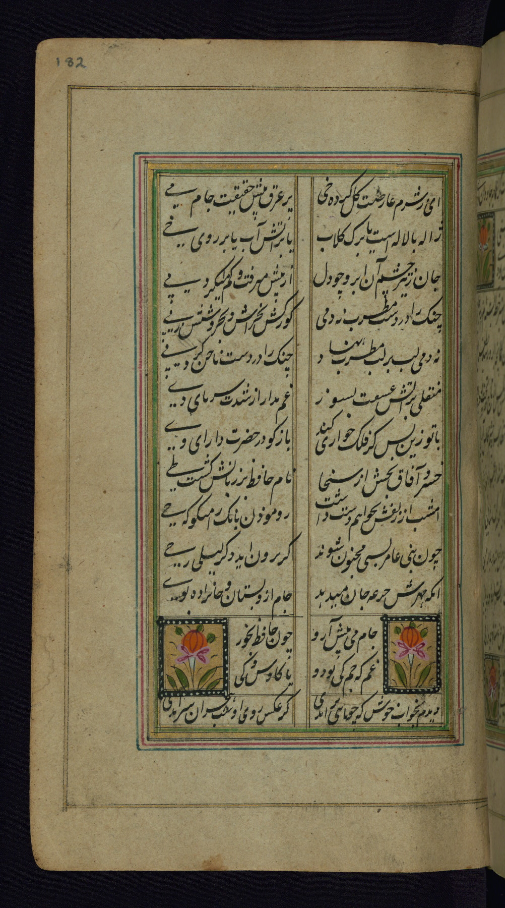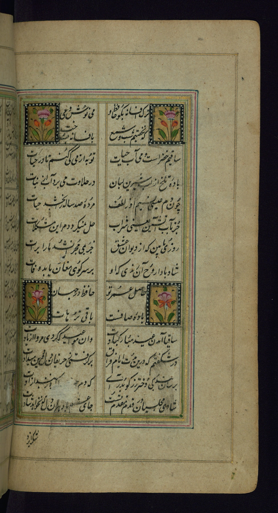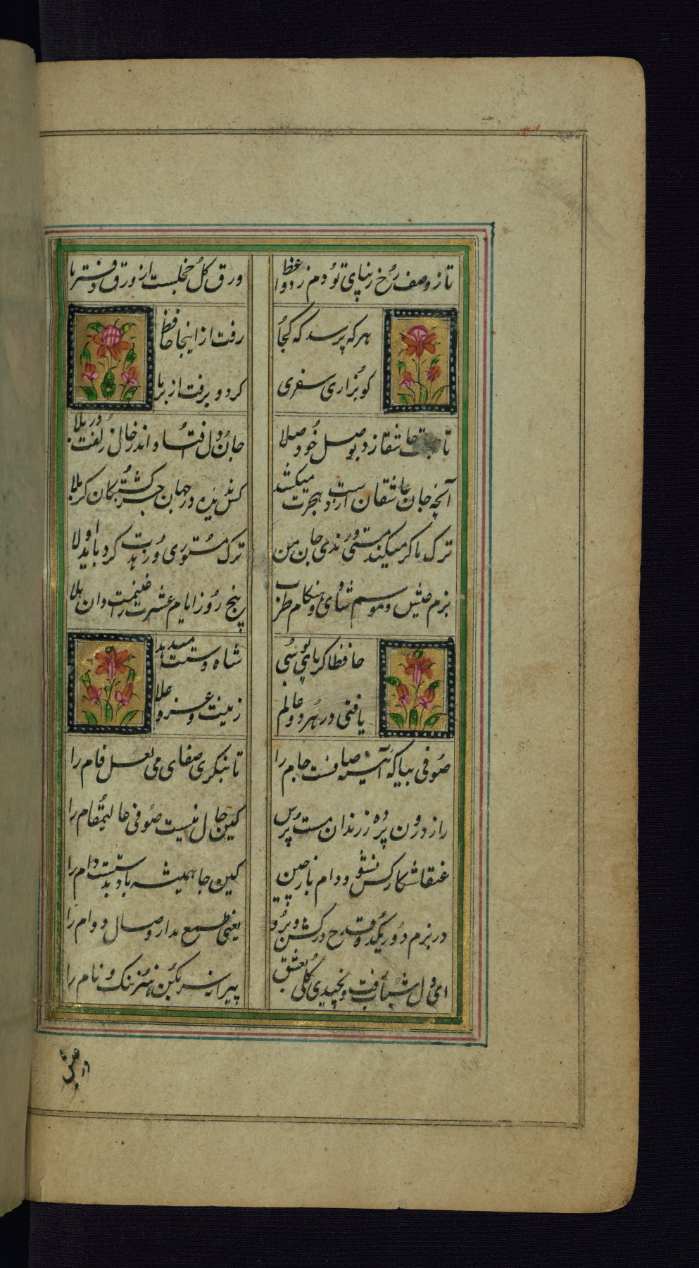 This is an illuminated and illustrated Collection of poems (dīvān) by Shams al-Dīn Muḥammad Ḥāfiz al-Shīrāzī (fl. eighth century AH / fourteenth CE), which was produced in India. According to the colophon, the manuscript was completed on the 19th Rajab 1202[?] AH / 1788[?] CE. It opens with a double-page illuminated incipit (fols. 1b-2a) with headpiece that introduces the preface (dībāchah) (fols. 1b-4b), followed by another double-page illuminated incipit with headpiece opening the main text of the Dīvān (fols. 5b-6a). The codex is decorated throughout with square and rectangular panels, as well as horizontal bands with floral decoration marking the end of odes, quatrains, or series of verses. There are forty-nine illustrations. The brown leather binding with medallion and pendants is contemporary with the manuscript.