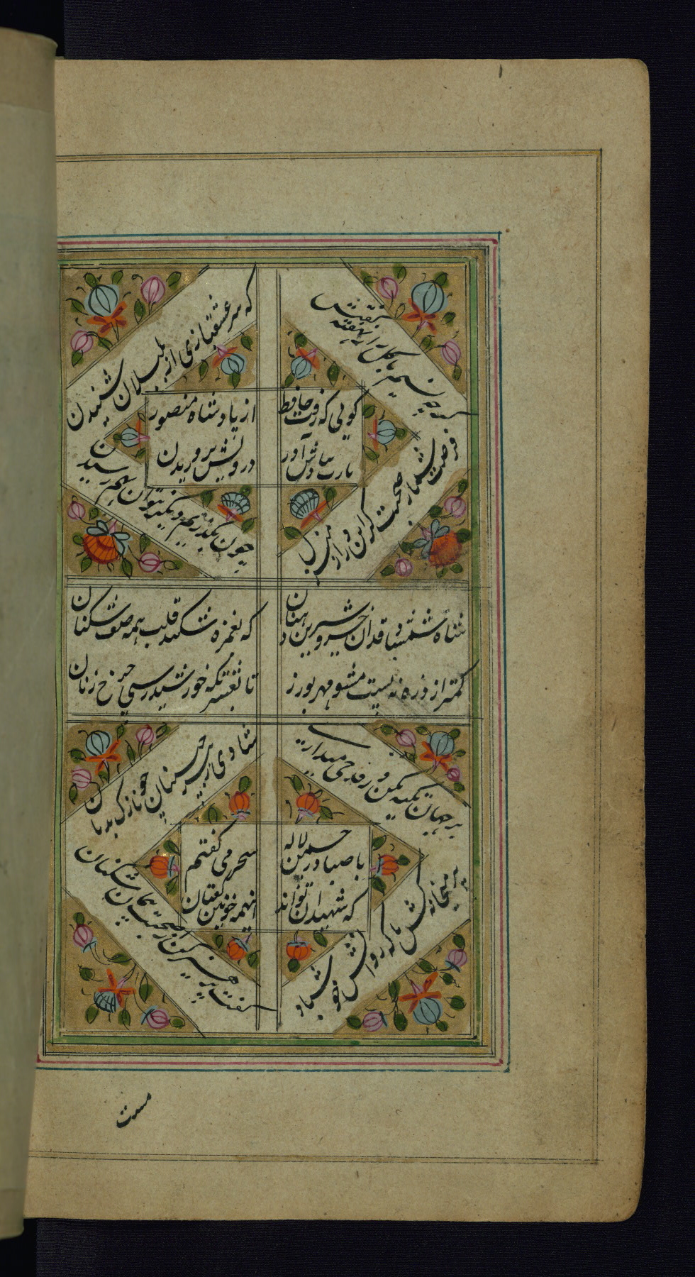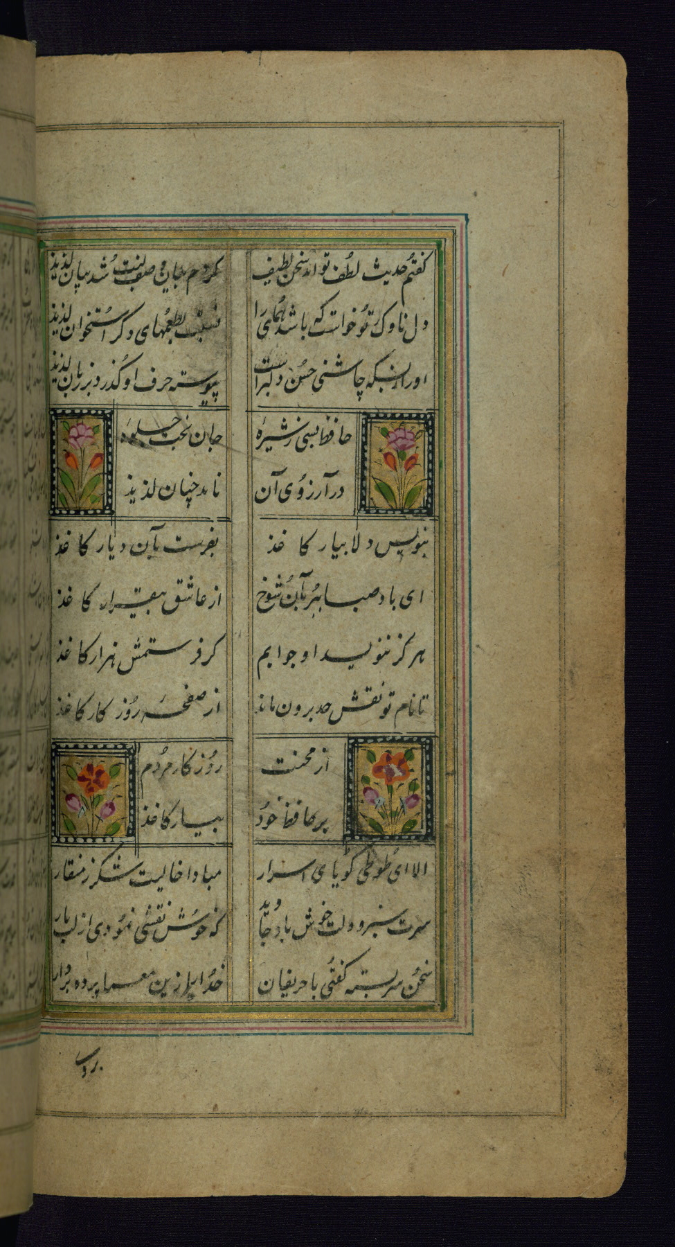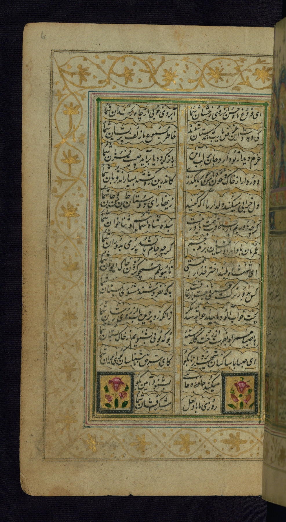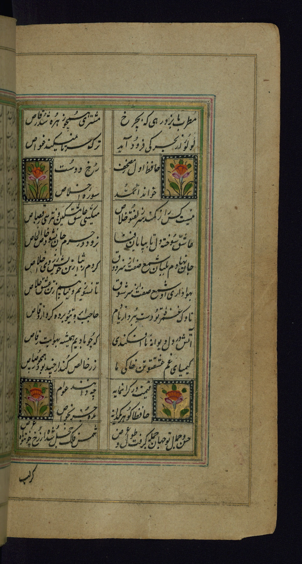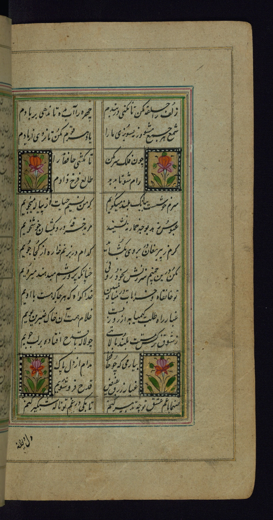 This is an illuminated and illustrated Collection of poems (dīvān) by Shams al-Dīn Muḥammad Ḥāfiz al-Shīrāzī (fl. eighth century AH / fourteenth CE), which was produced in India. According to the colophon, the manuscript was completed on the 19th Rajab 1202[?] AH / 1788[?] CE. It opens with a double-page illuminated incipit (fols. 1b-2a) with headpiece that introduces the preface (dībāchah) (fols. 1b-4b), followed by another double-page illuminated incipit with headpiece opening the main text of the Dīvān (fols. 5b-6a). The codex is decorated throughout with square and rectangular panels, as well as horizontal bands with floral decoration marking the end of odes, quatrains, or series of verses. There are forty-nine illustrations. The brown leather binding with medallion and pendants is contemporary with the manuscript.