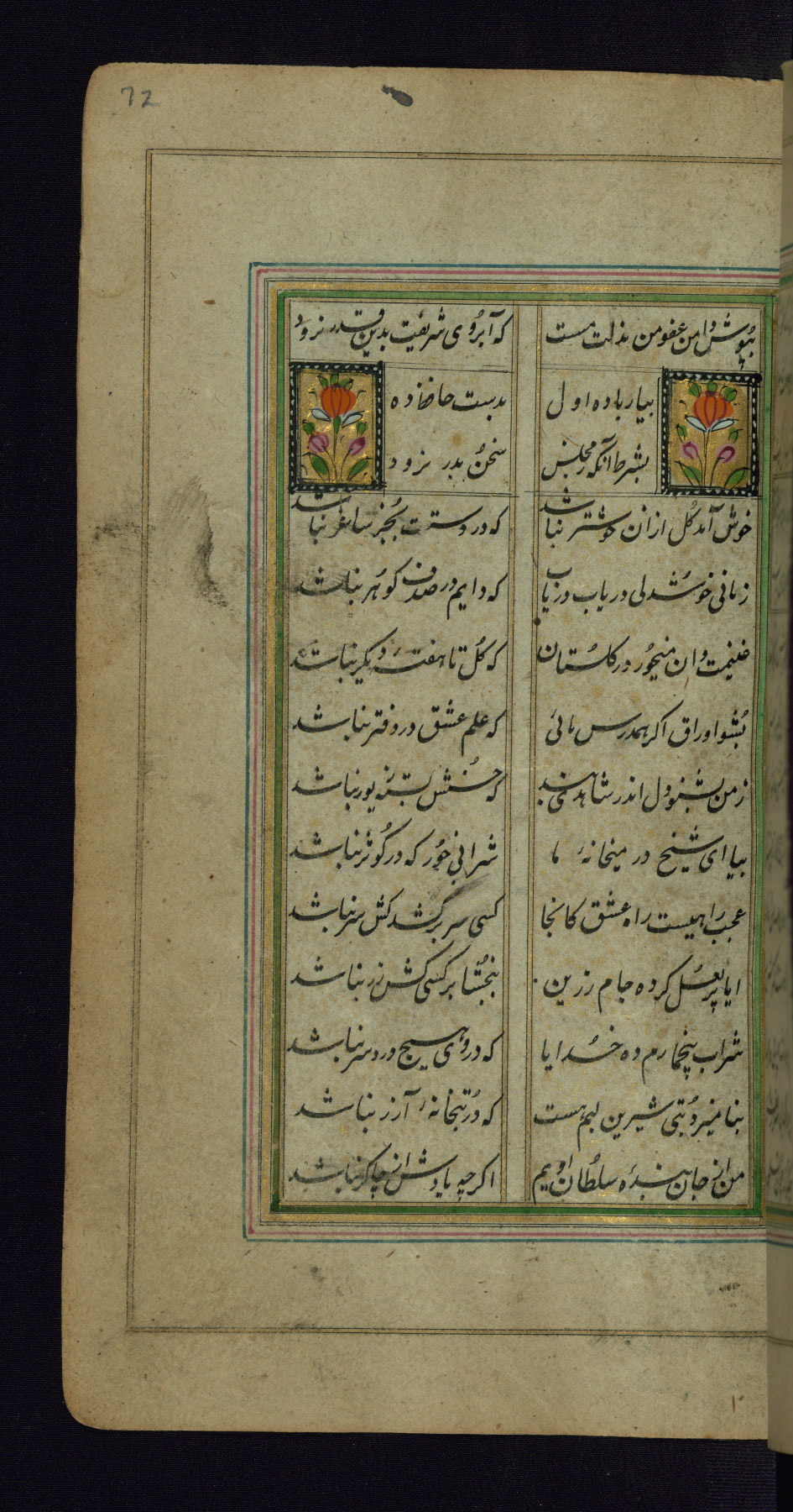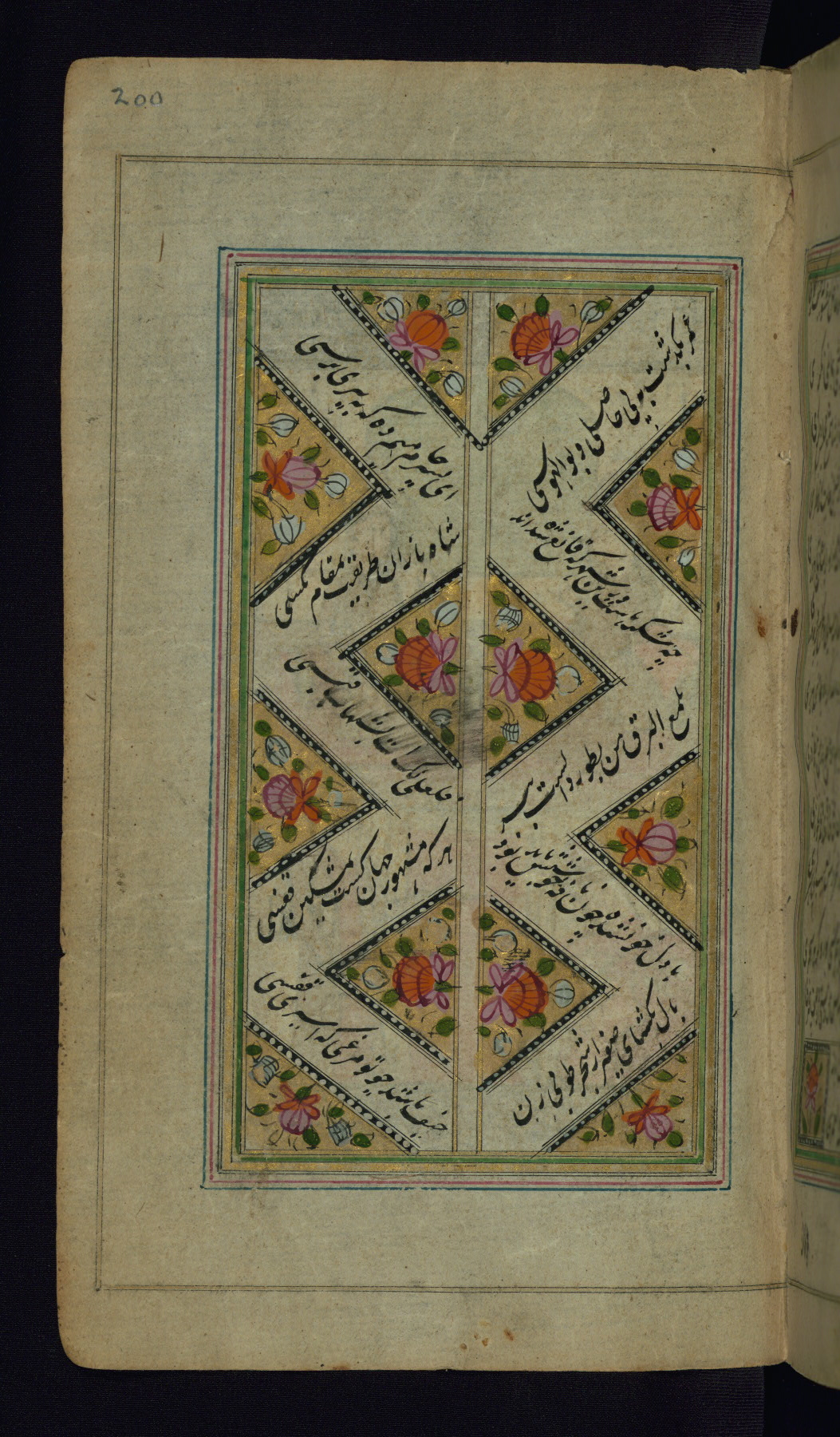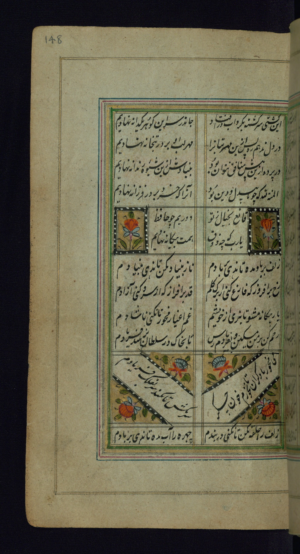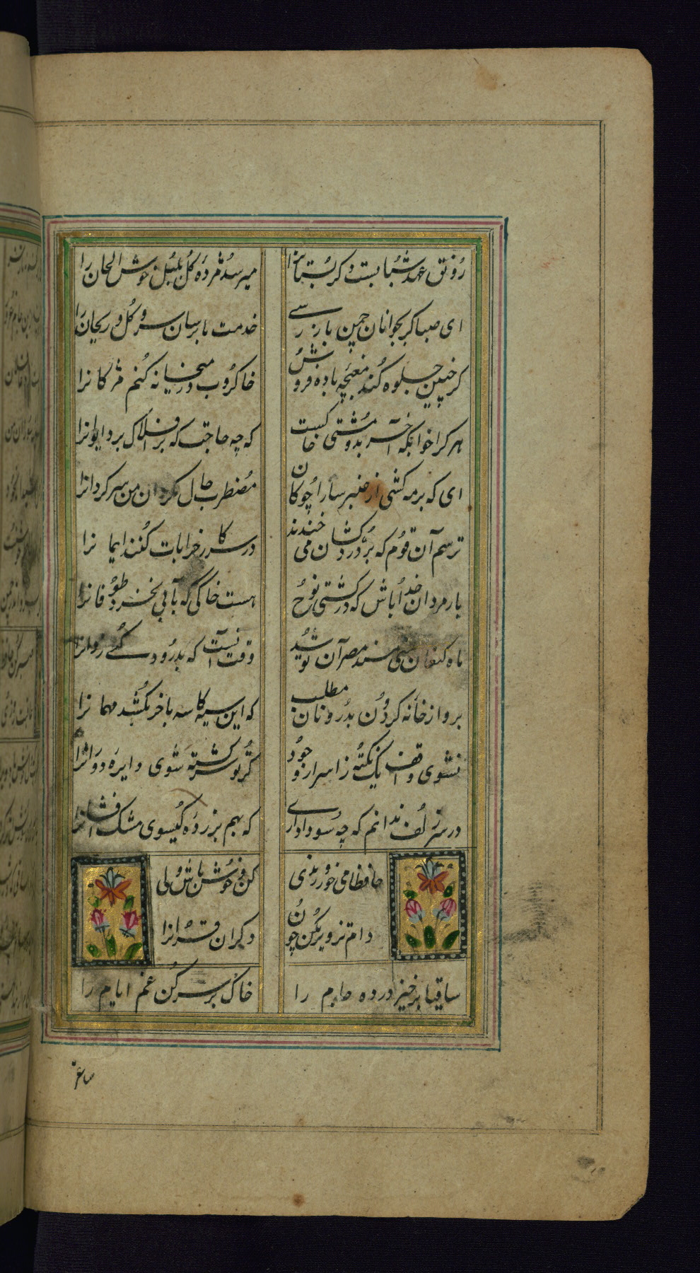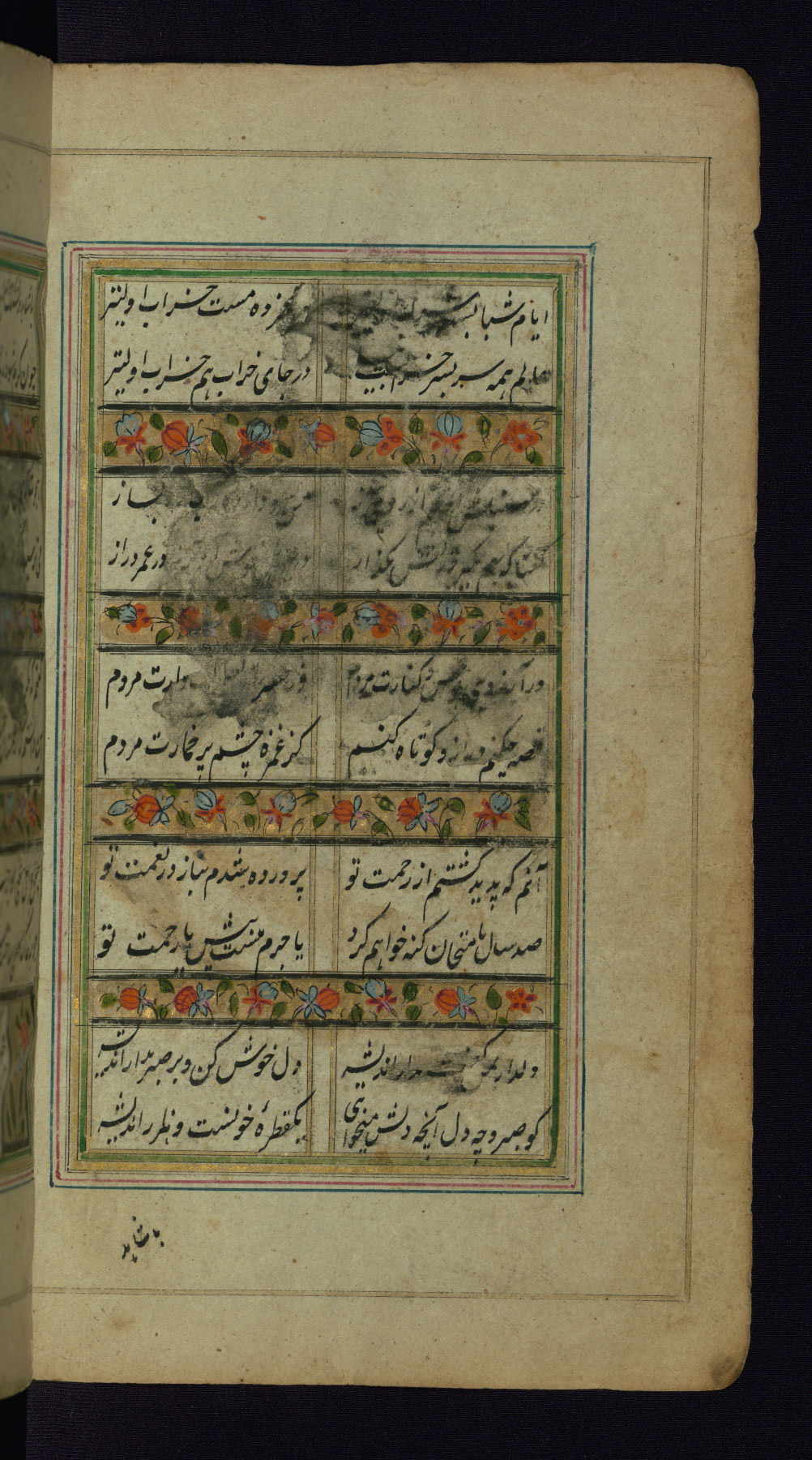 This is an illuminated and illustrated Collection of poems (dīvān) by Shams al-Dīn Muḥammad Ḥāfiz al-Shīrāzī (fl. eighth century AH / fourteenth CE), which was produced in India. According to the colophon, the manuscript was completed on the 19th Rajab 1202[?] AH / 1788[?] CE. It opens with a double-page illuminated incipit (fols. 1b-2a) with headpiece that introduces the preface (dībāchah) (fols. 1b-4b), followed by another double-page illuminated incipit with headpiece opening the main text of the Dīvān (fols. 5b-6a). The codex is decorated throughout with square and rectangular panels, as well as horizontal bands with floral decoration marking the end of odes, quatrains, or series of verses. There are forty-nine illustrations. The brown leather binding with medallion and pendants is contemporary with the manuscript.