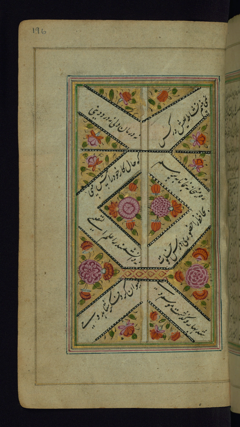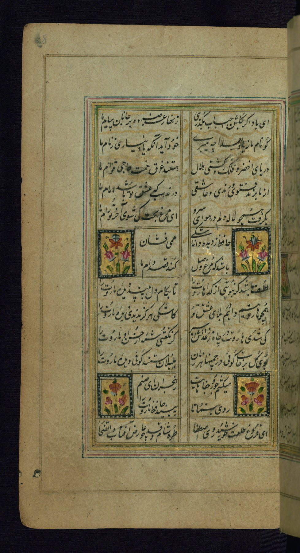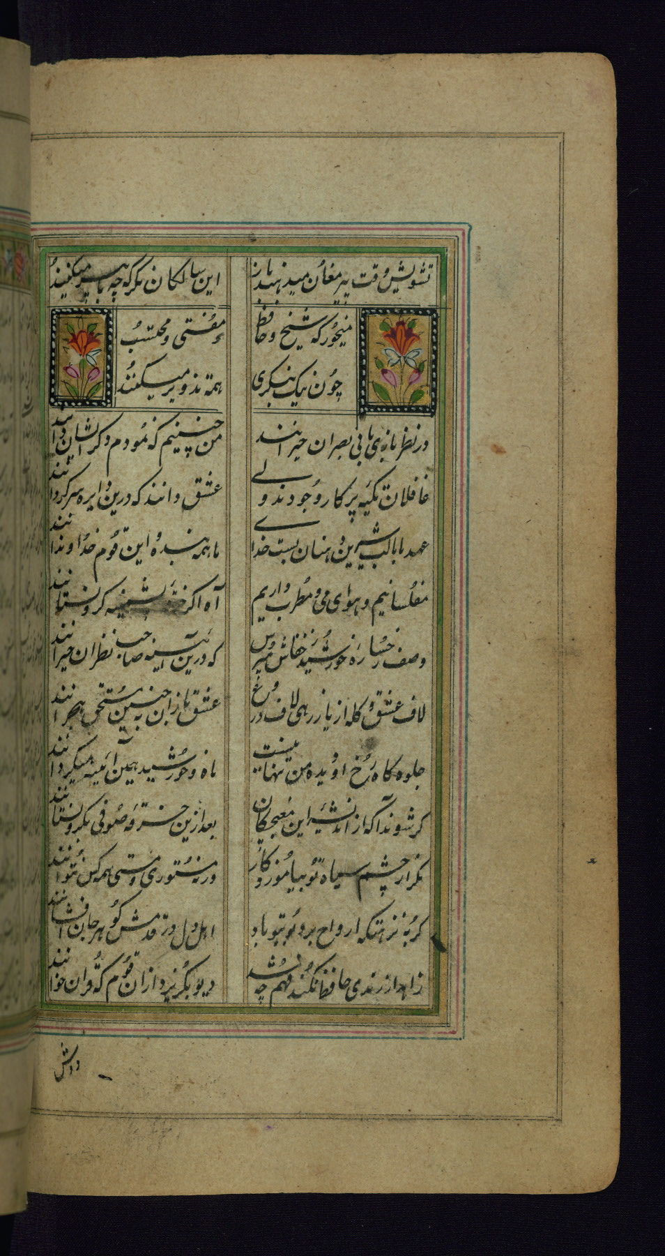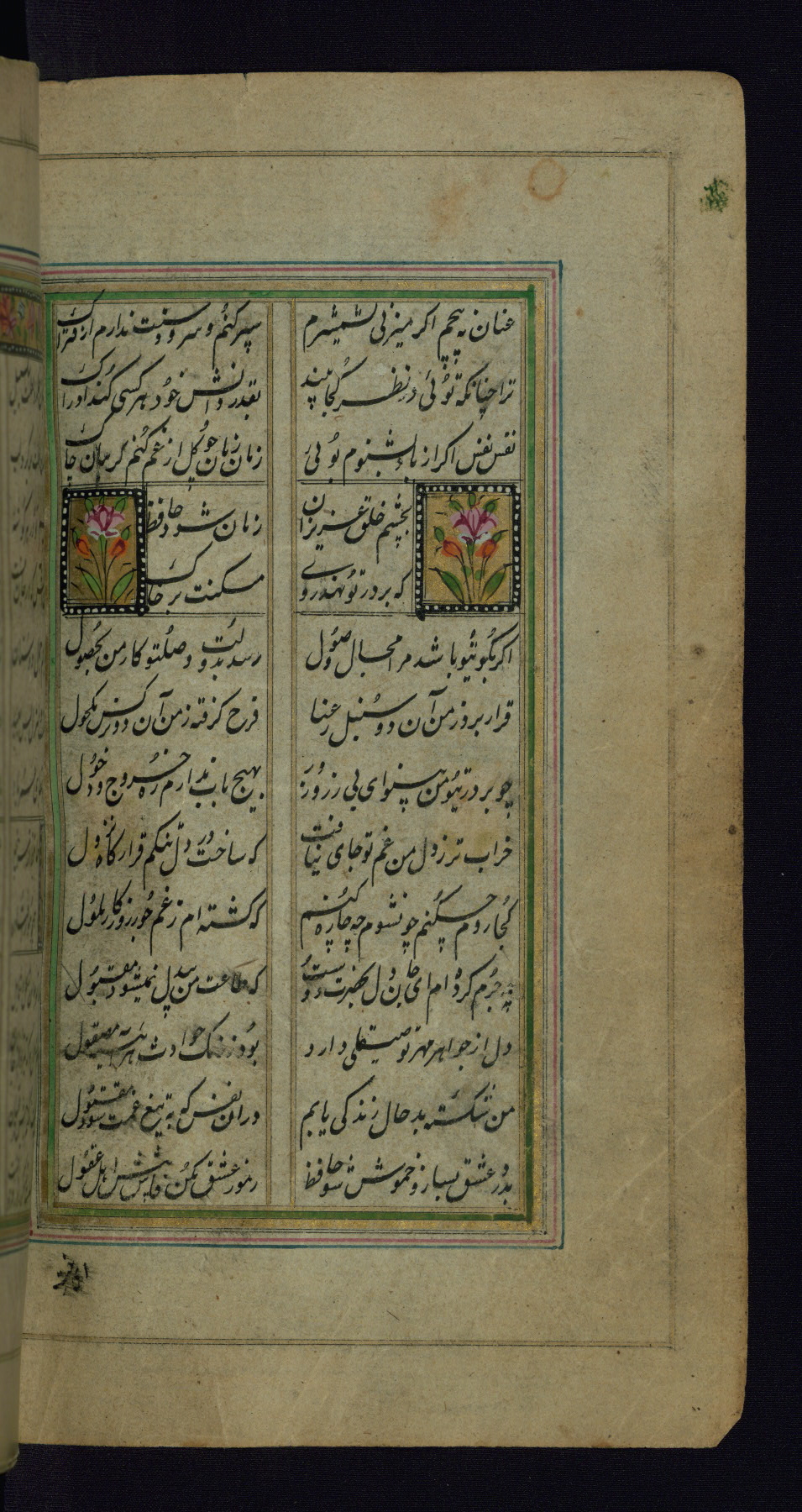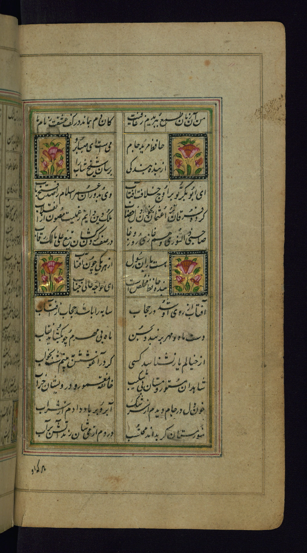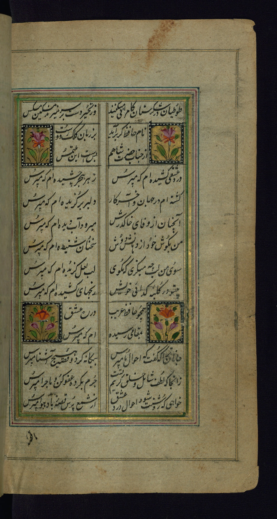This is an illuminated and illustrated Collection of poems (dīvān) by Shams al-Dīn Muḥammad Ḥāfiz al-Shīrāzī (fl. eighth century AH / fourteenth CE), which was produced in India. According to the colophon, the manuscript was completed on the 19th Rajab 1202[?] AH / 1788[?] CE. It opens with a double-page illuminated incipit (fols. 1b-2a) with headpiece that introduces the preface (dībāchah) (fols. 1b-4b), followed by another double-page illuminated incipit with headpiece opening the main text of the Dīvān (fols. 5b-6a). The codex is decorated throughout with square and rectangular panels, as well as horizontal bands with floral decoration marking the end of odes, quatrains, or series of verses. There are forty-nine illustrations. The brown leather binding with medallion and pendants is contemporary with the manuscript.