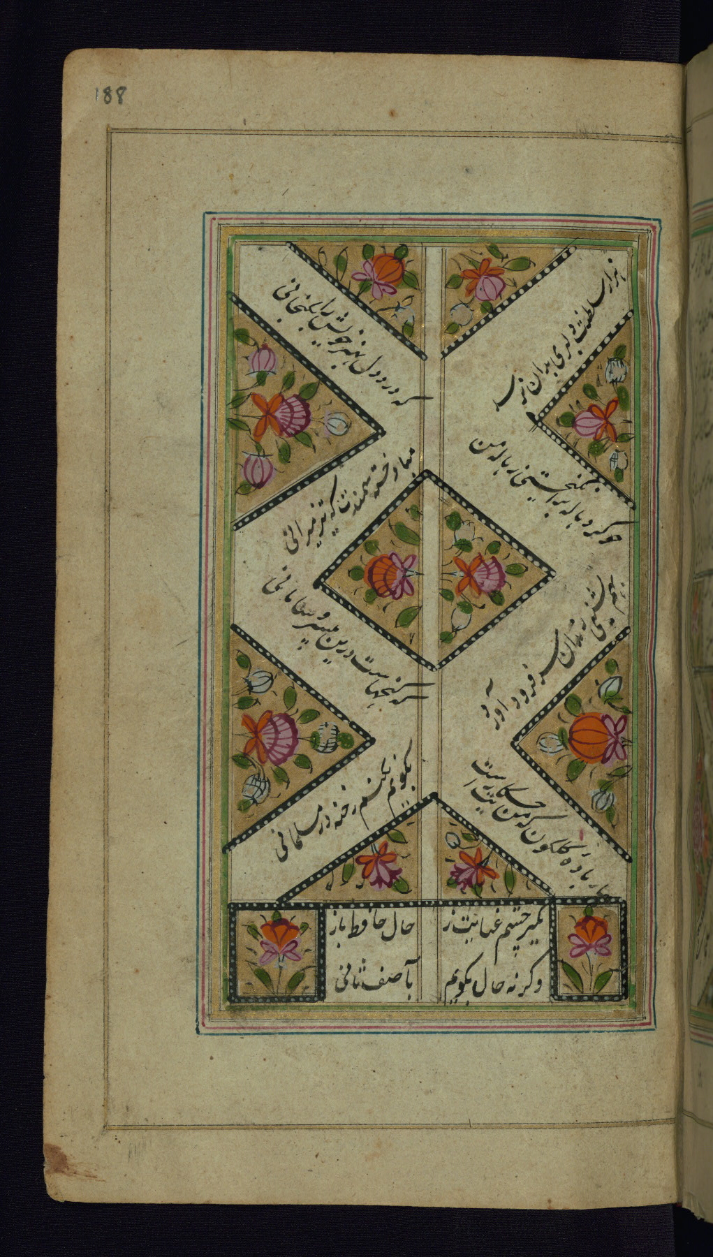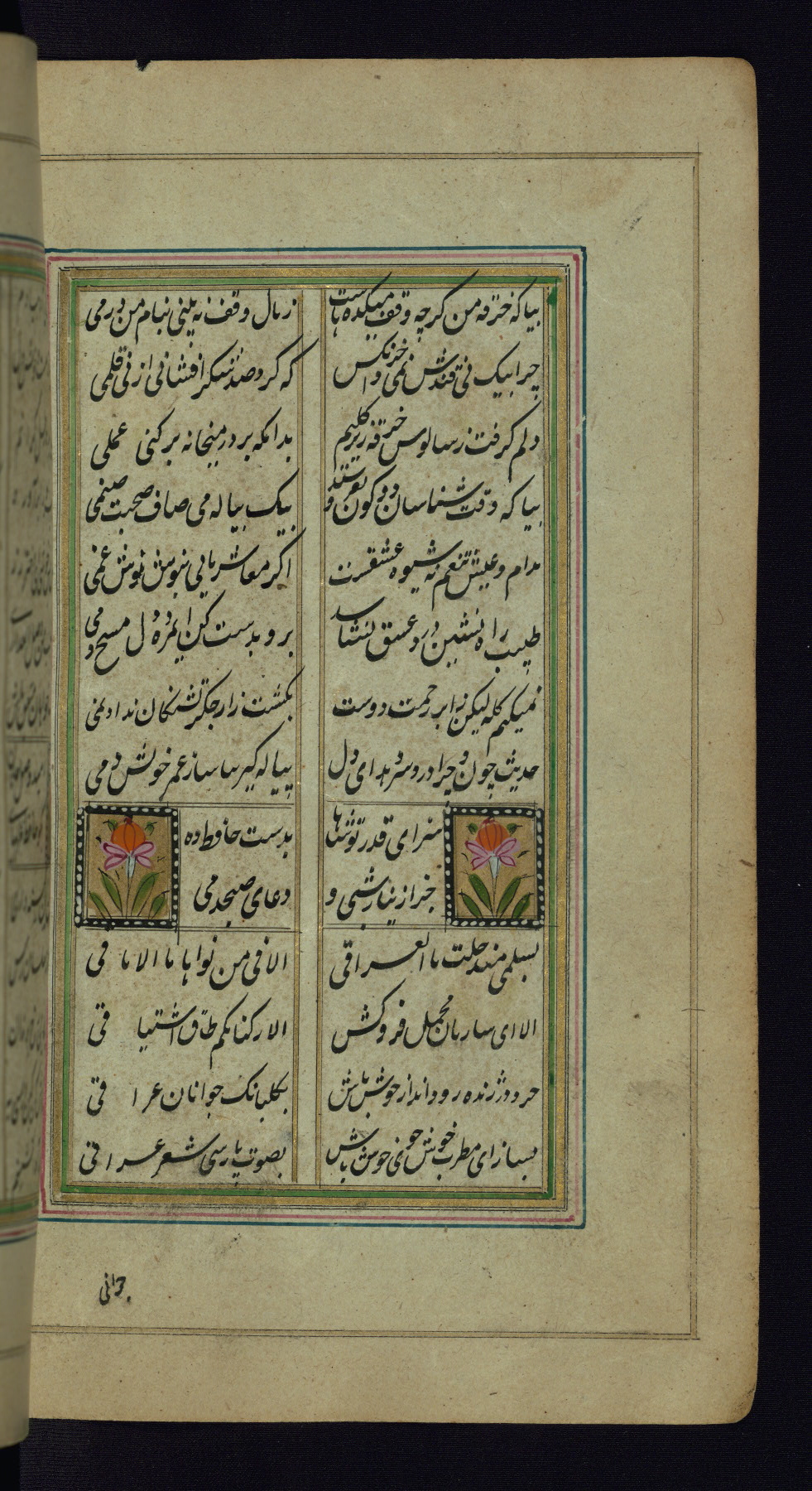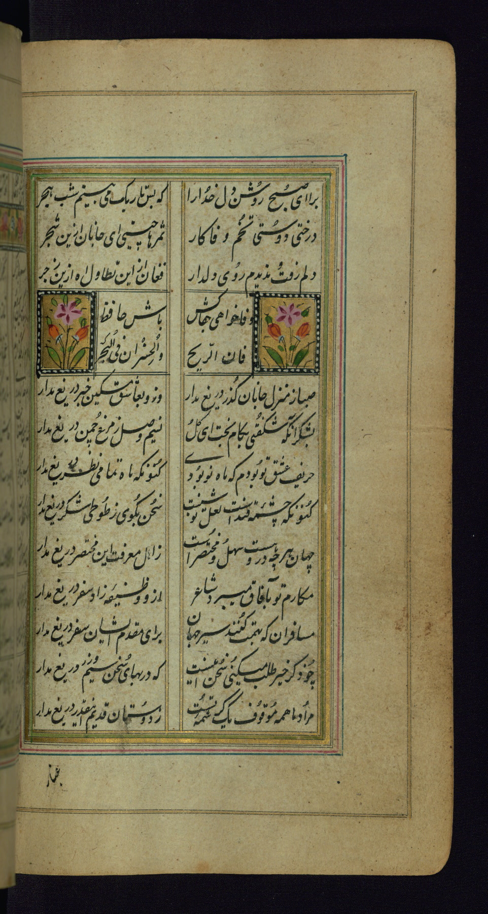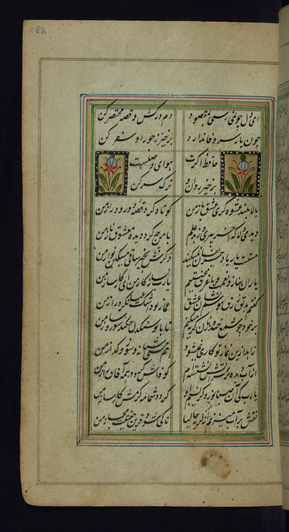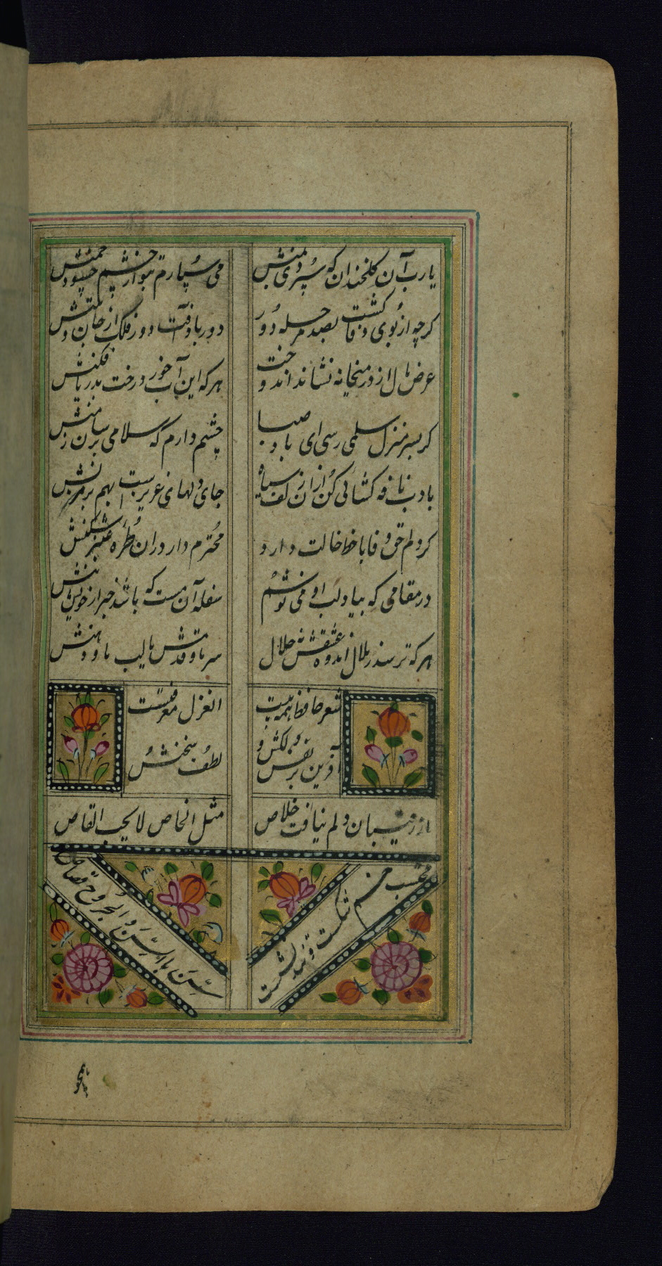 This is an illuminated and illustrated Collection of poems (dīvān) by Shams al-Dīn Muḥammad Ḥāfiz al-Shīrāzī (fl. eighth century AH / fourteenth CE), which was produced in India. According to the colophon, the manuscript was completed on the 19th Rajab 1202[?] AH / 1788[?] CE. It opens with a double-page illuminated incipit (fols. 1b-2a) with headpiece that introduces the preface (dībāchah) (fols. 1b-4b), followed by another double-page illuminated incipit with headpiece opening the main text of the Dīvān (fols. 5b-6a). The codex is decorated throughout with square and rectangular panels, as well as horizontal bands with floral decoration marking the end of odes, quatrains, or series of verses. There are forty-nine illustrations. The brown leather binding with medallion and pendants is contemporary with the manuscript.