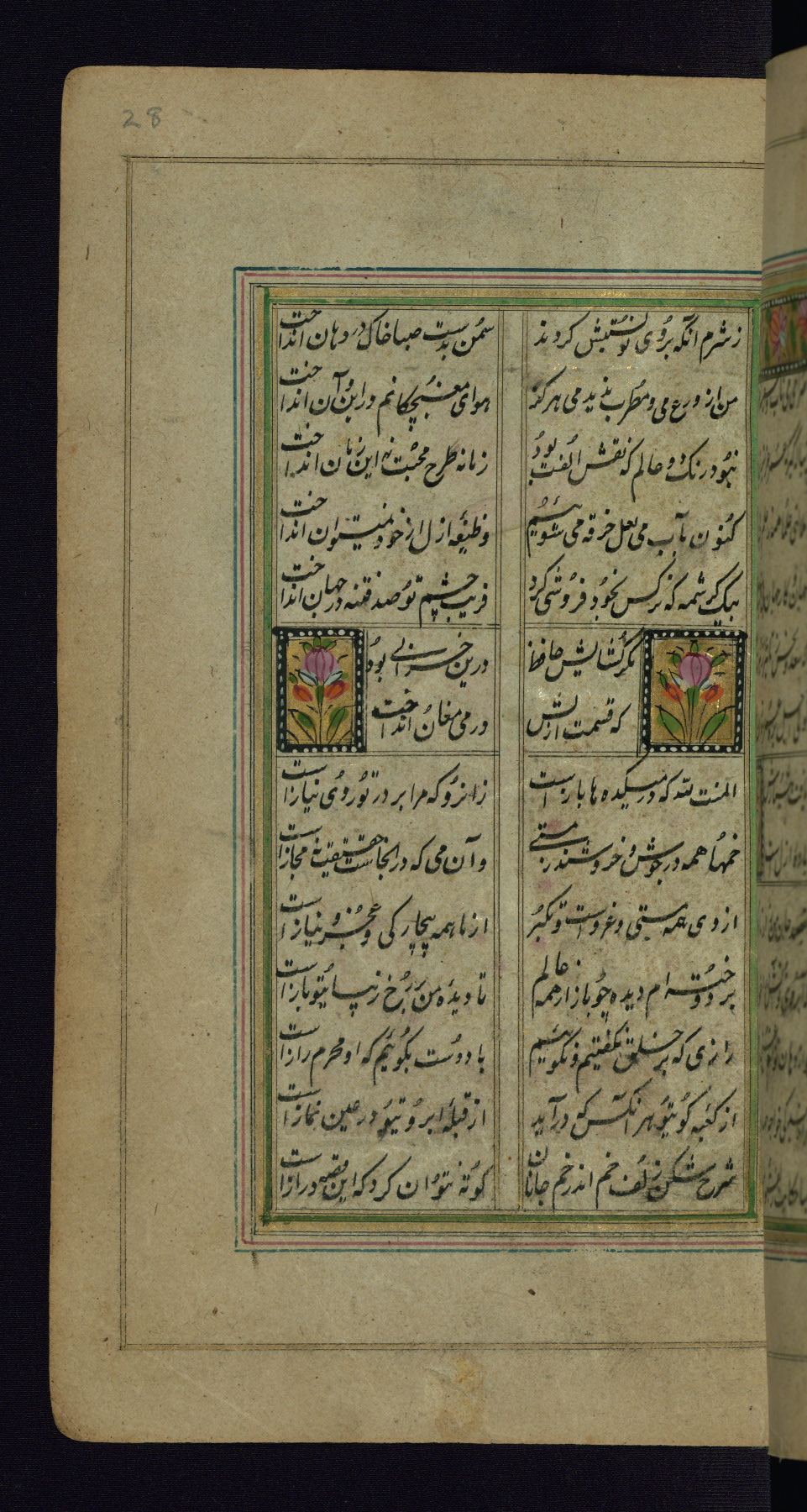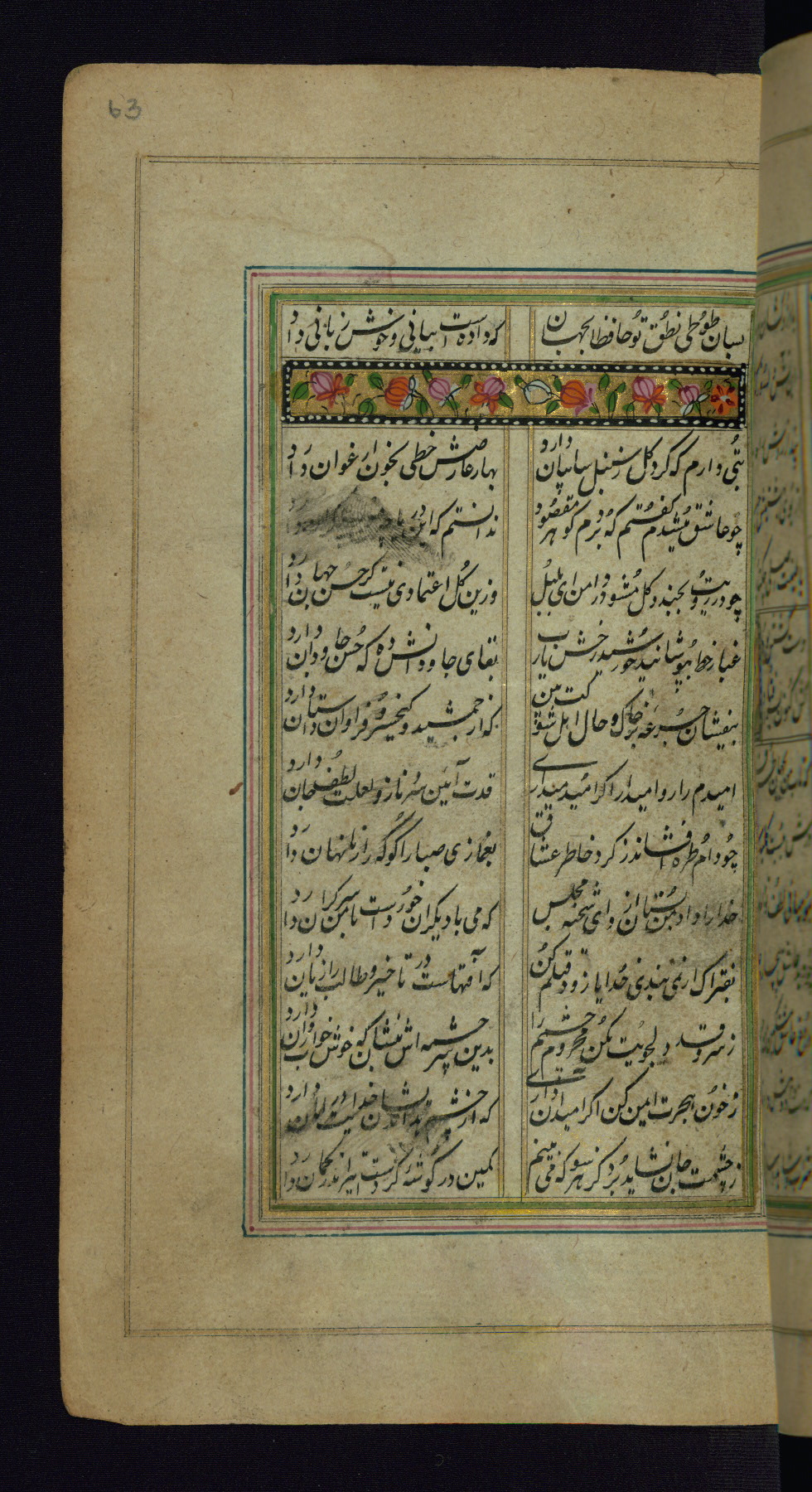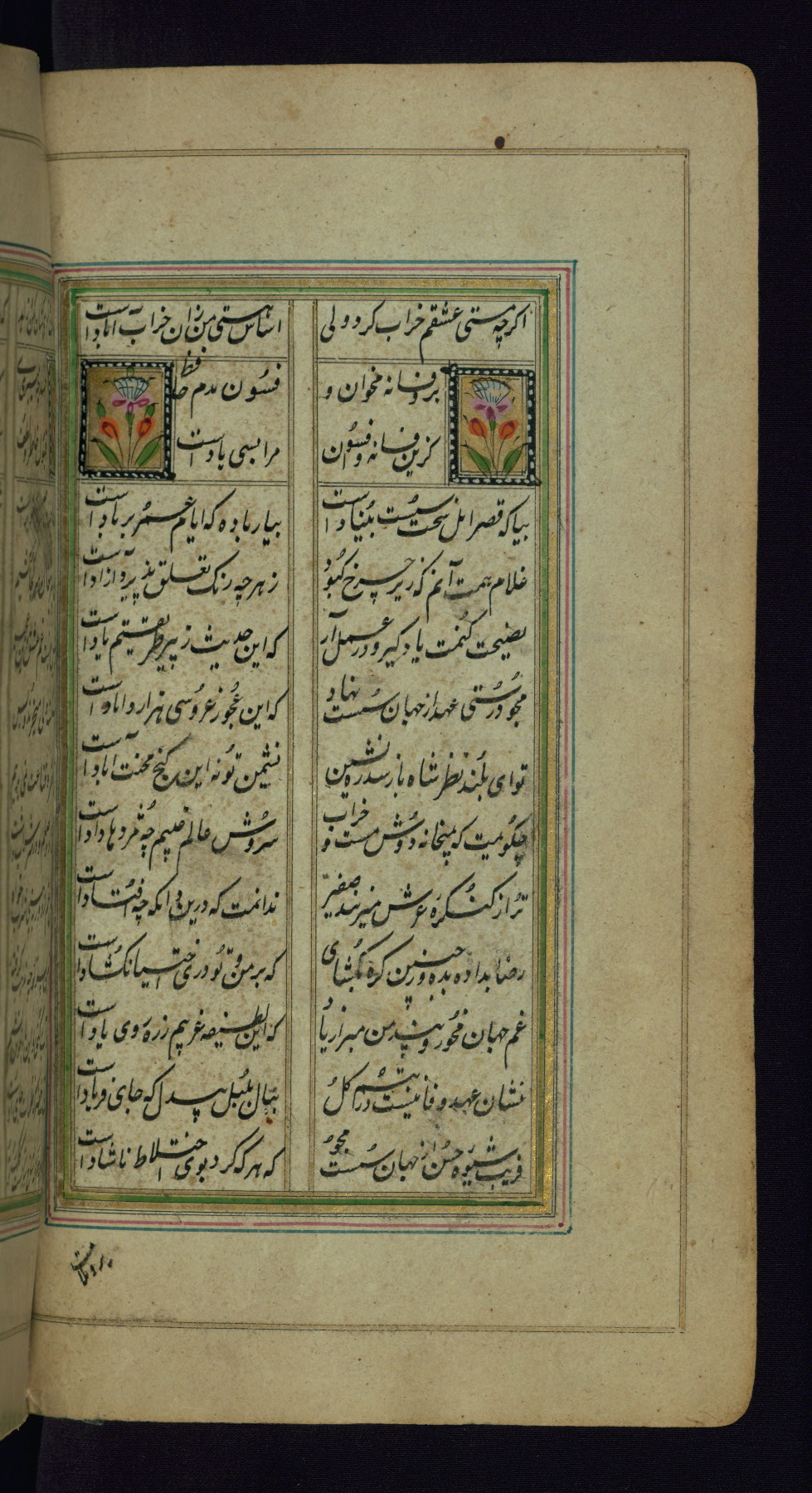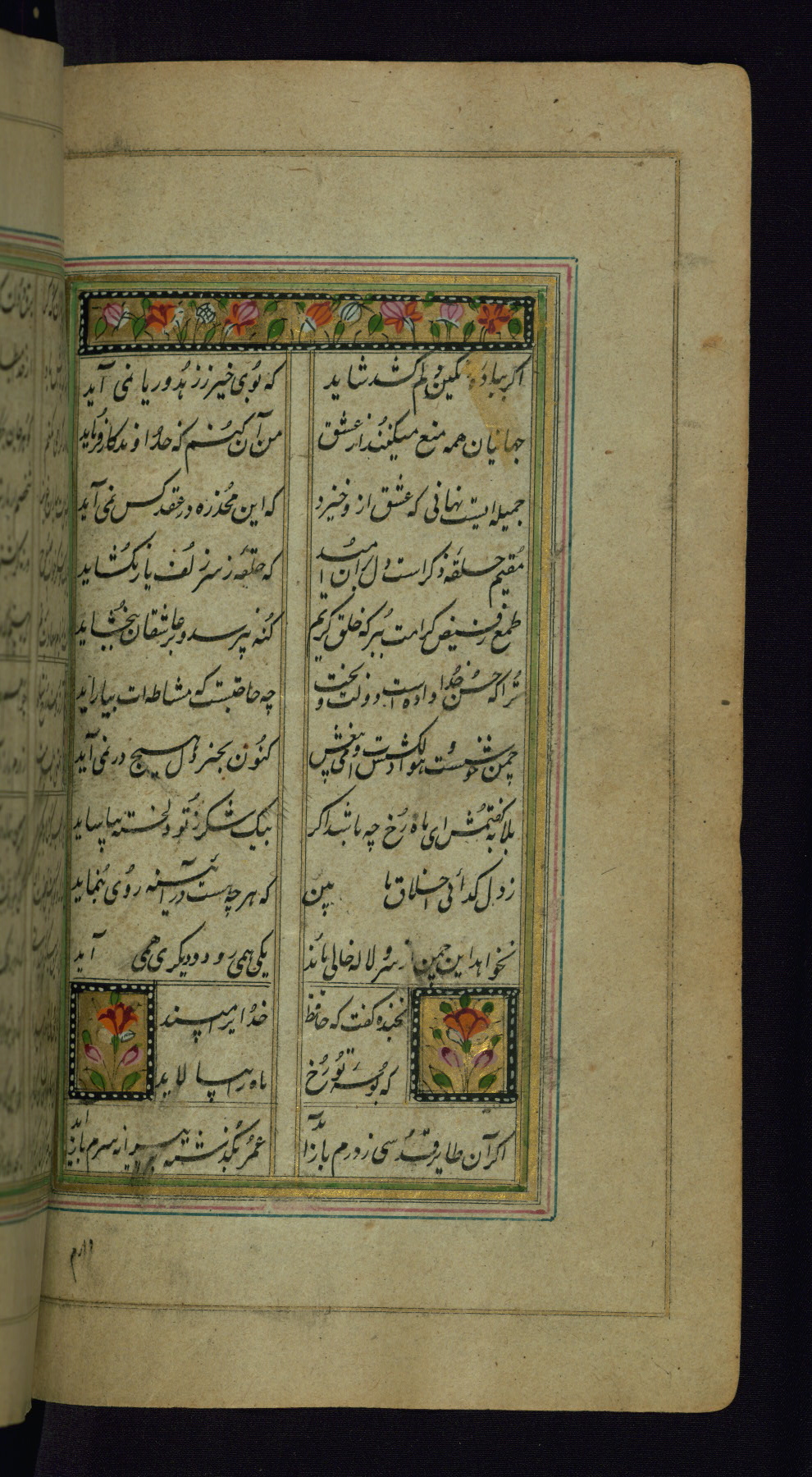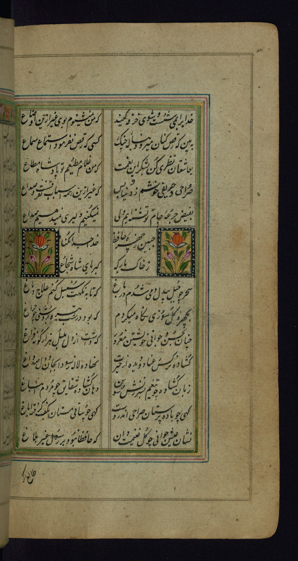 This is an illuminated and illustrated Collection of poems (dīvān) by Shams al-Dīn Muḥammad Ḥāfiz al-Shīrāzī (fl. eighth century AH / fourteenth CE), which was produced in India. According to the colophon, the manuscript was completed on the 19th Rajab 1202[?] AH / 1788[?] CE. It opens with a double-page illuminated incipit (fols. 1b-2a) with headpiece that introduces the preface (dībāchah) (fols. 1b-4b), followed by another double-page illuminated incipit with headpiece opening the main text of the Dīvān (fols. 5b-6a). The codex is decorated throughout with square and rectangular panels, as well as horizontal bands with floral decoration marking the end of odes, quatrains, or series of verses. There are forty-nine illustrations. The brown leather binding with medallion and pendants is contemporary with the manuscript.