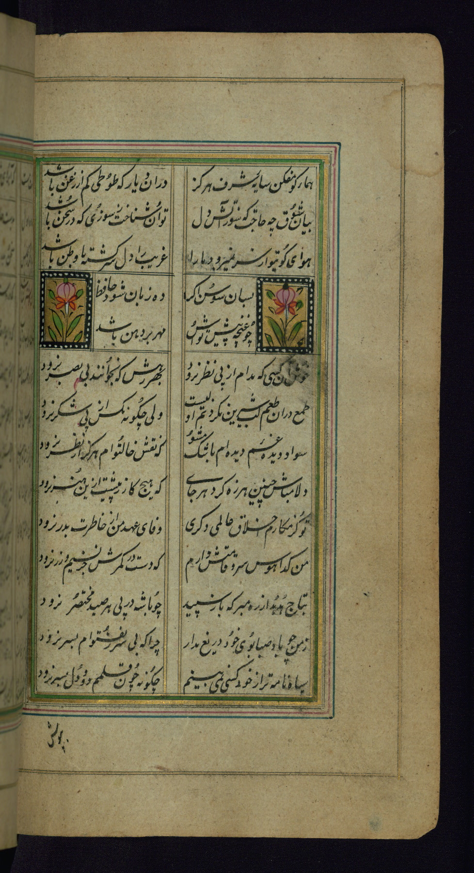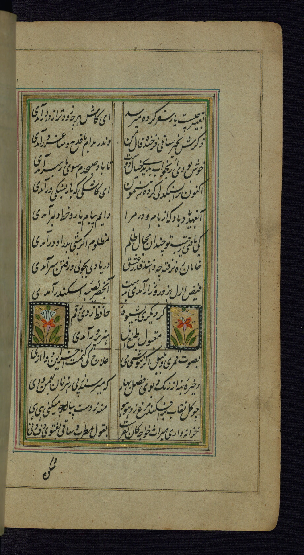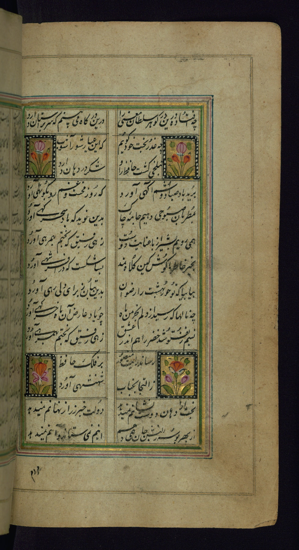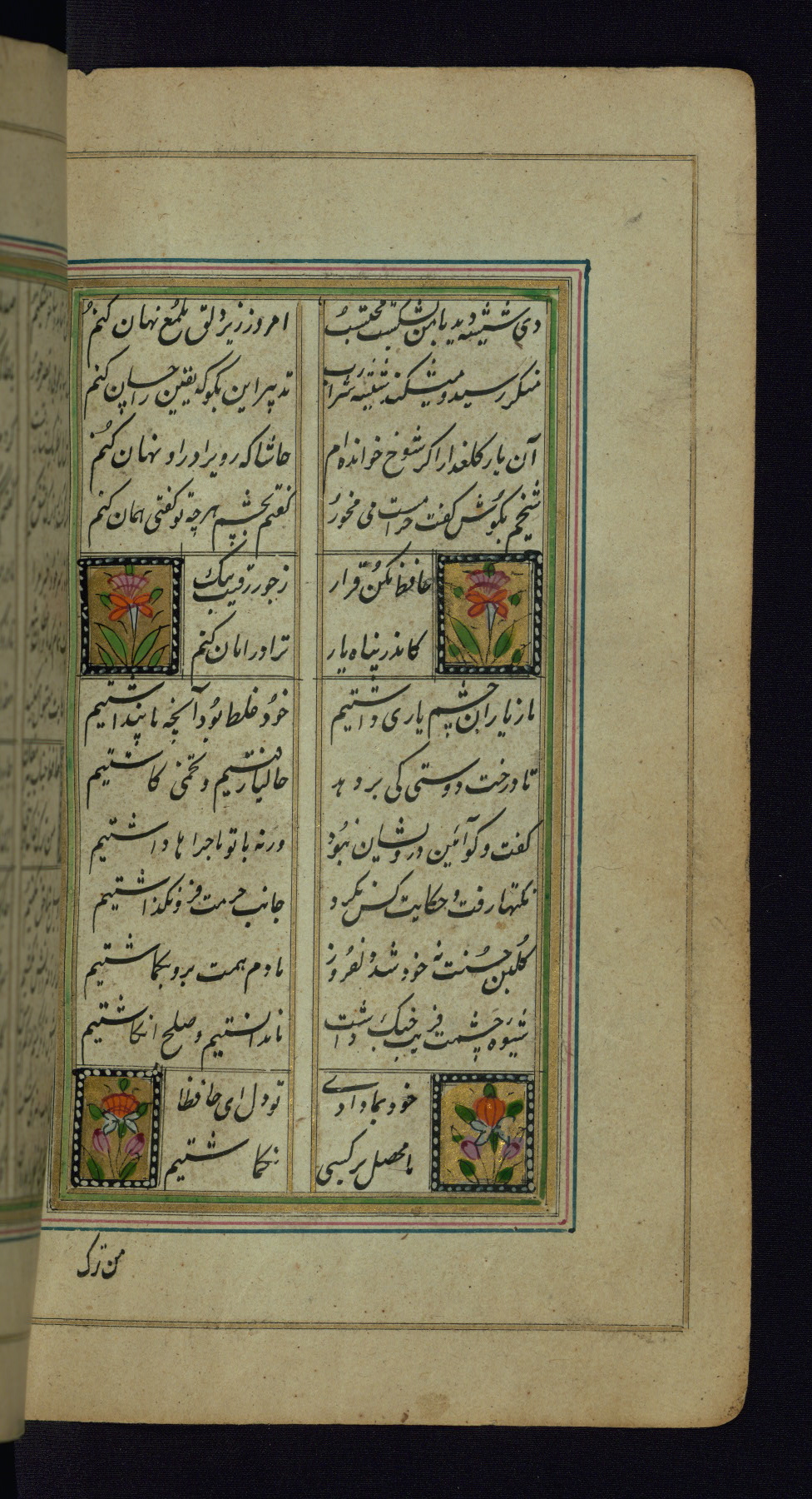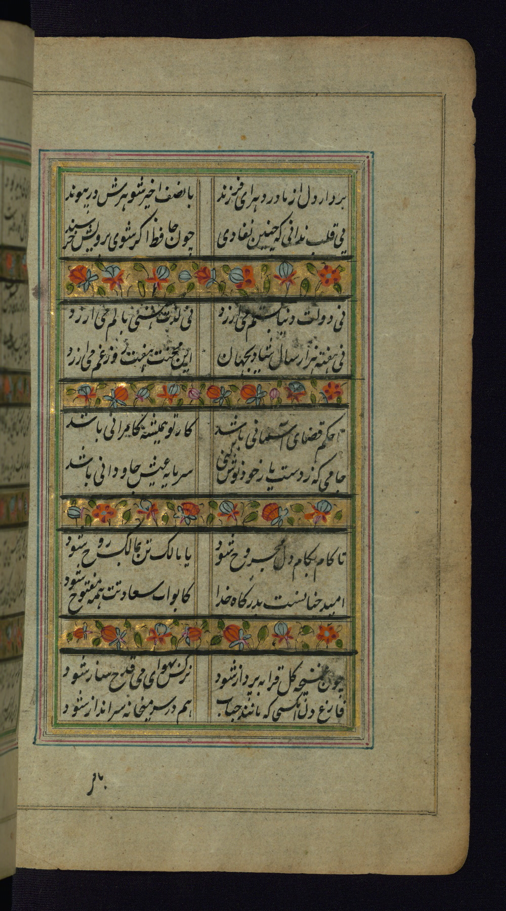 This is an illuminated and illustrated Collection of poems (dīvān) by Shams al-Dīn Muḥammad Ḥāfiz al-Shīrāzī (fl. eighth century AH / fourteenth CE), which was produced in India. According to the colophon, the manuscript was completed on the 19th Rajab 1202[?] AH / 1788[?] CE. It opens with a double-page illuminated incipit (fols. 1b-2a) with headpiece that introduces the preface (dībāchah) (fols. 1b-4b), followed by another double-page illuminated incipit with headpiece opening the main text of the Dīvān (fols. 5b-6a). The codex is decorated throughout with square and rectangular panels, as well as horizontal bands with floral decoration marking the end of odes, quatrains, or series of verses. There are forty-nine illustrations. The brown leather binding with medallion and pendants is contemporary with the manuscript.