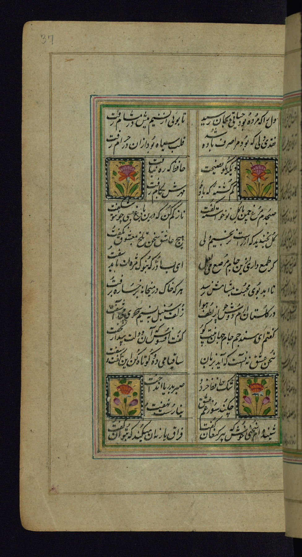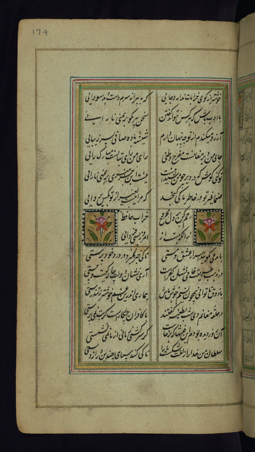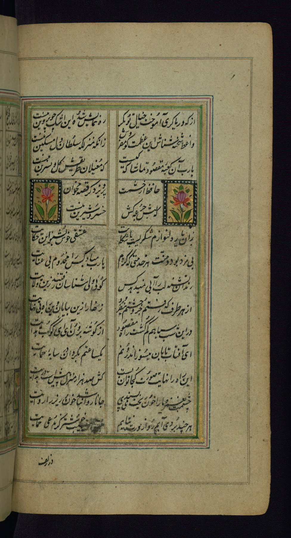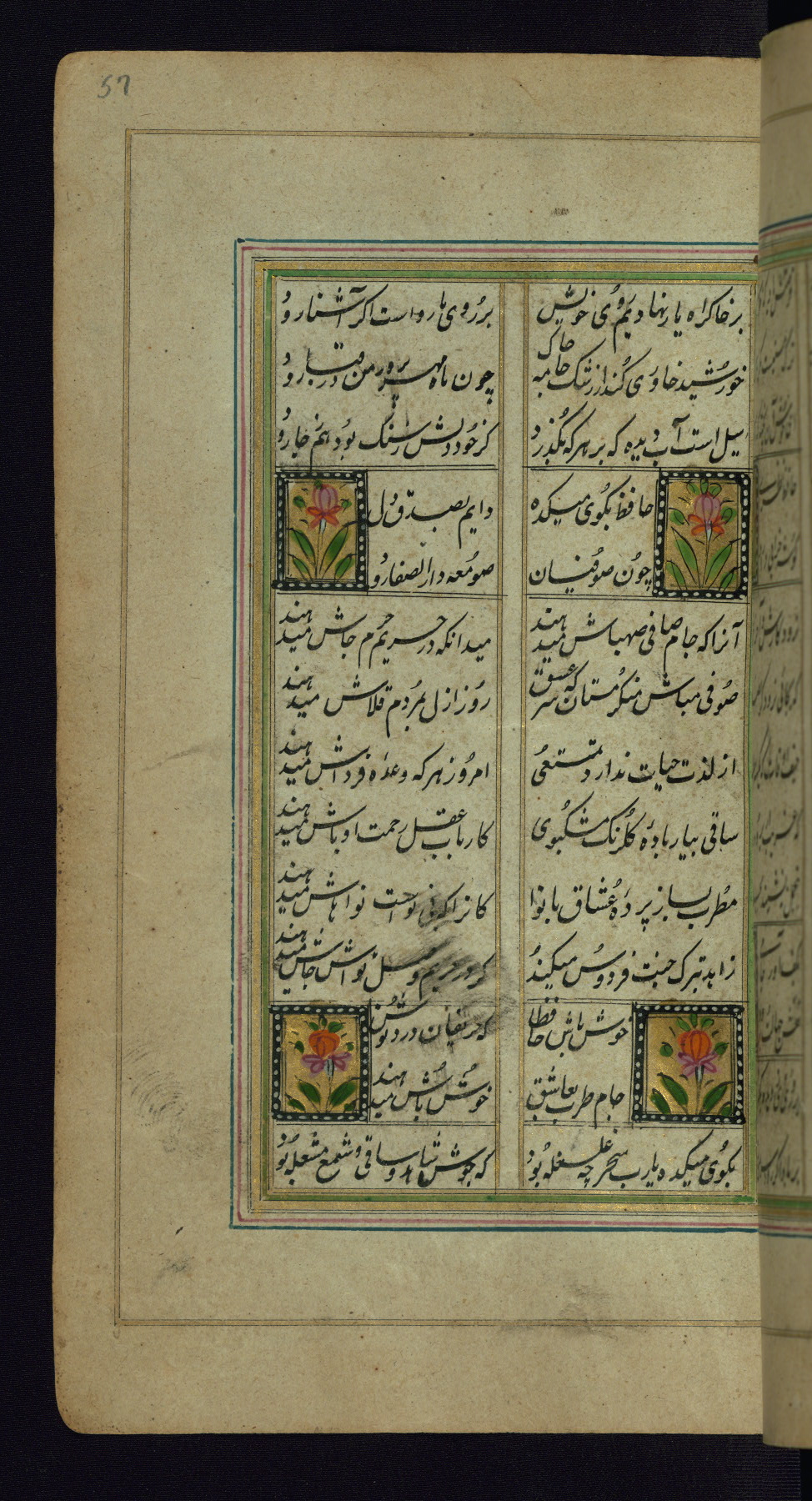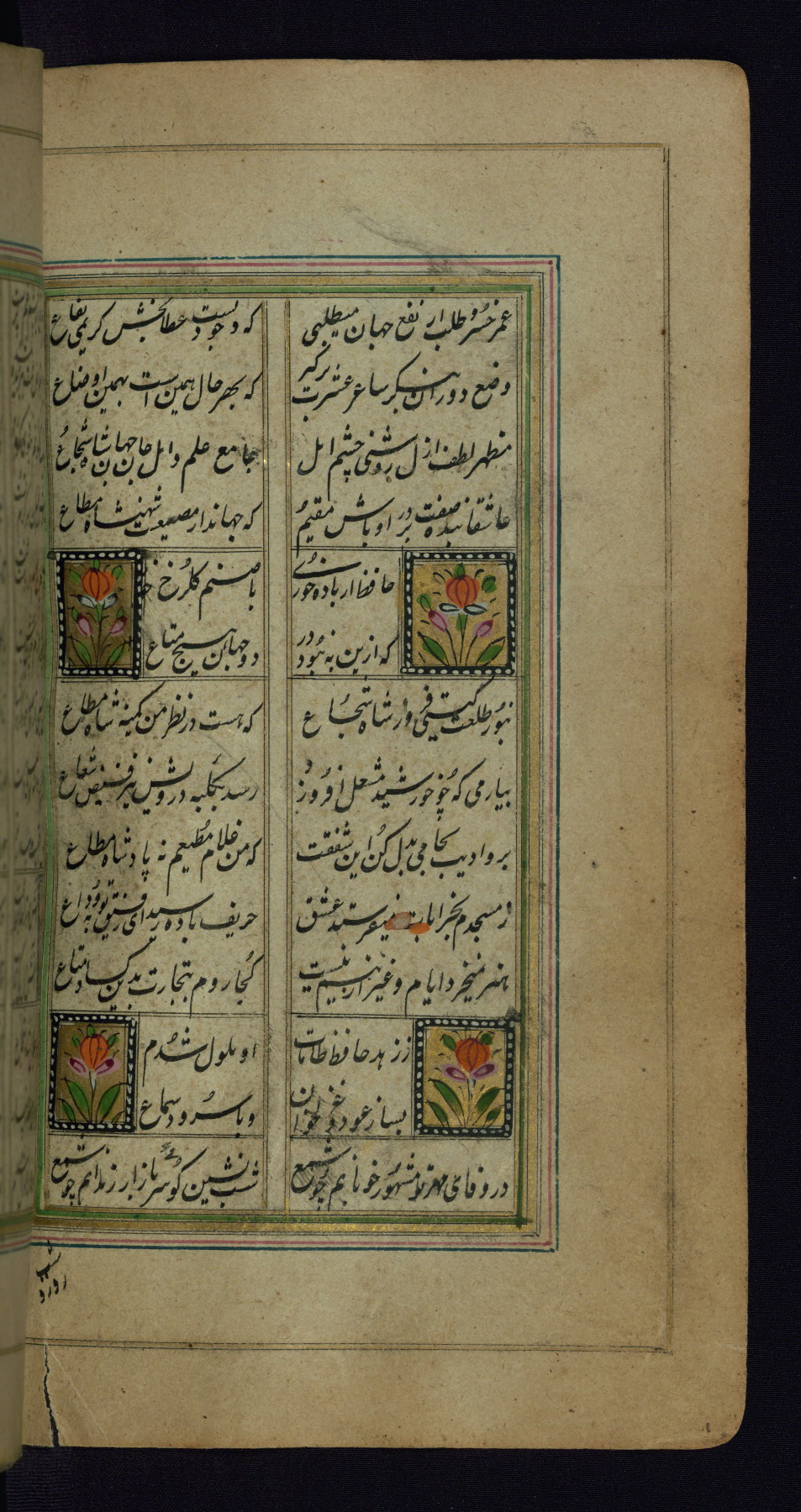 This is an illuminated and illustrated Collection of poems (dīvān) by Shams al-Dīn Muḥammad Ḥāfiz al-Shīrāzī (fl. eighth century AH / fourteenth CE), which was produced in India. According to the colophon, the manuscript was completed on the 19th Rajab 1202[?] AH / 1788[?] CE. It opens with a double-page illuminated incipit (fols. 1b-2a) with headpiece that introduces the preface (dībāchah) (fols. 1b-4b), followed by another double-page illuminated incipit with headpiece opening the main text of the Dīvān (fols. 5b-6a). The codex is decorated throughout with square and rectangular panels, as well as horizontal bands with floral decoration marking the end of odes, quatrains, or series of verses. There are forty-nine illustrations. The brown leather binding with medallion and pendants is contemporary with the manuscript.