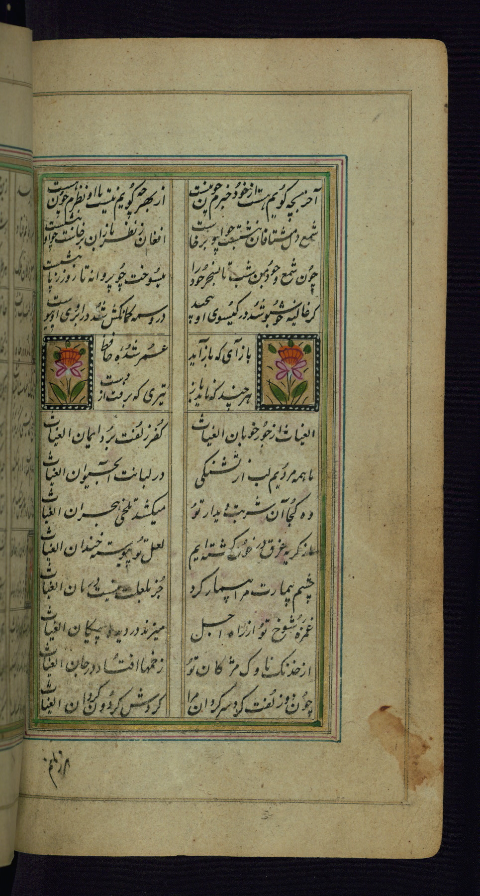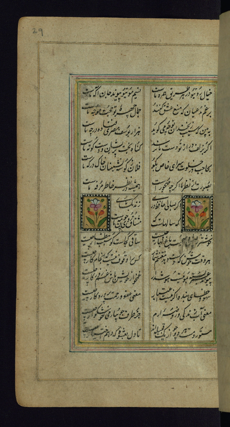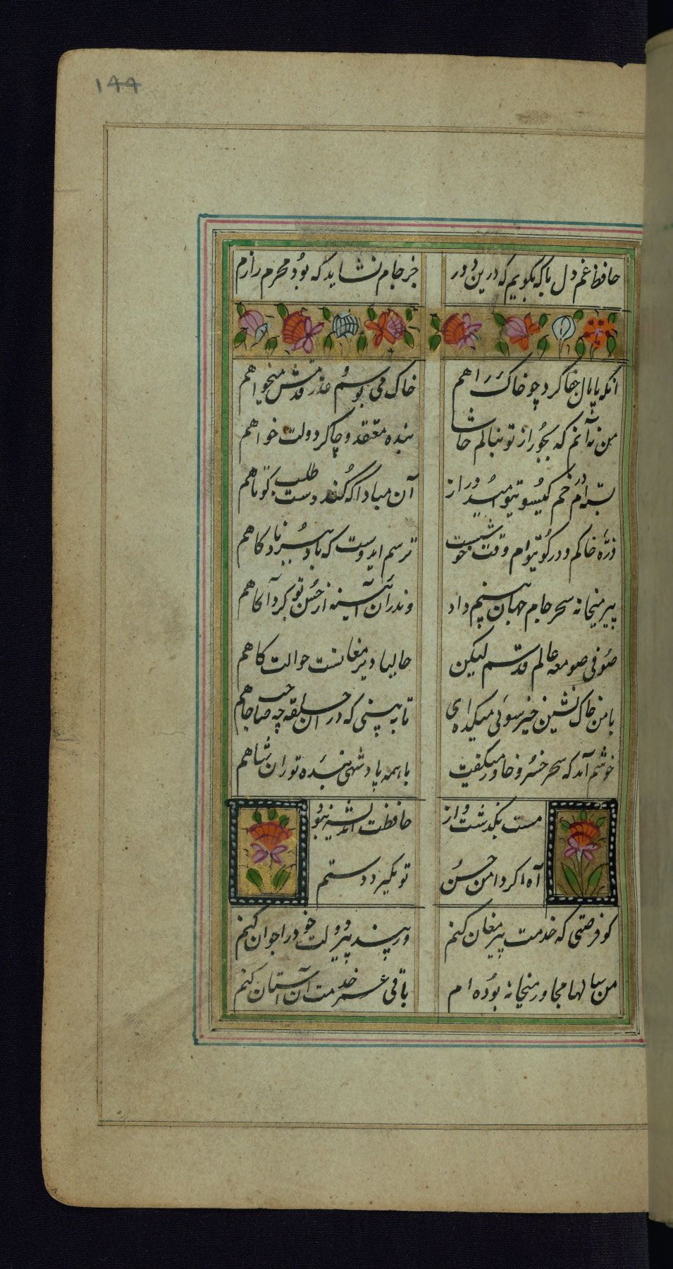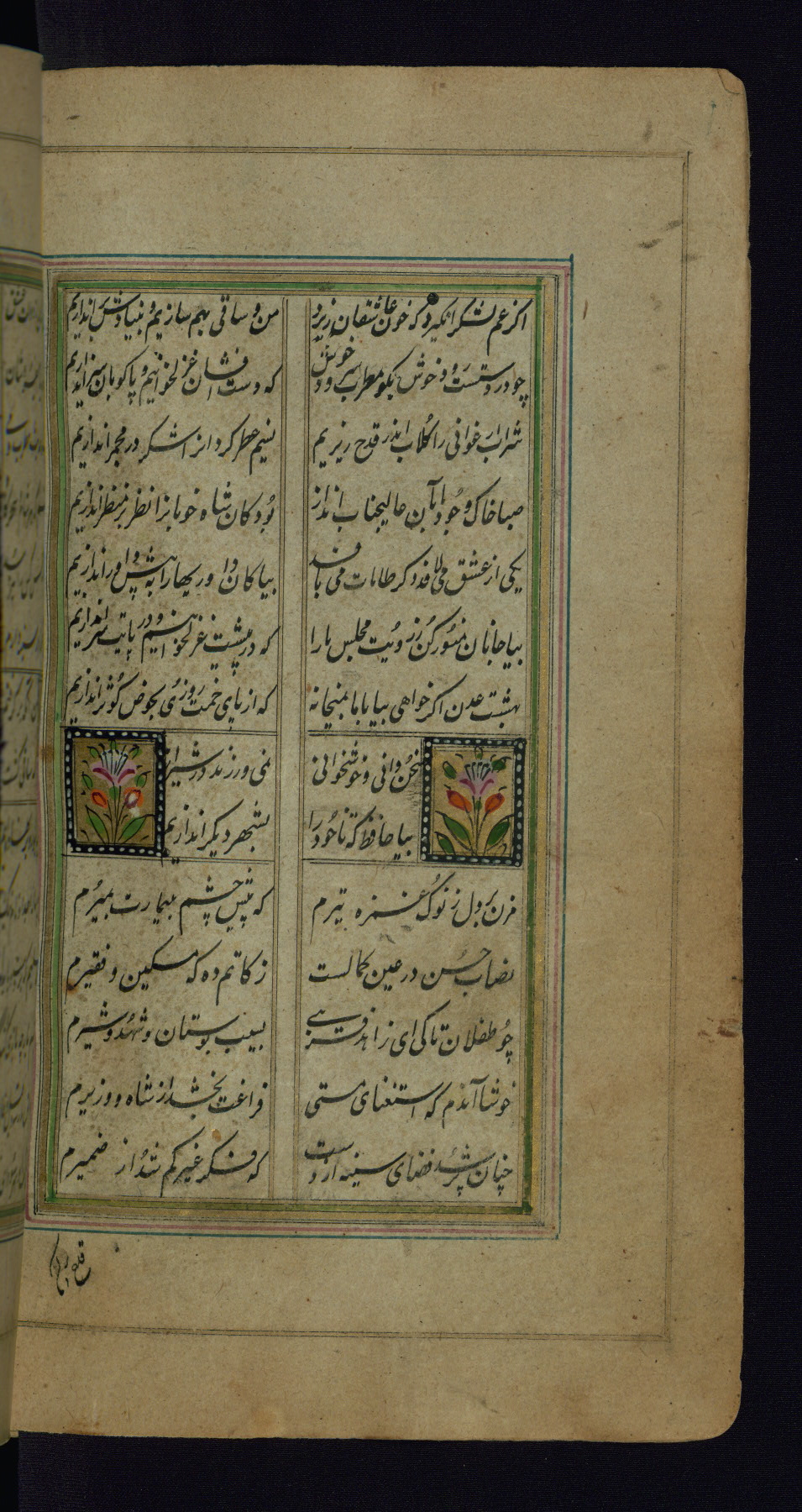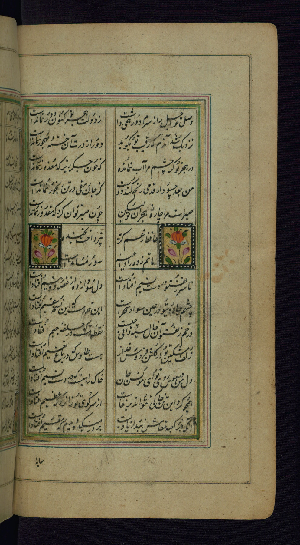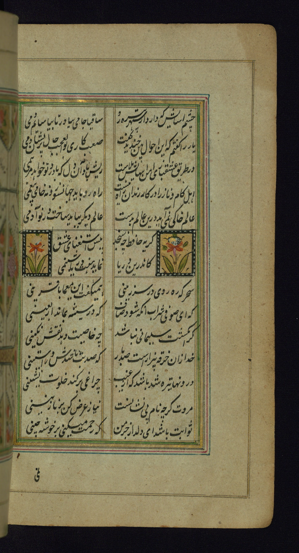 This is an illuminated and illustrated Collection of poems (dīvān) by Shams al-Dīn Muḥammad Ḥāfiz al-Shīrāzī (fl. eighth century AH / fourteenth CE), which was produced in India. According to the colophon, the manuscript was completed on the 19th Rajab 1202[?] AH / 1788[?] CE. It opens with a double-page illuminated incipit (fols. 1b-2a) with headpiece that introduces the preface (dībāchah) (fols. 1b-4b), followed by another double-page illuminated incipit with headpiece opening the main text of the Dīvān (fols. 5b-6a). The codex is decorated throughout with square and rectangular panels, as well as horizontal bands with floral decoration marking the end of odes, quatrains, or series of verses. There are forty-nine illustrations. The brown leather binding with medallion and pendants is contemporary with the manuscript.