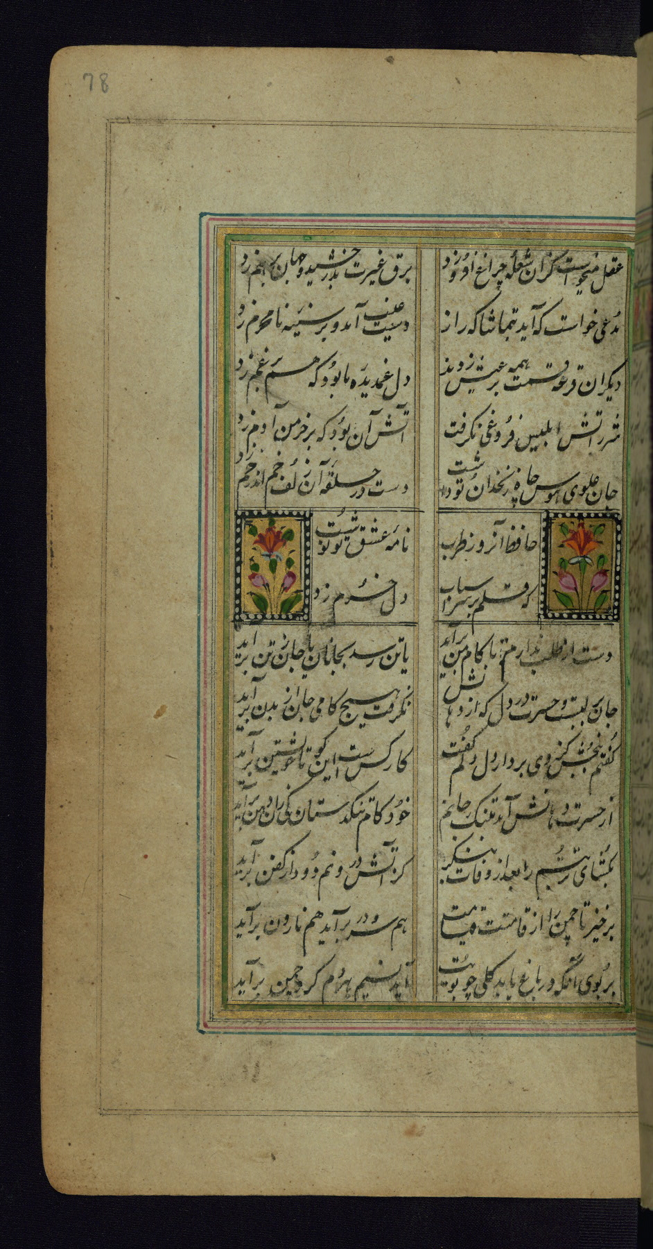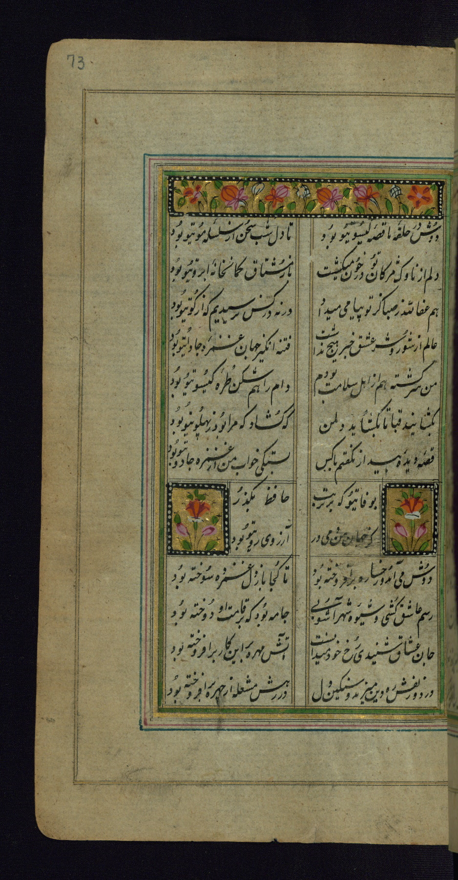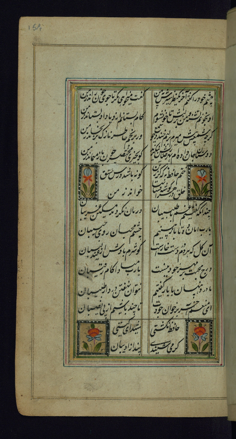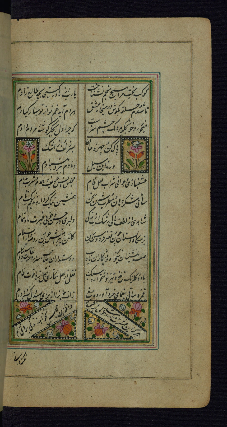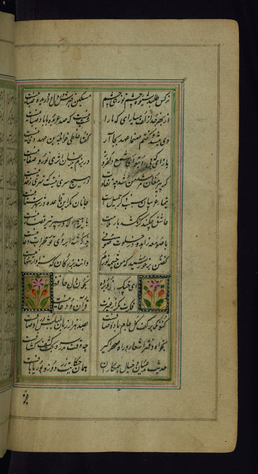 This is an illuminated and illustrated Collection of poems (dīvān) by Shams al-Dīn Muḥammad Ḥāfiz al-Shīrāzī (fl. eighth century AH / fourteenth CE), which was produced in India. According to the colophon, the manuscript was completed on the 19th Rajab 1202[?] AH / 1788[?] CE. It opens with a double-page illuminated incipit (fols. 1b-2a) with headpiece that introduces the preface (dībāchah) (fols. 1b-4b), followed by another double-page illuminated incipit with headpiece opening the main text of the Dīvān (fols. 5b-6a). The codex is decorated throughout with square and rectangular panels, as well as horizontal bands with floral decoration marking the end of odes, quatrains, or series of verses. There are forty-nine illustrations. The brown leather binding with medallion and pendants is contemporary with the manuscript.