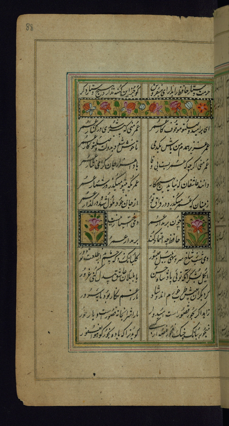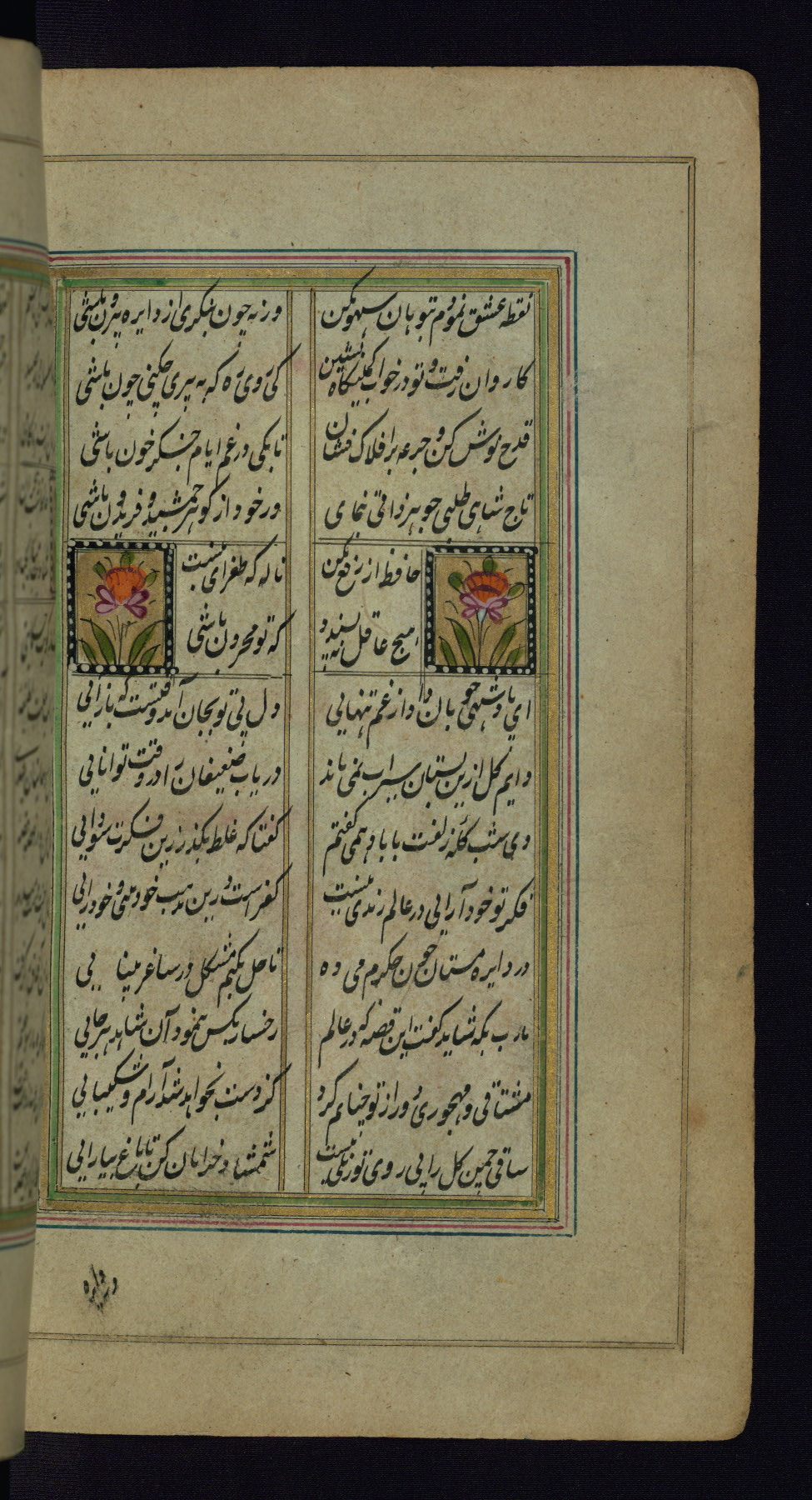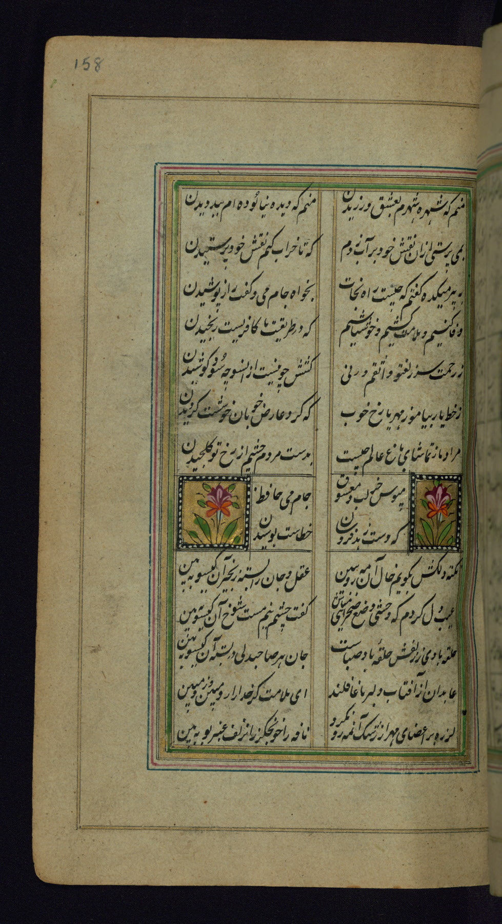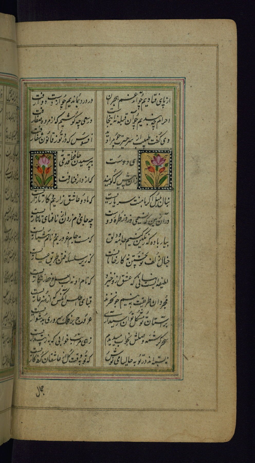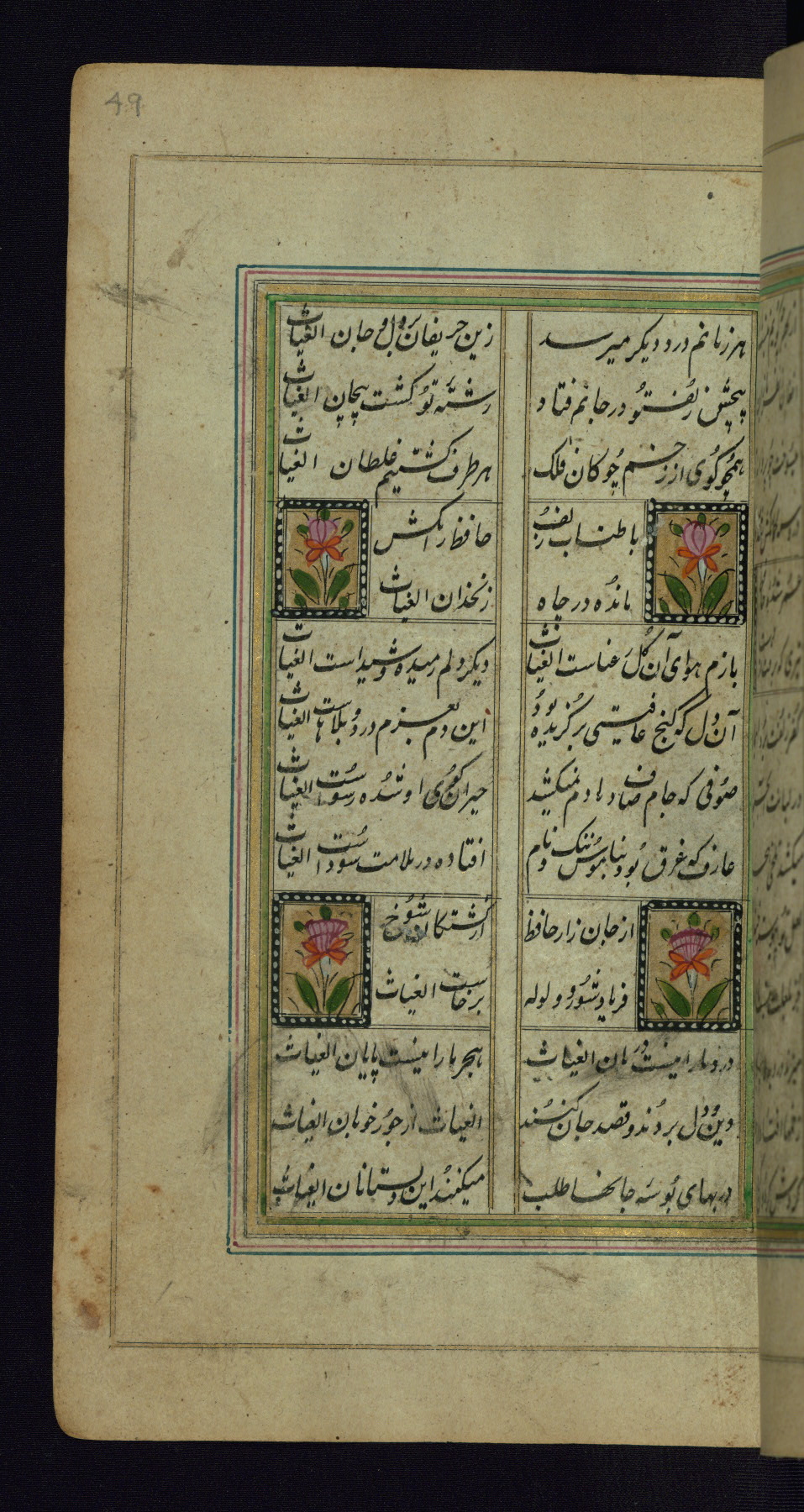 This is an illuminated and illustrated Collection of poems (dīvān) by Shams al-Dīn Muḥammad Ḥāfiz al-Shīrāzī (fl. eighth century AH / fourteenth CE), which was produced in India. According to the colophon, the manuscript was completed on the 19th Rajab 1202[?] AH / 1788[?] CE. It opens with a double-page illuminated incipit (fols. 1b-2a) with headpiece that introduces the preface (dībāchah) (fols. 1b-4b), followed by another double-page illuminated incipit with headpiece opening the main text of the Dīvān (fols. 5b-6a). The codex is decorated throughout with square and rectangular panels, as well as horizontal bands with floral decoration marking the end of odes, quatrains, or series of verses. There are forty-nine illustrations. The brown leather binding with medallion and pendants is contemporary with the manuscript.