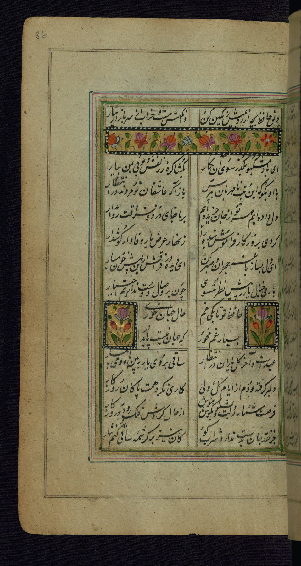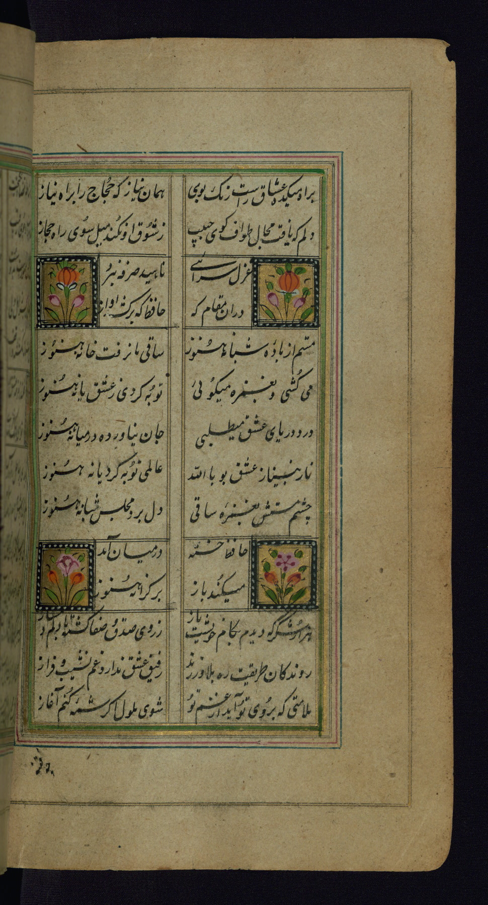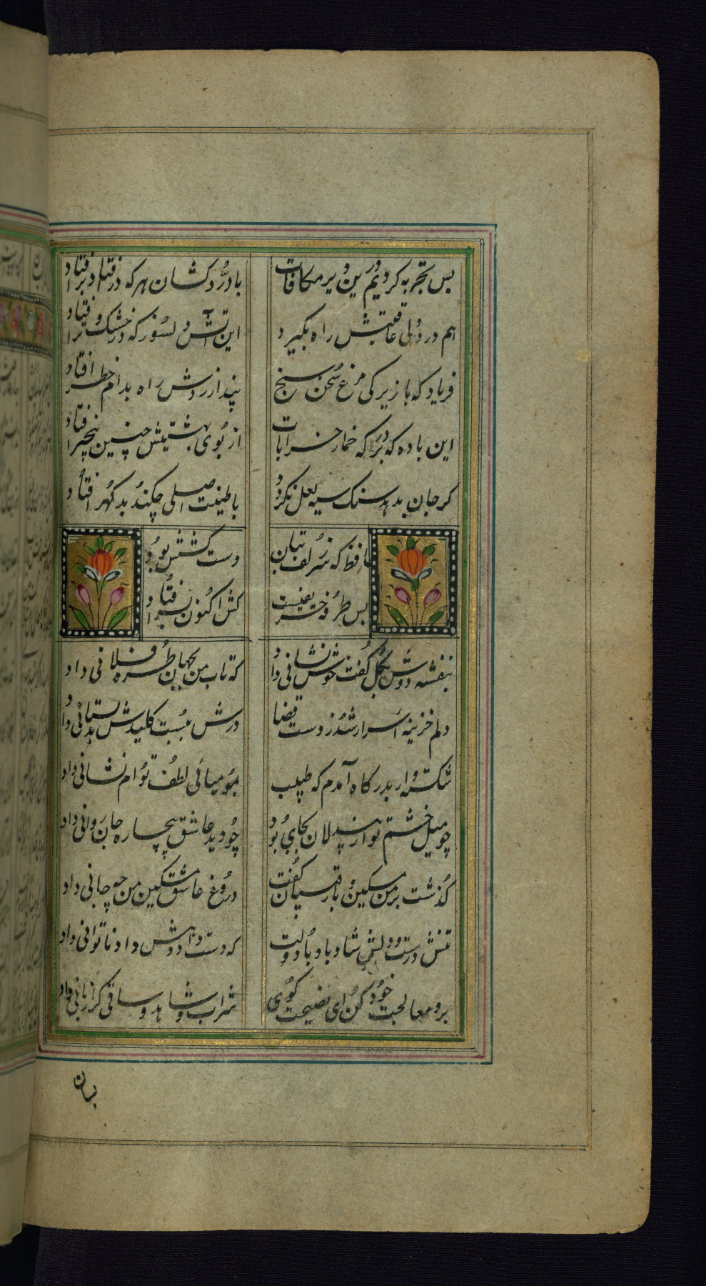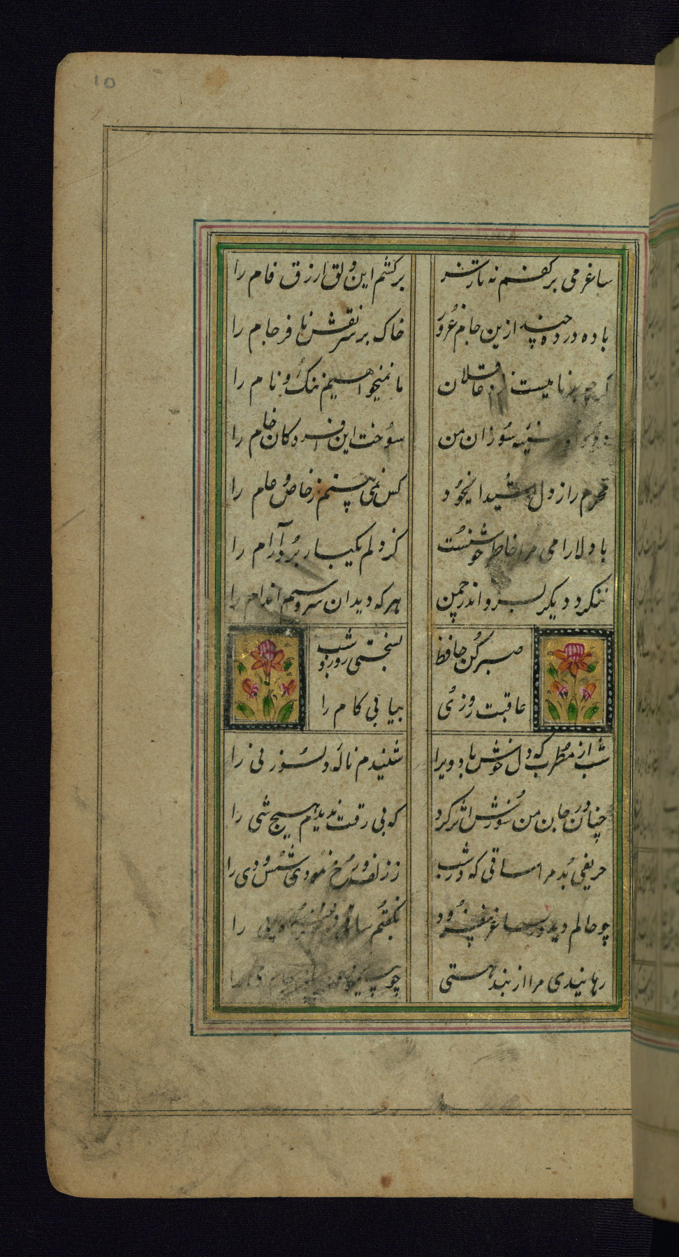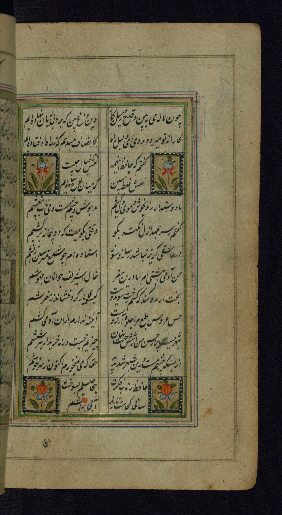 This is an illuminated and illustrated Collection of poems (dīvān) by Shams al-Dīn Muḥammad Ḥāfiz al-Shīrāzī (fl. eighth century AH / fourteenth CE), which was produced in India. According to the colophon, the manuscript was completed on the 19th Rajab 1202[?] AH / 1788[?] CE. It opens with a double-page illuminated incipit (fols. 1b-2a) with headpiece that introduces the preface (dībāchah) (fols. 1b-4b), followed by another double-page illuminated incipit with headpiece opening the main text of the Dīvān (fols. 5b-6a). The codex is decorated throughout with square and rectangular panels, as well as horizontal bands with floral decoration marking the end of odes, quatrains, or series of verses. There are forty-nine illustrations. The brown leather binding with medallion and pendants is contemporary with the manuscript.