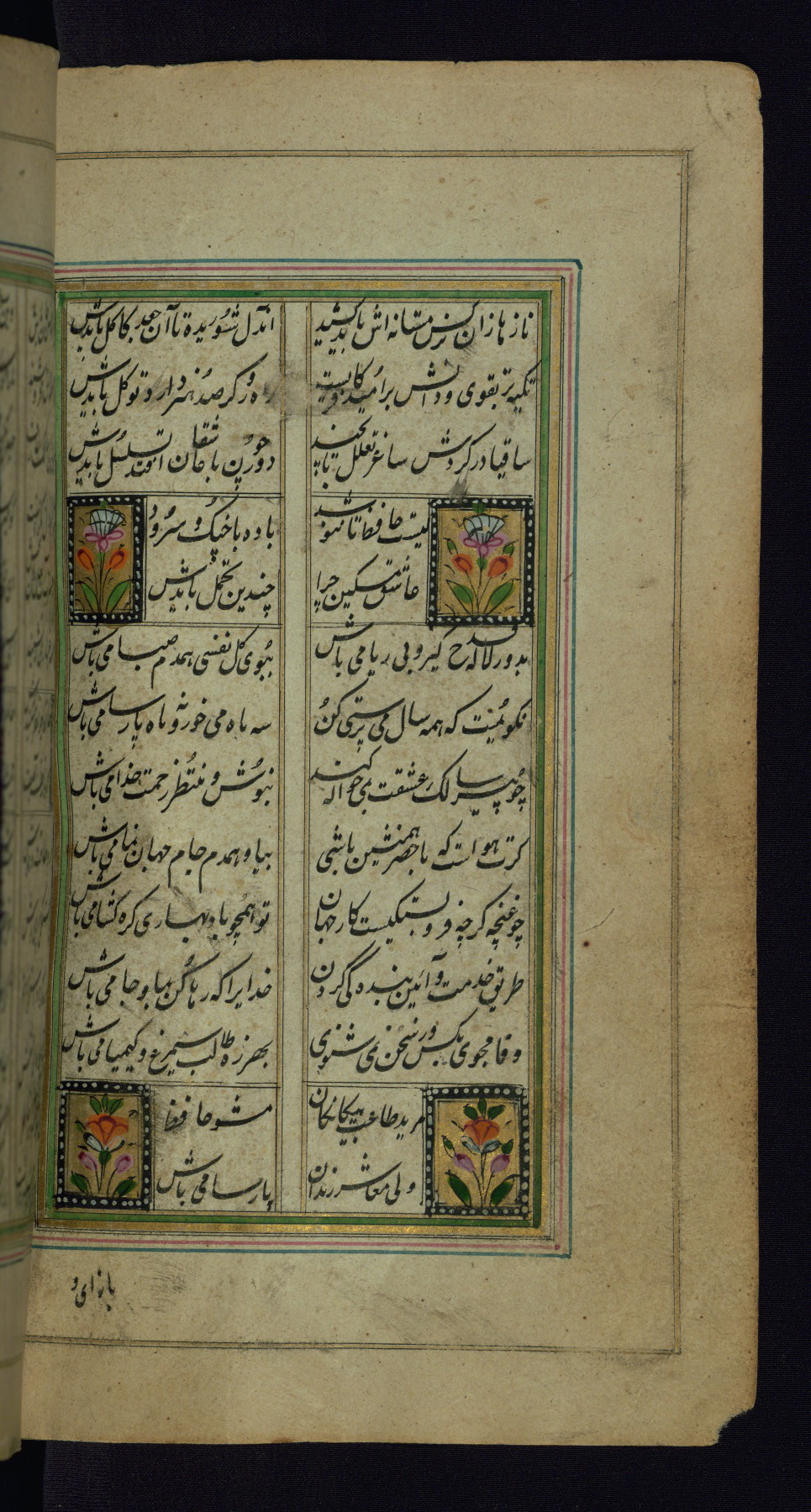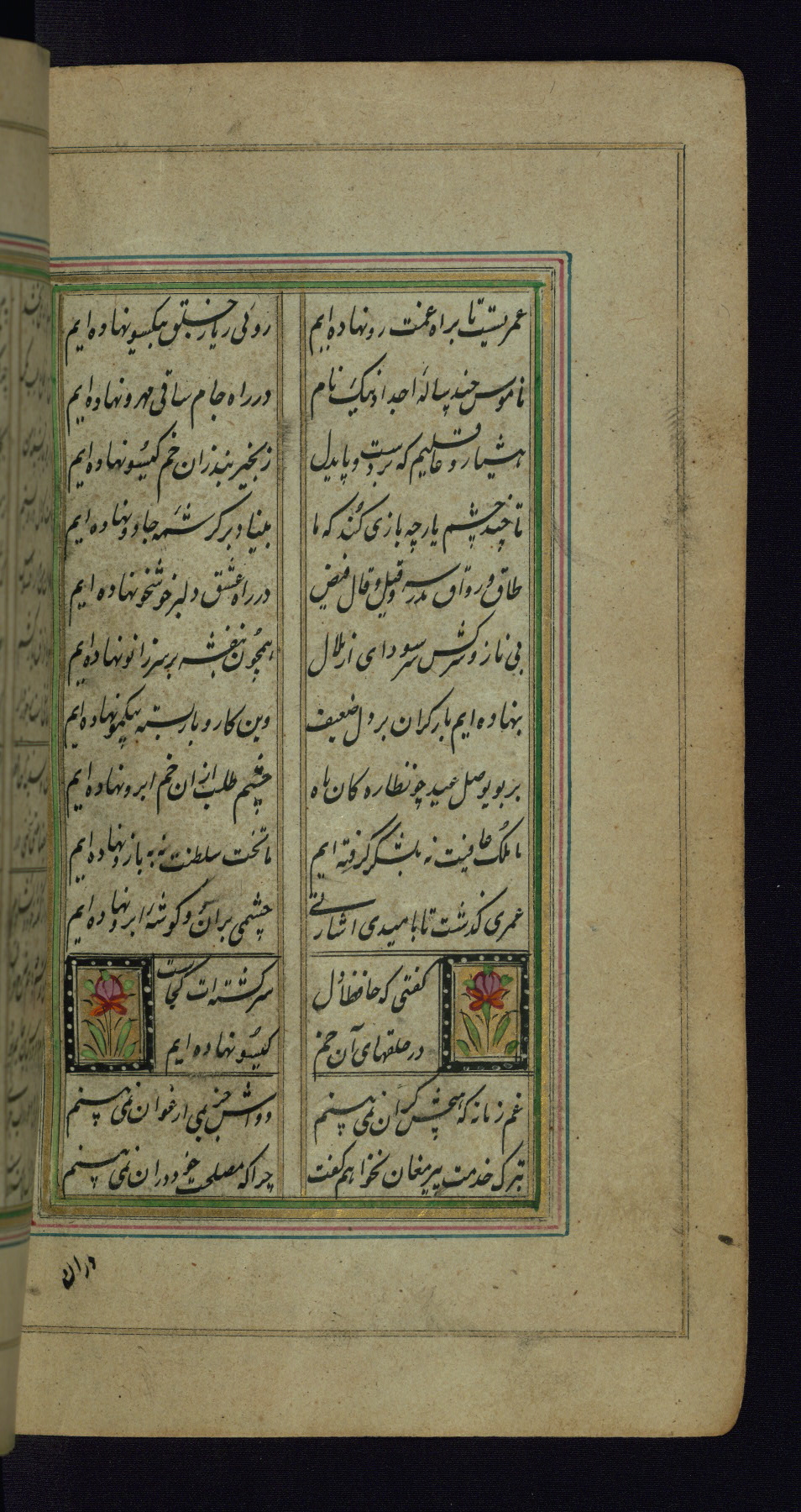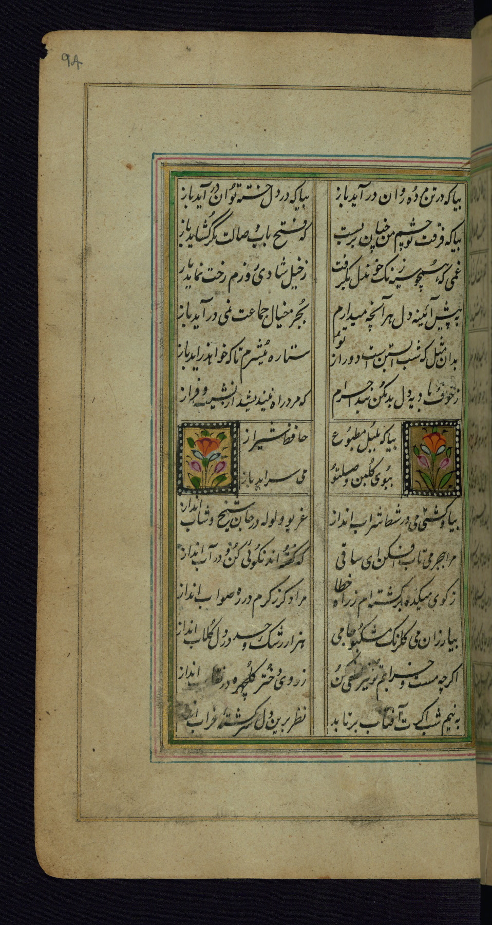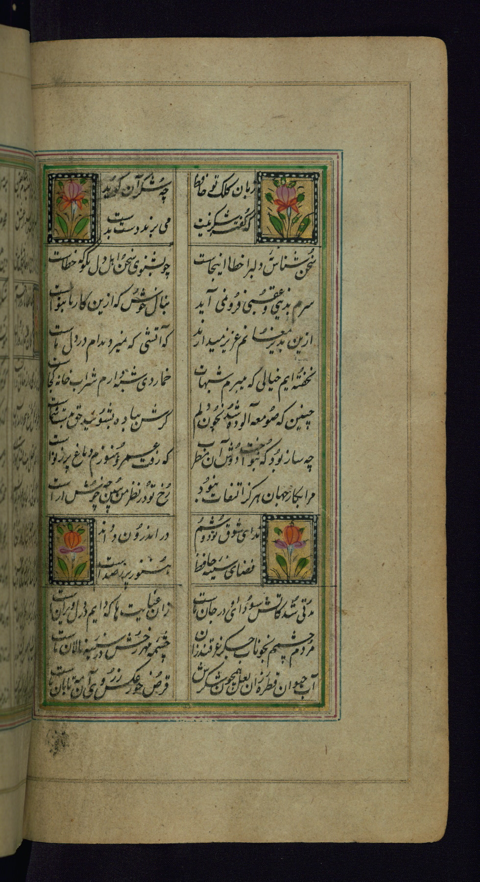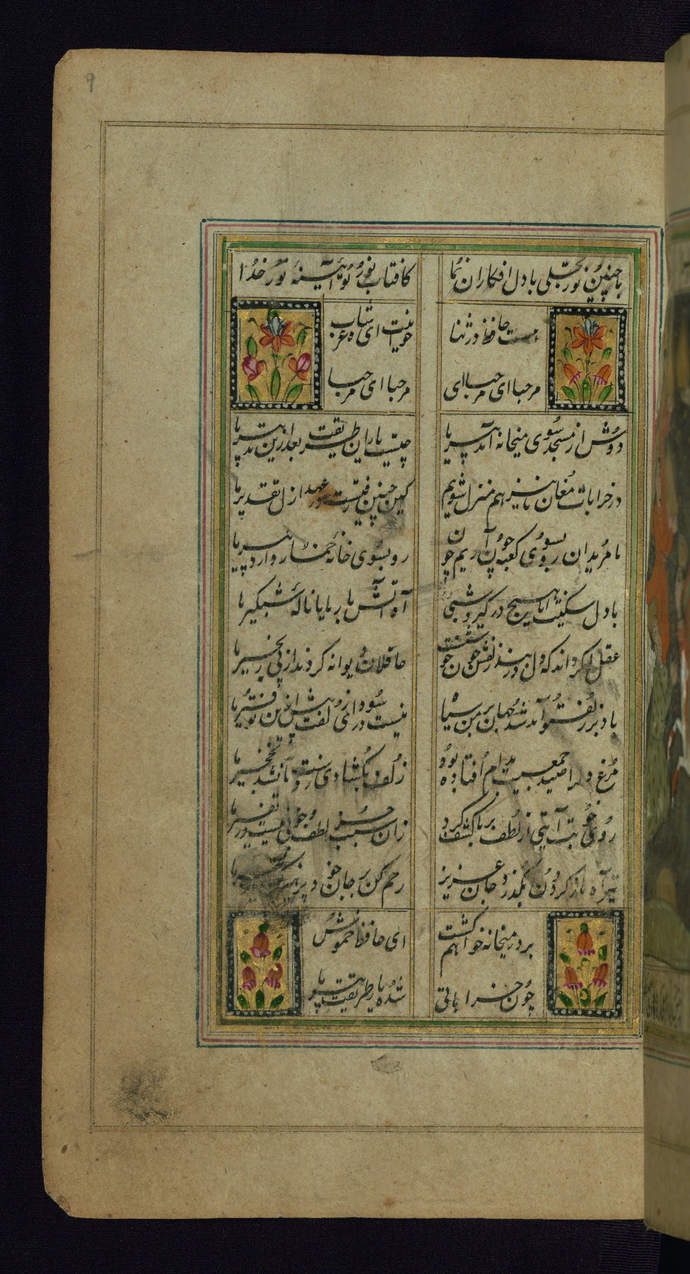 This is an illuminated and illustrated Collection of poems (dīvān) by Shams al-Dīn Muḥammad Ḥāfiz al-Shīrāzī (fl. eighth century AH / fourteenth CE), which was produced in India. According to the colophon, the manuscript was completed on the 19th Rajab 1202[?] AH / 1788[?] CE. It opens with a double-page illuminated incipit (fols. 1b-2a) with headpiece that introduces the preface (dībāchah) (fols. 1b-4b), followed by another double-page illuminated incipit with headpiece opening the main text of the Dīvān (fols. 5b-6a). The codex is decorated throughout with square and rectangular panels, as well as horizontal bands with floral decoration marking the end of odes, quatrains, or series of verses. There are forty-nine illustrations. The brown leather binding with medallion and pendants is contemporary with the manuscript.