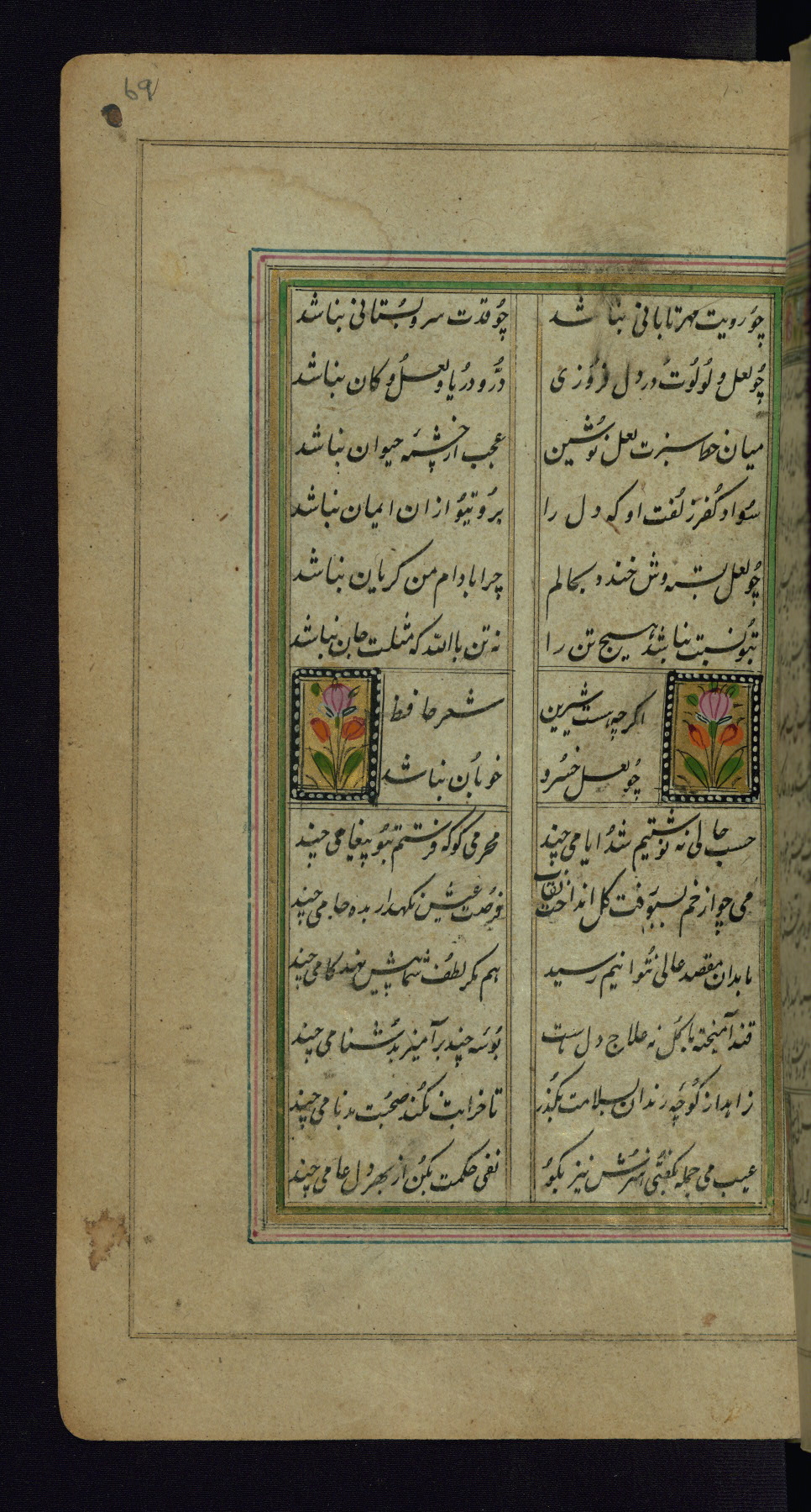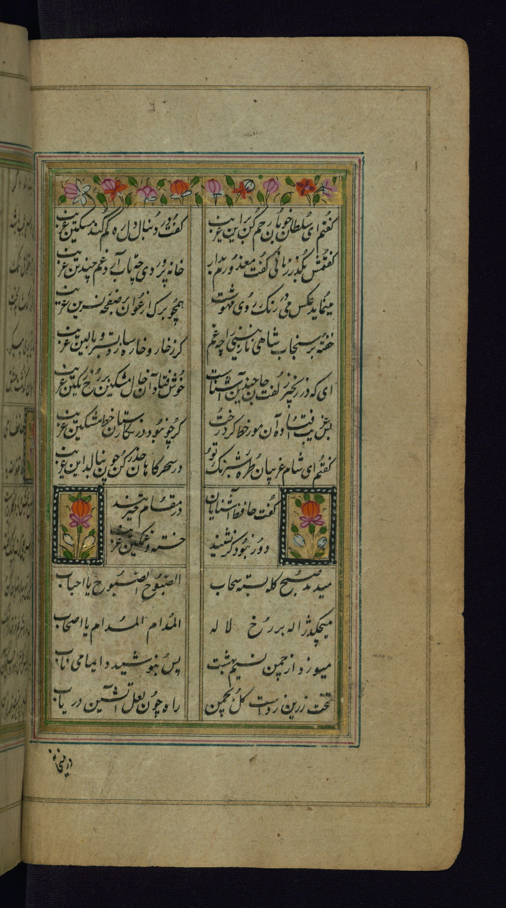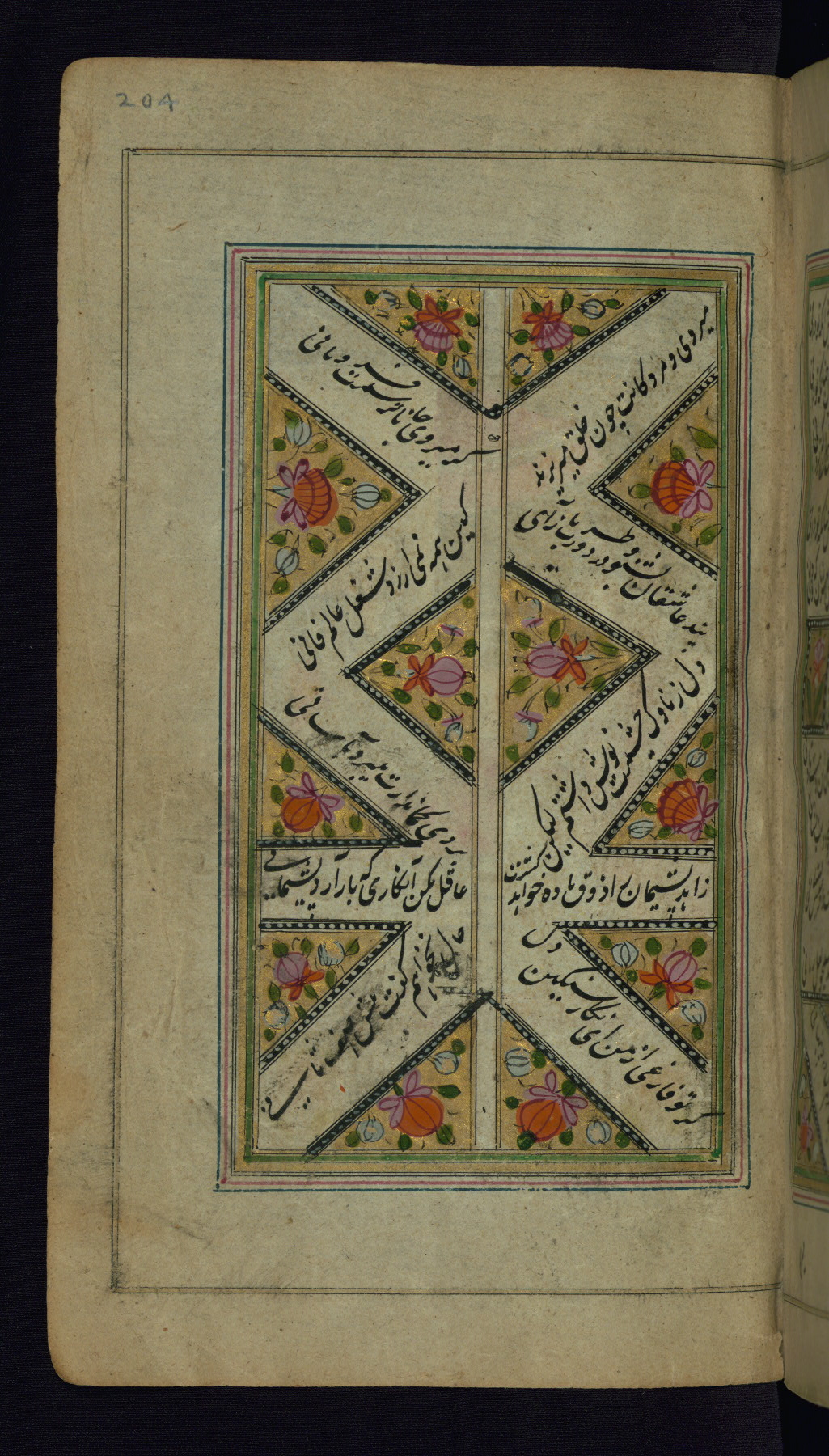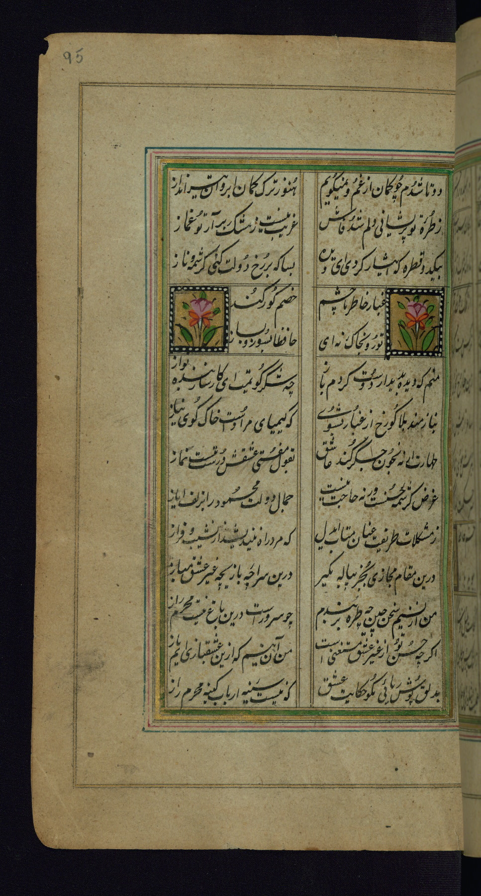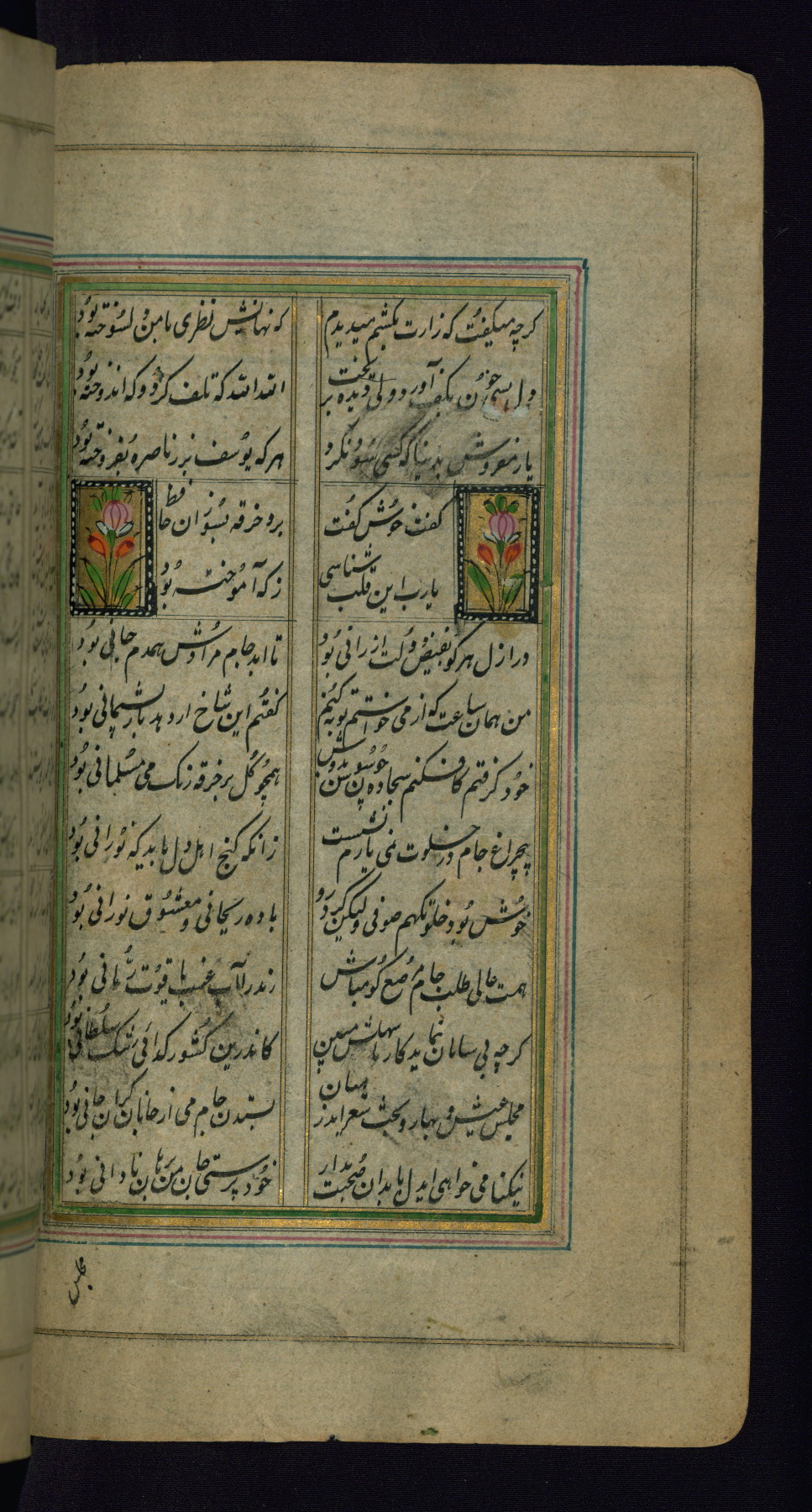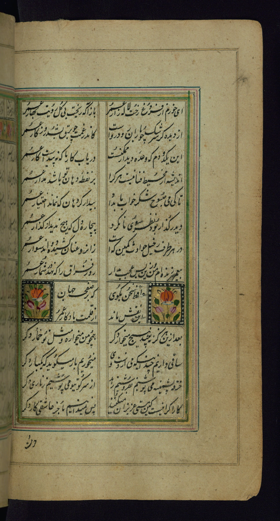 This is an illuminated and illustrated Collection of poems (dīvān) by Shams al-Dīn Muḥammad Ḥāfiz al-Shīrāzī (fl. eighth century AH / fourteenth CE), which was produced in India. According to the colophon, the manuscript was completed on the 19th Rajab 1202[?] AH / 1788[?] CE. It opens with a double-page illuminated incipit (fols. 1b-2a) with headpiece that introduces the preface (dībāchah) (fols. 1b-4b), followed by another double-page illuminated incipit with headpiece opening the main text of the Dīvān (fols. 5b-6a). The codex is decorated throughout with square and rectangular panels, as well as horizontal bands with floral decoration marking the end of odes, quatrains, or series of verses. There are forty-nine illustrations. The brown leather binding with medallion and pendants is contemporary with the manuscript.