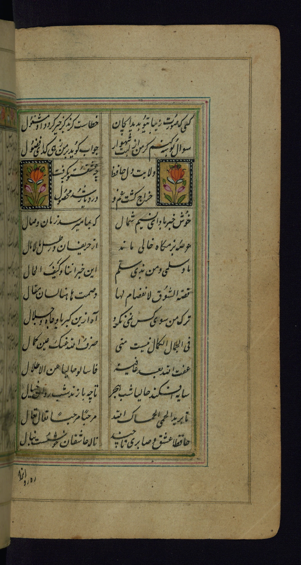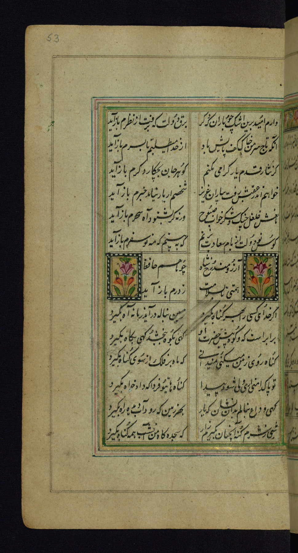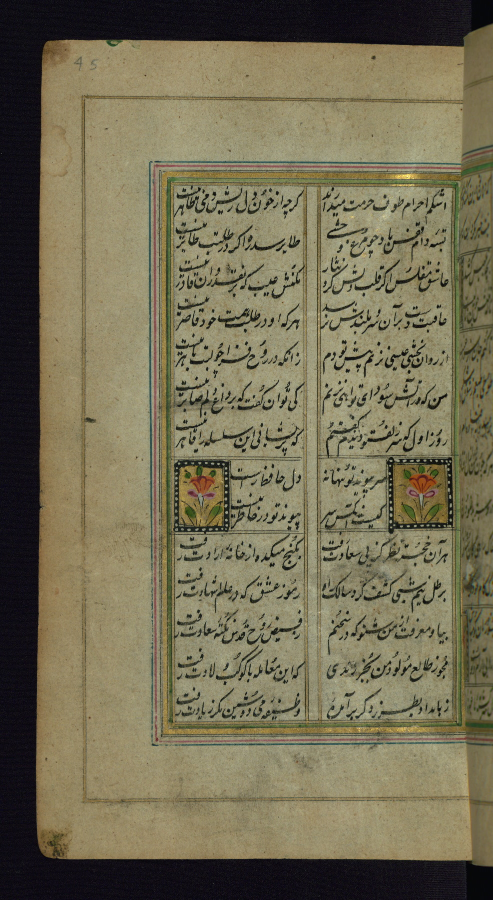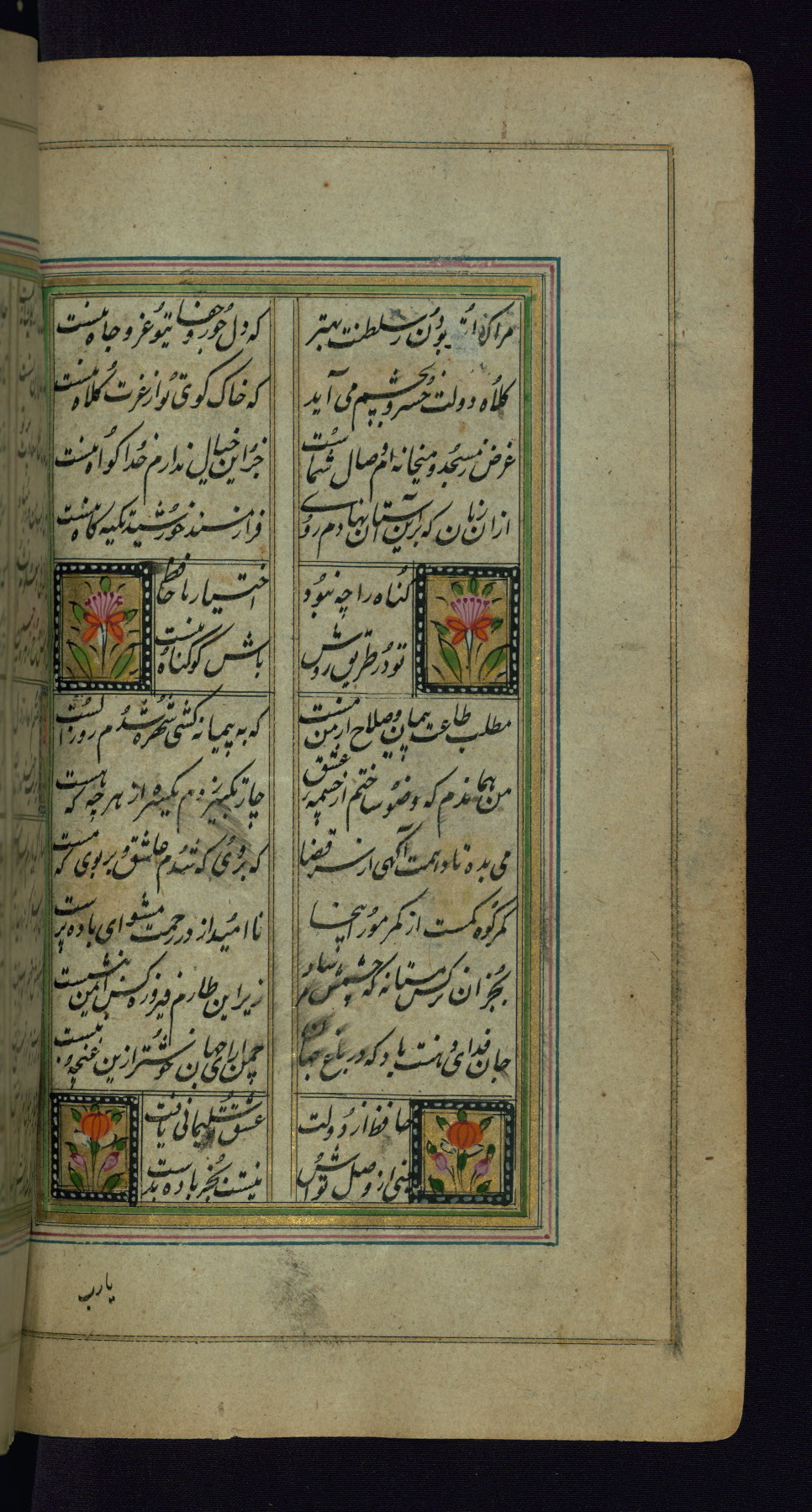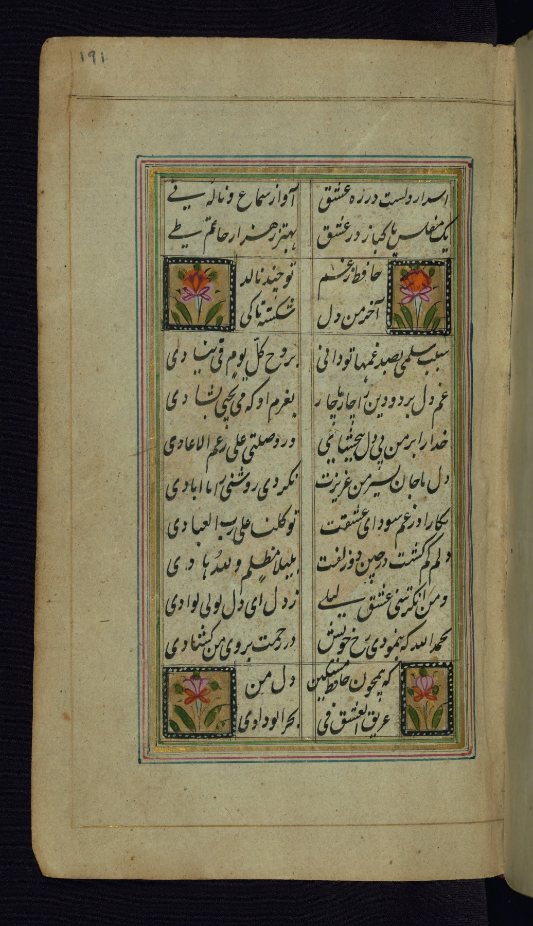 This is an illuminated and illustrated Collection of poems (dīvān) by Shams al-Dīn Muḥammad Ḥāfiz al-Shīrāzī (fl. eighth century AH / fourteenth CE), which was produced in India. According to the colophon, the manuscript was completed on the 19th Rajab 1202[?] AH / 1788[?] CE. It opens with a double-page illuminated incipit (fols. 1b-2a) with headpiece that introduces the preface (dībāchah) (fols. 1b-4b), followed by another double-page illuminated incipit with headpiece opening the main text of the Dīvān (fols. 5b-6a). The codex is decorated throughout with square and rectangular panels, as well as horizontal bands with floral decoration marking the end of odes, quatrains, or series of verses. There are forty-nine illustrations. The brown leather binding with medallion and pendants is contemporary with the manuscript.