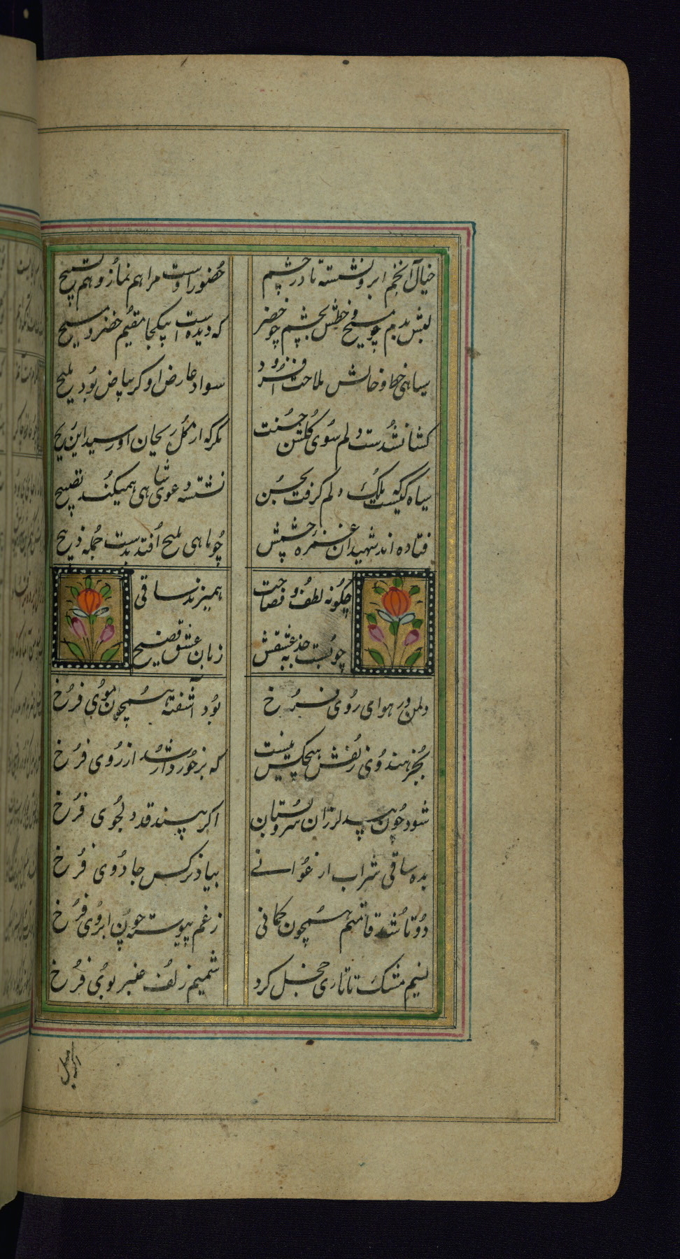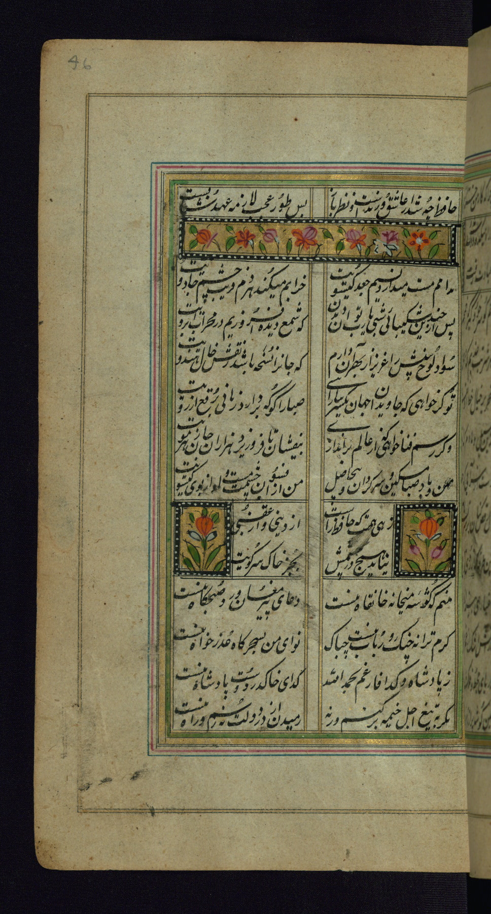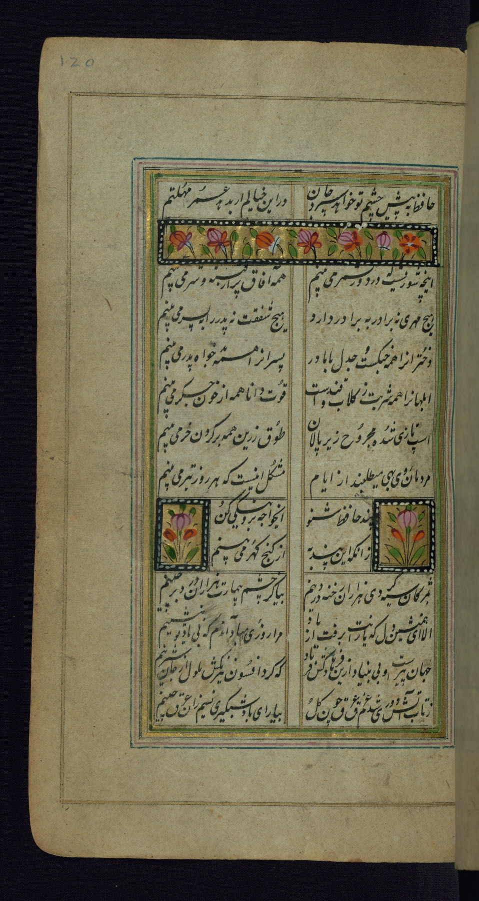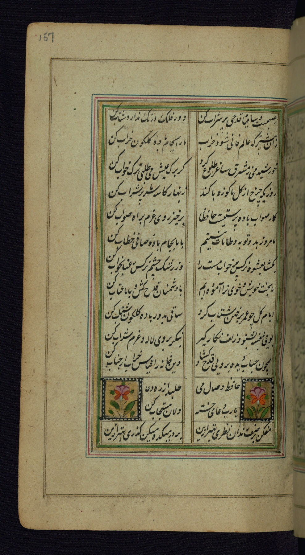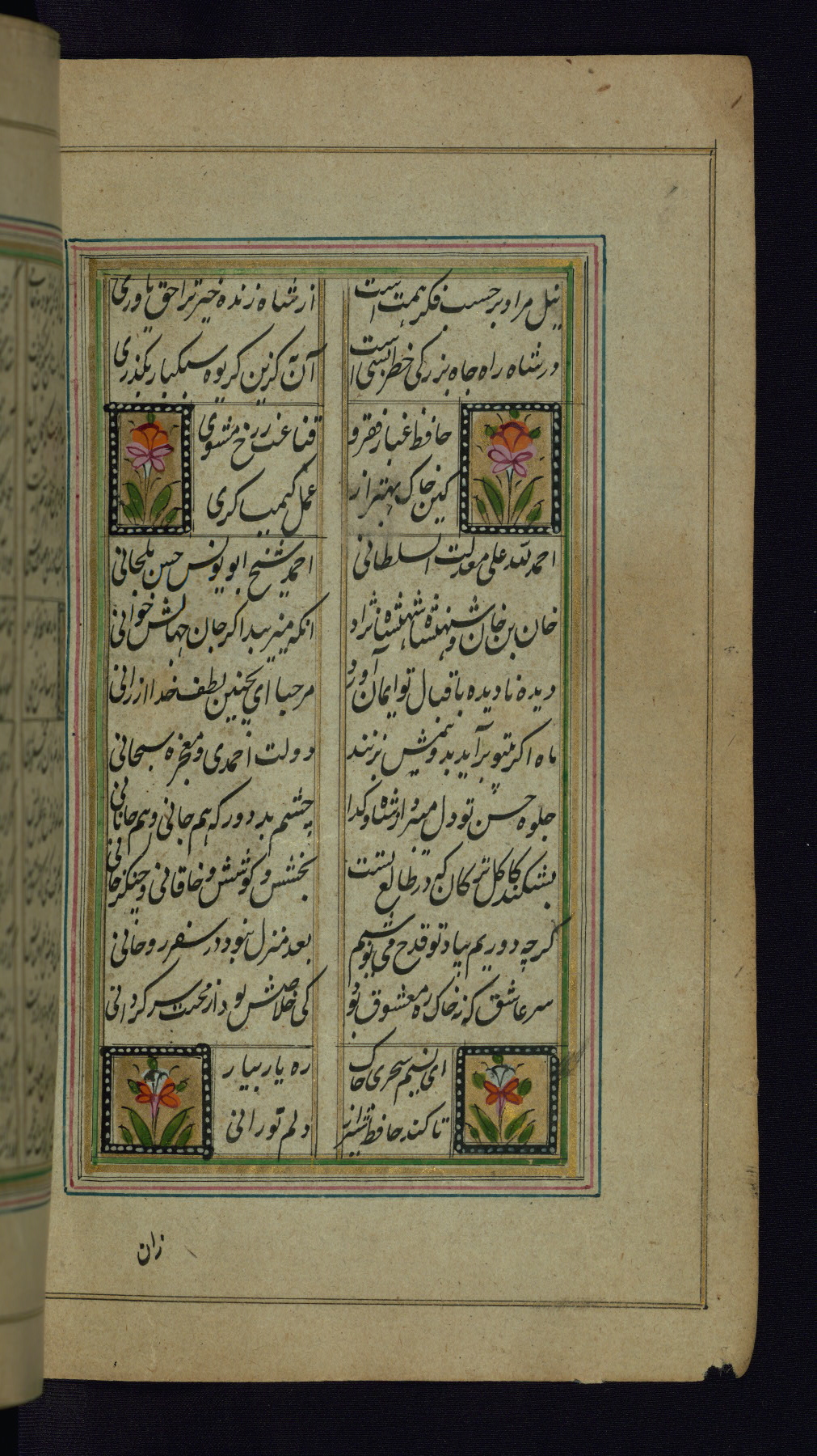 This is an illuminated and illustrated Collection of poems (dīvān) by Shams al-Dīn Muḥammad Ḥāfiz al-Shīrāzī (fl. eighth century AH / fourteenth CE), which was produced in India. According to the colophon, the manuscript was completed on the 19th Rajab 1202[?] AH / 1788[?] CE. It opens with a double-page illuminated incipit (fols. 1b-2a) with headpiece that introduces the preface (dībāchah) (fols. 1b-4b), followed by another double-page illuminated incipit with headpiece opening the main text of the Dīvān (fols. 5b-6a). The codex is decorated throughout with square and rectangular panels, as well as horizontal bands with floral decoration marking the end of odes, quatrains, or series of verses. There are forty-nine illustrations. The brown leather binding with medallion and pendants is contemporary with the manuscript.