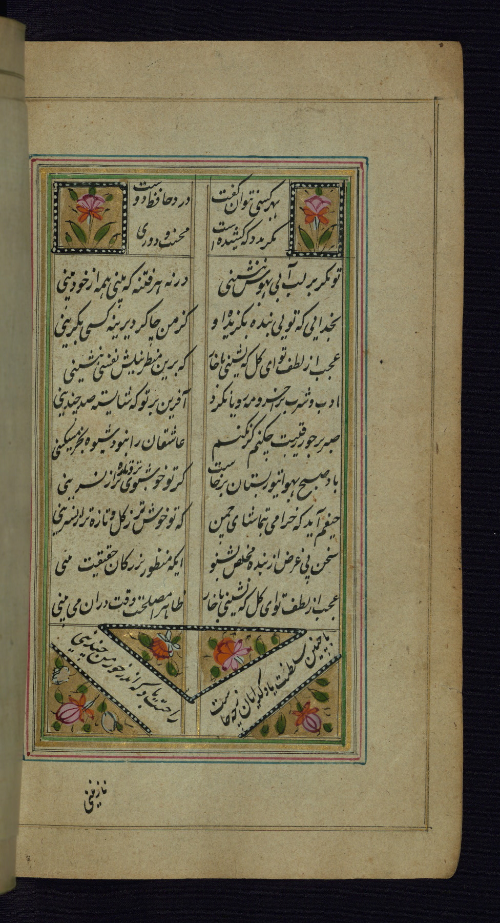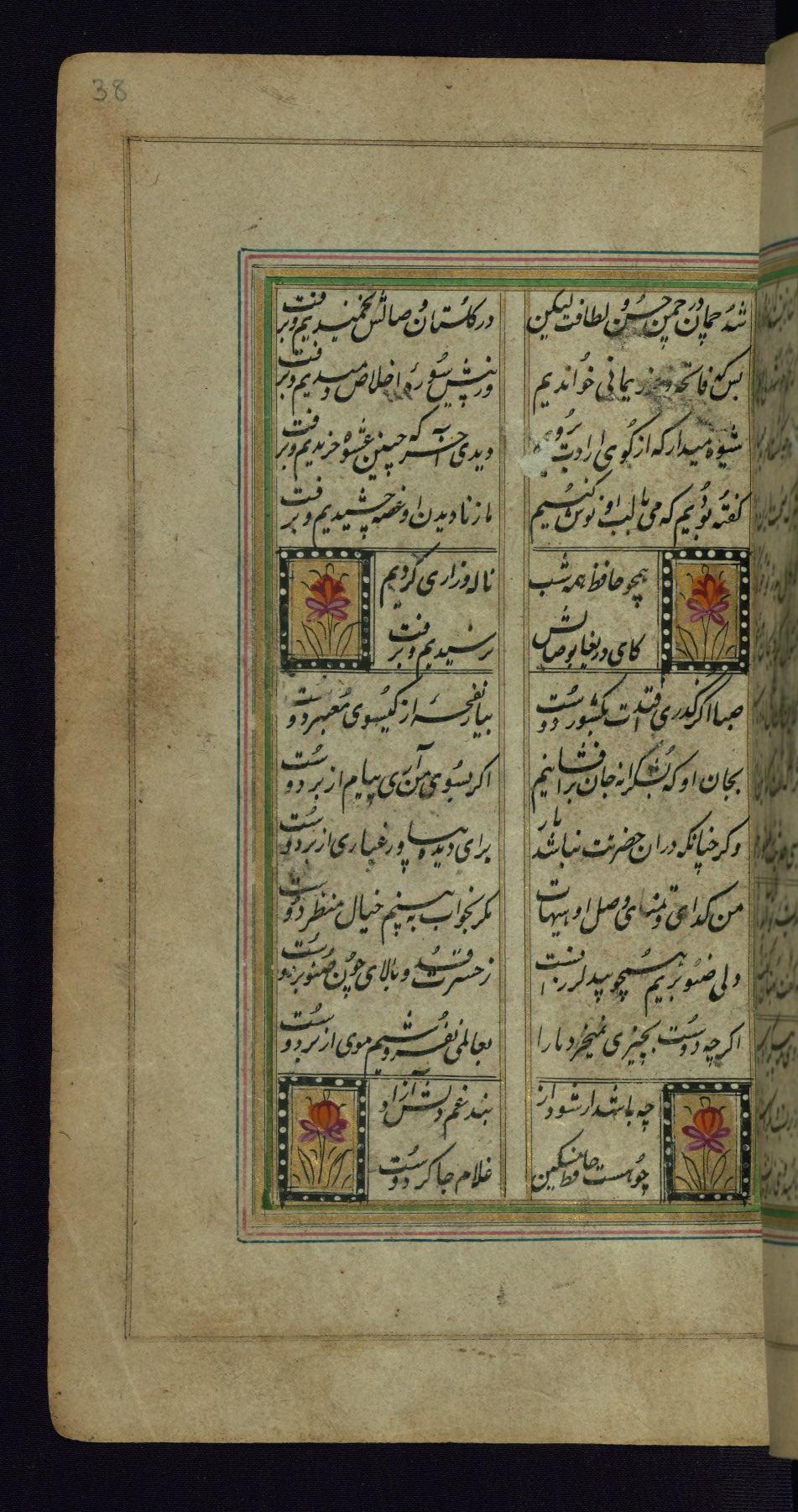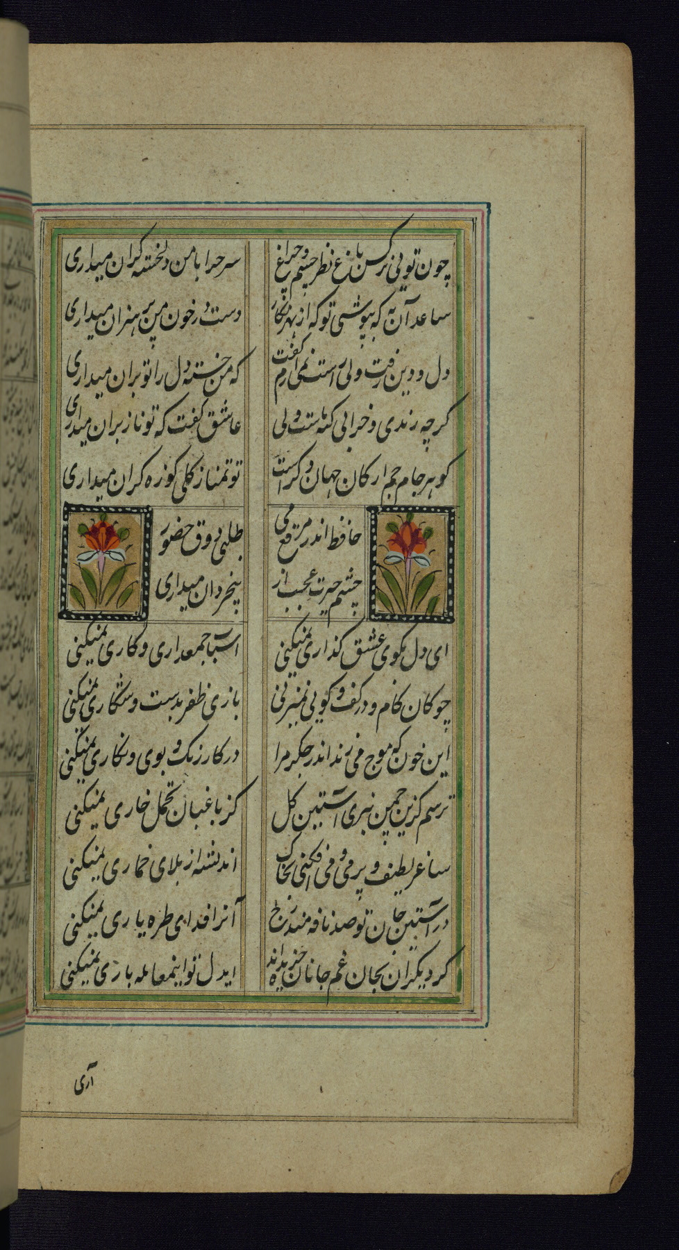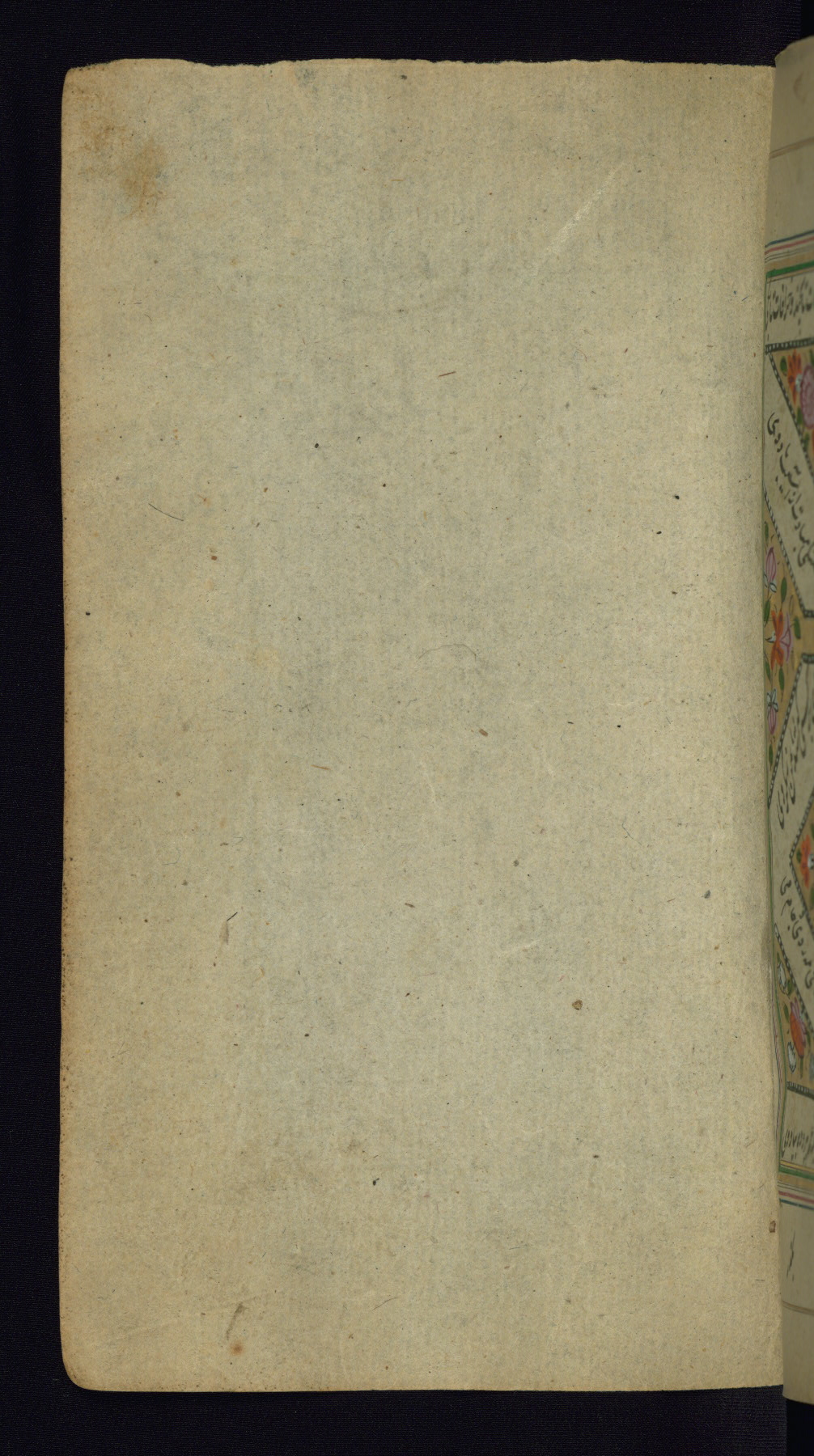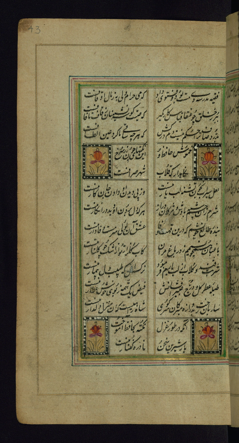 This is an illuminated and illustrated Collection of poems (dīvān) by Shams al-Dīn Muḥammad Ḥāfiz al-Shīrāzī (fl. eighth century AH / fourteenth CE), which was produced in India. According to the colophon, the manuscript was completed on the 19th Rajab 1202[?] AH / 1788[?] CE. It opens with a double-page illuminated incipit (fols. 1b-2a) with headpiece that introduces the preface (dībāchah) (fols. 1b-4b), followed by another double-page illuminated incipit with headpiece opening the main text of the Dīvān (fols. 5b-6a). The codex is decorated throughout with square and rectangular panels, as well as horizontal bands with floral decoration marking the end of odes, quatrains, or series of verses. There are forty-nine illustrations. The brown leather binding with medallion and pendants is contemporary with the manuscript.
