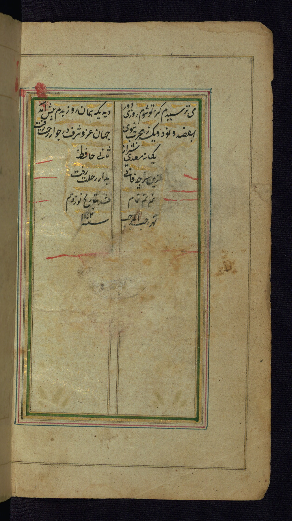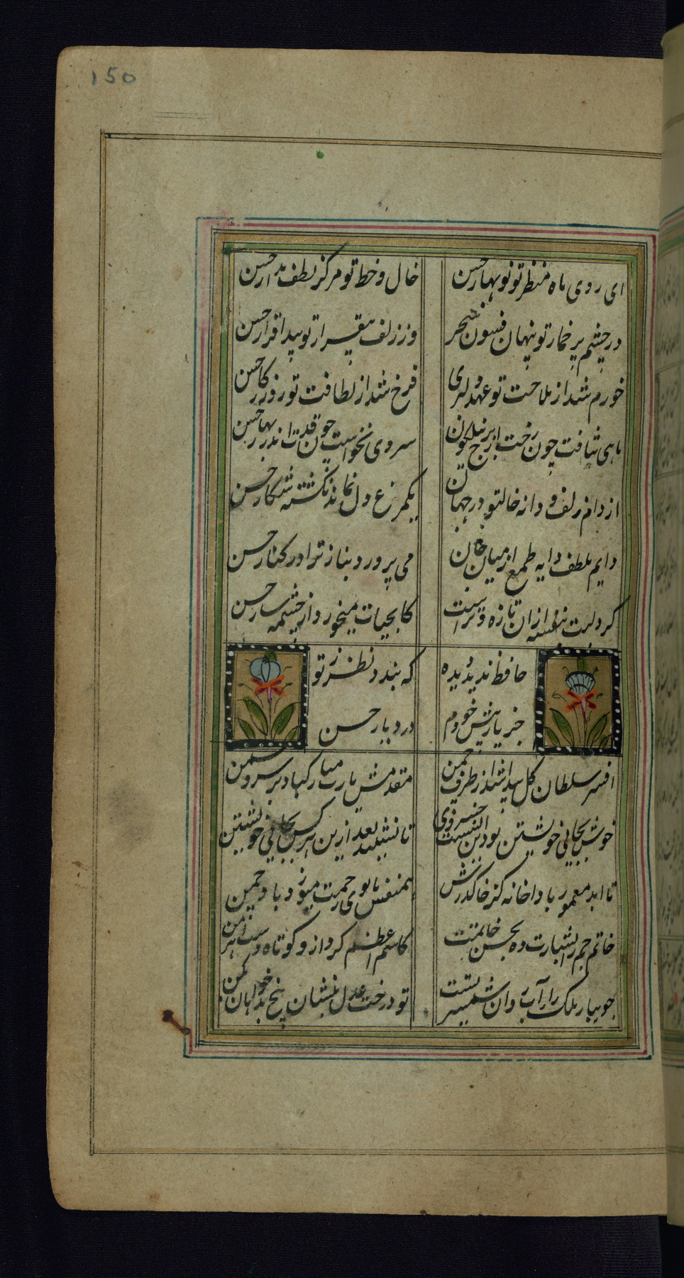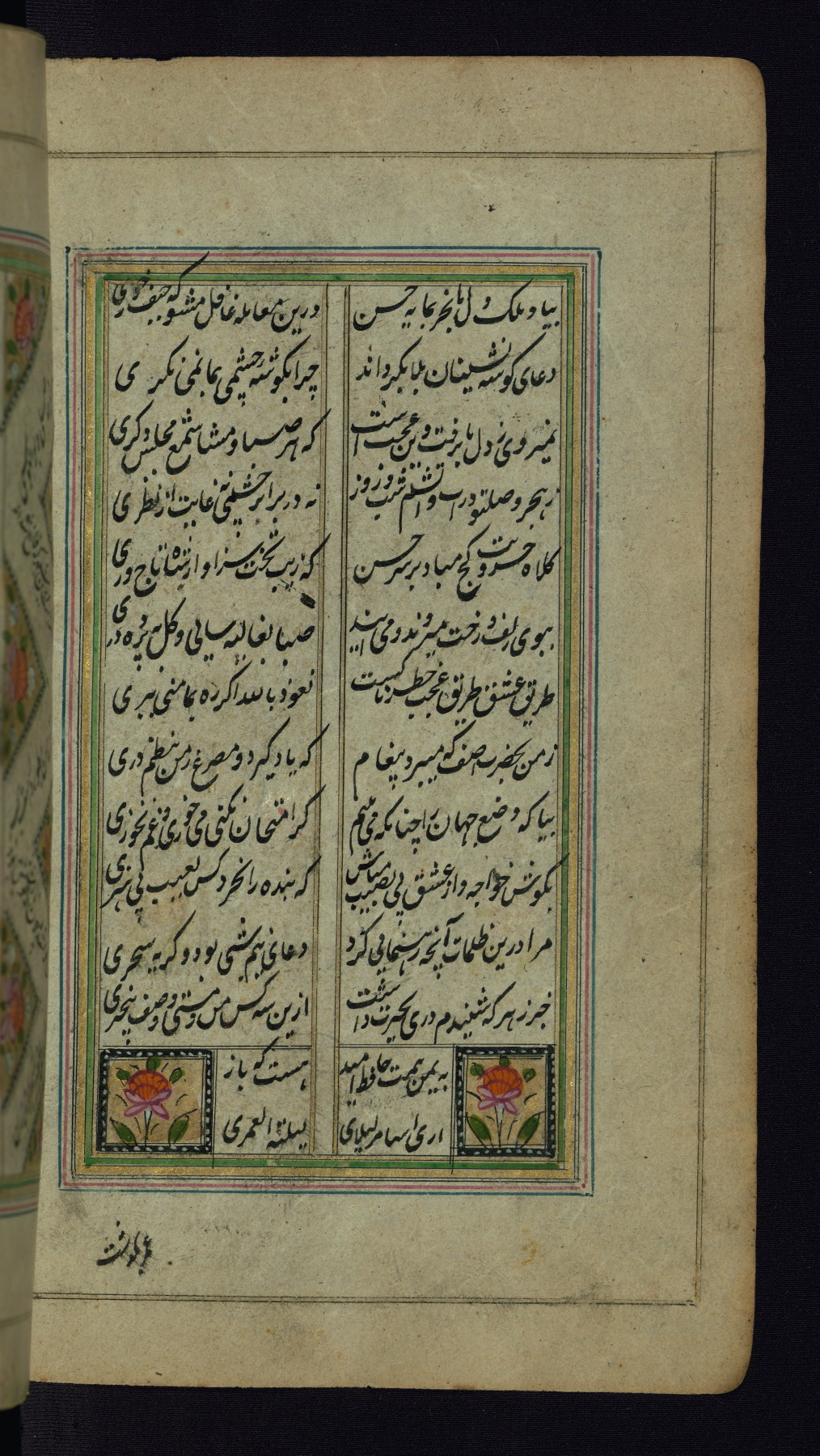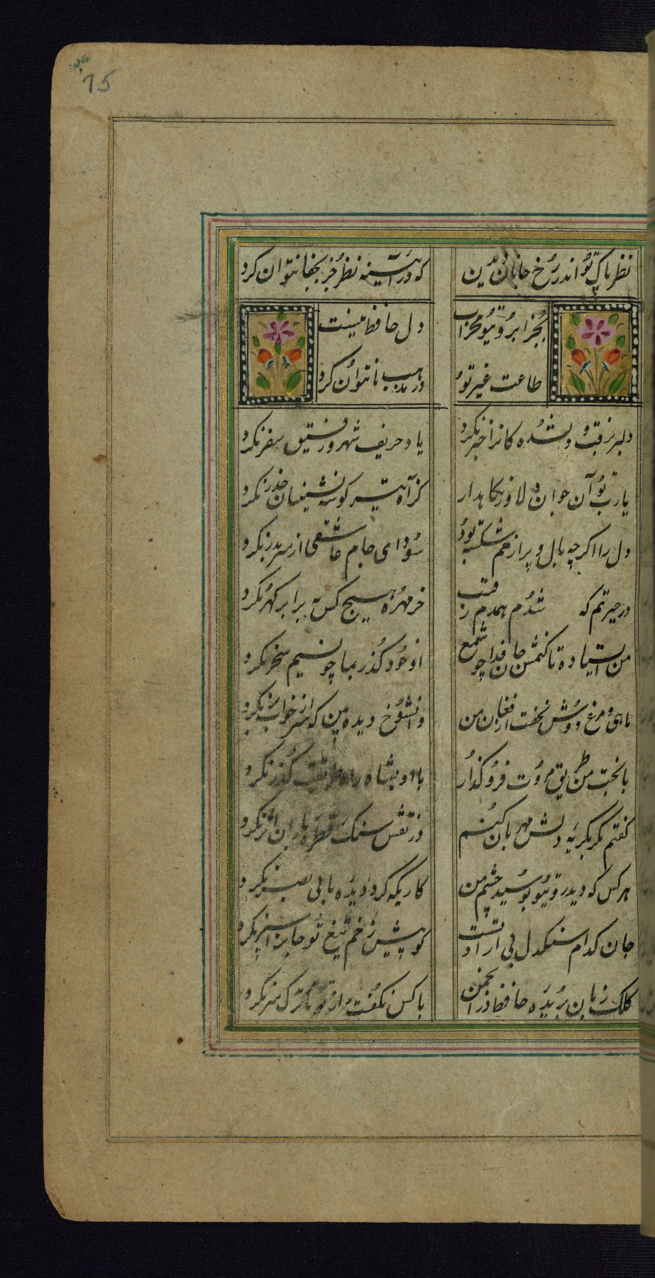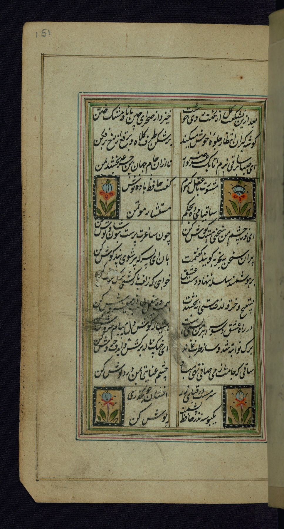 This is an illuminated and illustrated Collection of poems (dīvān) by Shams al-Dīn Muḥammad Ḥāfiz al-Shīrāzī (fl. eighth century AH / fourteenth CE), which was produced in India. According to the colophon, the manuscript was completed on the 19th Rajab 1202[?] AH / 1788[?] CE. It opens with a double-page illuminated incipit (fols. 1b-2a) with headpiece that introduces the preface (dībāchah) (fols. 1b-4b), followed by another double-page illuminated incipit with headpiece opening the main text of the Dīvān (fols. 5b-6a). The codex is decorated throughout with square and rectangular panels, as well as horizontal bands with floral decoration marking the end of odes, quatrains, or series of verses. There are forty-nine illustrations. The brown leather binding with medallion and pendants is contemporary with the manuscript.