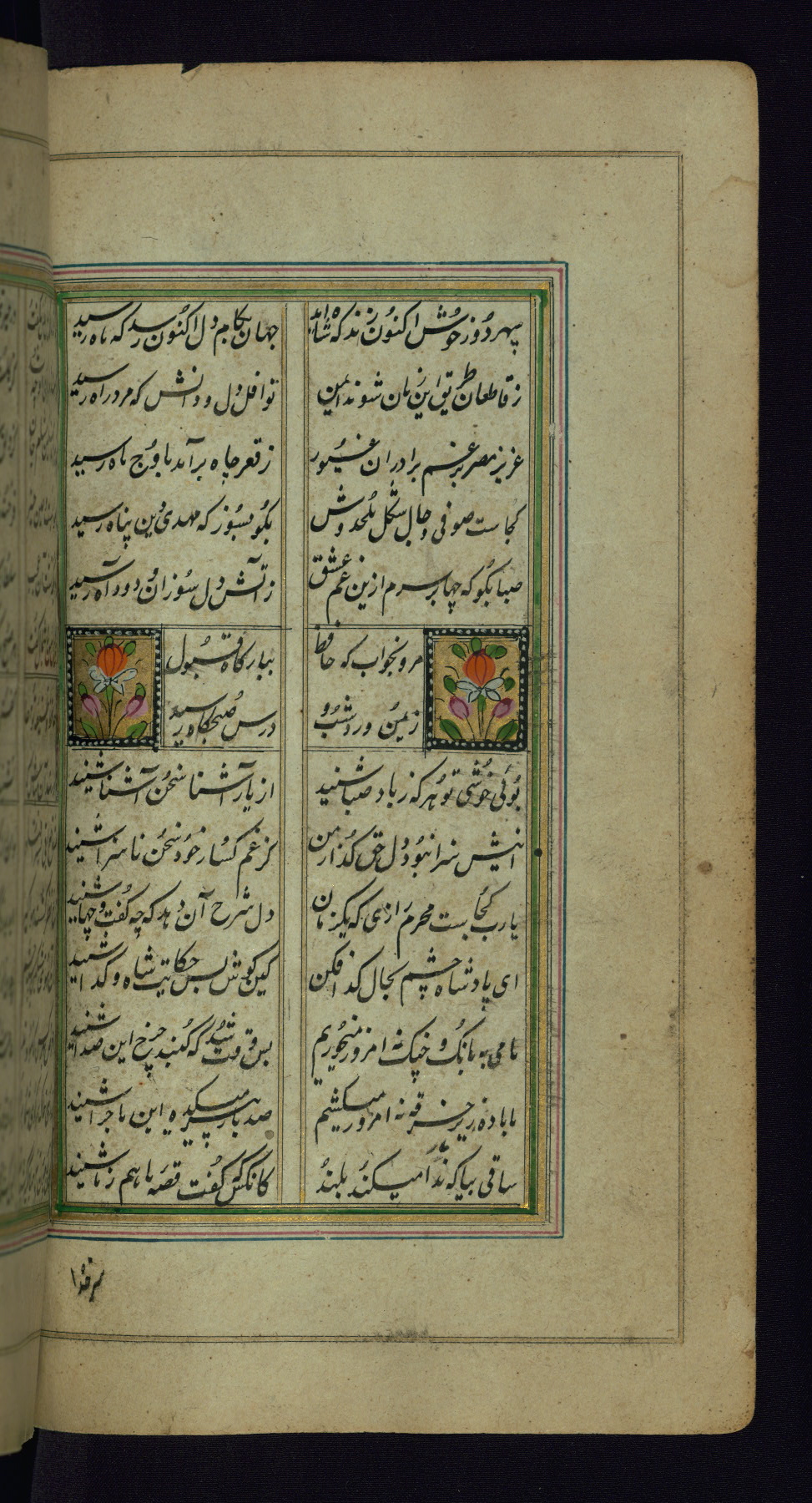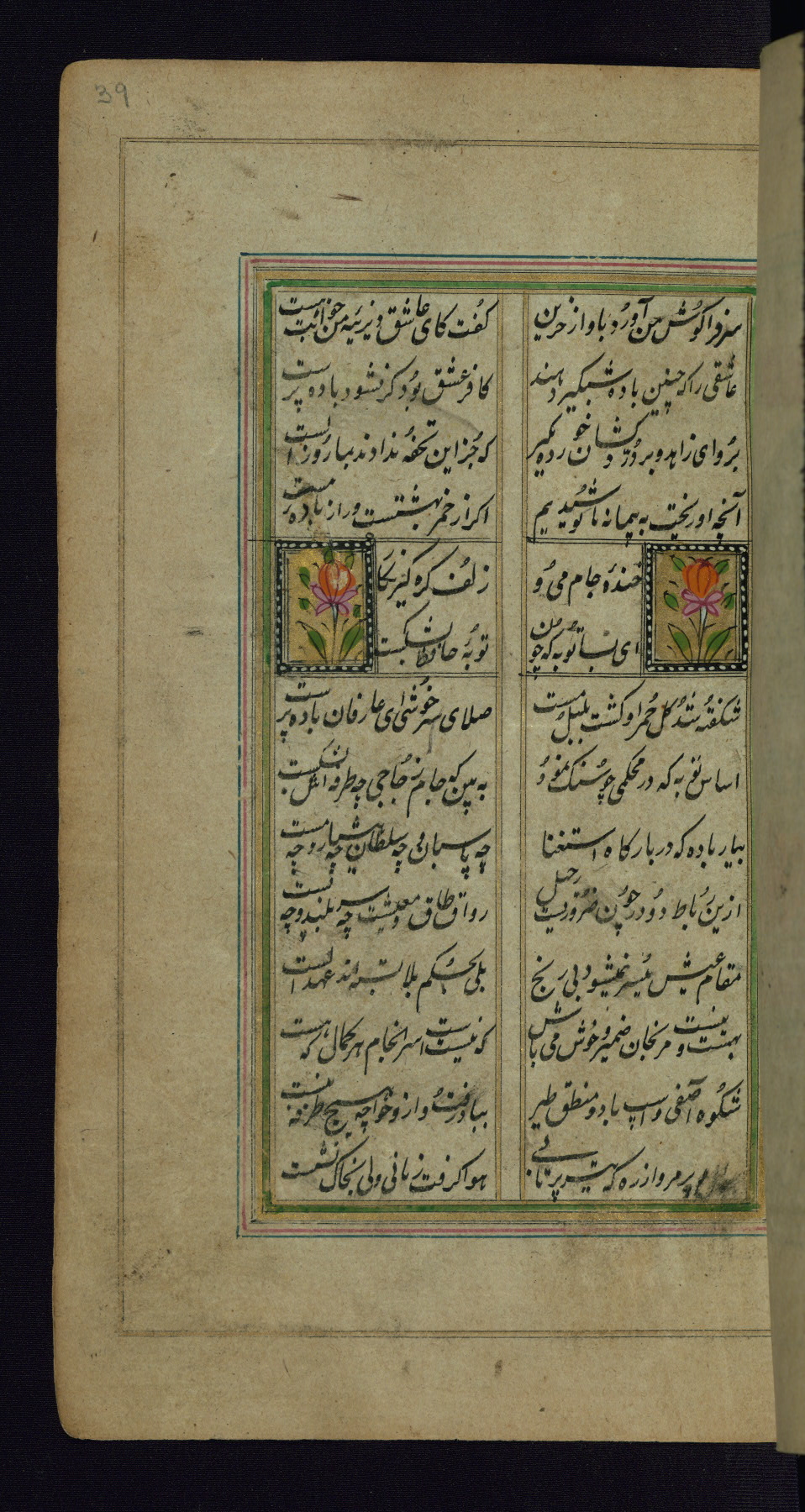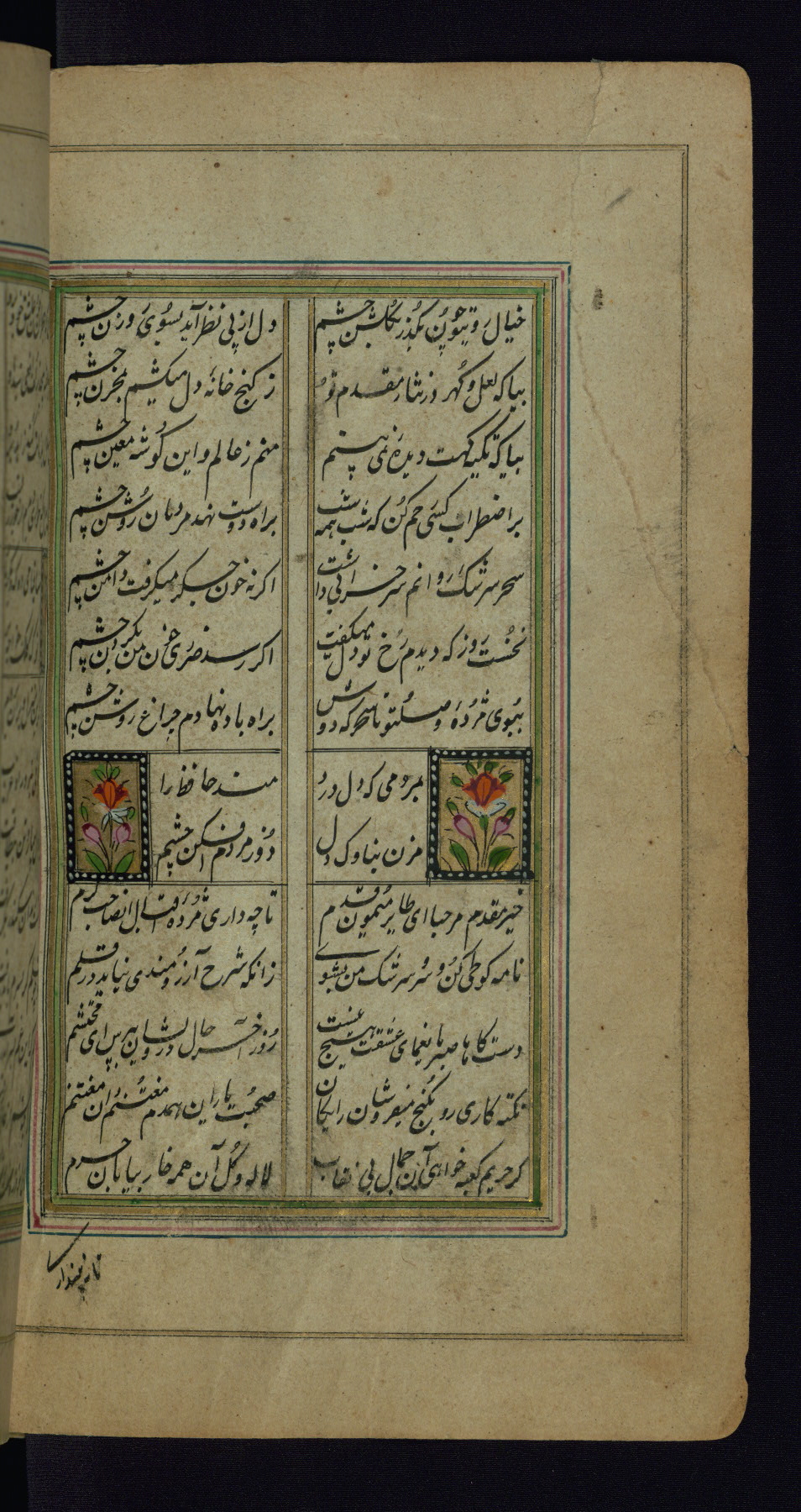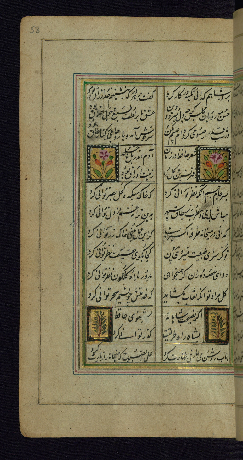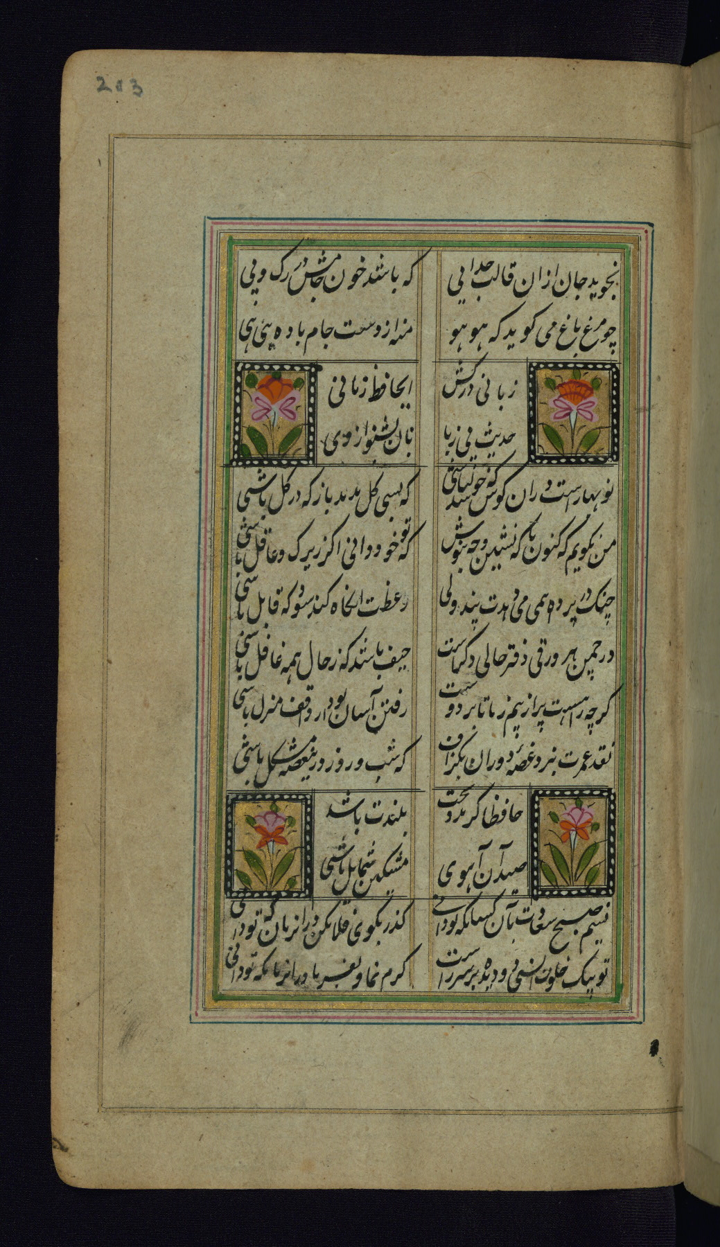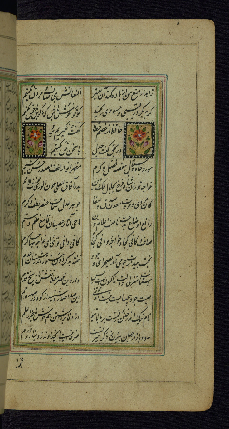 This is an illuminated and illustrated Collection of poems (dīvān) by Shams al-Dīn Muḥammad Ḥāfiz al-Shīrāzī (fl. eighth century AH / fourteenth CE), which was produced in India. According to the colophon, the manuscript was completed on the 19th Rajab 1202[?] AH / 1788[?] CE. It opens with a double-page illuminated incipit (fols. 1b-2a) with headpiece that introduces the preface (dībāchah) (fols. 1b-4b), followed by another double-page illuminated incipit with headpiece opening the main text of the Dīvān (fols. 5b-6a). The codex is decorated throughout with square and rectangular panels, as well as horizontal bands with floral decoration marking the end of odes, quatrains, or series of verses. There are forty-nine illustrations. The brown leather binding with medallion and pendants is contemporary with the manuscript.