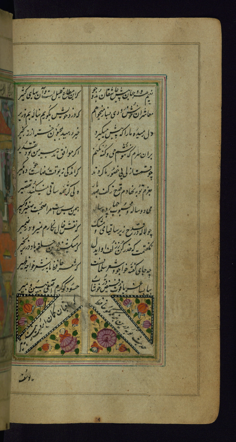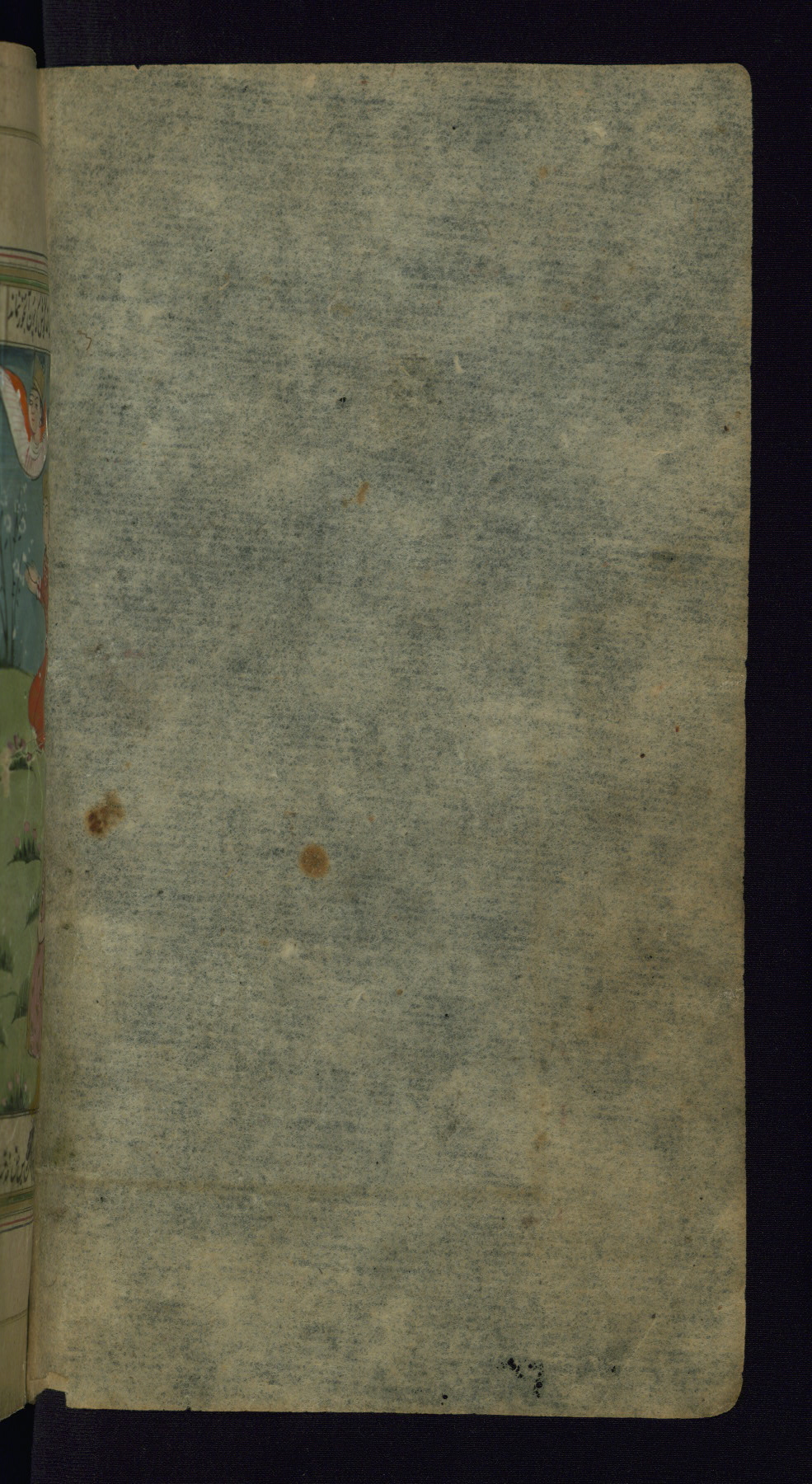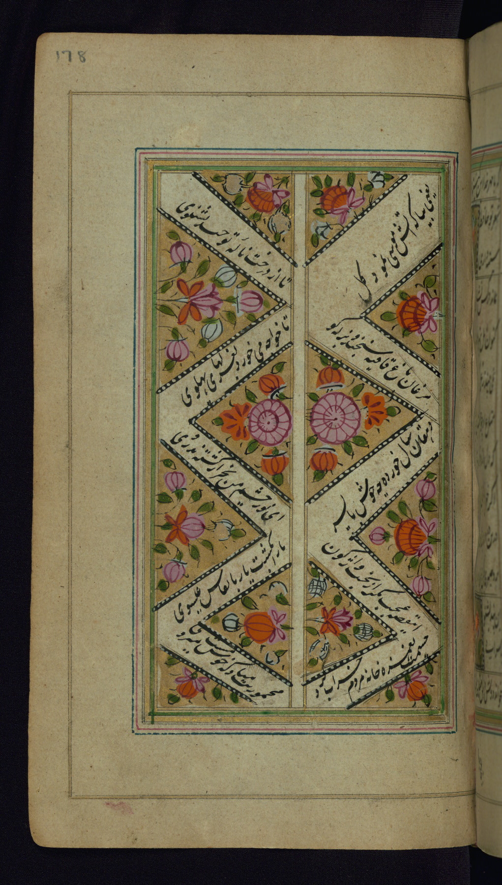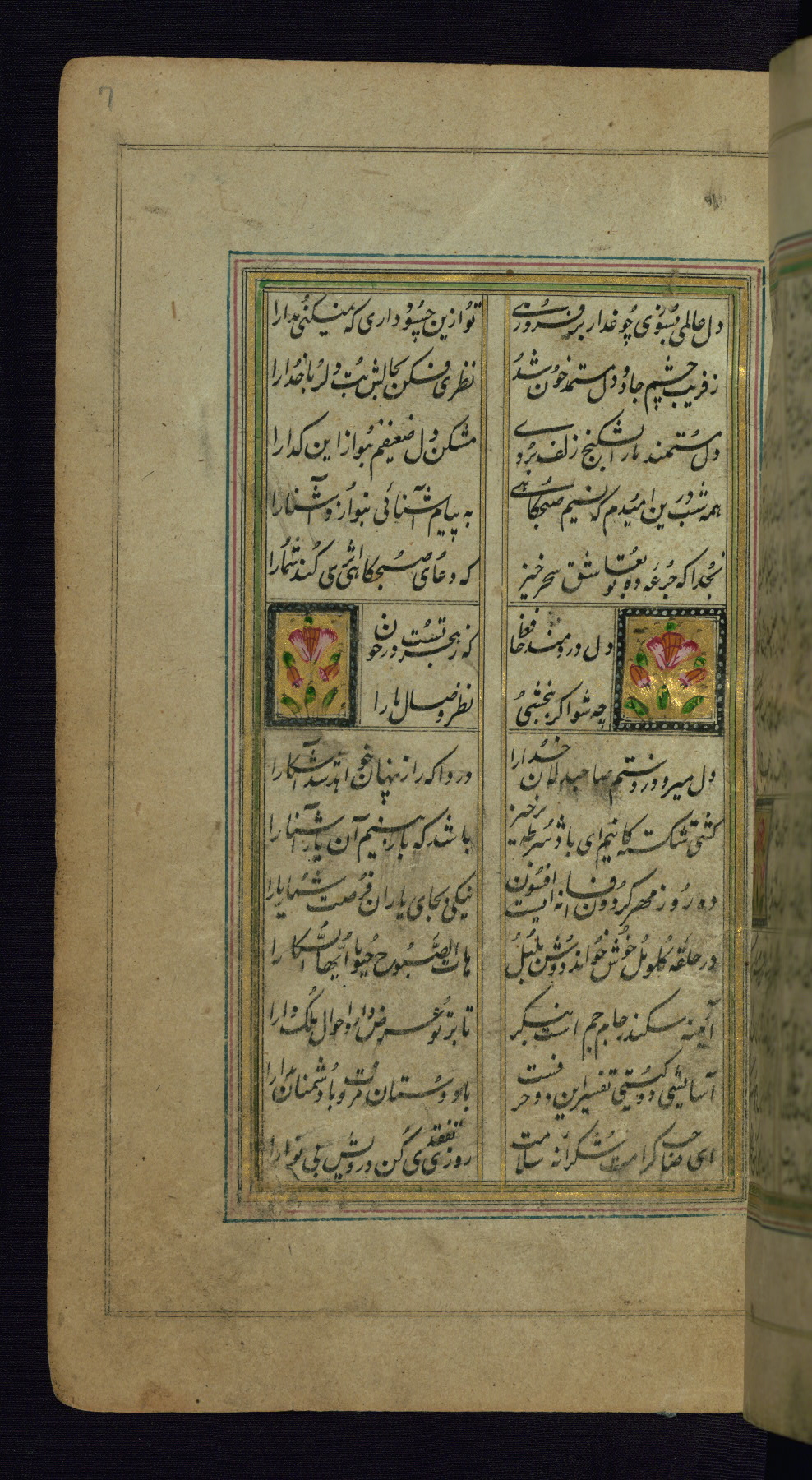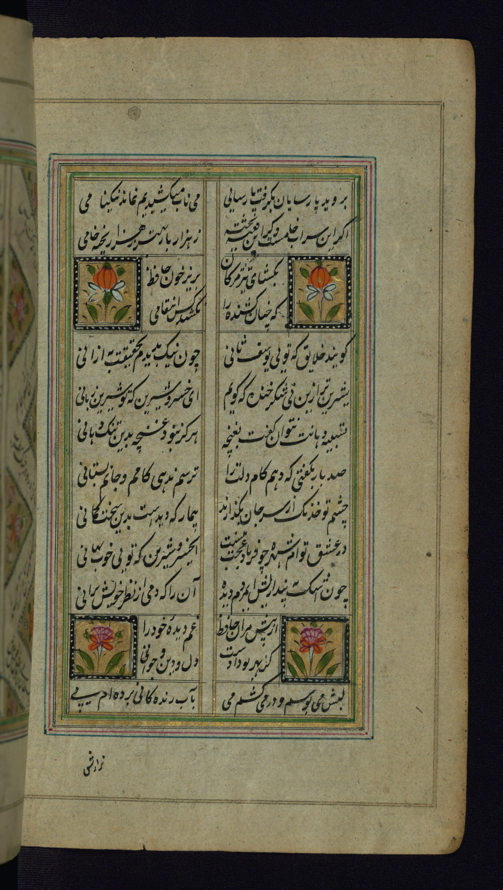 This is an illuminated and illustrated Collection of poems (dīvān) by Shams al-Dīn Muḥammad Ḥāfiz al-Shīrāzī (fl. eighth century AH / fourteenth CE), which was produced in India. According to the colophon, the manuscript was completed on the 19th Rajab 1202[?] AH / 1788[?] CE. It opens with a double-page illuminated incipit (fols. 1b-2a) with headpiece that introduces the preface (dībāchah) (fols. 1b-4b), followed by another double-page illuminated incipit with headpiece opening the main text of the Dīvān (fols. 5b-6a). The codex is decorated throughout with square and rectangular panels, as well as horizontal bands with floral decoration marking the end of odes, quatrains, or series of verses. There are forty-nine illustrations. The brown leather binding with medallion and pendants is contemporary with the manuscript.