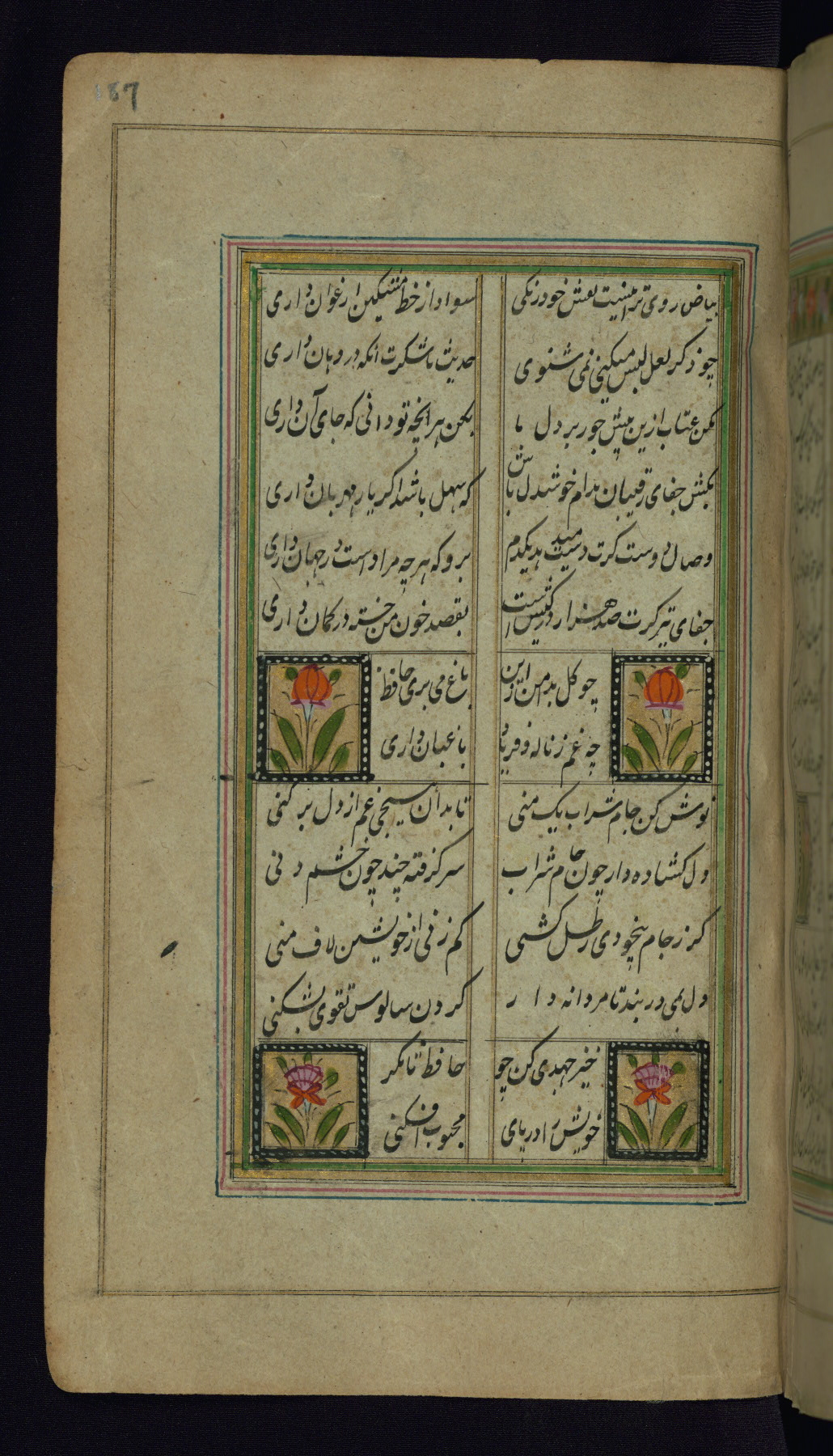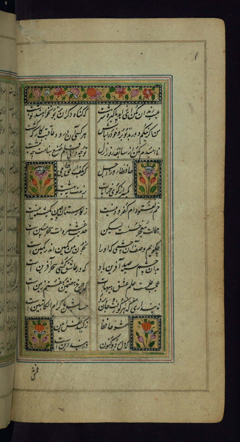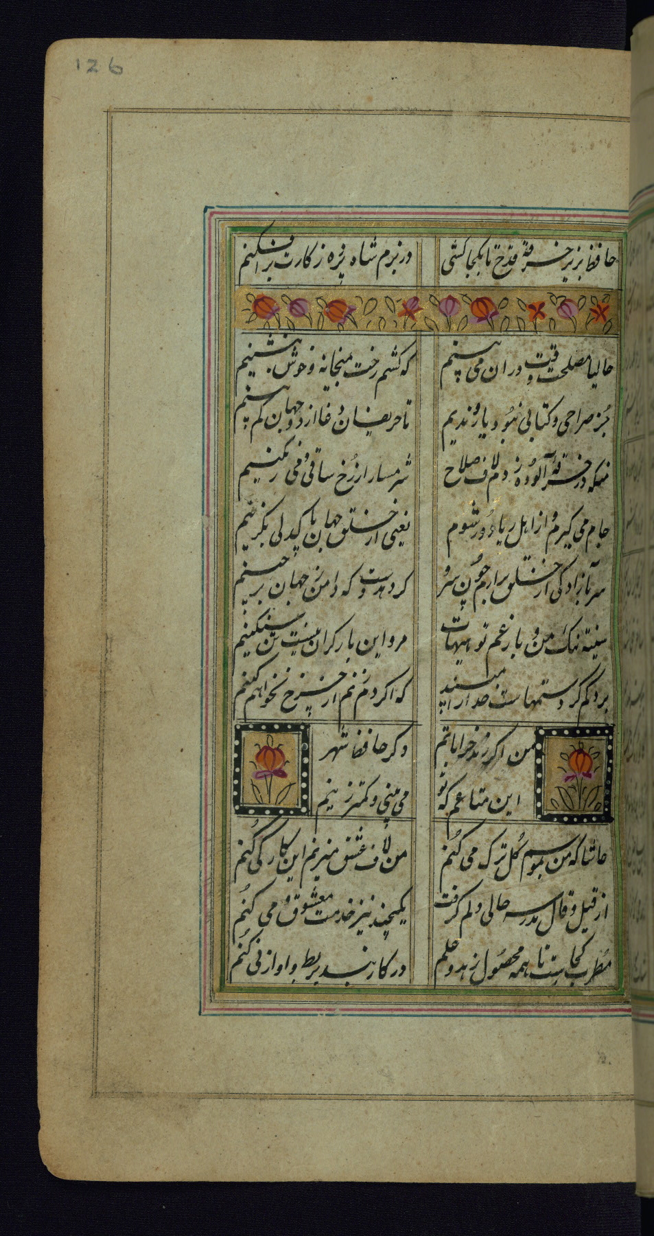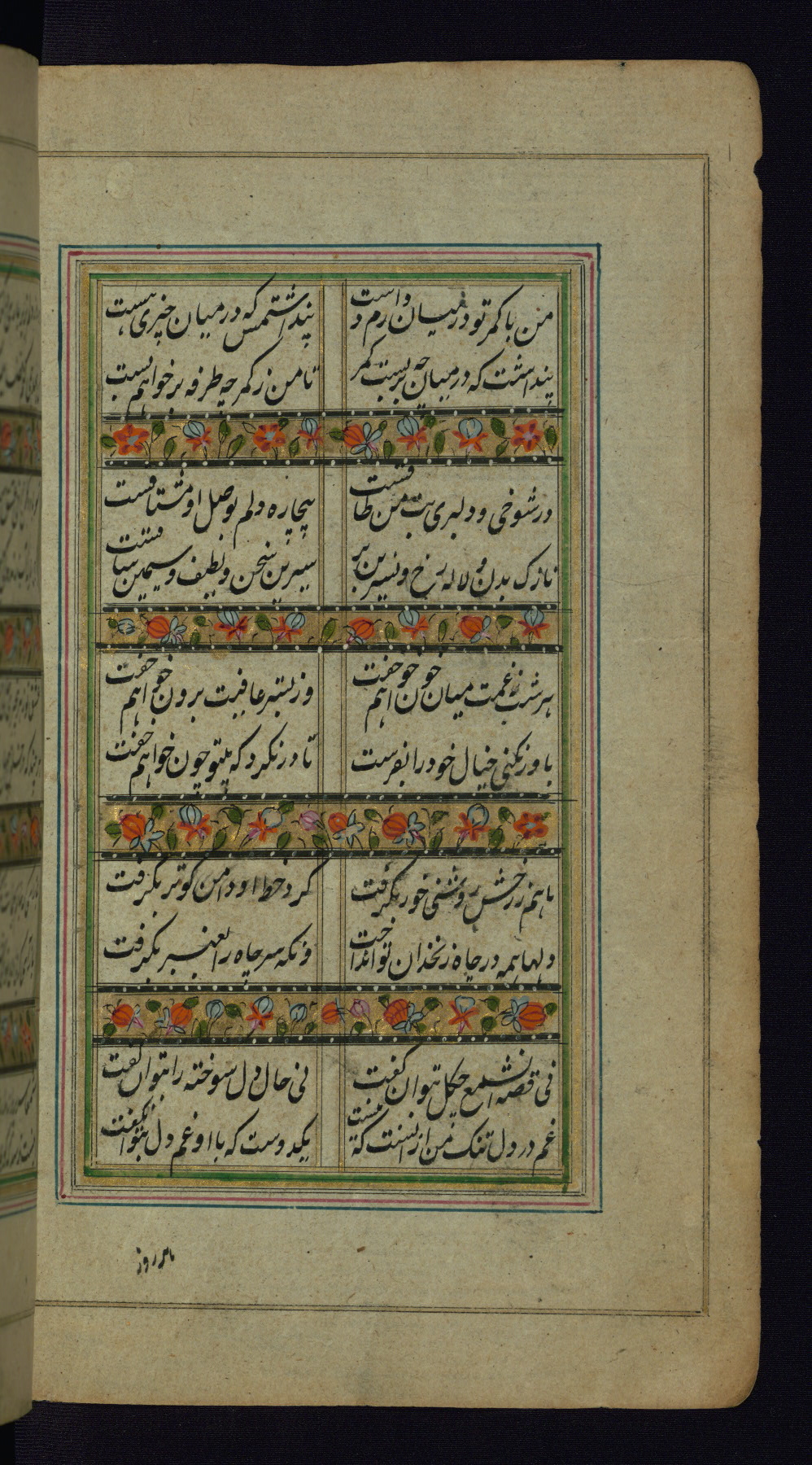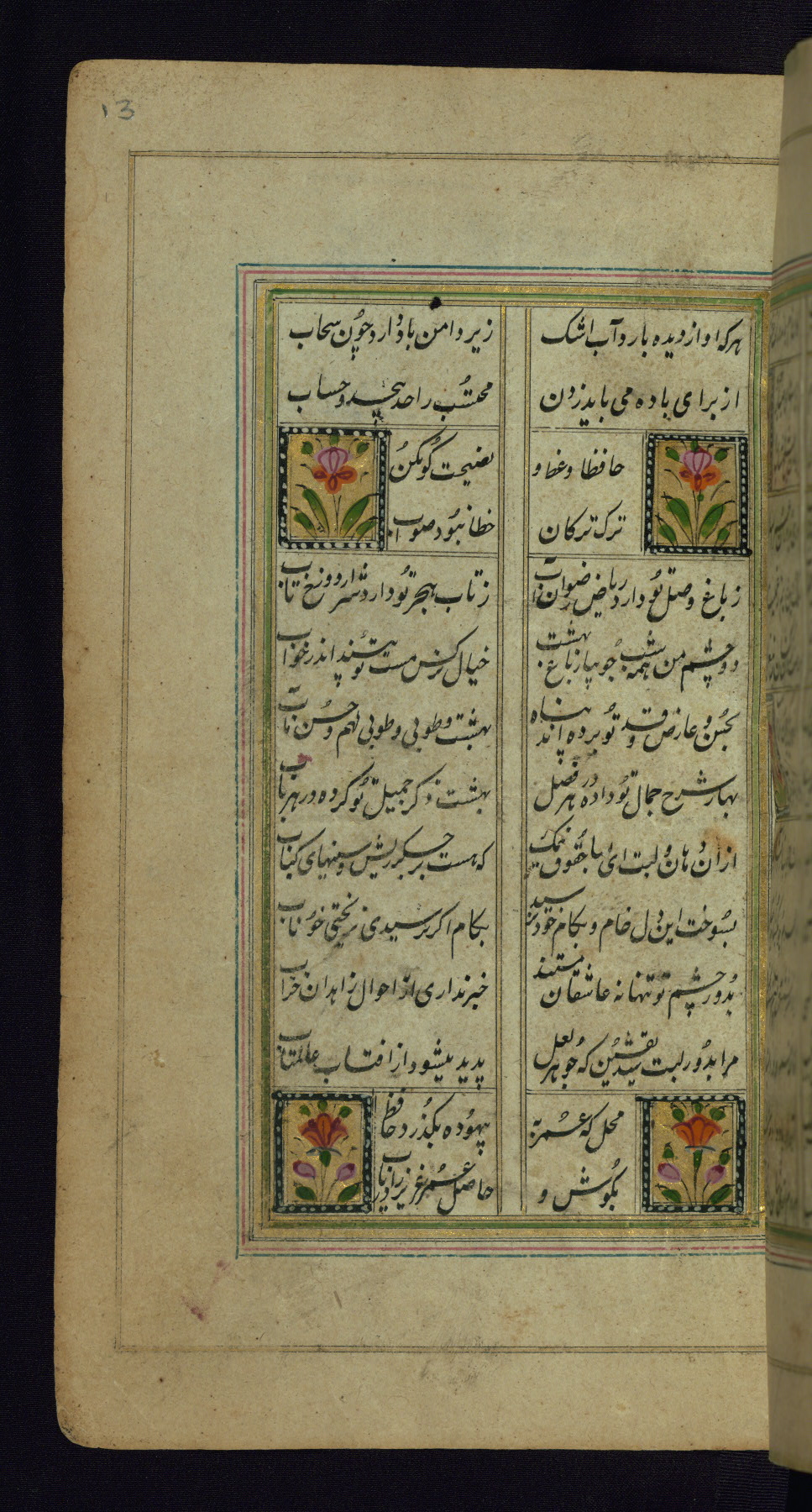This is an illuminated and illustrated Collection of poems (dīvān) by Shams al-Dīn Muḥammad Ḥāfiz al-Shīrāzī (fl. eighth century AH / fourteenth CE), which was produced in India. According to the colophon, the manuscript was completed on the 19th Rajab 1202[?] AH / 1788[?] CE. It opens with a double-page illuminated incipit (fols. 1b-2a) with headpiece that introduces the preface (dībāchah) (fols. 1b-4b), followed by another double-page illuminated incipit with headpiece opening the main text of the Dīvān (fols. 5b-6a). The codex is decorated throughout with square and rectangular panels, as well as horizontal bands with floral decoration marking the end of odes, quatrains, or series of verses. There are forty-nine illustrations. The brown leather binding with medallion and pendants is contemporary with the manuscript.