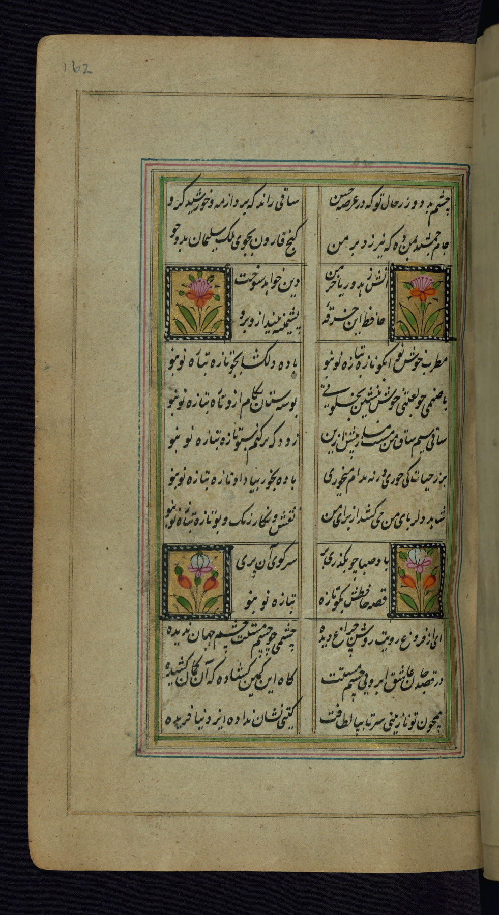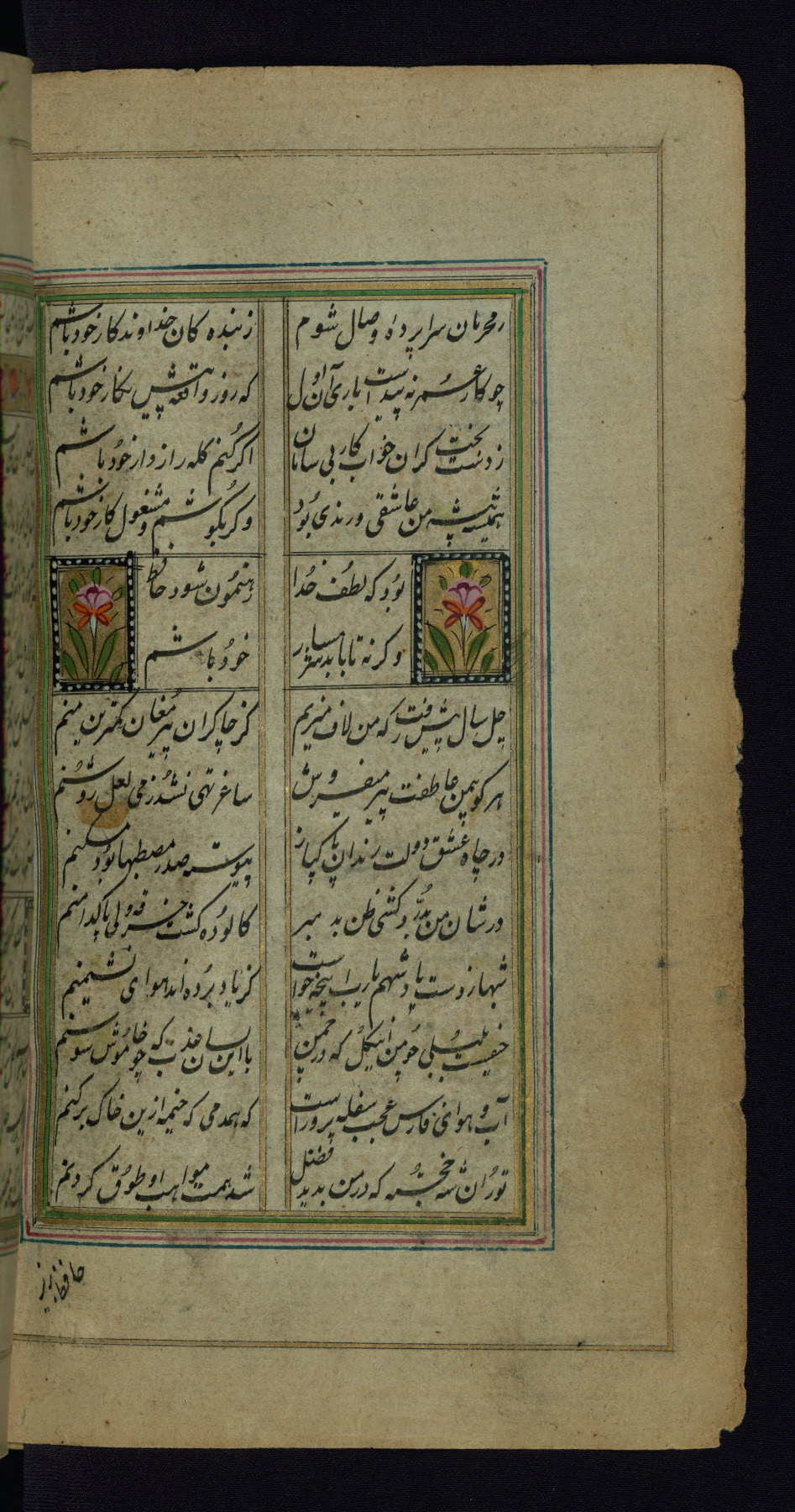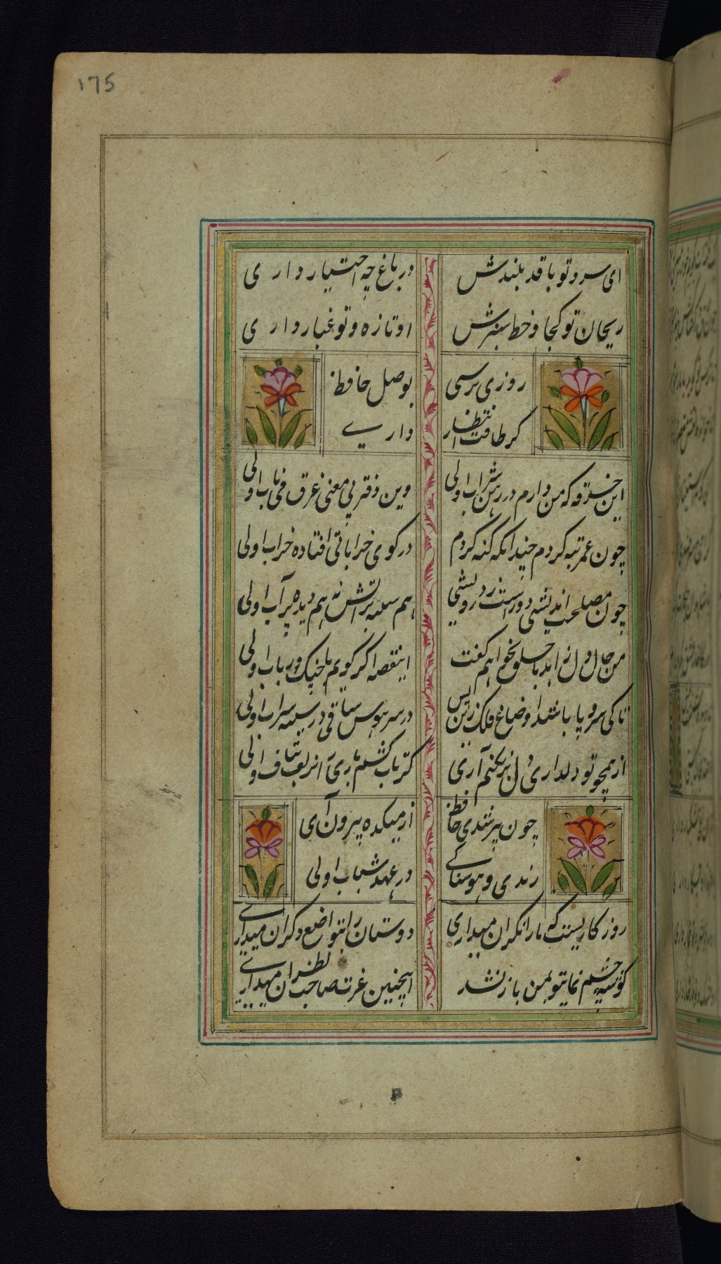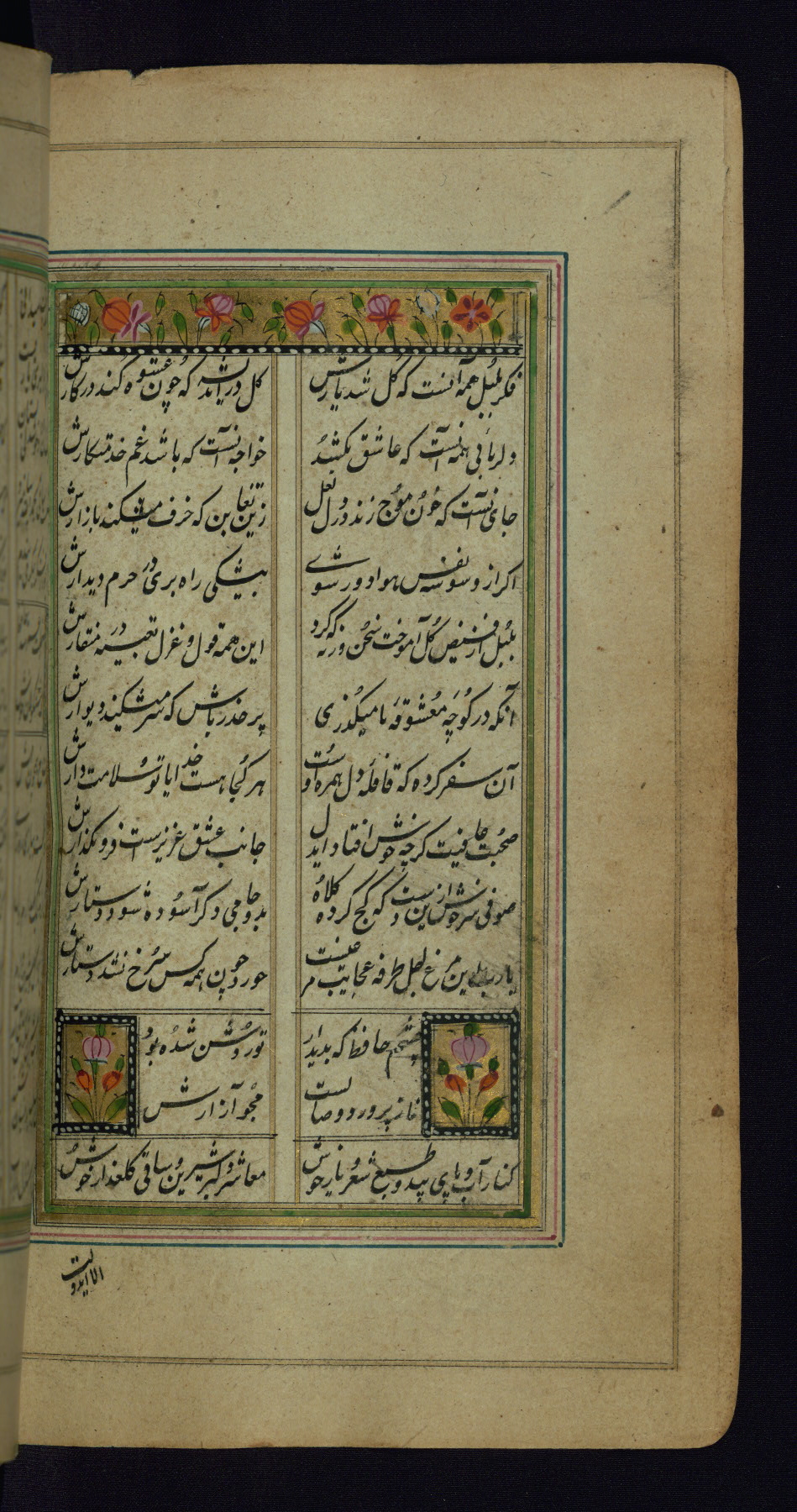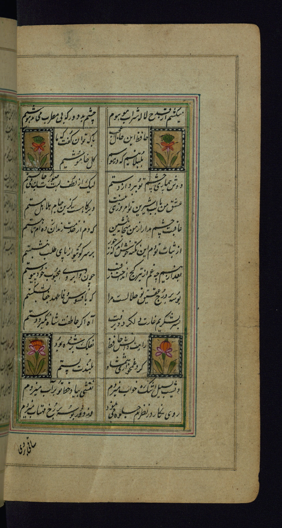 This is an illuminated and illustrated Collection of poems (dīvān) by Shams al-Dīn Muḥammad Ḥāfiz al-Shīrāzī (fl. eighth century AH / fourteenth CE), which was produced in India. According to the colophon, the manuscript was completed on the 19th Rajab 1202[?] AH / 1788[?] CE. It opens with a double-page illuminated incipit (fols. 1b-2a) with headpiece that introduces the preface (dībāchah) (fols. 1b-4b), followed by another double-page illuminated incipit with headpiece opening the main text of the Dīvān (fols. 5b-6a). The codex is decorated throughout with square and rectangular panels, as well as horizontal bands with floral decoration marking the end of odes, quatrains, or series of verses. There are forty-nine illustrations. The brown leather binding with medallion and pendants is contemporary with the manuscript.