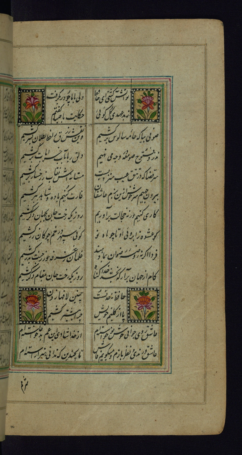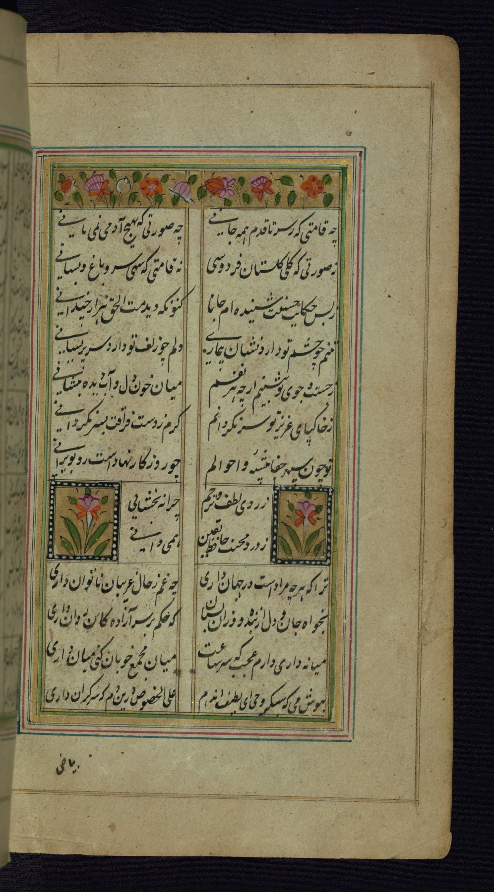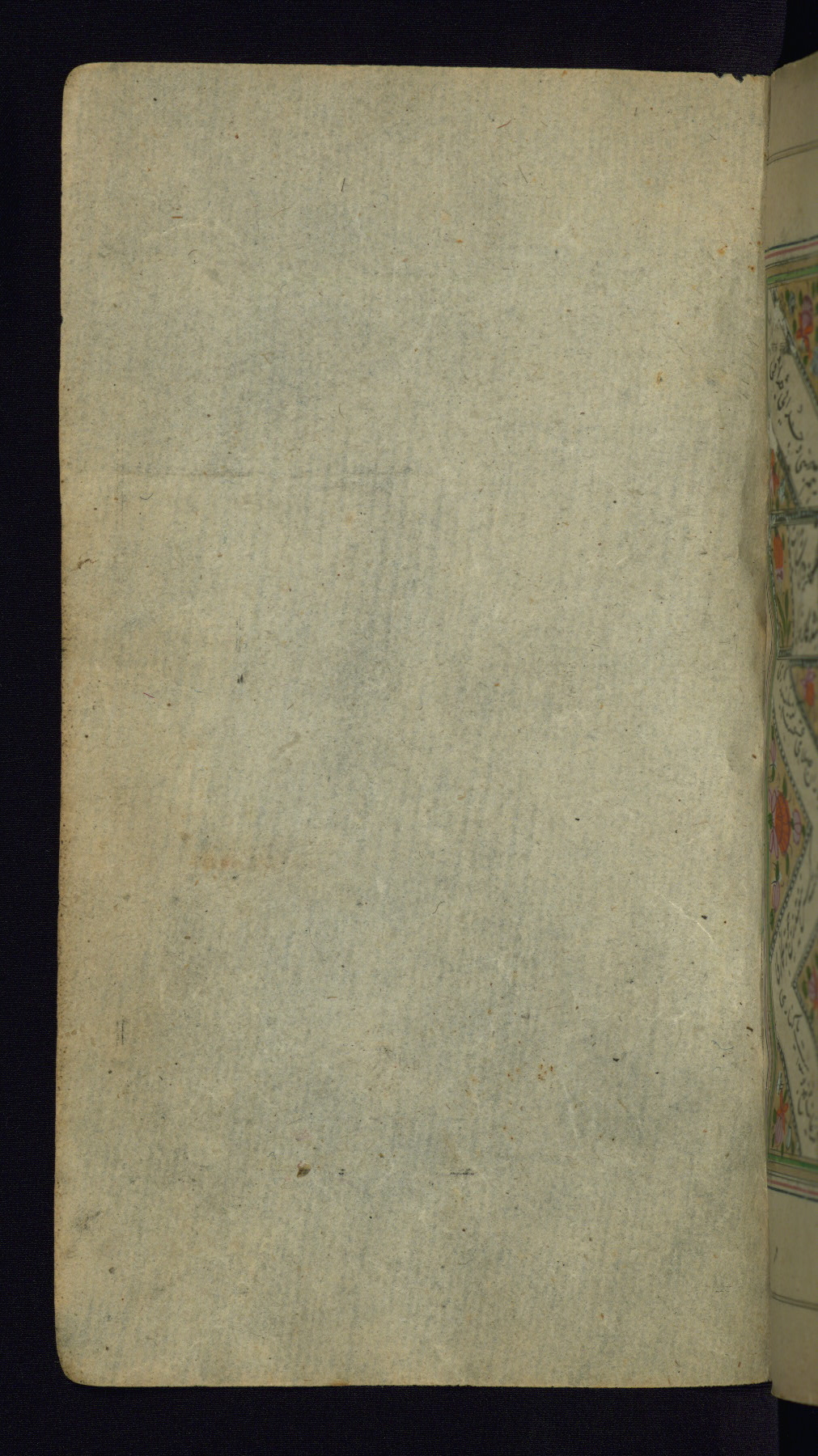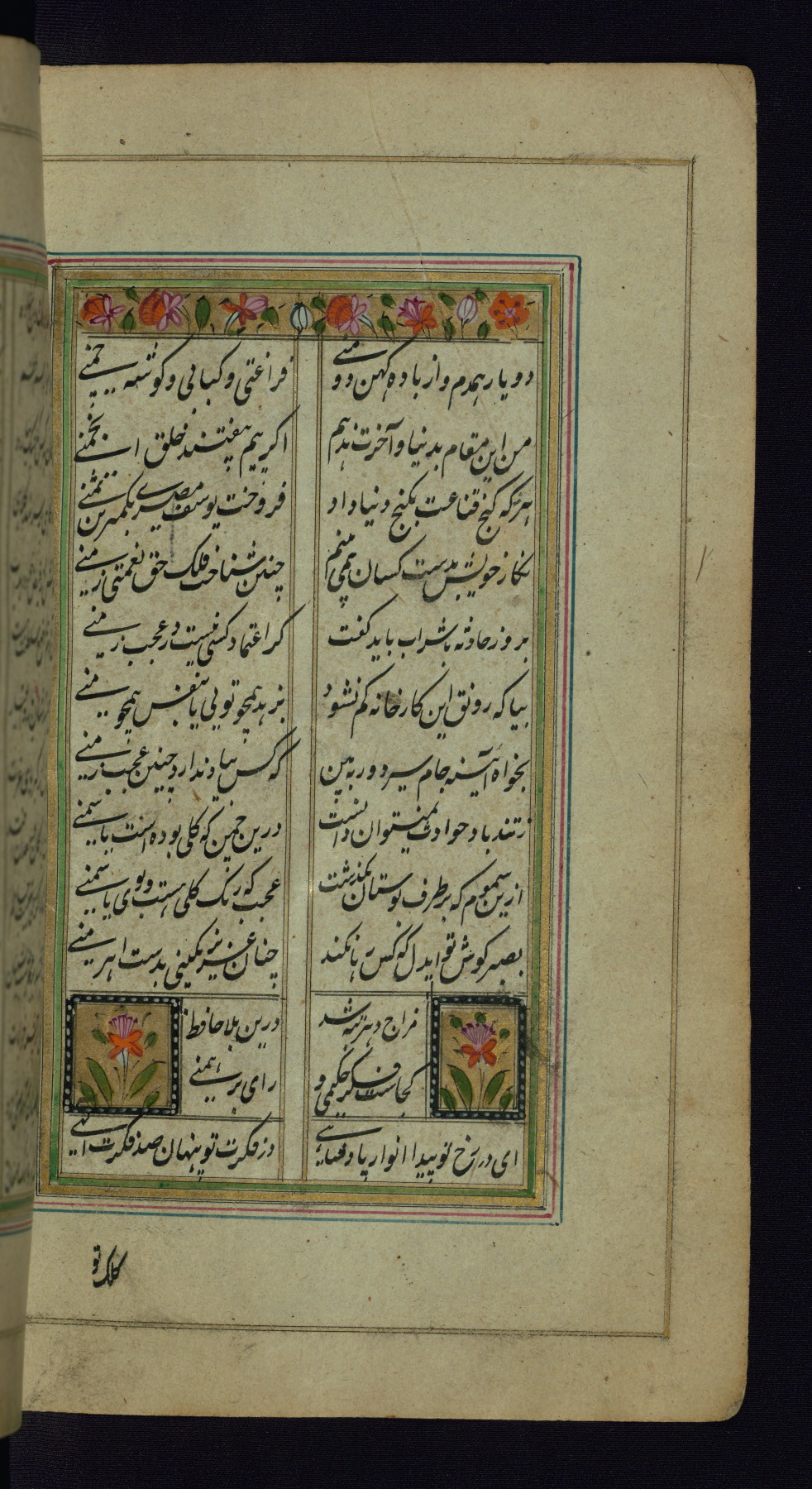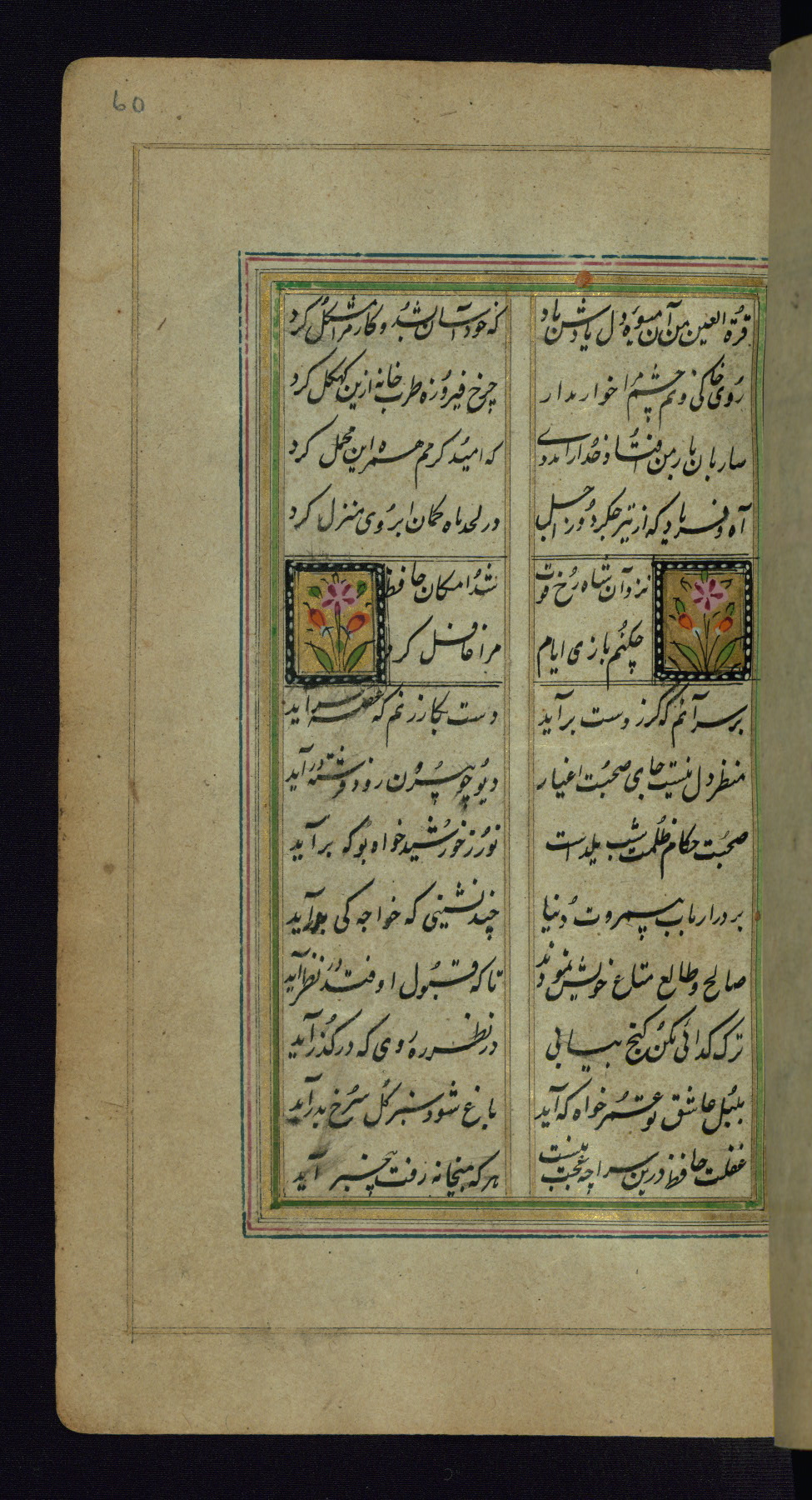 This is an illuminated and illustrated Collection of poems (dīvān) by Shams al-Dīn Muḥammad Ḥāfiz al-Shīrāzī (fl. eighth century AH / fourteenth CE), which was produced in India. According to the colophon, the manuscript was completed on the 19th Rajab 1202[?] AH / 1788[?] CE. It opens with a double-page illuminated incipit (fols. 1b-2a) with headpiece that introduces the preface (dībāchah) (fols. 1b-4b), followed by another double-page illuminated incipit with headpiece opening the main text of the Dīvān (fols. 5b-6a). The codex is decorated throughout with square and rectangular panels, as well as horizontal bands with floral decoration marking the end of odes, quatrains, or series of verses. There are forty-nine illustrations. The brown leather binding with medallion and pendants is contemporary with the manuscript.