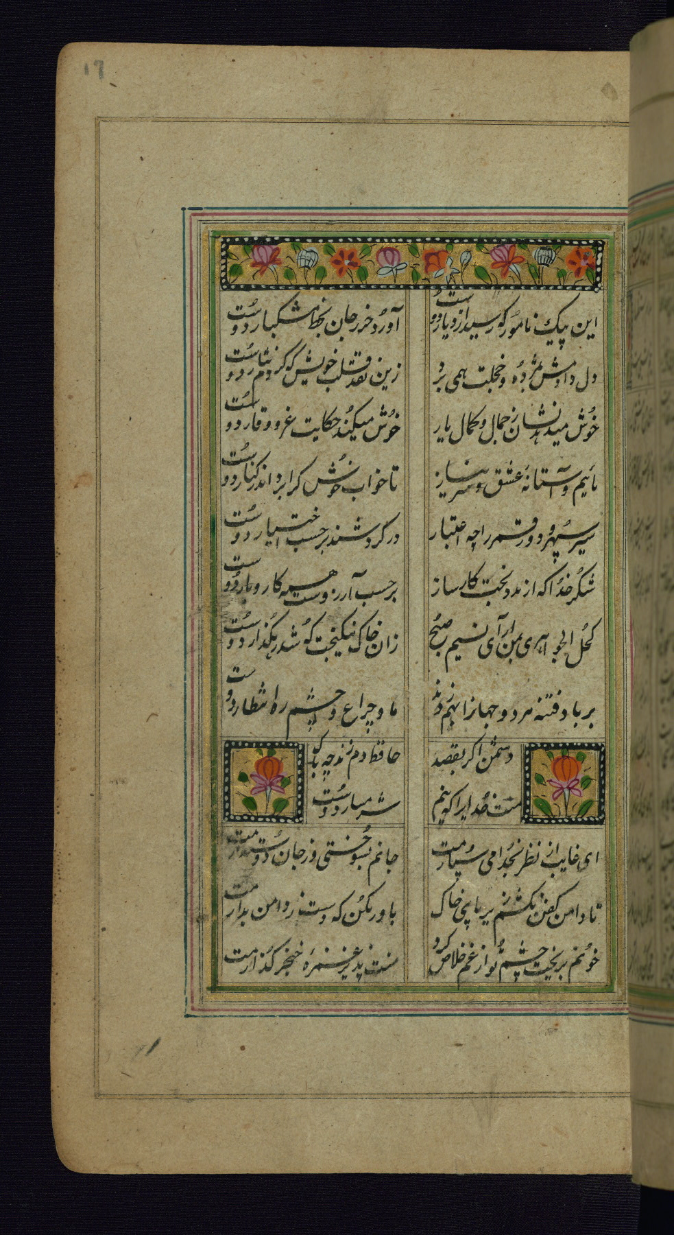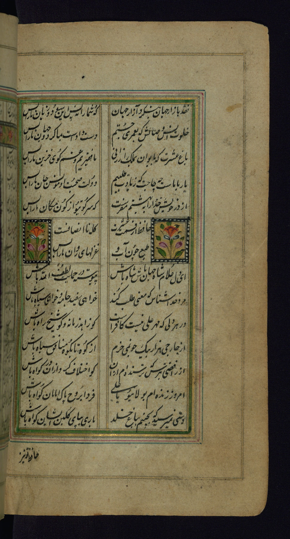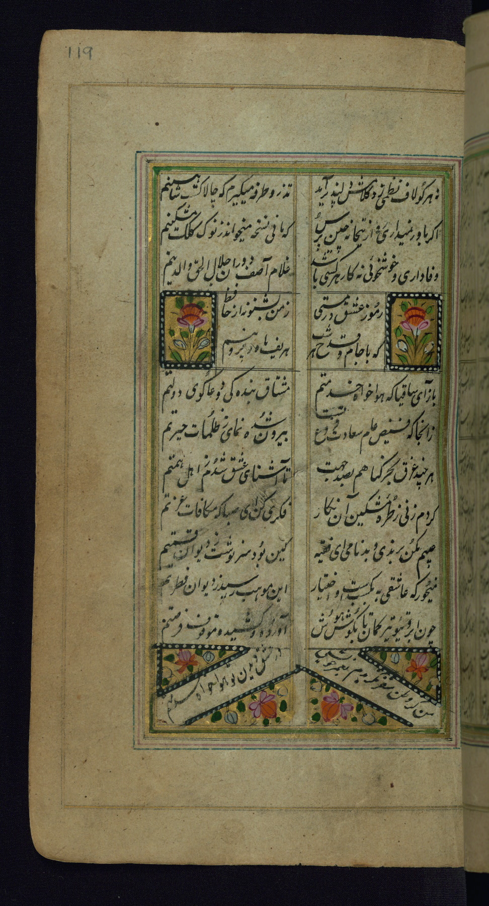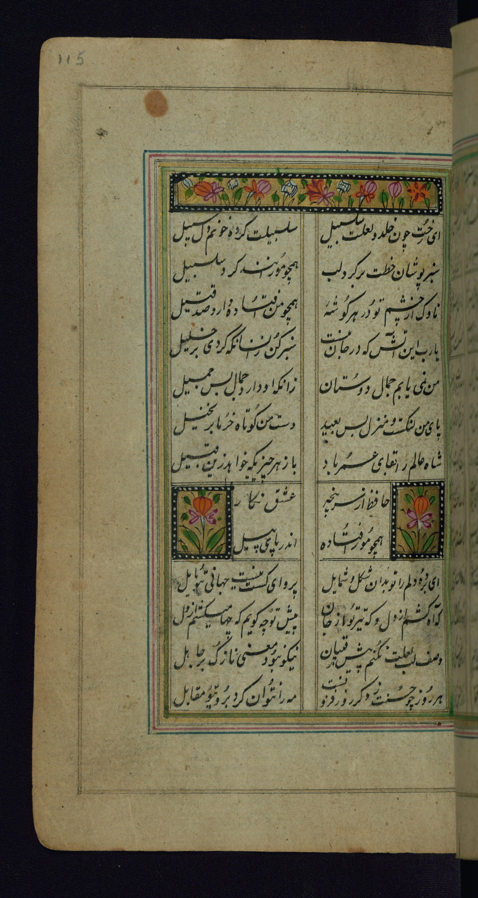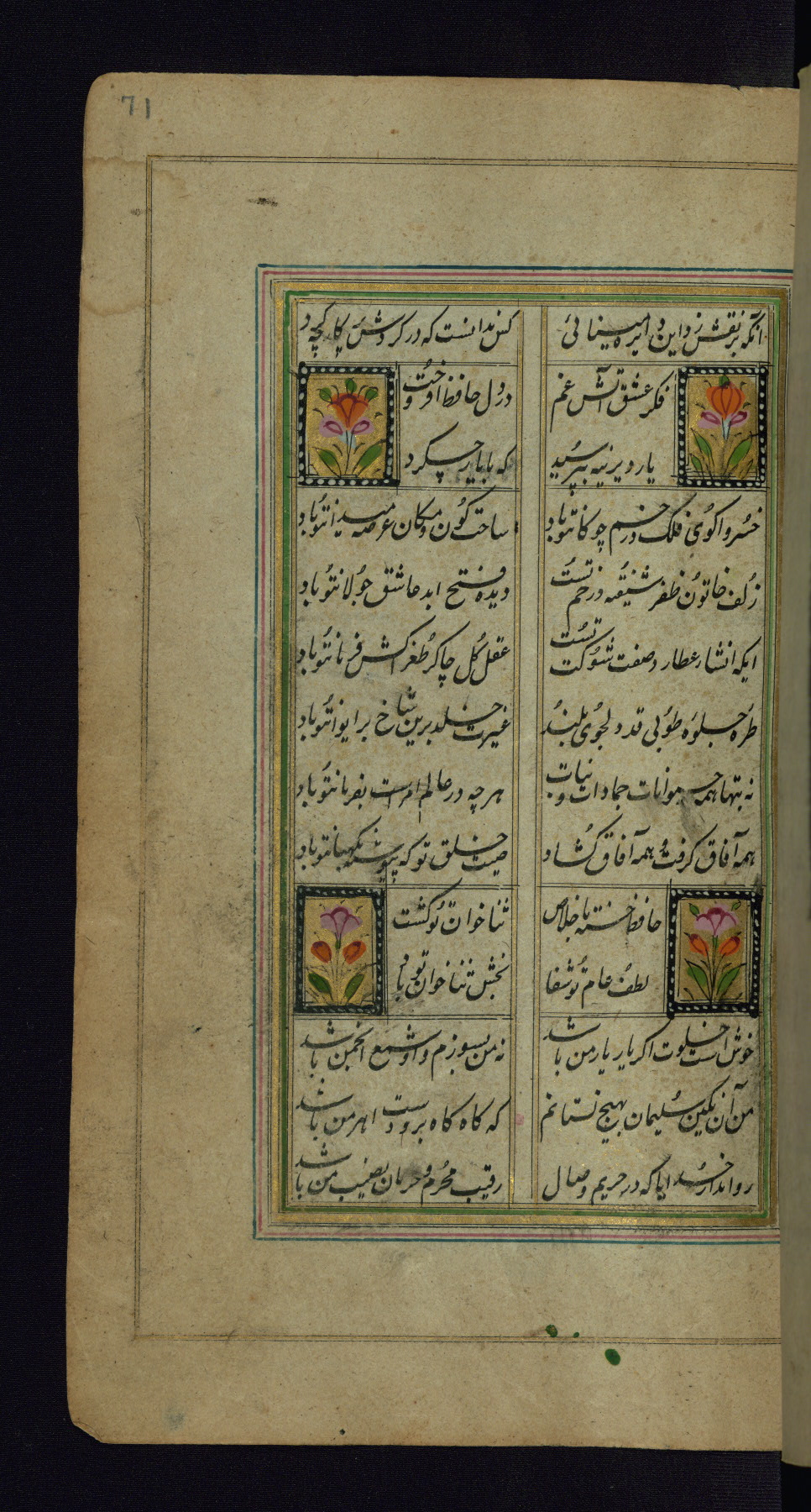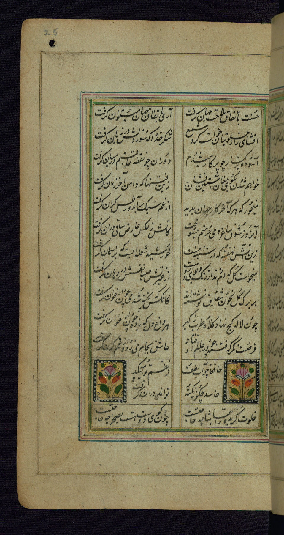 This is an illuminated and illustrated Collection of poems (dīvān) by Shams al-Dīn Muḥammad Ḥāfiz al-Shīrāzī (fl. eighth century AH / fourteenth CE), which was produced in India. According to the colophon, the manuscript was completed on the 19th Rajab 1202[?] AH / 1788[?] CE. It opens with a double-page illuminated incipit (fols. 1b-2a) with headpiece that introduces the preface (dībāchah) (fols. 1b-4b), followed by another double-page illuminated incipit with headpiece opening the main text of the Dīvān (fols. 5b-6a). The codex is decorated throughout with square and rectangular panels, as well as horizontal bands with floral decoration marking the end of odes, quatrains, or series of verses. There are forty-nine illustrations. The brown leather binding with medallion and pendants is contemporary with the manuscript.