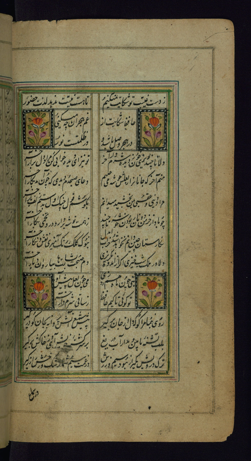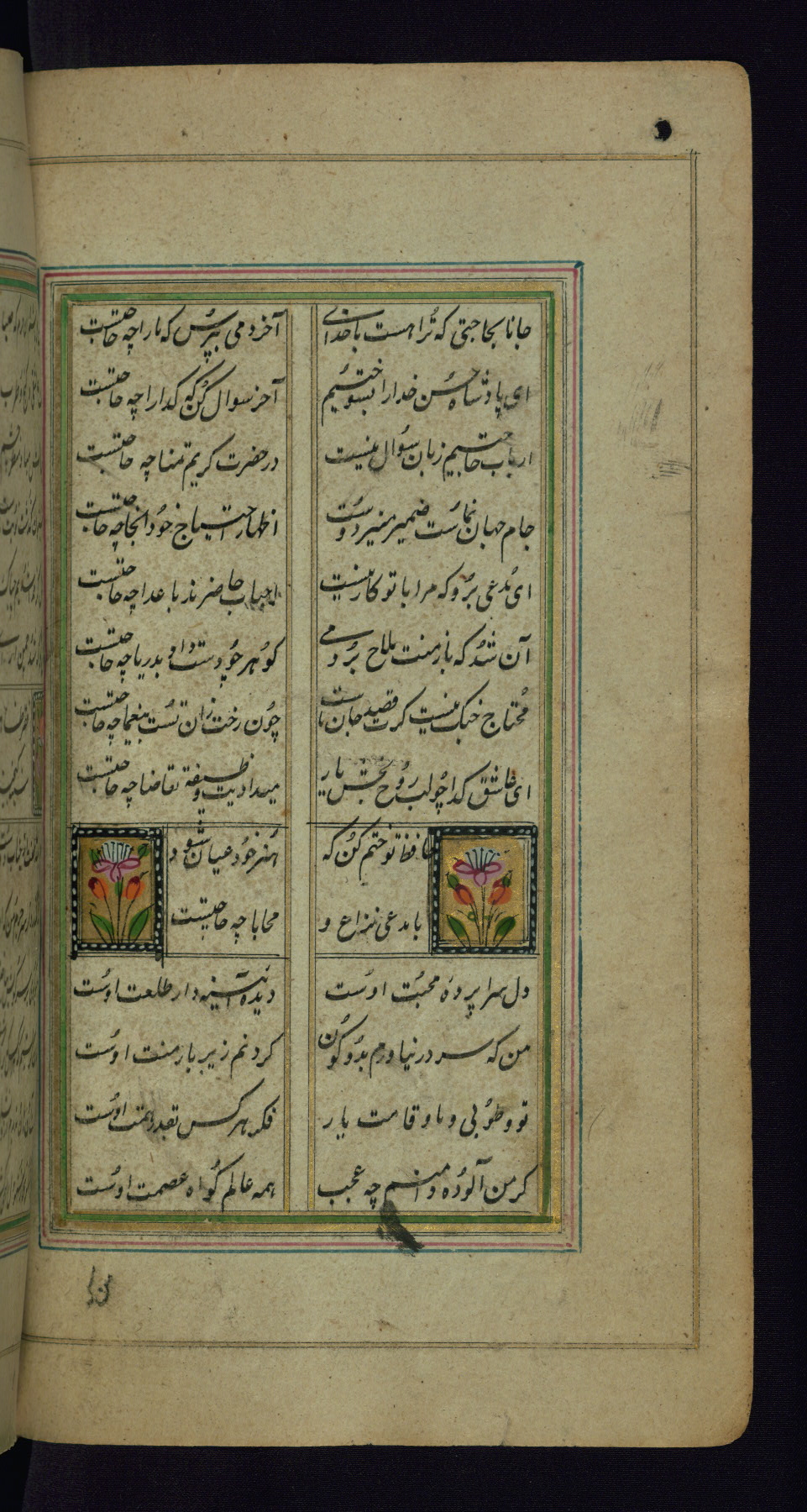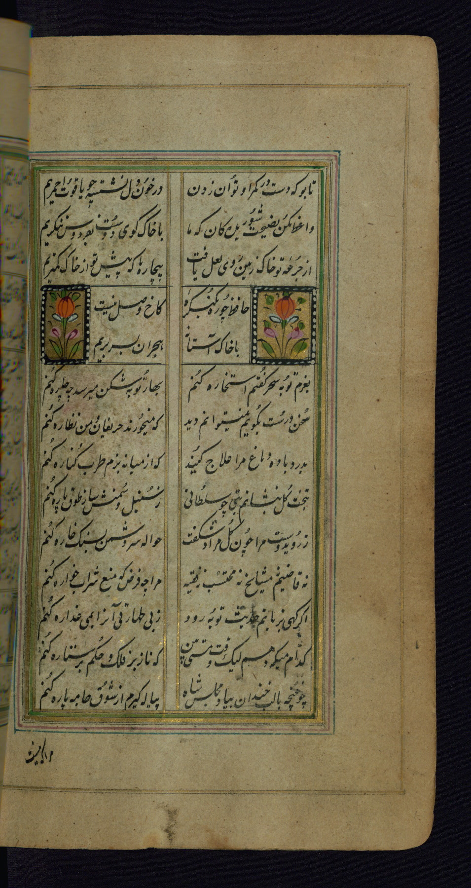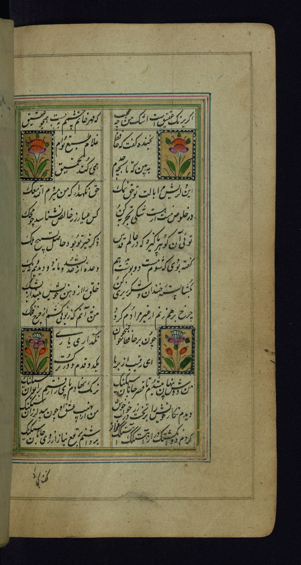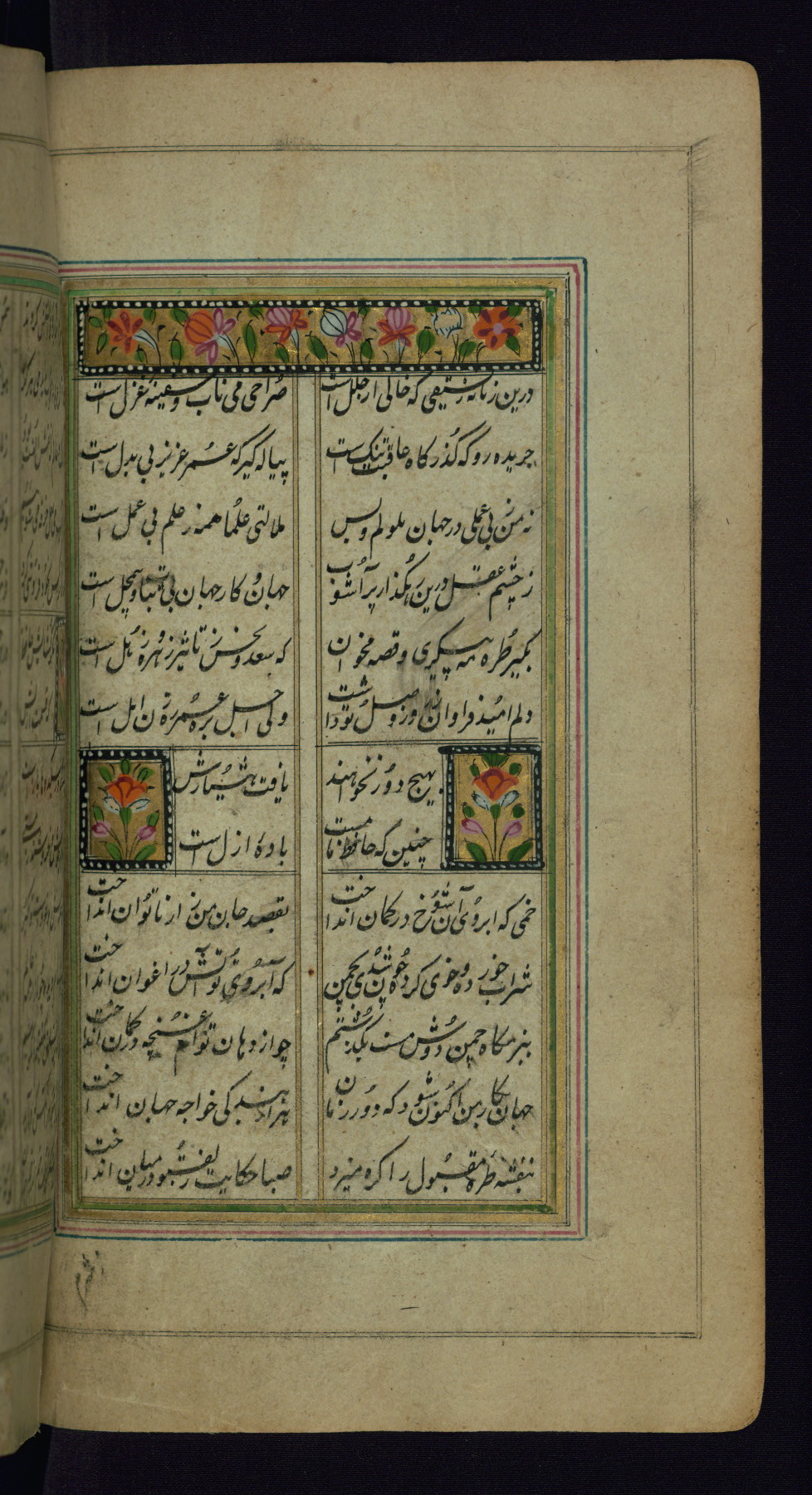 This is an illuminated and illustrated Collection of poems (dīvān) by Shams al-Dīn Muḥammad Ḥāfiz al-Shīrāzī (fl. eighth century AH / fourteenth CE), which was produced in India. According to the colophon, the manuscript was completed on the 19th Rajab 1202[?] AH / 1788[?] CE. It opens with a double-page illuminated incipit (fols. 1b-2a) with headpiece that introduces the preface (dībāchah) (fols. 1b-4b), followed by another double-page illuminated incipit with headpiece opening the main text of the Dīvān (fols. 5b-6a). The codex is decorated throughout with square and rectangular panels, as well as horizontal bands with floral decoration marking the end of odes, quatrains, or series of verses. There are forty-nine illustrations. The brown leather binding with medallion and pendants is contemporary with the manuscript.