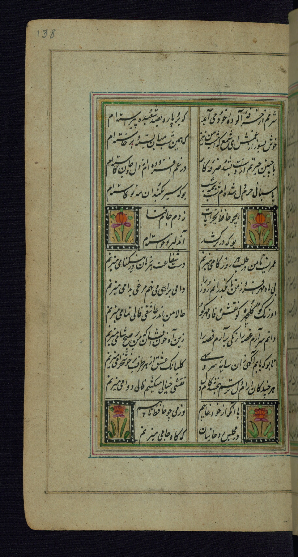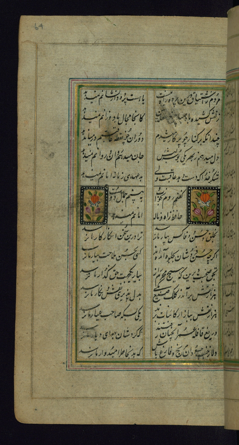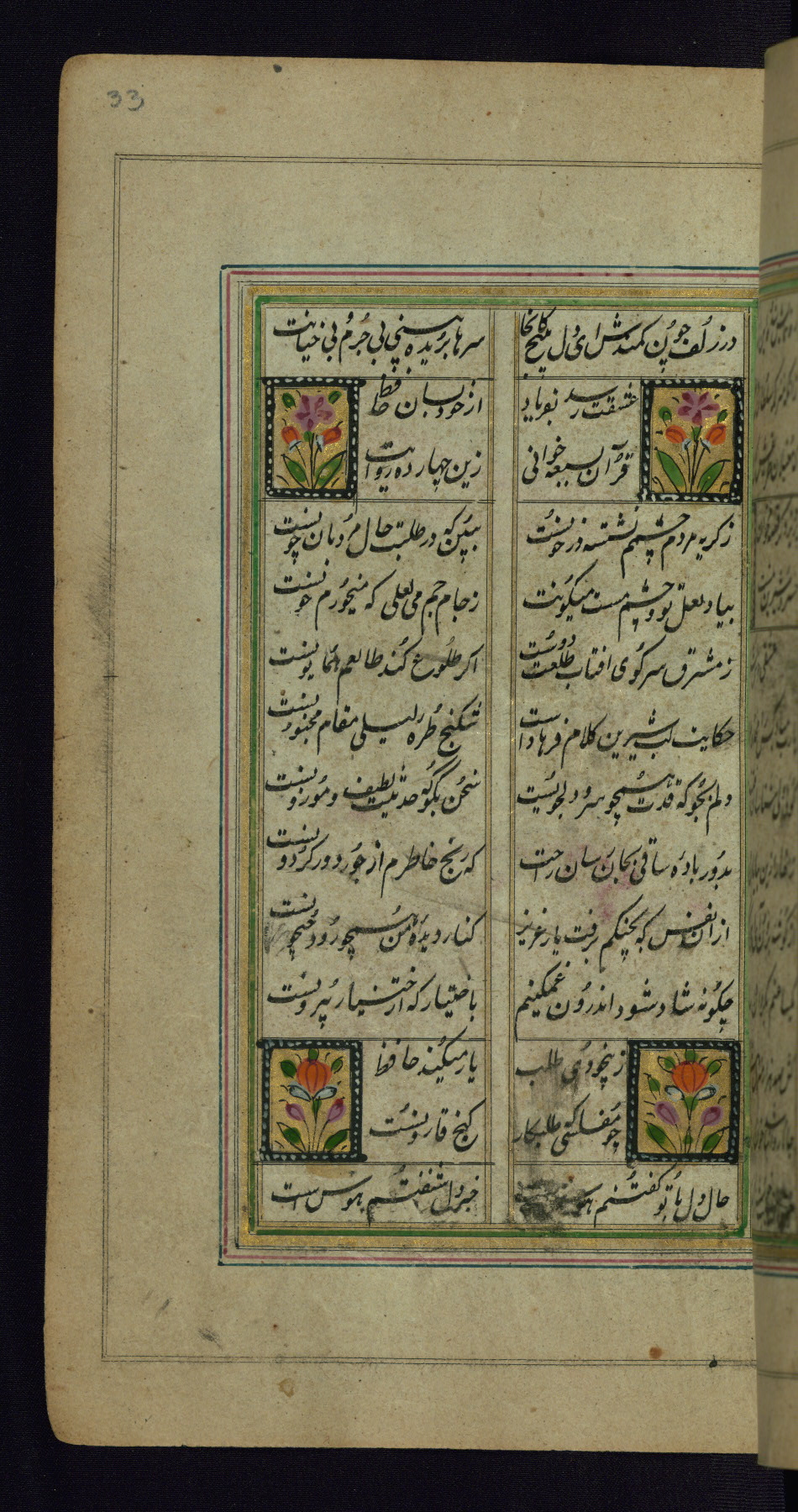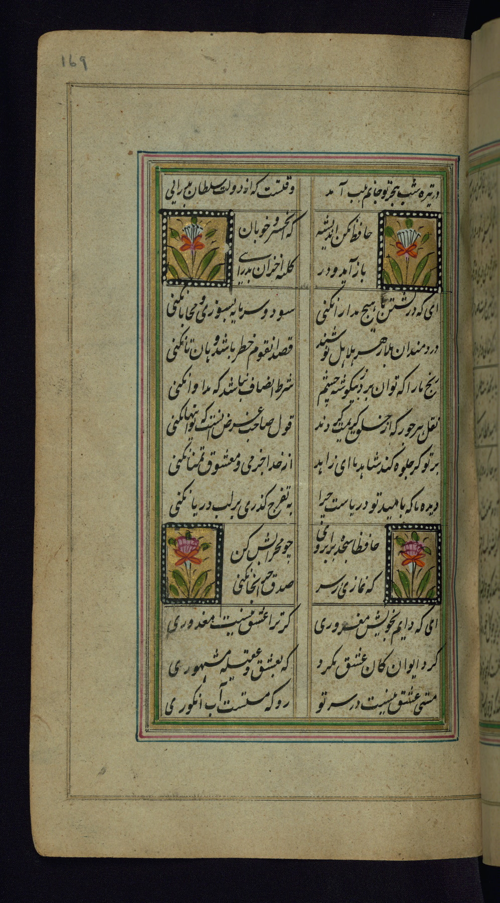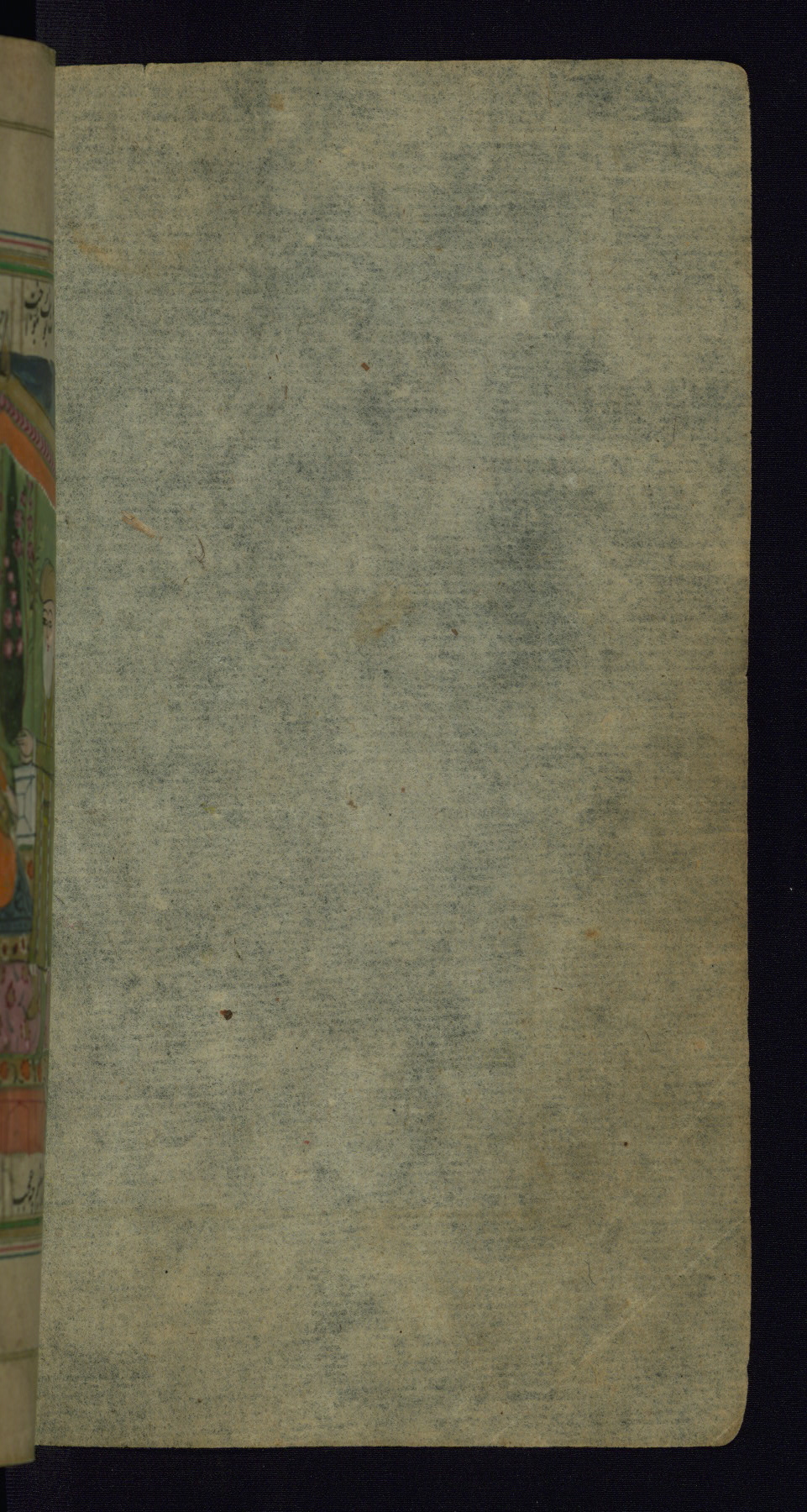 This is an illuminated and illustrated Collection of poems (dīvān) by Shams al-Dīn Muḥammad Ḥāfiz al-Shīrāzī (fl. eighth century AH / fourteenth CE), which was produced in India. According to the colophon, the manuscript was completed on the 19th Rajab 1202[?] AH / 1788[?] CE. It opens with a double-page illuminated incipit (fols. 1b-2a) with headpiece that introduces the preface (dībāchah) (fols. 1b-4b), followed by another double-page illuminated incipit with headpiece opening the main text of the Dīvān (fols. 5b-6a). The codex is decorated throughout with square and rectangular panels, as well as horizontal bands with floral decoration marking the end of odes, quatrains, or series of verses. There are forty-nine illustrations. The brown leather binding with medallion and pendants is contemporary with the manuscript.