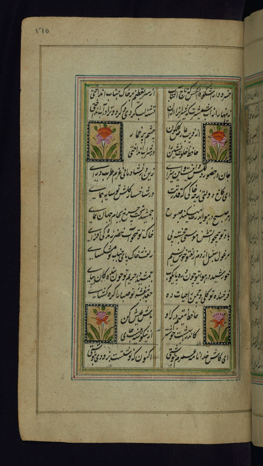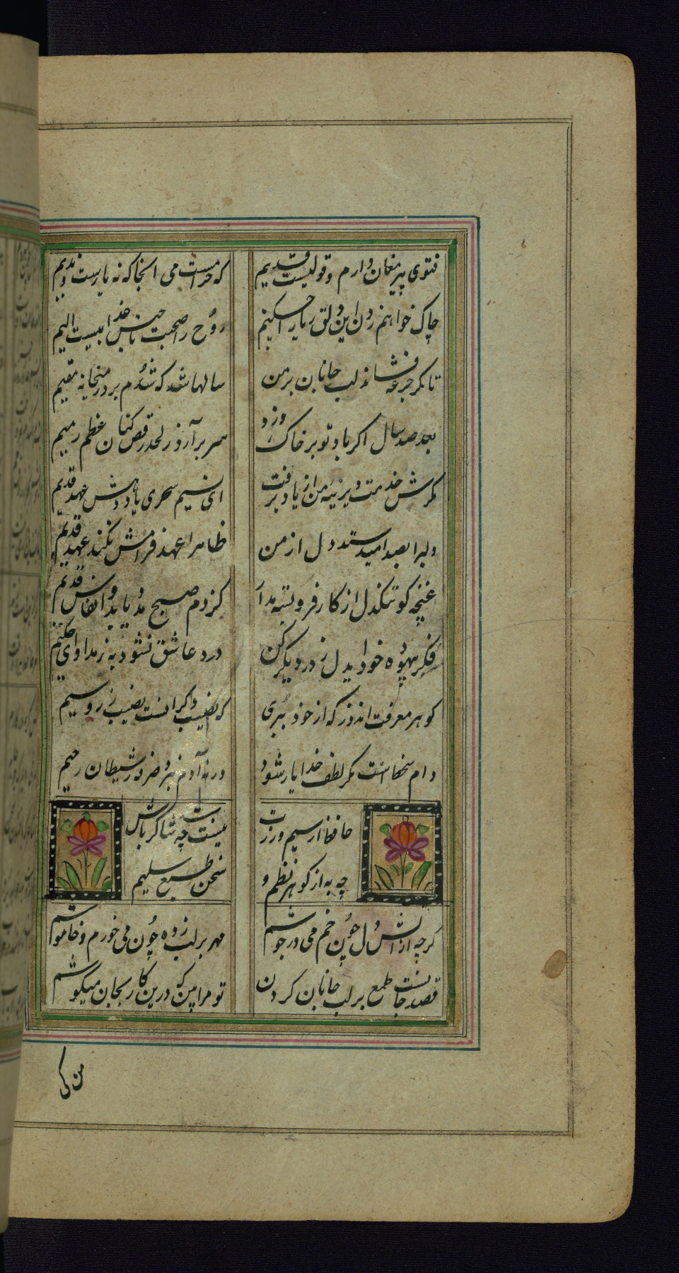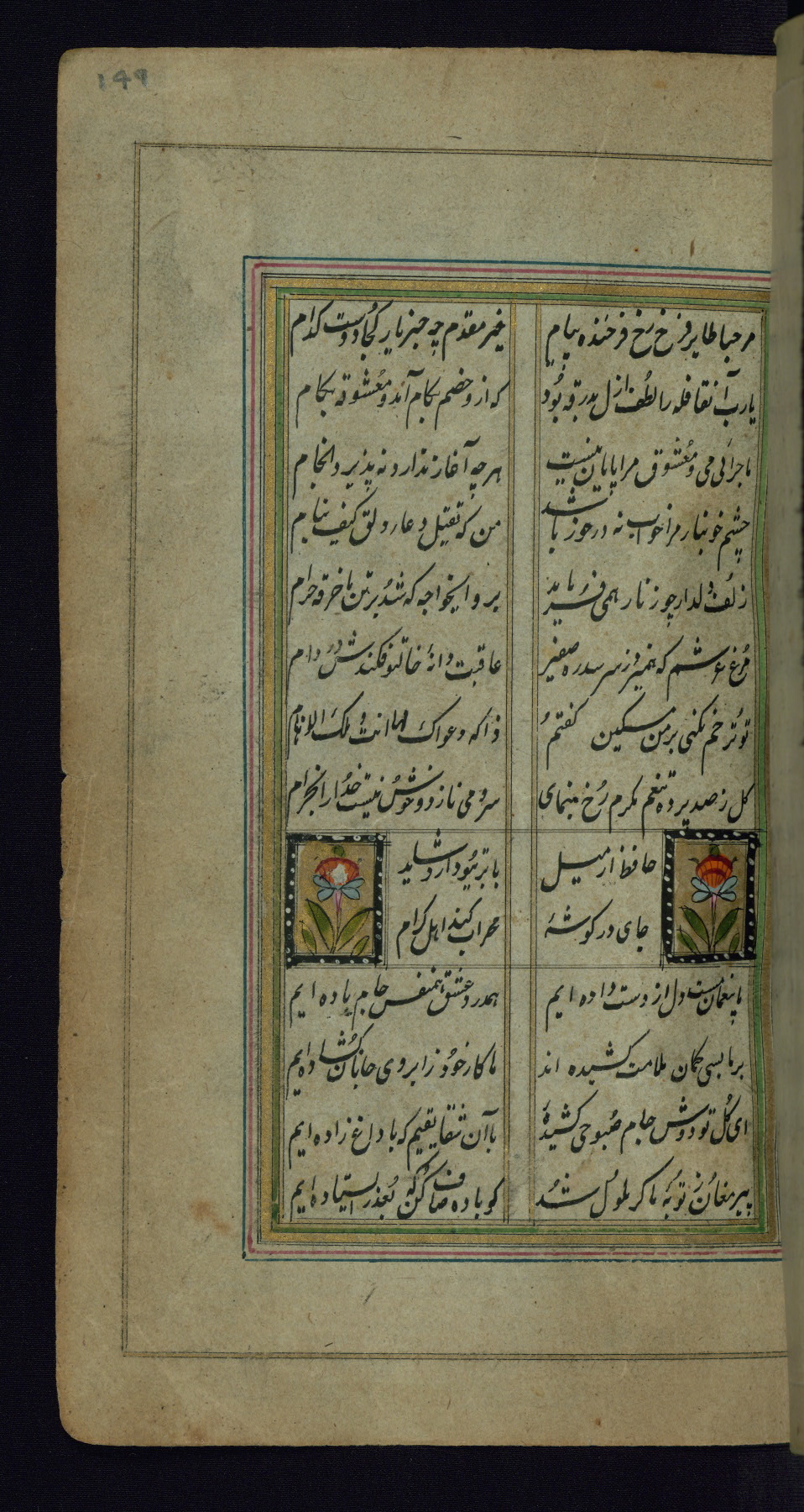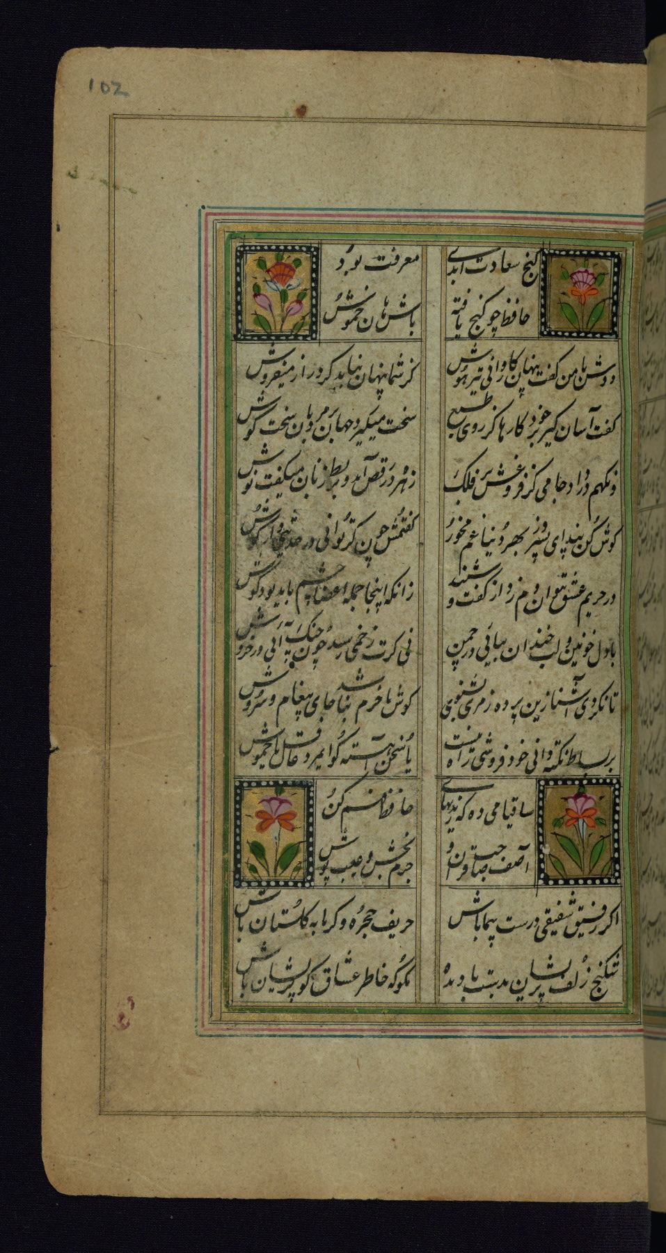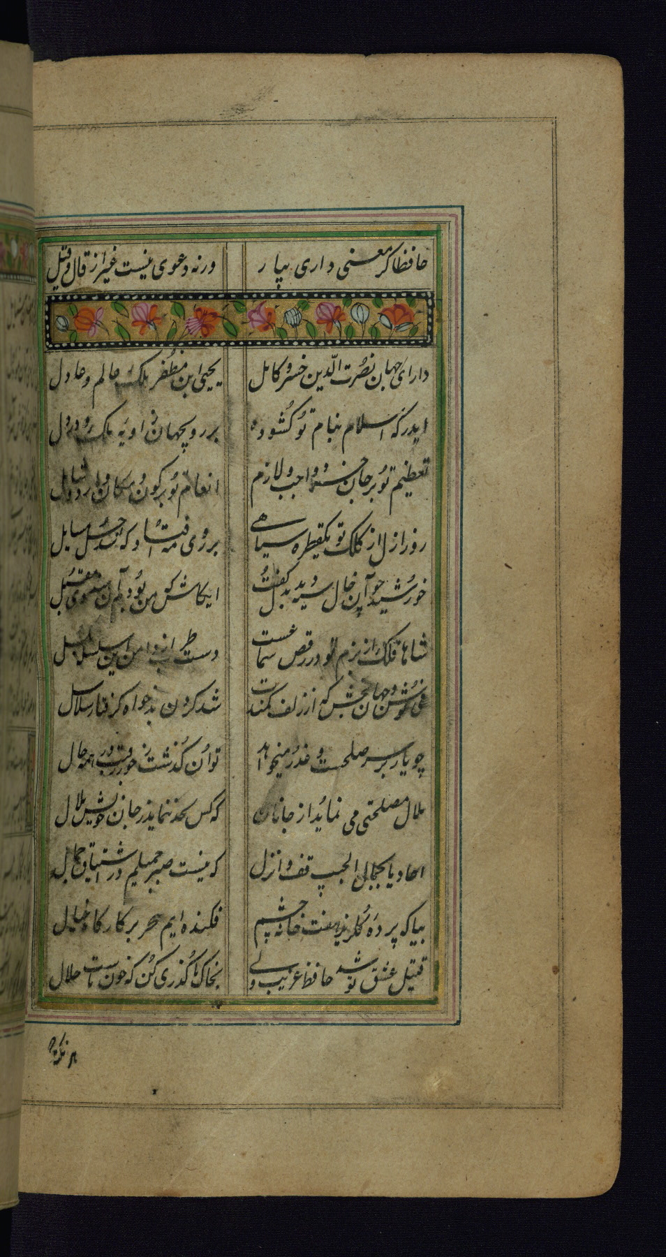 This is an illuminated and illustrated Collection of poems (dīvān) by Shams al-Dīn Muḥammad Ḥāfiz al-Shīrāzī (fl. eighth century AH / fourteenth CE), which was produced in India. According to the colophon, the manuscript was completed on the 19th Rajab 1202[?] AH / 1788[?] CE. It opens with a double-page illuminated incipit (fols. 1b-2a) with headpiece that introduces the preface (dībāchah) (fols. 1b-4b), followed by another double-page illuminated incipit with headpiece opening the main text of the Dīvān (fols. 5b-6a). The codex is decorated throughout with square and rectangular panels, as well as horizontal bands with floral decoration marking the end of odes, quatrains, or series of verses. There are forty-nine illustrations. The brown leather binding with medallion and pendants is contemporary with the manuscript.