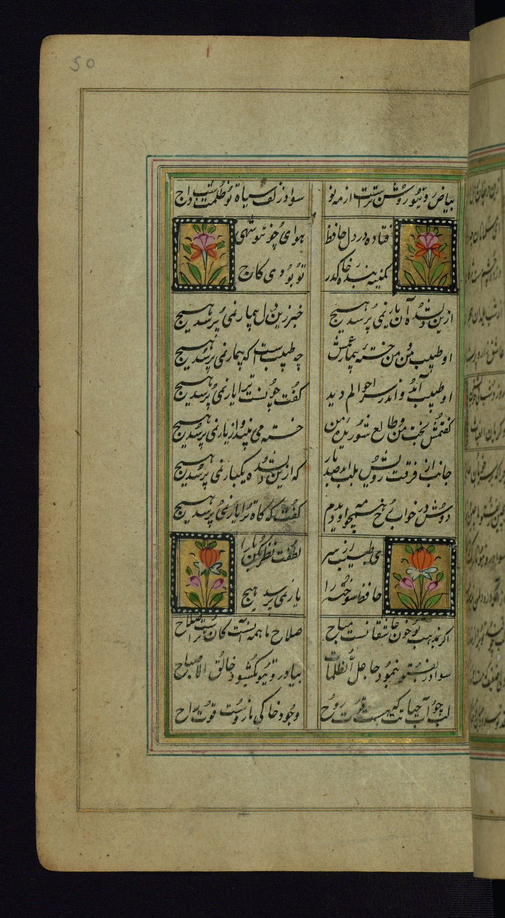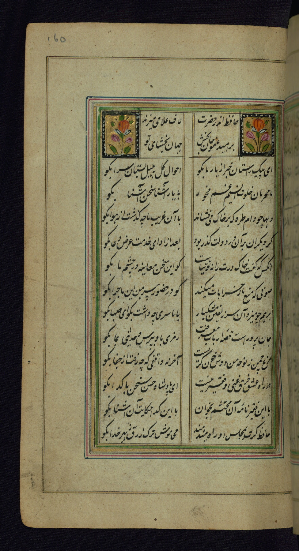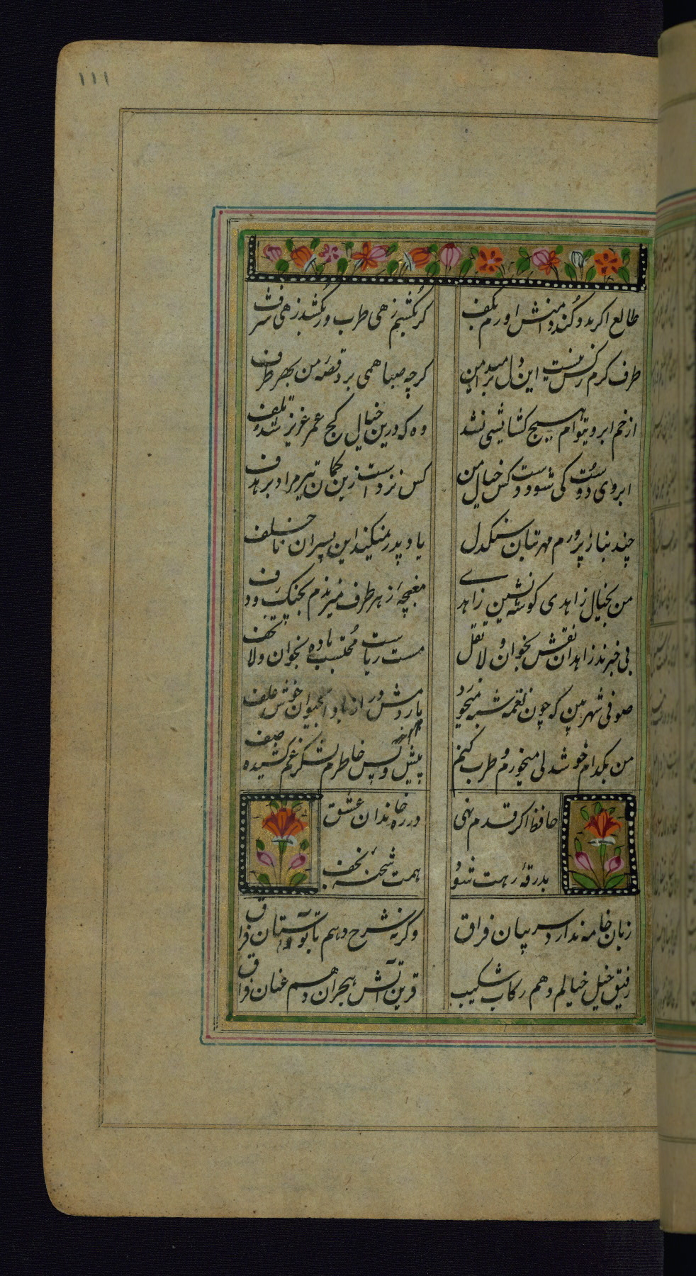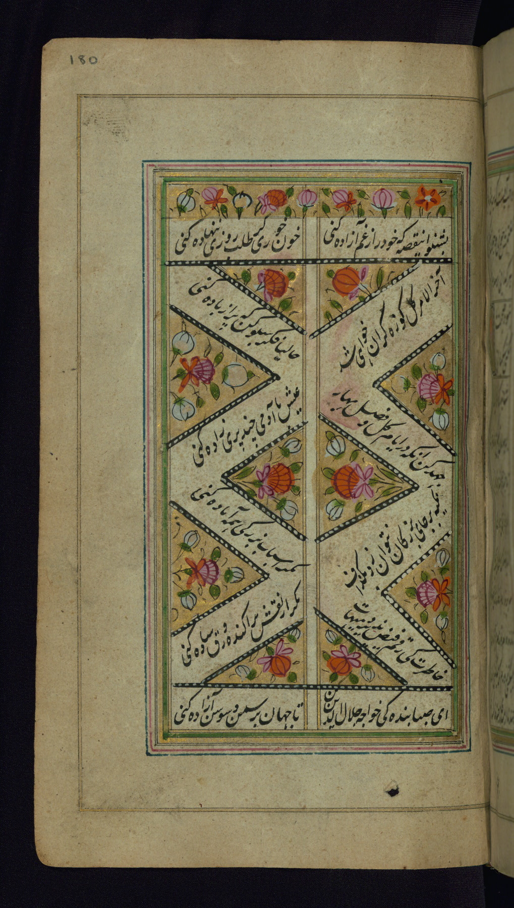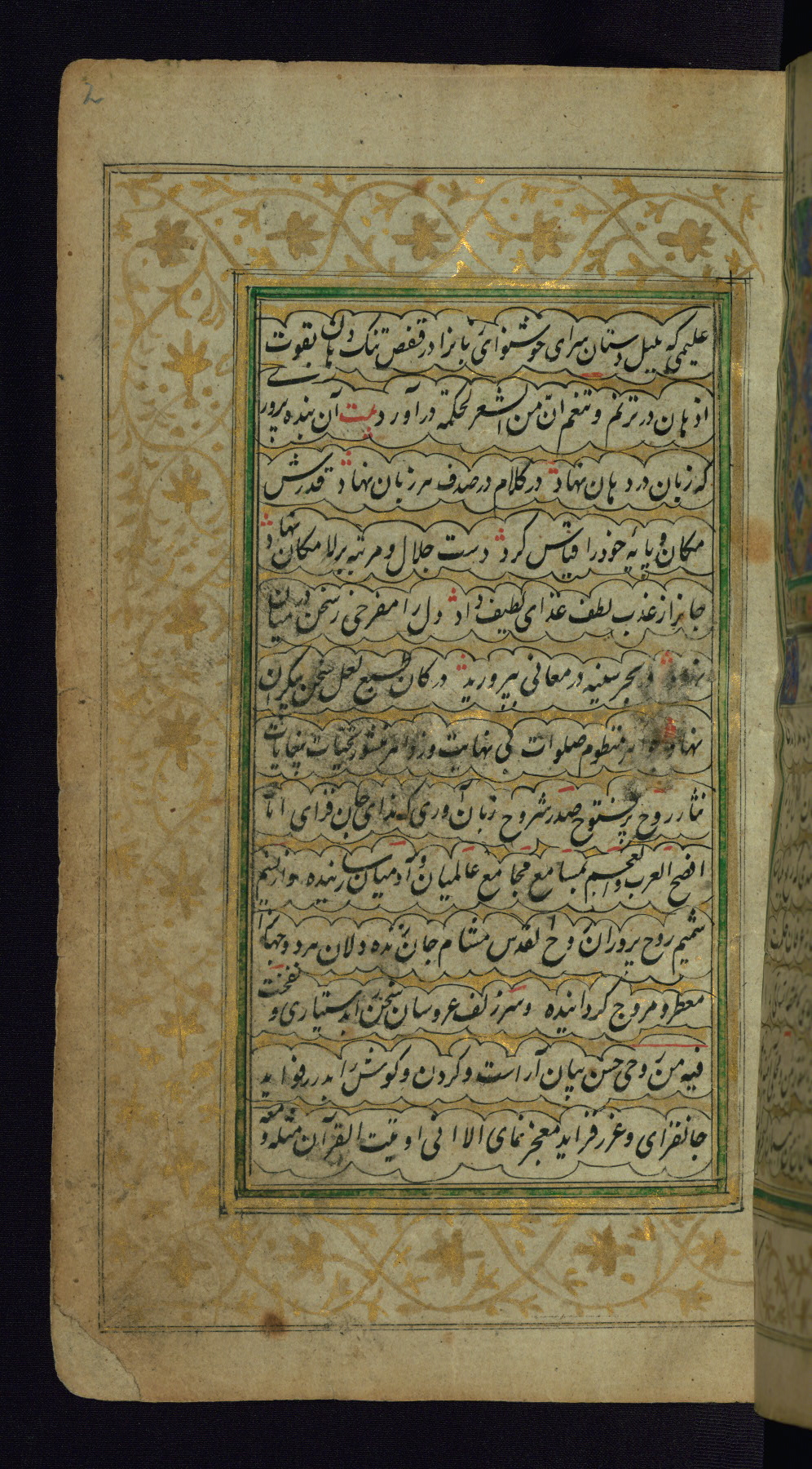 This is an illuminated and illustrated Collection of poems (dīvān) by Shams al-Dīn Muḥammad Ḥāfiz al-Shīrāzī (fl. eighth century AH / fourteenth CE), which was produced in India. According to the colophon, the manuscript was completed on the 19th Rajab 1202[?] AH / 1788[?] CE. It opens with a double-page illuminated incipit (fols. 1b-2a) with headpiece that introduces the preface (dībāchah) (fols. 1b-4b), followed by another double-page illuminated incipit with headpiece opening the main text of the Dīvān (fols. 5b-6a). The codex is decorated throughout with square and rectangular panels, as well as horizontal bands with floral decoration marking the end of odes, quatrains, or series of verses. There are forty-nine illustrations. The brown leather binding with medallion and pendants is contemporary with the manuscript.