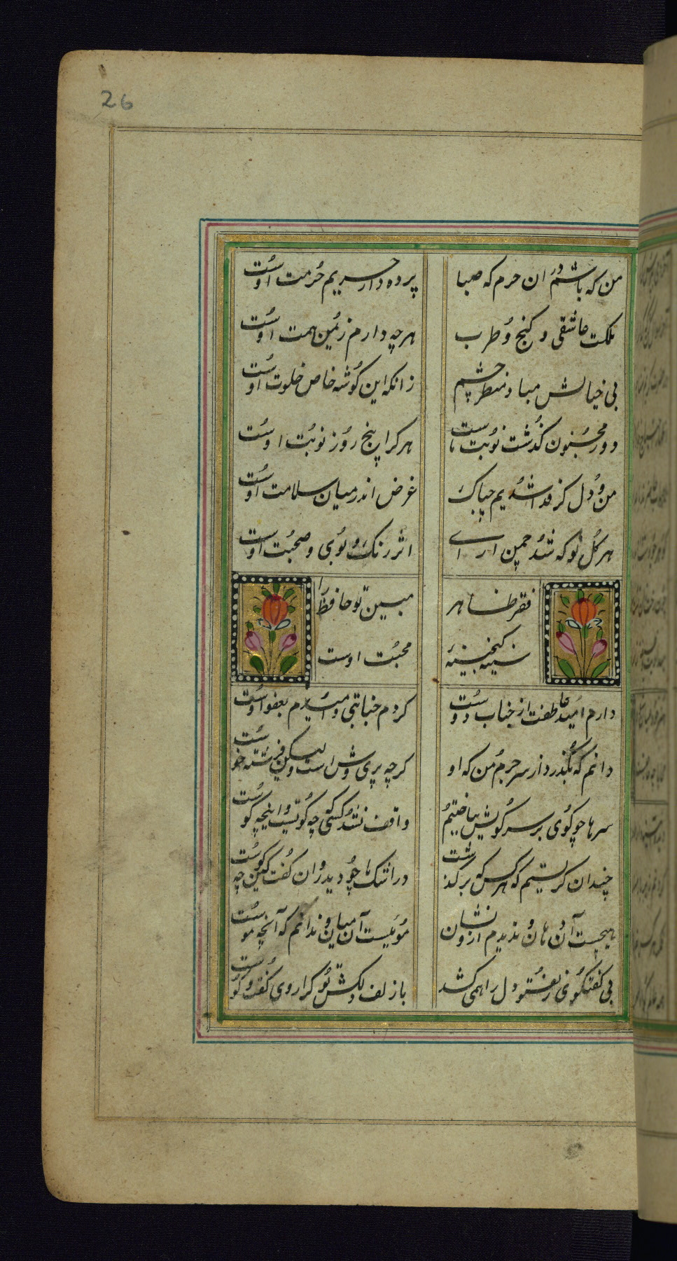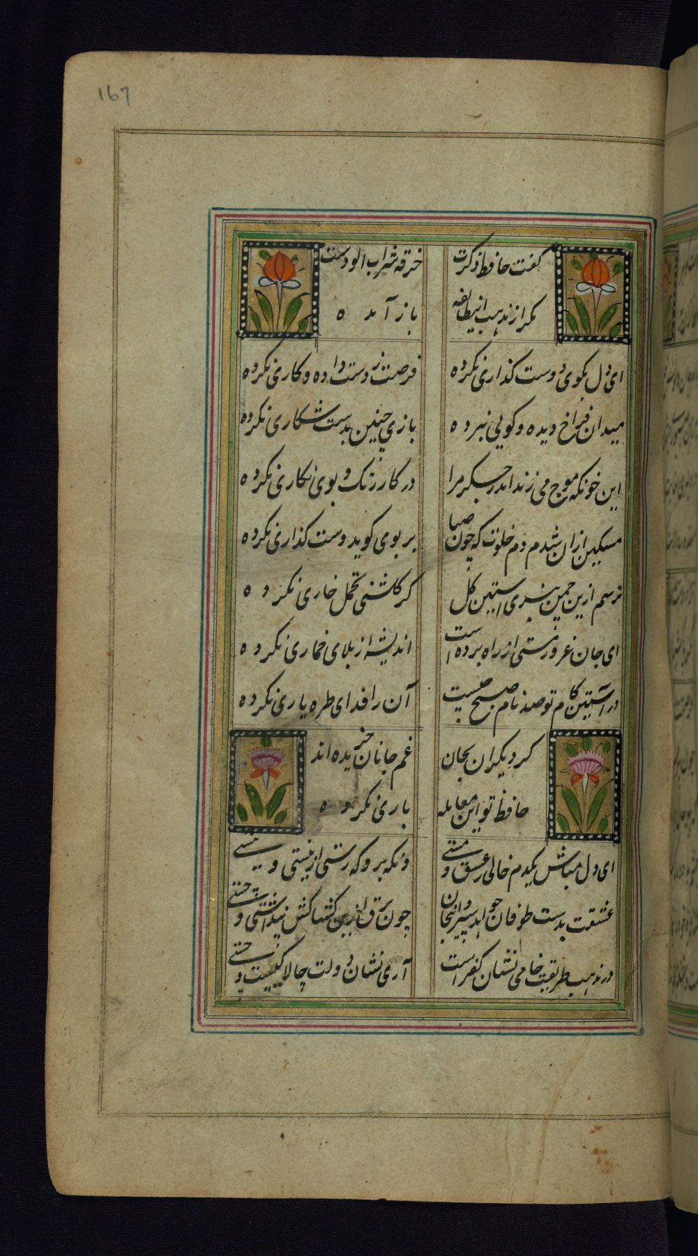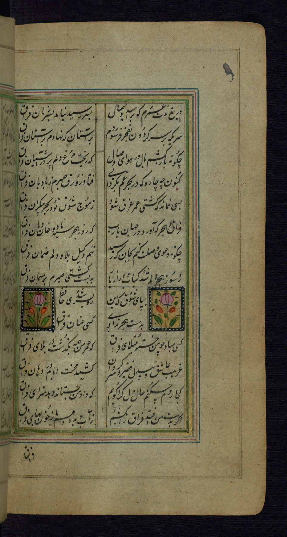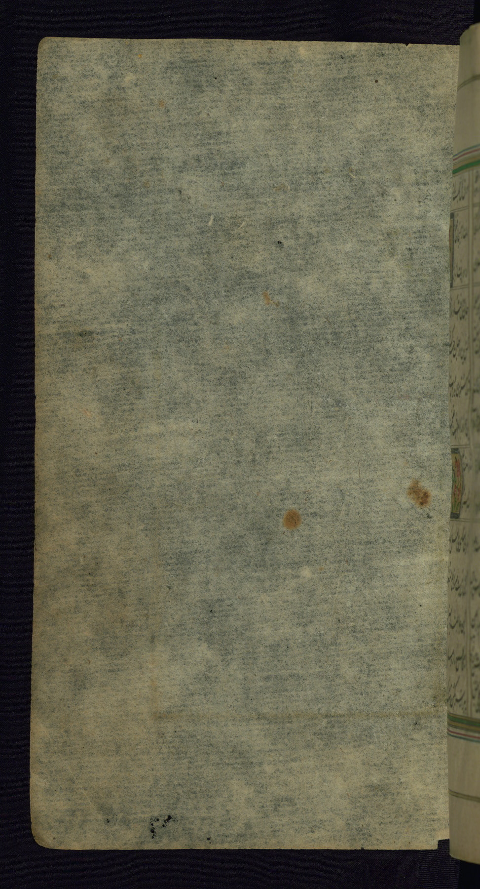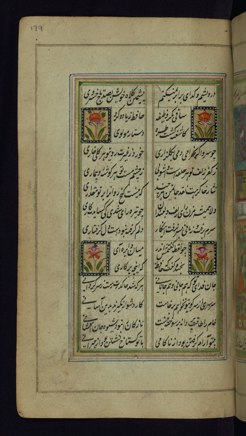 This is an illuminated and illustrated Collection of poems (dīvān) by Shams al-Dīn Muḥammad Ḥāfiz al-Shīrāzī (fl. eighth century AH / fourteenth CE), which was produced in India. According to the colophon, the manuscript was completed on the 19th Rajab 1202[?] AH / 1788[?] CE. It opens with a double-page illuminated incipit (fols. 1b-2a) with headpiece that introduces the preface (dībāchah) (fols. 1b-4b), followed by another double-page illuminated incipit with headpiece opening the main text of the Dīvān (fols. 5b-6a). The codex is decorated throughout with square and rectangular panels, as well as horizontal bands with floral decoration marking the end of odes, quatrains, or series of verses. There are forty-nine illustrations. The brown leather binding with medallion and pendants is contemporary with the manuscript.
