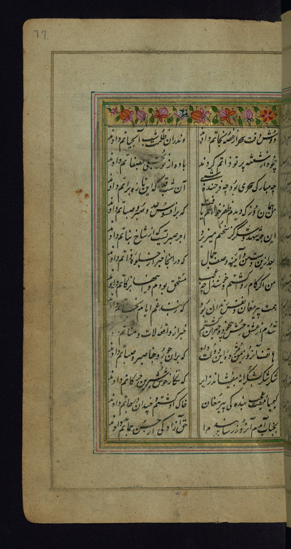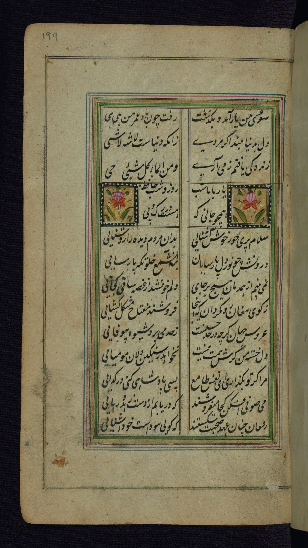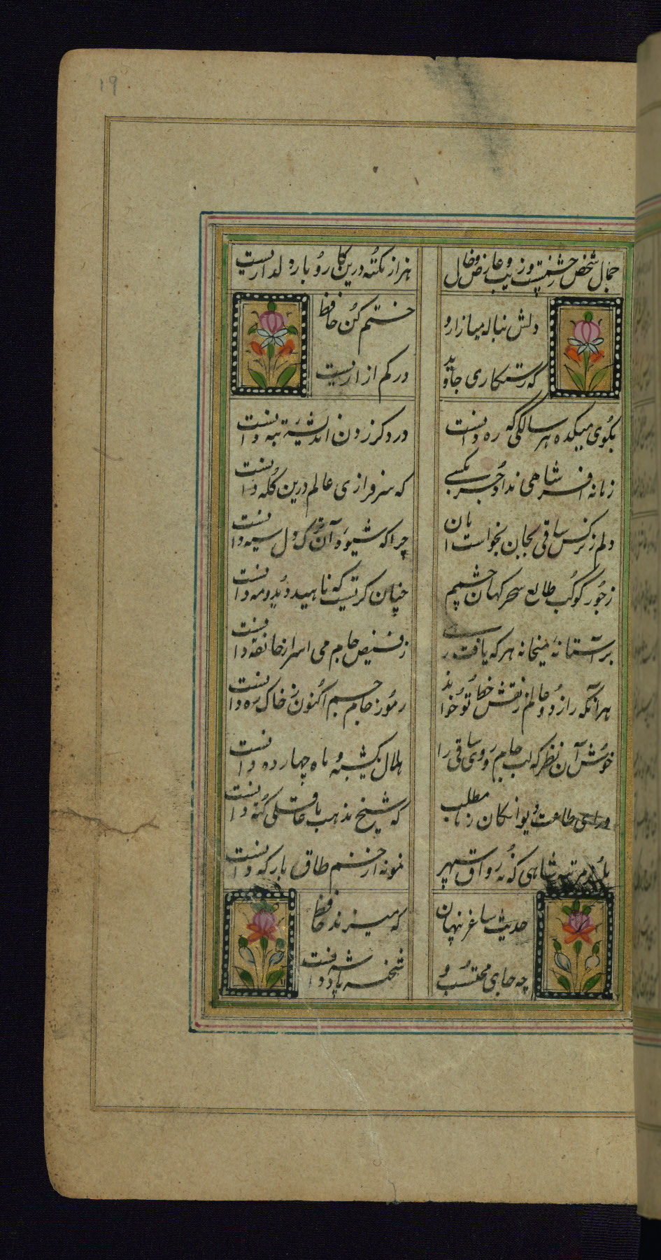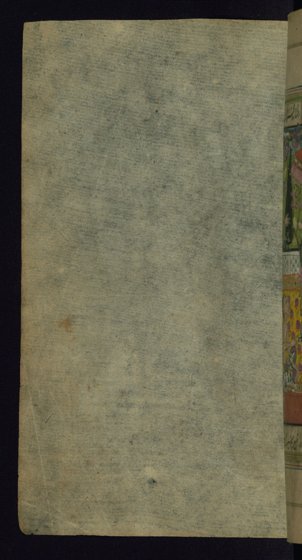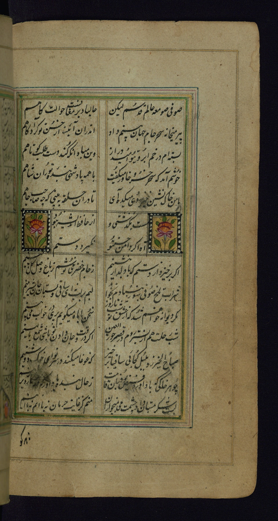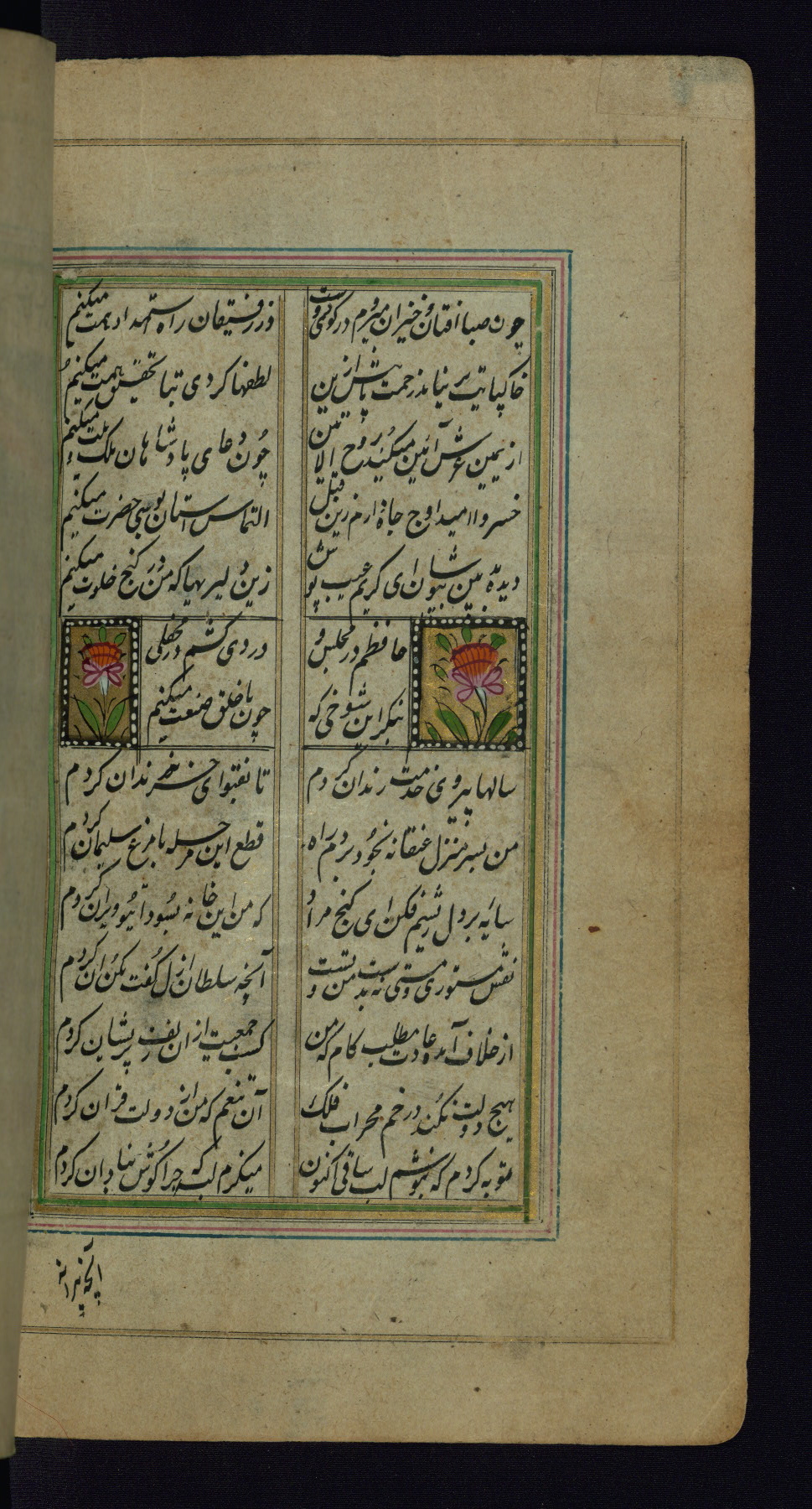This is an illuminated and illustrated Collection of poems (dīvān) by Shams al-Dīn Muḥammad Ḥāfiz al-Shīrāzī (fl. eighth century AH / fourteenth CE), which was produced in India. According to the colophon, the manuscript was completed on the 19th Rajab 1202[?] AH / 1788[?] CE. It opens with a double-page illuminated incipit (fols. 1b-2a) with headpiece that introduces the preface (dībāchah) (fols. 1b-4b), followed by another double-page illuminated incipit with headpiece opening the main text of the Dīvān (fols. 5b-6a). The codex is decorated throughout with square and rectangular panels, as well as horizontal bands with floral decoration marking the end of odes, quatrains, or series of verses. There are forty-nine illustrations. The brown leather binding with medallion and pendants is contemporary with the manuscript.