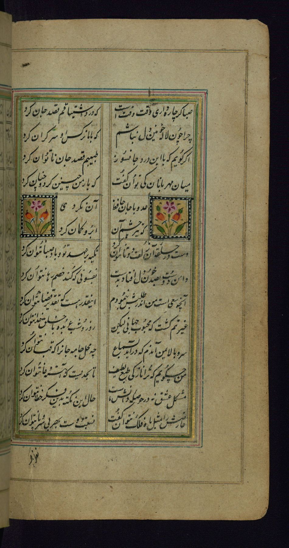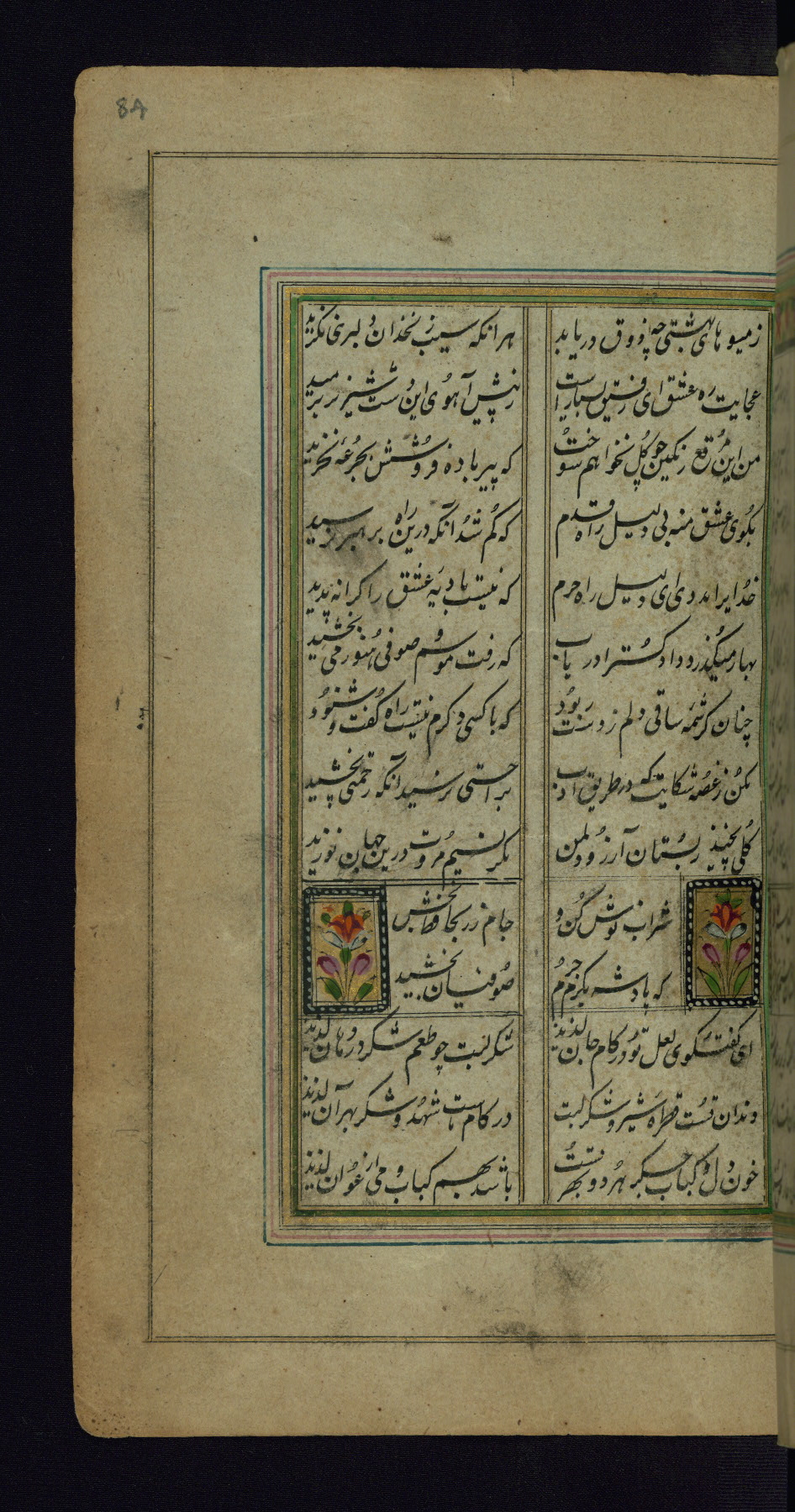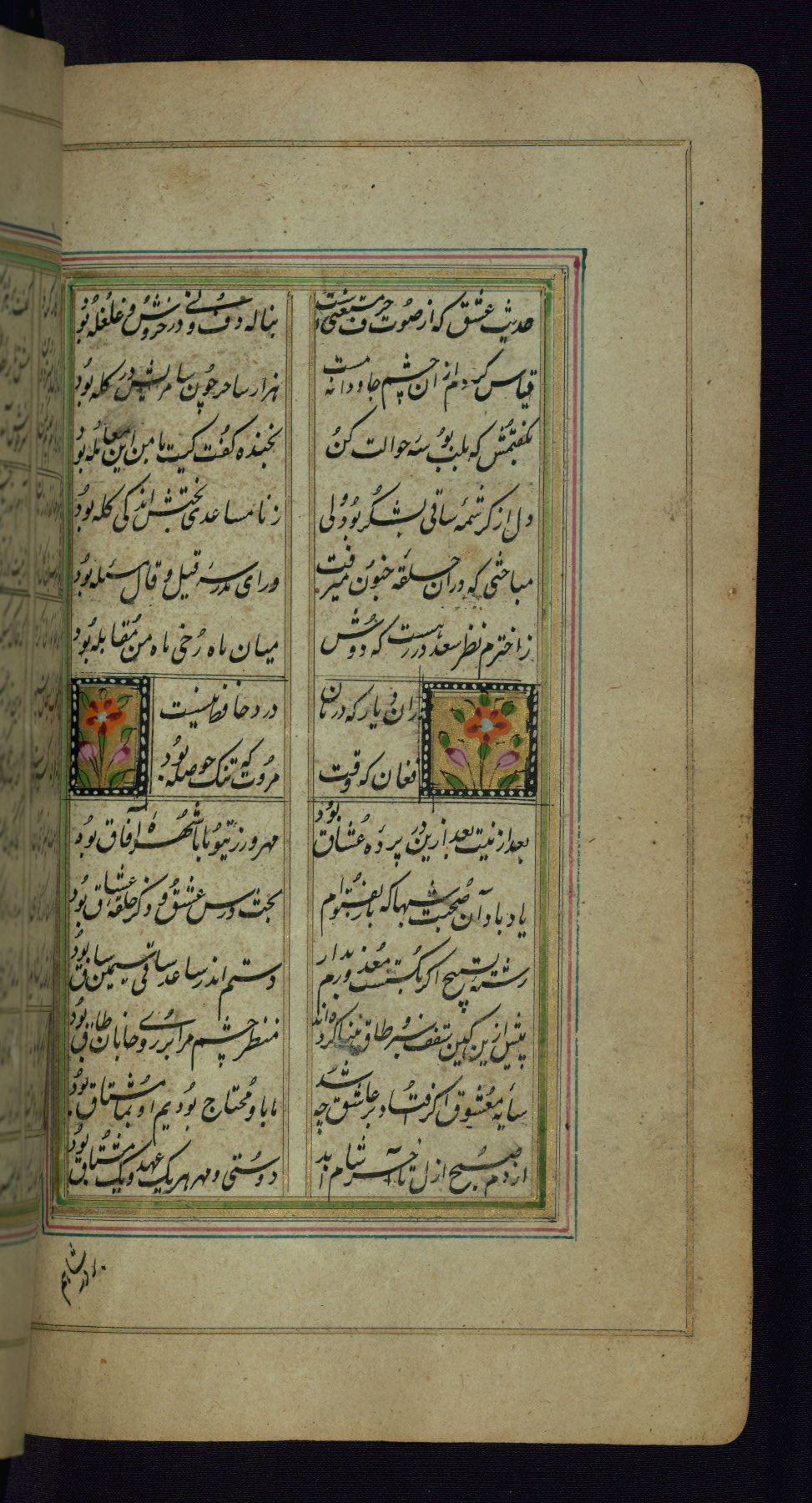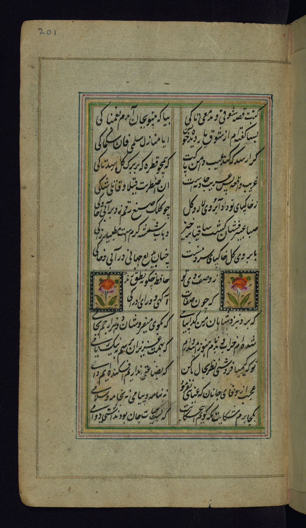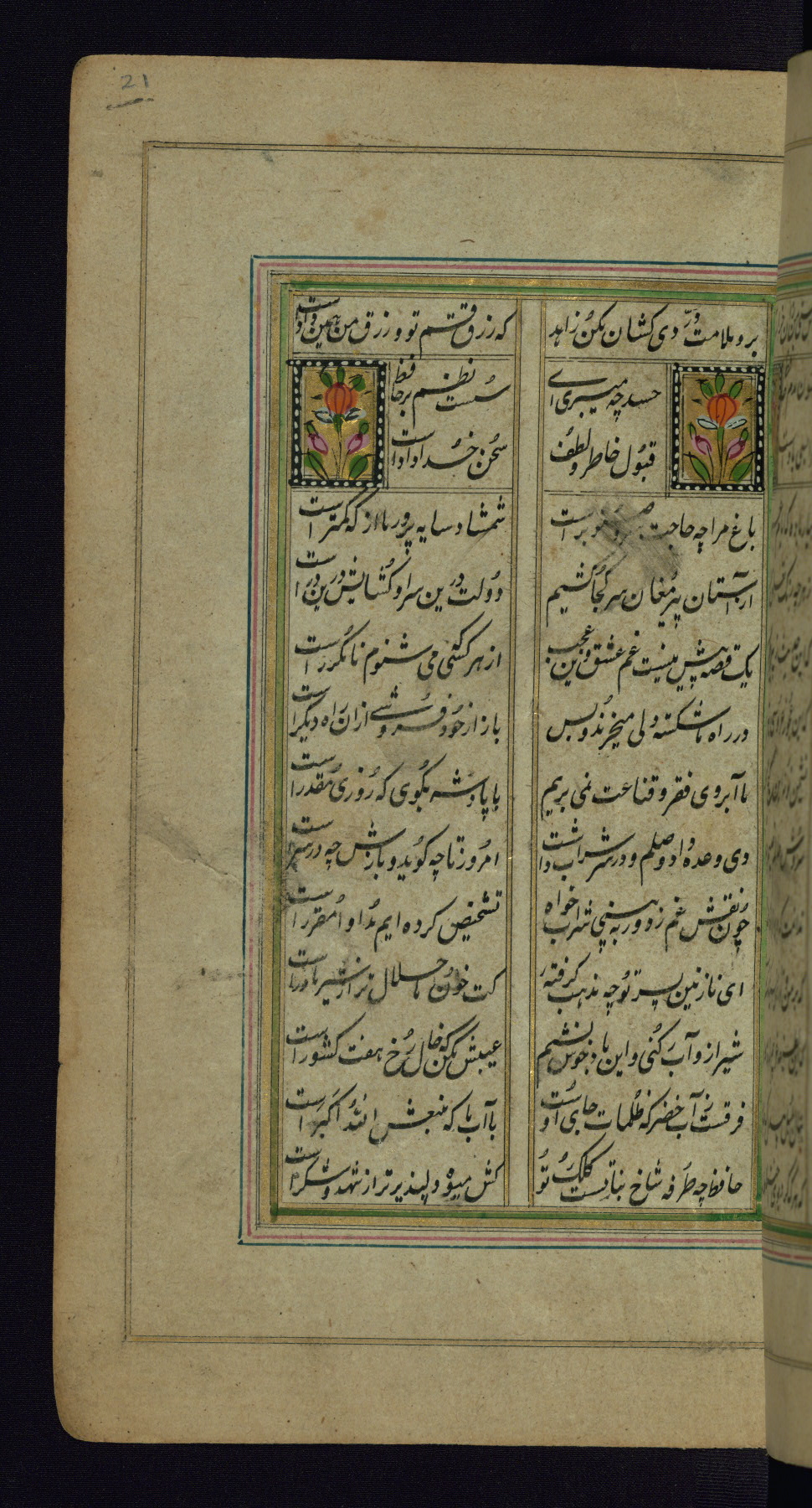 This is an illuminated and illustrated Collection of poems (dīvān) by Shams al-Dīn Muḥammad Ḥāfiz al-Shīrāzī (fl. eighth century AH / fourteenth CE), which was produced in India. According to the colophon, the manuscript was completed on the 19th Rajab 1202[?] AH / 1788[?] CE. It opens with a double-page illuminated incipit (fols. 1b-2a) with headpiece that introduces the preface (dībāchah) (fols. 1b-4b), followed by another double-page illuminated incipit with headpiece opening the main text of the Dīvān (fols. 5b-6a). The codex is decorated throughout with square and rectangular panels, as well as horizontal bands with floral decoration marking the end of odes, quatrains, or series of verses. There are forty-nine illustrations. The brown leather binding with medallion and pendants is contemporary with the manuscript.